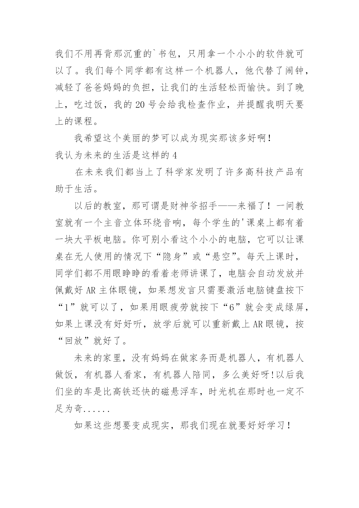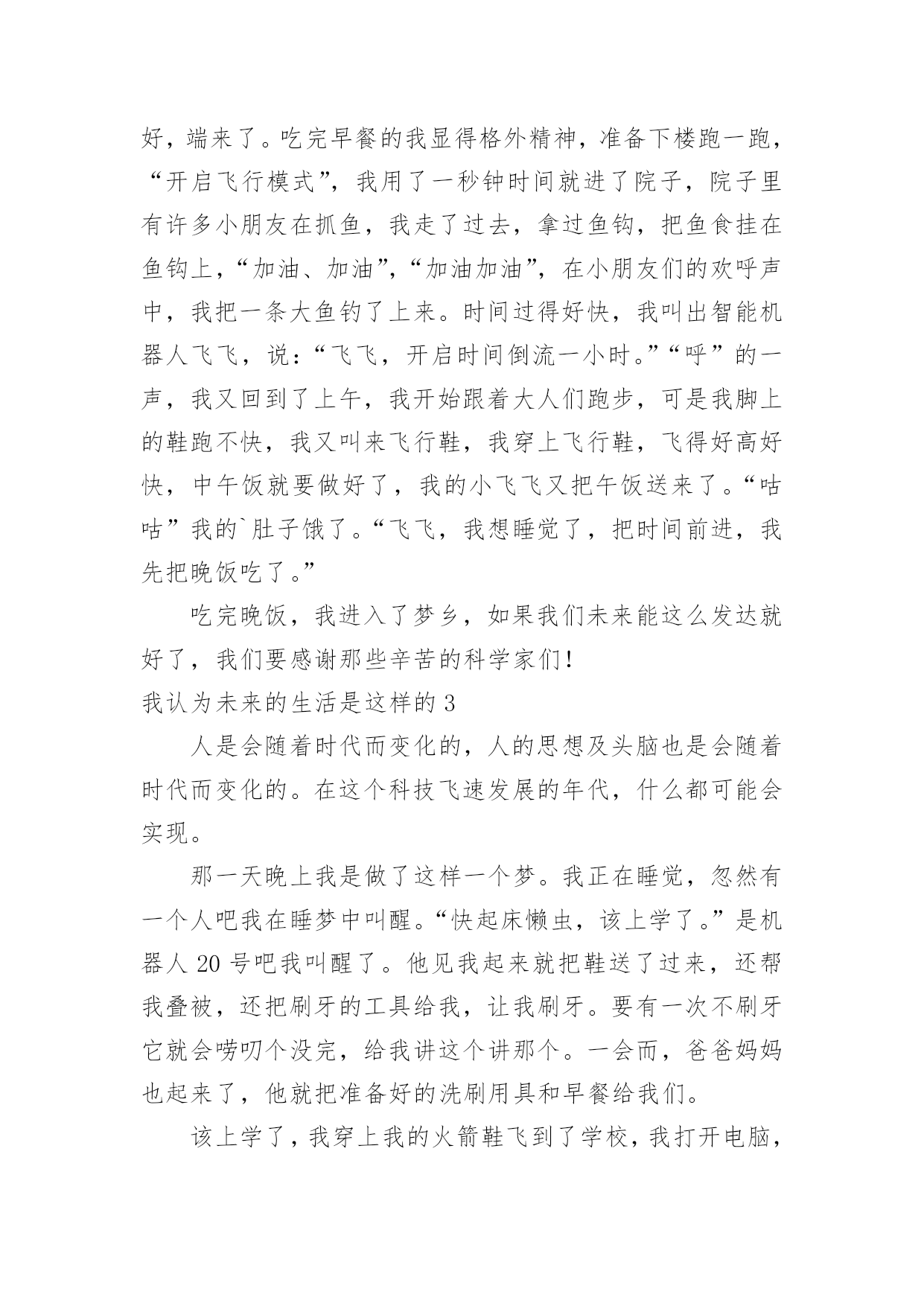 我认为未来的生活是这样的我认为未来的生活是这样的我认为未来的生活是这样的120xx年的一天开始了。我好像听见了风力发电机异常运转的声音。猛的一拍脑门,风力发电机很久没有加润滑油了。“勇勇(也就是我机器人家仆)你怎么还没给风力发电机加润滑油呀?”我不满意地问道。勇勇反驳道:“您又没有下过这样的指令,而且我上次提醒您时,您还说不急。”我只好懒洋洋地回答:“那你今天办了吧,以后这些该办的小事你就直接做了吧。"喝了一杯维C水,我像往常一样外出晨练去了。现在的每日晨练是件很惬意的事情。周围的空气是极其新鲜的,花草是那样的清香繁盛,树木是那样的高大挺拔,最最最让我享受的是:在晨跑的路上遇到的.每一个人,无论是认识或不认识,都会习惯性地说上一句"你好!”或“早上好!"回来以后,勇勇端来了丰盛的早餐,让我吃得饱饱的。吃过早饭,我拿过电话和妈妈问了个安就准备去学校了......未来的生活真美好呀!我认为未来的生活是这样的2如果我现在正在未来的床上睡觉,那么……“叮铃叮铃”的声音把我从梦中惊醒,我穿好鞋到了智能早餐厅,我想好了美味的早餐,智能盘子就把我的早餐做好,端来了。吃完早餐的我显得格外精神,准备下楼跑一跑,“开启飞行模式”,我用了一秒钟时间就进了院子,院子里有许多小朋友在抓鱼,我走了过去,拿过鱼钩,把鱼食挂在鱼钩上,“加油、加油”,“加油加油”,在小朋友们的欢呼声中,我把一条大鱼钓了上来。时间过得好快,我叫出智能机器人飞飞,说:“飞飞,开启时间倒流一小时。”“呼”的一声,我又回到了上午,我开始跟着大人们跑步,可是我脚上的鞋跑不快,我又叫来飞行鞋,我穿上飞行鞋,飞得好高好快,中午饭就要做好了,我的小飞飞又把午饭送来了。“咕咕”我的`肚子饿了。“飞飞,我想睡觉了,把时间前进,我先把晚饭吃了。”吃完晚饭,我进入了梦乡,如果我们未来能这么发达就好了,我们要感谢那些辛苦的科学家们!我认为未来的生活是这样的3人是会随着时代而变化的,人的思想及头脑也是会随着时代而变化的。在这个科技飞速发展的年代,什么都可能会实现。那一天晚上我是做了这样一个梦。我正在睡觉,忽然有一个人吧我在睡梦中叫醒。“快起床懒虫,该上学了。”是机器人20号吧我叫醒了。他见我起来就把鞋送了过来,还帮我叠被,还把刷牙的工具给我,让我刷牙。要有一次不刷牙它就会唠叨个没完,给我讲这个讲那个。一会而,爸爸妈妈也起来了,他就把准备好的洗刷用具和早餐给我们。该上学了,我穿上我的火箭鞋飞到了学校,我打开电脑,我们不用再背那沉重的`书包,只用拿一个小小的软件就可以了。我们每个同学都有这样一个机器人,他代替了闹钟,减轻了爸爸妈妈的负担,让我们的生活轻松而愉快。到了晚上,吃过饭,我的20号会给我检查作业,并提醒我明天要上的课程。我希望这个美丽的梦可以成为现实那该多好啊!我认为未来的生活是这样的4在未来我们都当上了科学家发明了许多高科技产品有助于生活。以后的教室,那可谓是财神爷招手——来福了!一间教室就有一个主音立体环绕音响,每个学生的'课桌上都有着一块大平板电脑。你可别小看这个小小的电脑,它可以让课桌在无人使用的情况下“隐身”或“悬空”。每天上课时,同学们都不用眼睁睁的看着老师讲课了,电脑会自动发放并佩戴好AR主体眼镜,如果想发言只需要激活电脑键盘按下“1”就可以了,如果用眼疲劳就按下“6”就会变成绿屏,如果上课没有好好听,放学后就可以重新戴上AR眼镜,按“回放”就好了。未来的家里,没有妈妈在做家务而是机器人,有机器人做饭,有机器人看家,有机器人陪同,多么美好呀!以后我们坐的车是比高铁还快的磁悬浮车,时光机在那时也一定不足为奇......如果这些想要变成现实,那我们现在就要好好学习!