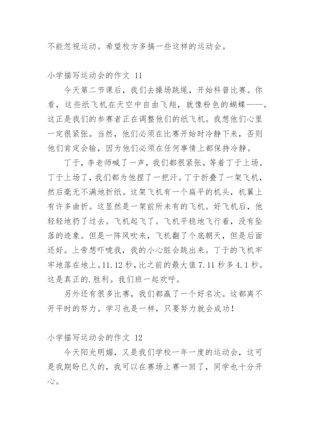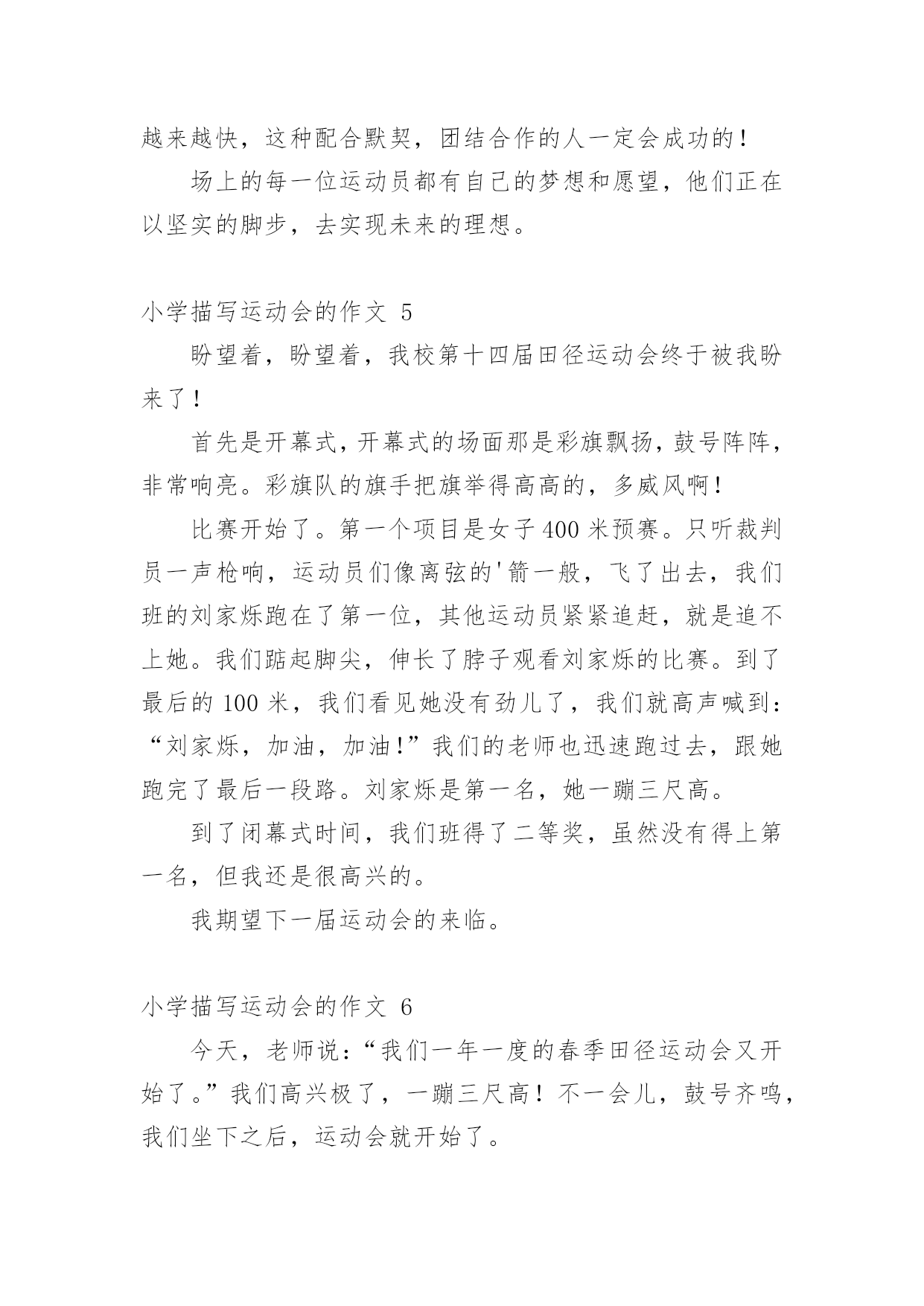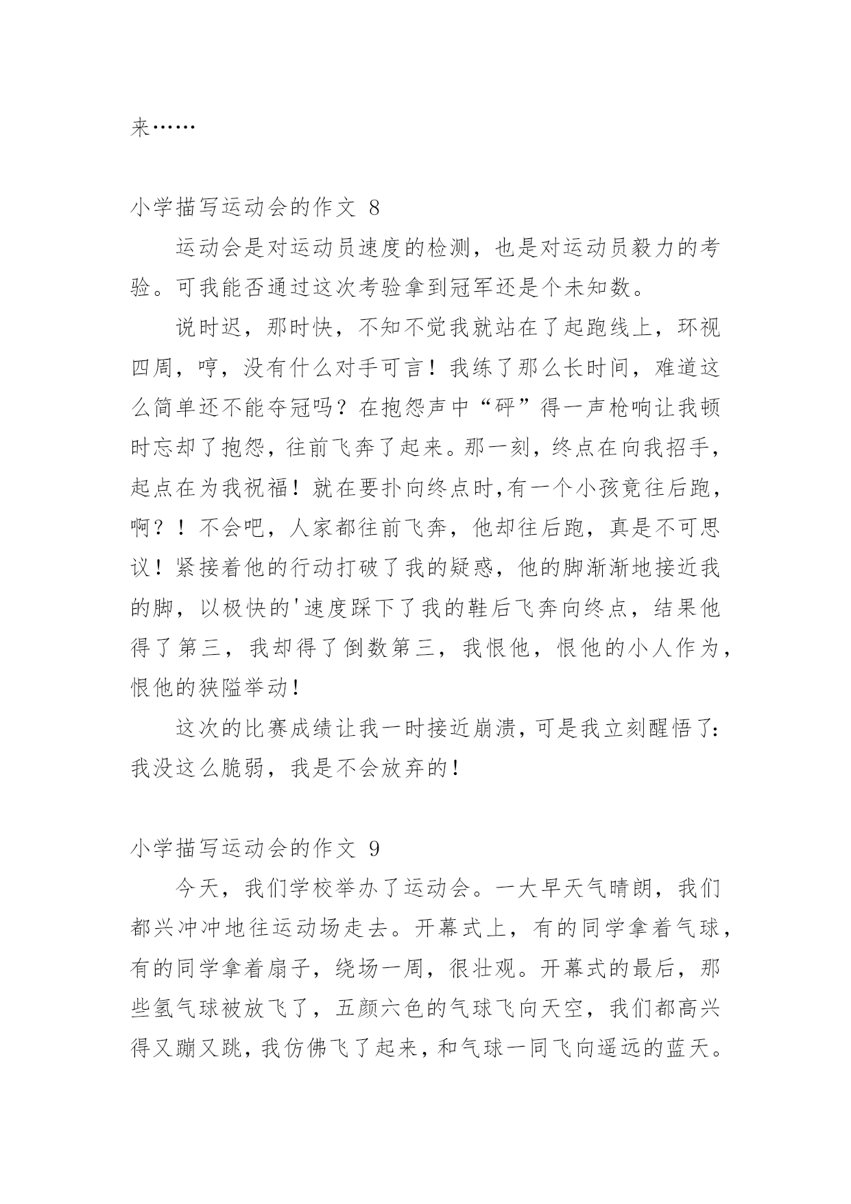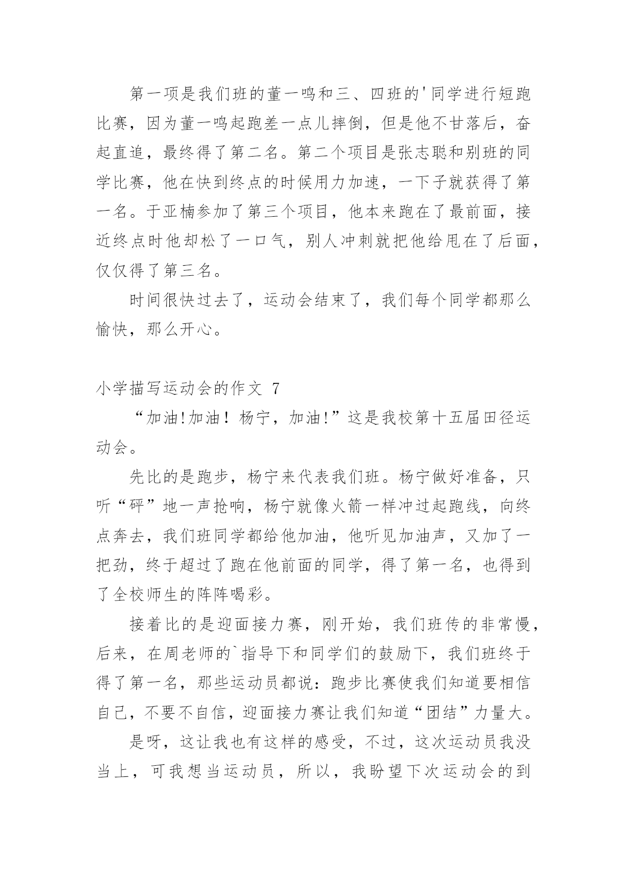 小学描写运动会的作文小学描写运动会的作文(精选63篇)在日常学习、工作或生活中,大家都写过作文吧,借助作文人们可以反映客观事物、表达思想感情、传递知识信息。你知道作文怎样才能写的好吗?以下是小编精心整理的小学描写运动会的作文,欢迎大家借鉴与参考,希望对大家有所帮助。小学描写运动会的作文1昨天,天气秋高气爽,我校举行了一年一度的秋季运动会。运动会开始前,首先是运动员入场,同学们穿着鲜艳的服装,迈着整齐的步伐,喊着响亮的口号,走进会场。运动会开始后,只见运动员个个精神抖擞,生龙活虎地活跃在运动场上。最引人注目的项目是接力赛,我班选派了男、女生各十名参加比赛。接力赛开始了,只听枪声一响,运动员们像离弦的箭一样,飞快地向前奔跑。交棒,接棒,大家争先恐后,你追我赶,不甘示弱。这时,场外的拉拉队员都激动地呐喊:“加油,加油。”最后,我们班取得了第二名,但我们还是很高兴。运动会在欢乐的.气氛中结束了,但欢乐的气氛仍然在我的脑海中久久地回荡。小学描写运动会的作文2在这金风送爽的季节里。我们迎来拉一场别开生面的运动会。烈日当头,但我们这群“小精灵”都兴奋的聊着天,没有感到一丝炎热。鼓乐队敲着鼓,鼓声震耳欲聋,开幕仪式开始了。大家都精神饱满地向前走。我们班呼喊着“奋力拼搏,赛出风格”。场面盛大。开幕式完毕,激烈的比赛一个紧接着一个开始了。我参加了激动人心的800米长跑。每次接近我班时,同学、老师的欢呼声、加油声都鼓励着我。虽然我没有拿到名次,但我也努力了。每一次枪声,都牵动着大家的心,也总能引起大家的欢呼。一天的比赛,就匆匆忙忙的在加油声与欢呼声中度过。第二天,比赛仍然紧张地进行。五年级的接力赛开始了,我班的运动健将们走上了赛场,我在班里默默地为他们加油着。最后是一年级的小弟弟、小妹妹的`接力赛。他们争先恐后、不甘示弱,真是太激烈了!一天半的运动会完毕了。经过这次运动会,我真正体会到了班级的温暖!小学描写运动会的作文3我们学校的夏季运动会又开始了。四月一日是运动会的第一天,上午因为爸爸妈妈有事外出,我也跟随他们一起出去了,于是没能参加,很遗憾。下午我们急急忙忙赶回家,来到了学校,听陆老师说,上午我们班的比赛成绩都不错,个个都拿到了名次和奖品。下午三点我们参加了跳大绳比赛,这项比赛是我们的爸爸妈妈参加。参赛的家长认认真真的跳着,最后还是只跳了九十四个,我们班输了。但我们都知道,爸爸妈妈们已经尽力了。四月二日上午的比赛更精彩。我们班参加了一百米接力赛的决赛,他们都跑的.很好、很努力,也很精彩。虽然这次我什么也没能参加,但我也很高兴啊。因为我在为参加比赛的同学助威加油,为他们呐喊。希望下次运动会时,我也能参加几个比赛项目,同时也希望陆老师和罗老师支持我。这次运动会在我们学校圆满而成功的结束了。小学描写运动会的作文4今天,我们学校开了一次运动会,主题是超越自己。你看,那些运动员正在进行长跑比赛!他们各就各位,枪声一响,他们便飞快地冲了出去。他们踏出的每一个脚印,都凝聚着勇气和力量;他们迈出的每一步,都是耐力与心智;他们跑过的每一圈,都记录着拼搏与较量。他们是坚强无畏的勇士,为了荣誉,超越自己,为了梦想信心十足,他们的精神令人佩服!看那边短跑的将士吧!他们飞奔过去,冲线似乎只是一瞬间,他们为了证明自己的实力,飞快奔跑,这种超越极限的'人,怎能不叫人感到!再看看接力赛吧!他们手中的接力棒不断传递,速度也越来越快,这种配合默契,团结合作的人一定会成功的!场上的每一位运动员都有自己的梦想和愿望,他们正在以坚实的脚步,去实现未来的理想。小学描写运动会的作文5盼望着,盼望着,我校第十四届田径运动会终于被我盼来了!首先是开幕式,开幕式的场面那是彩旗飘扬,鼓号阵阵,非常响亮。彩旗队的旗手把旗举得高高的,多威风啊!比赛开始了。第一个项目是女子400米预赛。只听裁判员一声枪响,运动员们像离弦的'箭一般,飞了出去,我们班的刘家烁跑在了第一位,其他运动员紧紧追赶,就是追不上她。我们踮起脚尖,伸长了脖子观看刘家烁的比赛。到了最后的100米,我们看见她没有劲儿了,我们就高声喊到:“刘家烁,加油,加油!”我们的老师也迅速跑过去,跟她跑完了最后一段路。刘家烁是第一名,她一蹦三尺高。到了闭幕式时间,我们班得了二等奖,虽然没有得上第一名,但我还是很高兴的。我期望下一届运动会的来临。小学描写运动会的作文6今天,老师说:“我们一年一度的春季田径运动会又开始了。”我们高兴极了,一蹦三尺高!不一会儿,鼓号齐鸣,我们坐下之后,运动会就开始了。第一项是我们班的董一鸣和三、四班的'同学进行短跑比赛,因为董一鸣起跑差一点儿摔倒,但是他不甘落后,奋起直追,最终得了第二名。第二个项目是张志聪和别班的同学比赛,他在快到终点的时候用力加速,一下子就获得了第一名。于亚楠参加了第三个项目,他本来跑在了最前面,接近