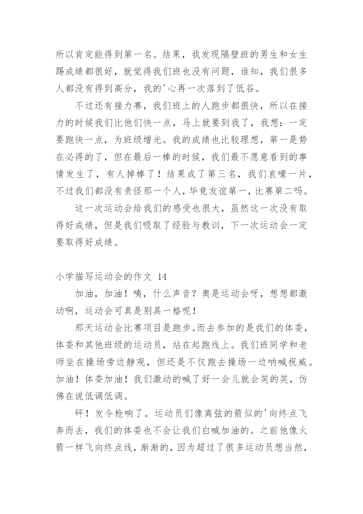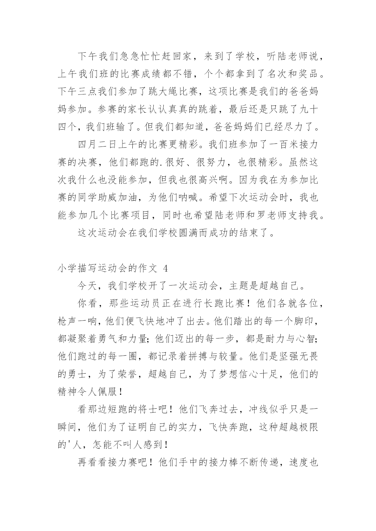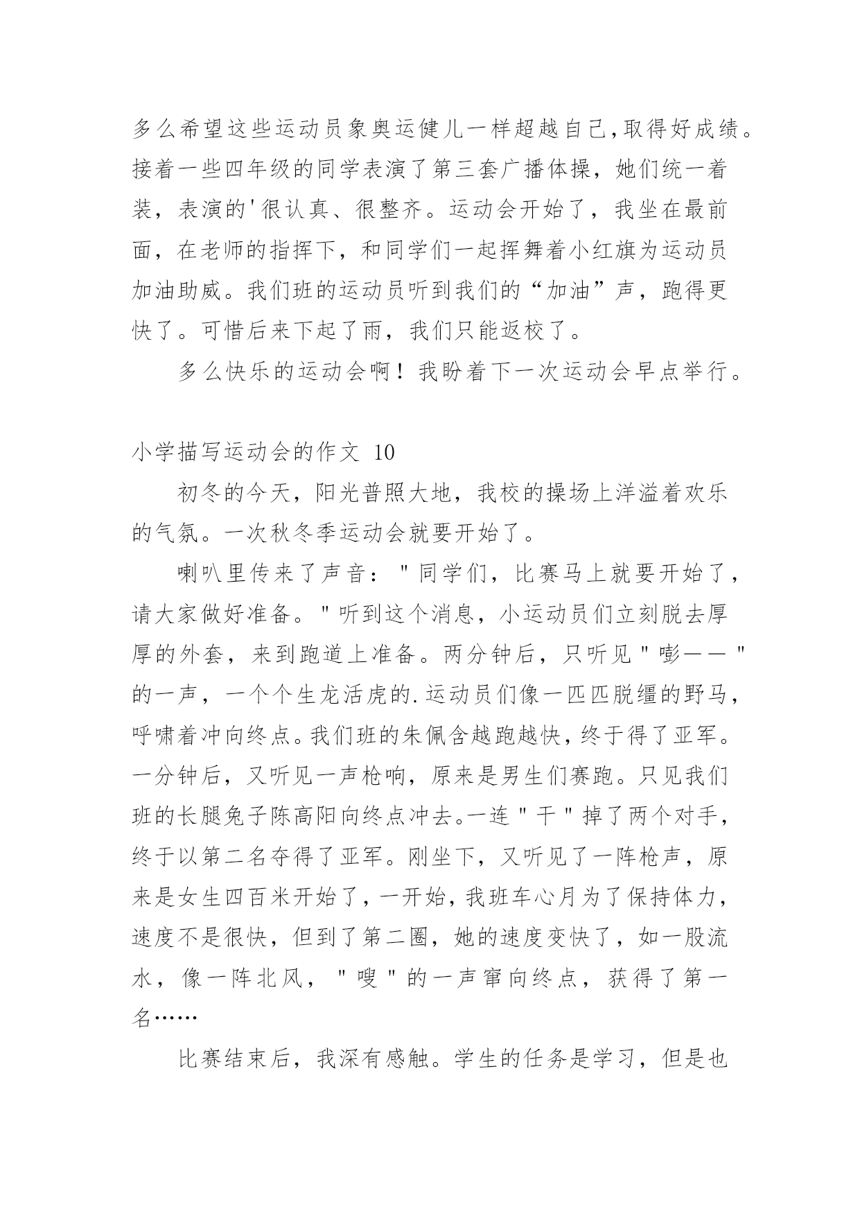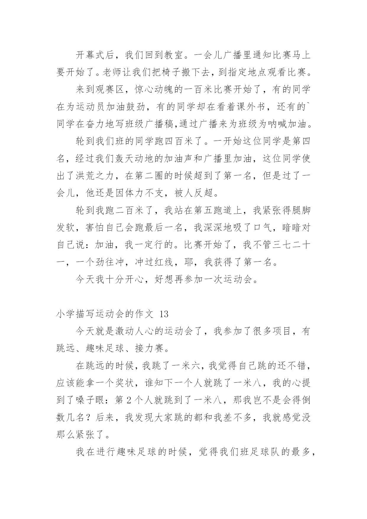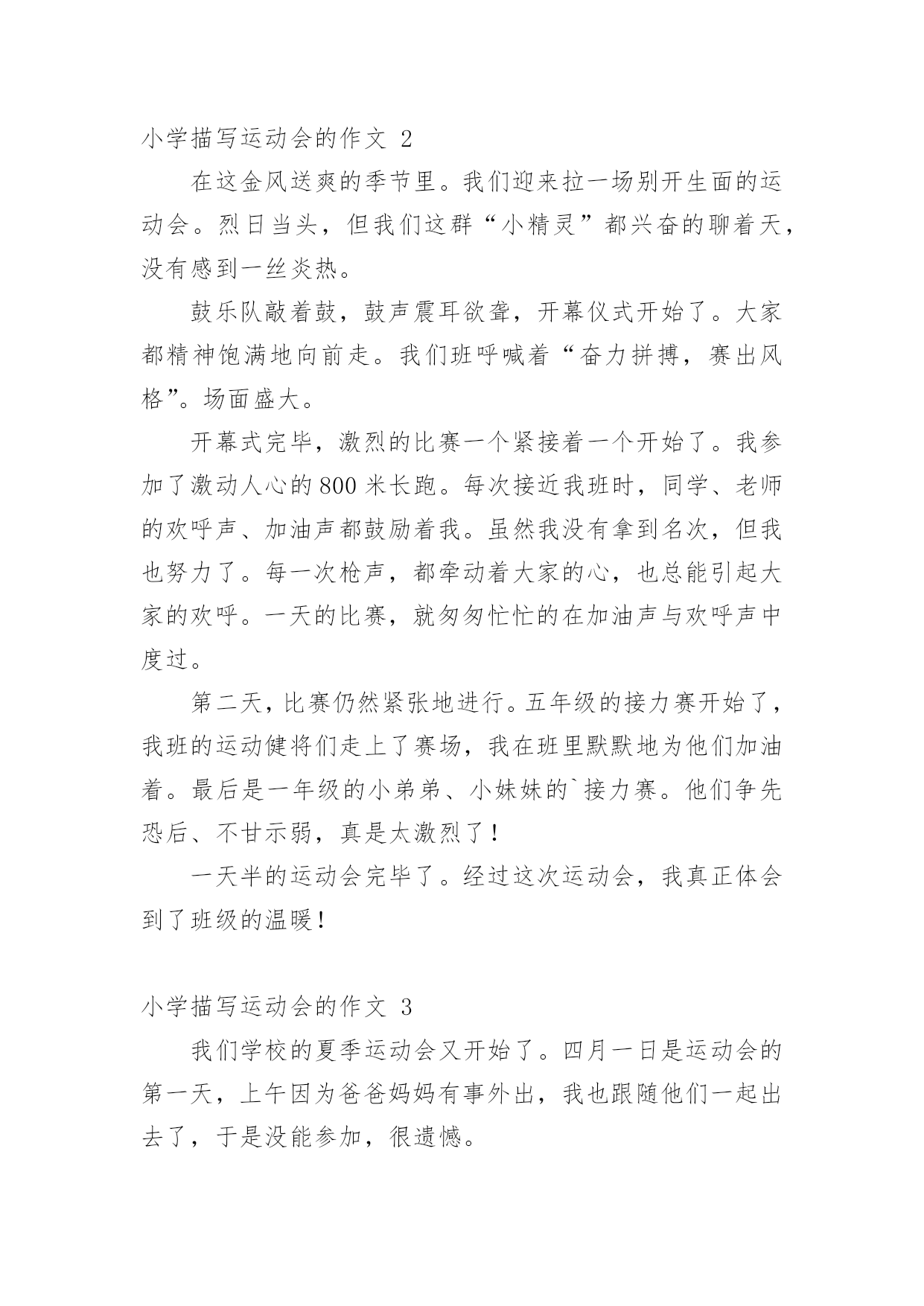 小学描写运动会的作文小学描写运动会的作文(精选63篇)在日常学习、工作或生活中,大家都写过作文吧,借助作文人们可以反映客观事物、表达思想感情、传递知识信息。你知道作文怎样才能写的好吗?以下是小编精心整理的小学描写运动会的作文,欢迎大家借鉴与参考,希望对大家有所帮助。小学描写运动会的作文1昨天,天气秋高气爽,我校举行了一年一度的秋季运动会。运动会开始前,首先是运动员入场,同学们穿着鲜艳的服装,迈着整齐的步伐,喊着响亮的口号,走进会场。运动会开始后,只见运动员个个精神抖擞,生龙活虎地活跃在运动场上。最引人注目的项目是接力赛,我班选派了男、女生各十名参加比赛。接力赛开始了,只听枪声一响,运动员们像离弦的箭一样,飞快地向前奔跑。交棒,接棒,大家争先恐后,你追我赶,不甘示弱。这时,场外的拉拉队员都激动地呐喊:“加油,加油。”最后,我们班取得了第二名,但我们还是很高兴。运动会在欢乐的.气氛中结束了,但欢乐的气氛仍然在我的脑海中久久地回荡。小学描写运动会的作文2在这金风送爽的季节里。我们迎来拉一场别开生面的运动会。烈日当头,但我们这群“小精灵”都兴奋的聊着天,没有感到一丝炎热。鼓乐队敲着鼓,鼓声震耳欲聋,开幕仪式开始了。大家都精神饱满地向前走。我们班呼喊着“奋力拼搏,赛出风格”。场面盛大。开幕式完毕,激烈的比赛一个紧接着一个开始了。我参加了激动人心的800米长跑。每次接近我班时,同学、老师的欢呼声、加油声都鼓励着我。虽然我没有拿到名次,但我也努力了。每一次枪声,都牵动着大家的心,也总能引起大家的欢呼。一天的比赛,就匆匆忙忙的在加油声与欢呼声中度过。第二天,比赛仍然紧张地进行。五年级的接力赛开始了,我班的运动健将们走上了赛场,我在班里默默地为他们加油着。最后是一年级的小弟弟、小妹妹的`接力赛。他们争先恐后、不甘示弱,真是太激烈了!一天半的运动会完毕了。经过这次运动会,我真正体会到了班级的温暖!小学描写运动会的作文3我们学校的夏季运动会又开始了。四月一日是运动会的第一天,上午因为爸爸妈妈有事外出,我也跟随他们一起出去了,于是没能参加,很遗憾。下午我们急急忙忙赶回家,来到了学校,听陆老师说,上午我们班的比赛成绩都不错,个个都拿到了名次和奖品。下午三点我们参加了跳大绳比赛,这项比赛是我们的爸爸妈妈参加。参赛的家长认认真真的跳着,最后还是只跳了九十四个,我们班输了。但我们都知道,爸爸妈妈们已经尽力了。四月二日上午的比赛更精彩。我们班参加了一百米接力赛的决赛,他们都跑的.很好、很努力,也很精彩。虽然这次我什么也没能参加,但我也很高兴啊。因为我在为参加比赛的同学助威加油,为他们呐喊。希望下次运动会时,我也能参加几个比赛项目,同时也希望陆老师和罗老师支持我。这次运动会在我们学校圆满而成功的结束了。小学描写运动会的作文4今天,我们学校开了一次运动会,主题是超越自己。你看,那些运动员正在进行长跑比赛!他们各就各位,枪声一响,他们便飞快地冲了出去。他们踏出的每一个脚印,都凝聚着勇气和力量;他们迈出的每一步,都是耐力与心智;他们跑过的每一圈,都记录着拼搏与较量。他们是坚强无畏的勇士,为了荣誉,超越自己,为了梦想信心十足,他们的精神令人佩服!看那边短跑的将士吧!他们飞奔过去,冲线似乎只是一瞬间,他们为了证明自己的实力,飞快奔跑,这种超越极限的'人,怎能不叫人感到!再看看接力赛吧!他们手中的接力棒不断传递,速度也越来越快,这种配合默契,团结合作的人一定会成功的!场上的每一位运动员都有自己的梦想和愿望,他们正在以坚实的脚步,去实现未来的理想。小学描写运动会的作文5盼望着,盼望着,我校第十四届田径运动会终于被我盼来了!首先是开幕式,开幕式的场面那是彩旗飘扬,鼓号阵阵,非常响亮。彩旗队的旗手把旗举得高高的,多威风啊!比赛开始了。第一个项目是女子400米预赛。只听裁判员一声枪响,运动员们像离弦的'箭一般,飞了出去,我们班的刘家烁跑在了第一位,其他运动员紧紧追赶,就是追不上她。我们踮起脚尖,伸长了脖子观看刘家烁的比赛。到了最后的100米,我们看见她没有劲儿了,我们就高声喊到:“刘家烁,加油,加油!”我们的老师也迅速跑过去,跟她跑完了最后一段路。刘家烁是第一名,她一蹦三尺高。到了闭幕式时间,我们班得了二等奖,虽然没有得上第一名,但我还是很高兴的。我期望下一届运动会的来临。小学描写运动会的作文6今天,老师说:“我们一年一度的春季田径运动会又开始了。”我们高兴极了,一蹦三尺高!不一会儿,鼓号齐鸣,我们坐下之后,运动会就开始了。第一项是我们班的董一鸣和三、四班的'同学进行短跑比赛,因为董一鸣起跑差一点儿摔倒,但是他不甘落后,奋起直追,最终得了第二名。第二个项目是张志聪和别班的同学比赛,他在快到终点的时候用力加速,一下子就获得了第一名。于亚楠参加了第三个项目,他本来跑在了最前面,接近