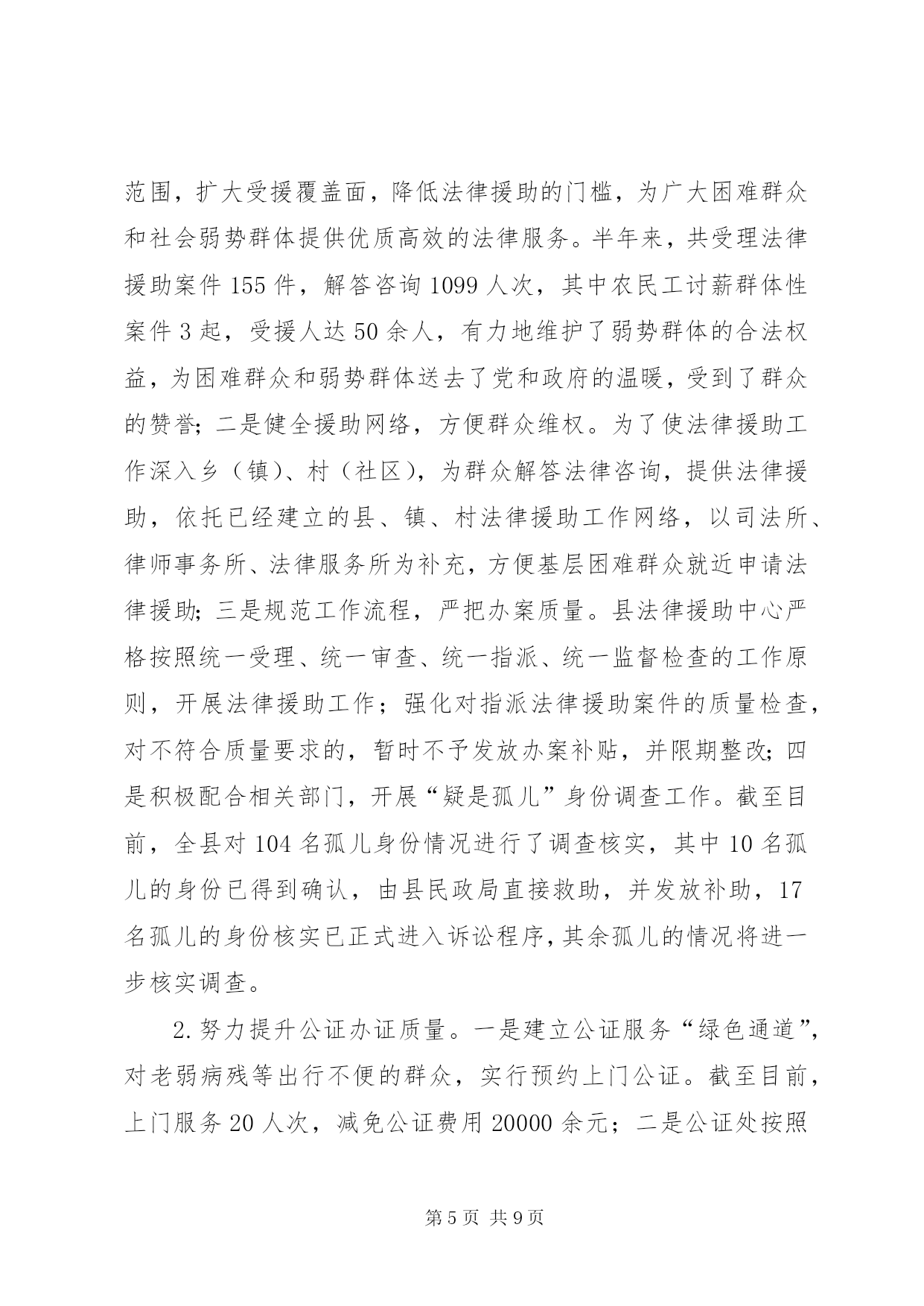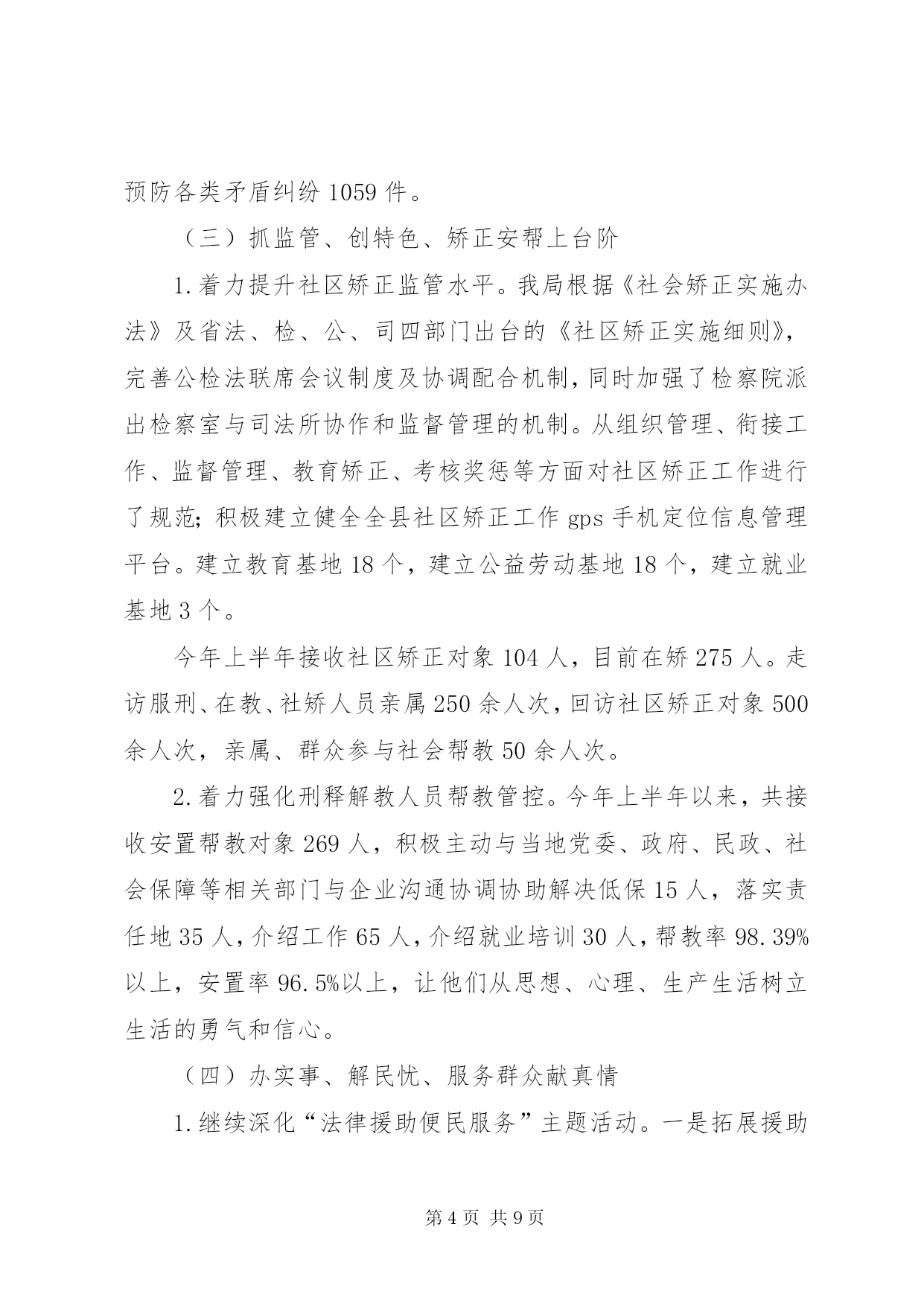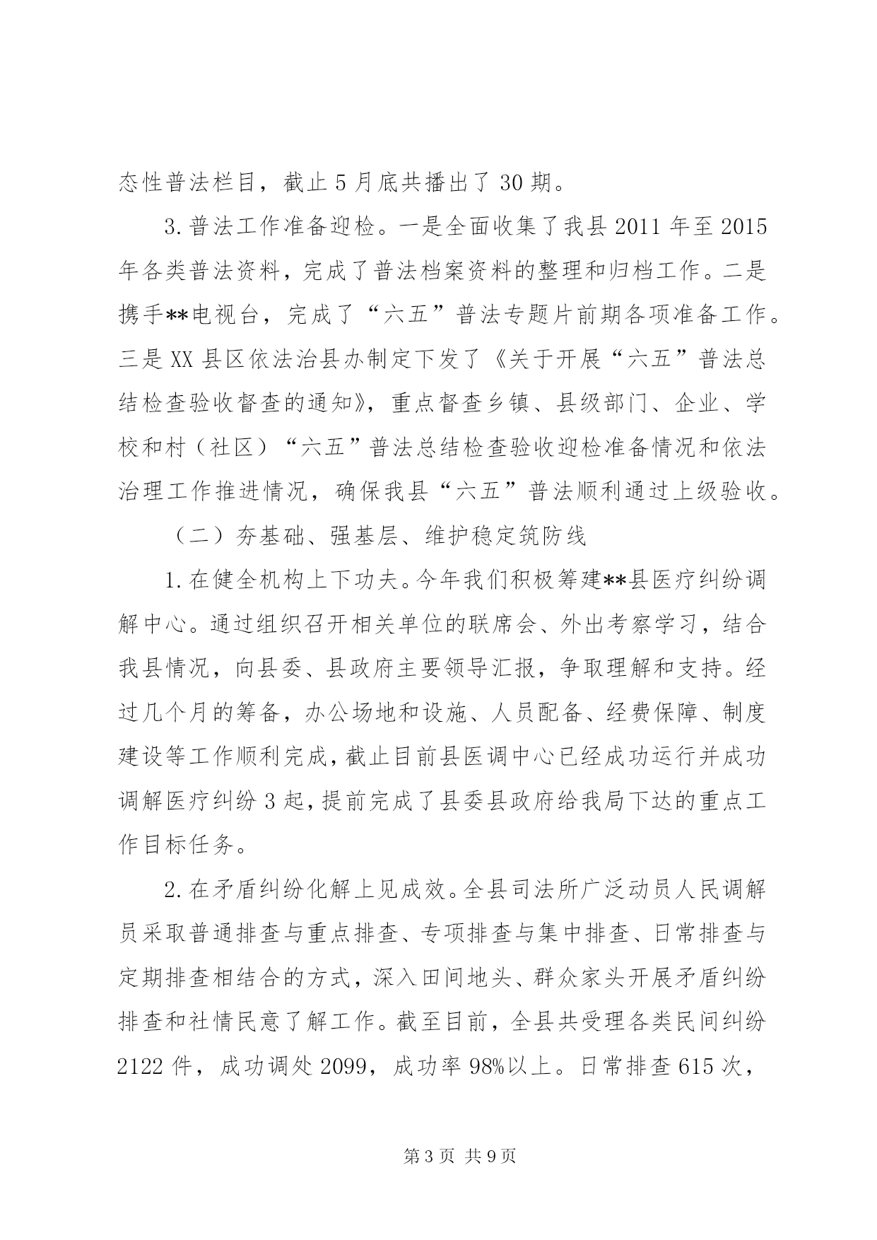 第PAGE\*Arabic\*MERGEFORMAT9页共NUMPAGES\*MERGEFORMAT9页司法局工作总结及工作打算一、2015年上半年工作总结今年上半年,我局在县委、县政府的正确领导和XX市司法局的具体指导下,紧紧围绕县委县政府中心工作,坚持“司法为民”的工作要求,努力在服务大局、保障发展、促进和谐上充分发挥各项职能作用,为全县经济社会又好又快发展做出了新的贡献。(一)抓重点、求实效、普治工作有特色1.“六五”普法扎实开展。一是制定《司法行政系统2015年度学法计划》,采取会前学法、专题学法和自学的方式,加强《宪法》、《安全生产法》和《社区矫正实施办法》等法律知识的学习,截止目前,共举行集中学法活动5次;二是利用“3.15消费者维权日”、“综治宣传月”、“安全生产月”等时段,在县城举行集中法治宣传活动6次。各乡镇司法所利用逢场天开展集中宣讲活动100余场,共发放《**县实用法律知识手册》、《法律援助手册》、《法律服务便民手册》等普法书籍8500册,散发《治安管理处罚法》、《道路交通安全法》、《食品安全法》、《消费者权益保护法》等宣传资料50000余份,悬挂法制宣传横(条)幅30余条,现场解答群众法律咨询1500余人次。三是充分运用司法行政门户网站、新浪官方微博、手机普法短信和各类新闻媒介等普法载体,加强普法舆论宣传,半年来,在司法行政门户网向公开非涉密普法文件等信息30条,编写各普法信息简报11期,发布法制宣传微博13条,发送普法短信2万余条。四是开展“法贺新春、共享和谐”专项法治宣传活动,不断推动“法律七进”工作落实,先后组织普法讲师团成员、法制宣传骨干、普法自愿者、法制宣传小分队开展“法律进社区”30次,“法律进学校”20余次,“法律进单位”20余次,“法律进机关”20余次,“法律进企业”10余次,“法律进乡村”40余次,“法律进宗教场所”13次。2.法治建设深入推进。一是在认真分析总结**年工作基础上,按照中、省、市总体安排部署,结合工作实际,会同依法治县办制定下发了《**县2015年普法暨依法治理工作要点》、《**县2015年依法治县工作要点》、《关于做好“六五”普法总体考核验收工作的通知》等文件,进一步细化了《**县司法所2015年目标考核责任书》中普法依法暨治理工作内容;二是召开专(兼)职司法助理员培训会对相关工作任务进行了详细解读和全面部署,明确了2015年普法依法治理工作目标、工作任务和完成期限;三是修缮维护现有的法治广场、法治长廊、法治街道、法治茶园等法治阵地的基础上,准备在城市公交站台、XX县区垃圾箱广告位等新设57个法治公益广告,继续推动金城镇等乡镇法治文化阵地建设;充分发挥**广播电视台普法宣传主阵地作用,及时更新了“反腐纵横”、“德乡故事会”、“法治进行时”等常态性普法栏目,截止5月底共播出了30期。3.普法工作准备迎检。一是全面收集了我县2011年至2015年各类普法资料,完成了普法档案资料的整理和归档工作。二是携手**电视台,完成了“六五”普法专题片前期各项准备工作。三是XX县区依法治县办制定下发了《关于开展“六五”普法总结检查验收督查的通知》,重点督查乡镇、县级部门、企业、学校和村(社区)“六五”普法总结检查验收迎检准备情况和依法治理工作推进情况,确保我县“六五”普法顺利通过上级验收。(二)夯基础、强基层、维护稳定筑防线1.在健全机构上下功夫。今年我们积极筹建**县医疗纠纷调解中心。通过组织召开相关单位的联席会、外出考察学习,结合我县情况,向县委、县政府主要领导汇报,争取理解和支持。经过几个月的筹备,办公场地和设施、人员配备、经费保障、制度建设等工作顺利完成,截止目前县医调中心已经成功运行并成功调解医疗纠纷3起,提前完成了县委县政府给我局下达的重点工作目标任务。2.在矛盾纠纷化解上见成效。全县司法所广泛动员人民调解员采取普通排查与重点排查、专项排查与集中排查、日常排查与定期排查相结合的方式,深入田间地头、群众家头开展矛盾纠纷排查和社情民意了解工作。截至目前,全县共受理各类民间纠纷2122件,成功调处2099,成功率98%以上。日常排查615次,预防各类矛盾纠纷1059件。(三)抓监管、创特色、矫正安帮上台阶1.着力提升社区矫正监管水平。我局根据《社会矫正实施办法》及省法、检、公、司四部门出台的《社区矫正实施细则》,完善公检法联席会议制度及协调配合机制,同时加强了检察院派出检察室与司法所协作和监督管理的机制。从组织管理、衔接工作、监督管理、教育矫正、考核奖惩等方面对社区矫正工作进行了规范;积极建立健全全县社区矫正工作gps手机定位信息管理平台。建立教育基地18个,建立公益劳动基地18个,建立就业基地3个。今年上半年接收社区矫正对象104人,目前在矫275人。