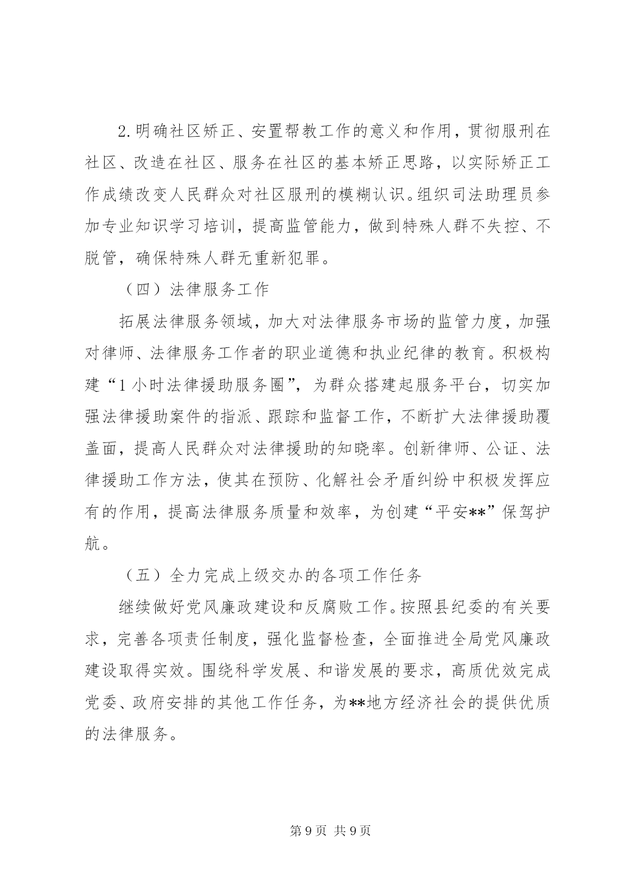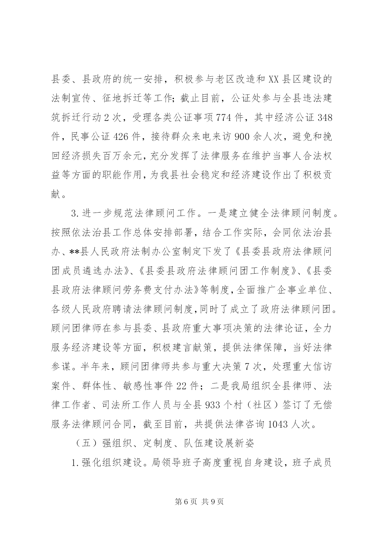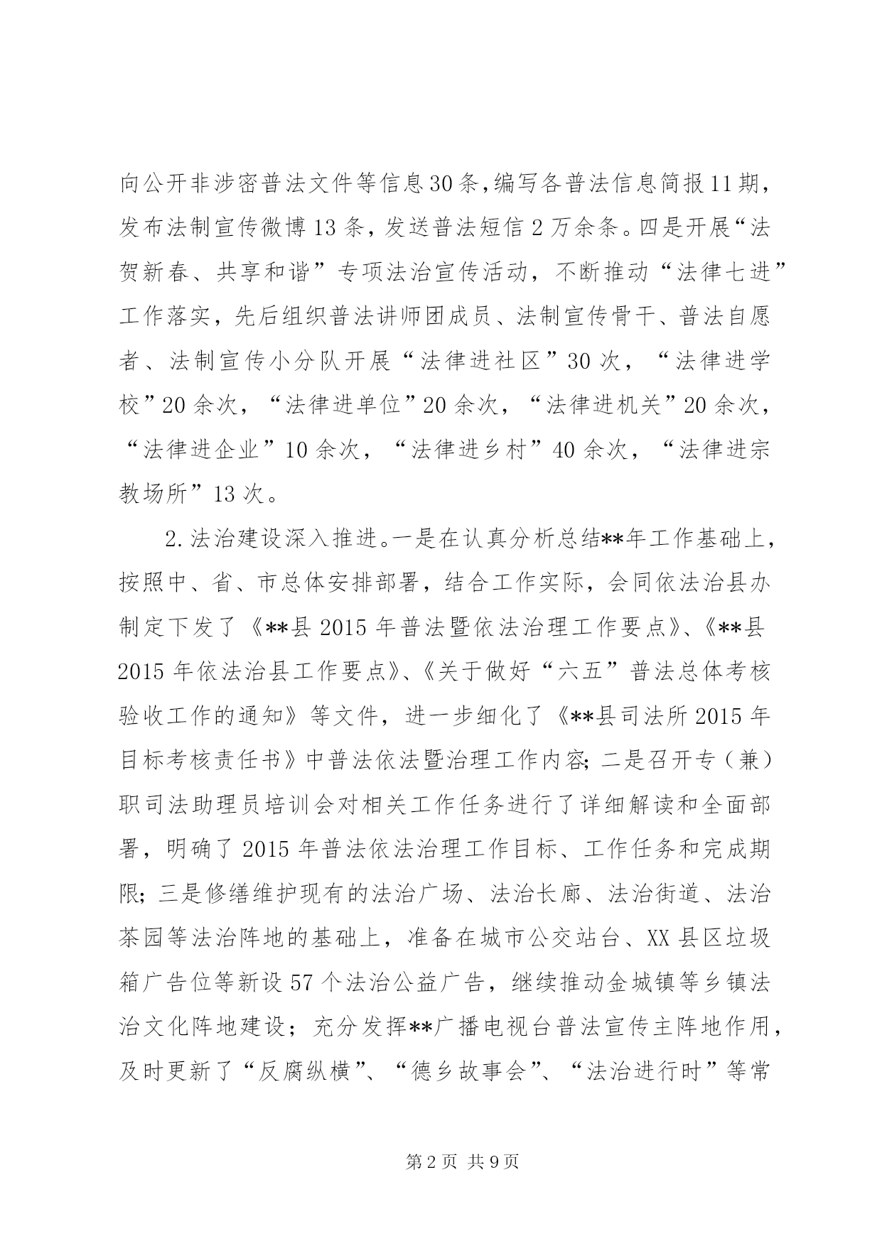 第PAGE\*Arabic\*MERGEFORMAT9页共NUMPAGES\*MERGEFORMAT9页司法局工作总结及工作打算一、2015年上半年工作总结今年上半年,我局在县委、县政府的正确领导和XX市司法局的具体指导下,紧紧围绕县委县政府中心工作,坚持“司法为民”的工作要求,努力在服务大局、保障发展、促进和谐上充分发挥各项职能作用,为全县经济社会又好又快发展做出了新的贡献。(一)抓重点、求实效、普治工作有特色1.“六五”普法扎实开展。一是制定《司法行政系统2015年度学法计划》,采取会前学法、专题学法和自学的方式,加强《宪法》、《安全生产法》和《社区矫正实施办法》等法律知识的学习,截止目前,共举行集中学法活动5次;二是利用“3.15消费者维权日”、“综治宣传月”、“安全生产月”等时段,在县城举行集中法治宣传活动6次。各乡镇司法所利用逢场天开展集中宣讲活动100余场,共发放《**县实用法律知识手册》、《法律援助手册》、《法律服务便民手册》等普法书籍8500册,散发《治安管理处罚法》、《道路交通安全法》、《食品安全法》、《消费者权益保护法》等宣传资料50000余份,悬挂法制宣传横(条)幅30余条,现场解答群众法律咨询1500余人次。三是充分运用司法行政门户网站、新浪官方微博、手机普法短信和各类新闻媒介等普法载体,加强普法舆论宣传,半年来,在司法行政门户网向公开非涉密普法文件等信息30条,编写各普法信息简报11期,发布法制宣传微博13条,发送普法短信2万余条。四是开展“法贺新春、共享和谐”专项法治宣传活动,不断推动“法律七进”工作落实,先后组织普法讲师团成员、法制宣传骨干、普法自愿者、法制宣传小分队开展“法律进社区”30次,“法律进学校”20余次,“法律进单位”20余次,“法律进机关”20余次,“法律进企业”10余次,“法律进乡村”40余次,“法律进宗教场所”13次。2.法治建设深入推进。一是在认真分析总结**年工作基础上,按照中、省、市总体安排部署,结合工作实际,会同依法治县办制定下发了《**县2015年普法暨依法治理工作要点》、《**县2015年依法治县工作要点》、《关于做好“六五”普法总体考核验收工作的通知》等文件,进一步细化了《**县司法所2015年目标考核责任书》中普法依法暨治理工作内容;二是召开专(兼)职司法助理员培训会对相关工作任务进行了详细解读和全面部署,明确了2015年普法依法治理工作目标、工作任务和完成期限;三是修缮维护现有的法治广场、法治长廊、法治街道、法治茶园等法治阵地的基础上,准备在城市公交站台、XX县区垃圾箱广告位等新设57个法治公益广告,继续推动金城镇等乡镇法治文化阵地建设;充分发挥**广播电视台普法宣传主阵地作用,及时更新了“反腐纵横”、“德乡故事会”、“法治进行时”等常态性普法栏目,截止5月底共播出了30期。3.普法工作准备迎检。一是全面收集了我县2011年至2015年各类普法资料,完成了普法档案资料的整理和归档工作。二是携手**电视台,完成了“六五”普法专题片前期各项准备工作。三是XX县区依法治县办制定下发了《关于开展“六五”普法总结检查验收督查的通知》,重点督查乡镇、县级部门、企业、学校和村(社区)“六五”普法总结检查验收迎检准备情况和依法治理工作推进情况,确保我县“六五”普法顺利通过上级验收。(二)夯基础、强基层、维护稳定筑防线1.在健全机构上下功夫。今年我们积极筹建**县医疗纠纷调解中心。通过组织召开相关单位的联席会、外出考察学习,结合我县情况,向县委、县政府主要领导汇报,争取理解和支持。经过几个月的筹备,办公场地和设施、人员配备、经费保障、制度建设等工作顺利完成,截止目前县医调中心已经成功运行并成功调解医疗纠纷3起,提前完成了县委县政府给我局下达的重点工作目标任务。2.在矛盾纠纷化解上见成效。全县司法所广泛动员人民调解员采取普通排查与重点排查、专项排查与集中排查、日常排查与定期排查相结合的方式,深入田间地头、群众家头开展矛盾纠纷排查和社情民意了解工作。截至目前,全县共受理各类民间纠纷2122件,成功调处2099,成功率98%以上。日常排查615次,预防各类矛盾纠纷1059件。(三)抓监管、创特色、矫正安帮上台阶1.着力提升社区矫正监管水平。我局根据《社会矫正实施办法》及省法、检、公、司四部门出台的《社区矫正实施细则》,完善公检法联席会议制度及协调配合机制,同时加强了检察院派出检察室与司法所协作和监督管理的机制。从组织管理、衔接工作、监督管理、教育矫正、考核奖惩等方面对社区矫正工作进行了规范;积极建立健全全县社区矫正工作gps手机定位信息管理平台。建立教育基地18个,建立公益劳动基地18个,建立就业基地3个。今年上半年接收社区矫正对象104人,目前在矫275人。