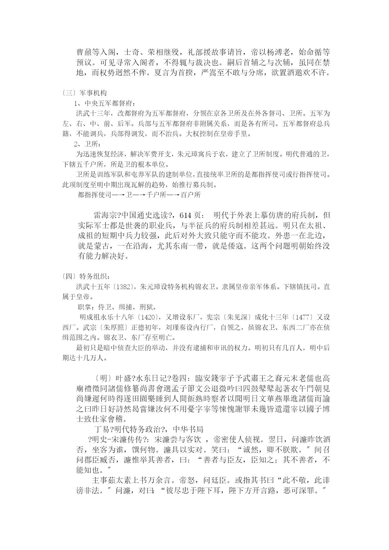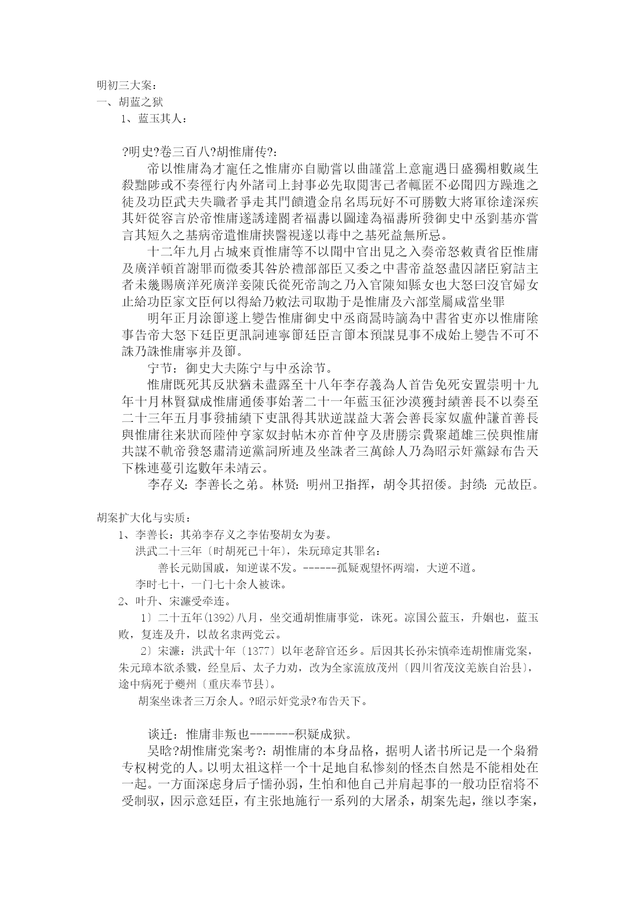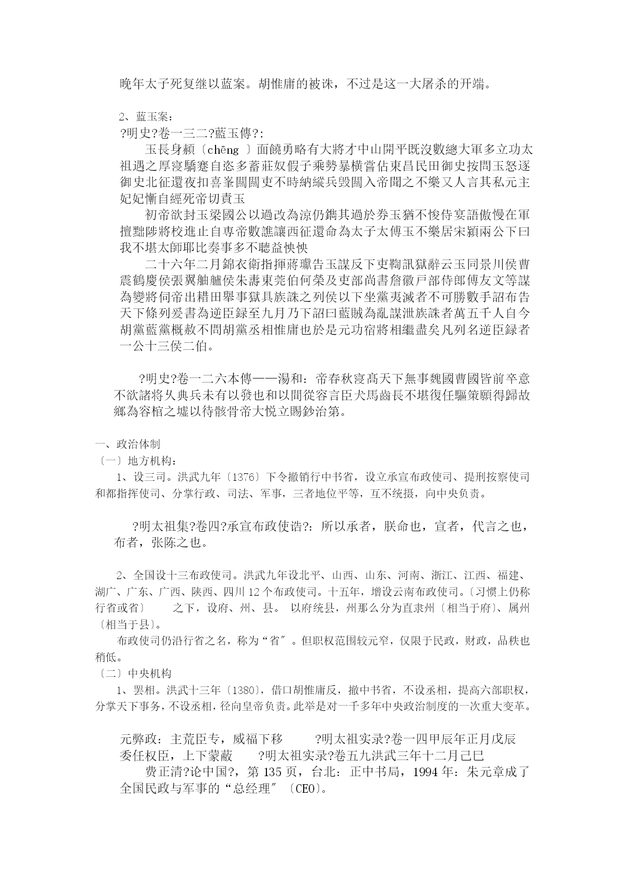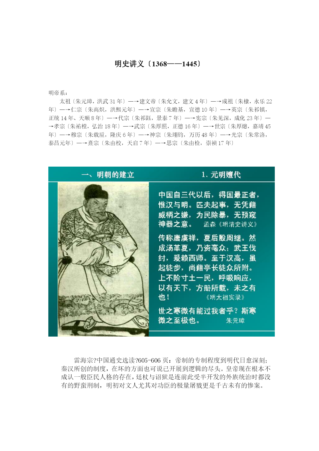 明史讲义【完整版】(文档可以直接使用,也可根据实际需要修订后使用,可编辑放心下载)明史讲义〔1368——1445〕明帝系:太祖〔朱元璋,洪武31年〕—→建文帝〔朱允文,建文4年〕—→成祖〔朱棣,永乐22年〕—→仁宗〔朱高炽,洪熙元年〕—→宣宗〔朱瞻基,宣德10年〕—→英宗〔朱祁镇,正统14年、天顺8年〕—→代宗〔朱祁鈺,景泰7年〕—→宪宗〔朱见深,成化23年〕—→孝宗〔朱祐樘,弘治18年〕—→武宗〔朱厚照,正德16年〕—→世宗〔朱厚熜,嘉靖45年〕—→穆宗〔朱载垕,隆庆6年〕—→神宗〔朱翊钧,万历48年〕—→光宗〔朱常洛,泰昌元年〕—→熹宗〔朱由校,天启7年〕—→思宗〔朱由检,崇祯17年〕雷海宗?中国通史选读?605-606页:帝制的专制程度到明代日愈深刻;秦汉所创的制度,在坏的方面也可说已开展到逻辑的尽头。皇帝现在根本不成认一般臣民人格的存在,廷杖与诏狱是连前此受半开发的外族统治时都没有的野蛮刑制,明初对文人尤其对功臣的极量屠戮更是千古未有的惨案。明初三大案:一、胡蓝之狱1、蓝玉其人:?明史?卷三百八?胡惟庸传?:帝以惟庸為才寵任之惟庸亦自勵嘗以曲謹當上意寵遇日盛獨相數嵗生殺黜陟或不奏徑行内外諸司上封事必先取閲害己者輒匿不必聞四方躁進之徒及功臣武夫失職者爭走其門饋遺金帛名馬玩好不可勝數大將軍徐達深疾其奸從容言於帝惟庸遂誘達閽者福夀以圖達為福夀所發御史中丞劉基亦嘗言其短久之基病帝遣惟庸挟醫視遂以毒中之基死益無所忌。十二年九月占城來貢惟庸等不以聞中官出見之入奏帝怒敇責省臣惟庸及廣洋頓首謝罪而微委其咎於禮部部臣又委之中書帝益怒盡囚諸臣窮詰主者未㡬賜廣洋死廣洋妾陳氏從死帝詢之乃入官陳知縣女也大怒曰沒官婦女止給功臣家文臣何以得給乃敇法司取勘于是惟庸及六部堂屬咸當坐罪明年正月涂節遂上變告惟庸御史中丞商暠時謫為中書省吏亦以惟庸隂事告帝大怒下廷臣更訊詞連寧節廷臣言節本預謀見事不成始上變告不可不誅乃誅惟庸寧并及節。宁节:御史大夫陈宁与中丞涂节。惟庸既死其反狀猶未盡露至十八年李存義為人首告免死安置崇明十九年十月林賢獄成惟庸通倭事始著二十一年藍玉征沙漠獲封績善長不以奏至二十三年五月事發捕績下吏訊得其狀逆謀益大著会善長家奴盧仲謙首善長與惟庸往来狀而陸仲亨家奴封帖木亦首仲亨及唐勝宗費聚趙雄三侯與惟庸共謀不軌帝發怒肅清逆黨詞所連及坐誅者三萬餘人乃為昭示奸黨録布告天下株連蔓引迄數年未靖云。李存义:李善长之弟。林贤:明州卫指挥,胡令其招倭。封绩:元故臣。胡案扩大化与实质:1、李善长:其弟李存义之李佑娶胡女为妻。洪武二十三年〔时胡死已十年〕,朱玩璋定其罪名:善长元勋国戚,知逆谋不发。------孤疑观望怀两端,大逆不道。李时七十,一门七十余人被诛。2、叶升、宋濂受牵连。1〕二十五年(1392)八月,坐交通胡惟庸事觉,诛死。凉国公蓝玉,升姻也,蓝玉败,复连及升,以故名隶两党云。2〕宋濂:洪武十年〔1377〕以年老辞官还乡。后因其长孙宋慎牵连胡惟庸党案,朱元璋本欲杀戮,经皇后、太子力劝,改为全家流放茂州〔四川省茂汶羌族自治县〕,途中病死于夔州〔重庆奉节县〕。胡案坐诛者三万余人。?昭示奸党录?布告天下。谈迁:惟庸非叛也-------积疑成狱。吴晗?胡惟庸党案考?:胡惟庸的本身品格,据明人诸书所记是一个枭猾专权树党的人。以明太祖这样一个十足地自私惨刻的怪杰自然是不能相处在一起。一方面深虑身后子懦孙弱,生怕和他自己并肩起事的一般功臣宿将不受制驭,因示意廷臣,有主张地施行一系列的大屠杀,胡案先起,继以李案,晚年太子死复继以蓝案。胡惟庸的被诛,不过是这一大屠杀的开端。2、蓝玉案:?明史?卷一三二?藍玉傳?:玉長身頳〔chēng〕面饒勇略有大將才中山開平既沒數總大軍多立功太祖遇之厚寖驕蹇自恣多蓄莊奴假子乘勢暴横嘗佔東昌民田御史按問玉怒逐御史北征還夜扣喜峯闗闗吏不時納縱兵毁闗入帝聞之不樂又人言其私元主妃妃慚自經死帝切責玉初帝欲封玉梁國公以過改為涼仍鐫其過於券玉猶不悛侍宴語傲慢在軍擅黜陟將校進止自専帝數譙讓西征還命為太子太傅玉不樂居宋潁兩公下曰我不堪太師耶比奏事多不聴益怏怏二十六年二月錦衣衛指揮蔣瓛告玉謀反下吏鞫訊獄辭云玉同景川侯曹震鶴慶侯張翼舳艫侯朱夀東莞伯何榮及吏部尚書詹徽戸部侍郎傅友文等謀為變將伺帝出耤田舉事獄具族誅之列侯以下坐黨夷滅者不可勝數手詔布告天下條列爰書為逆臣録至九月乃下詔曰藍賊為亂謀泄族誅者萬五千人自今胡黨藍黨概赦不問胡黨丞相惟庸也於是元功宿將相繼盡矣凡列名逆臣録者一公十三侯二伯。?明史?卷一二六本傳——湯和:帝春秋寖髙天下無事魏國曹國皆前卒意不欲諸将乆典兵未有以發也和以間從容言臣犬馬齒長不堪復任驅策願得歸故鄉為容棺之墟以待骸骨帝大悦立賜鈔治第。一、政治体制〔一〕