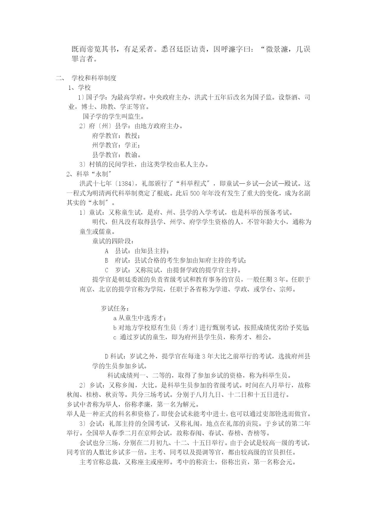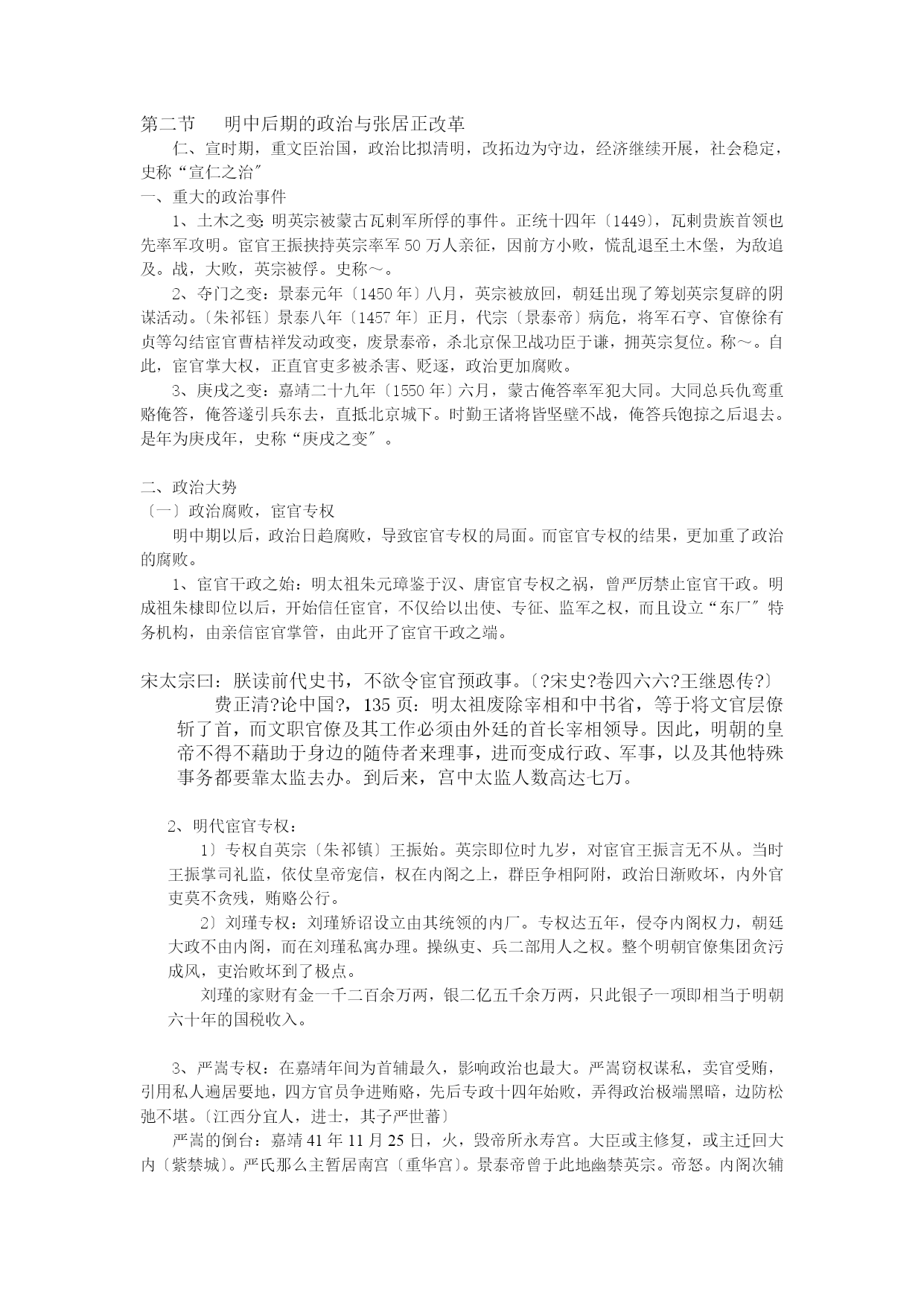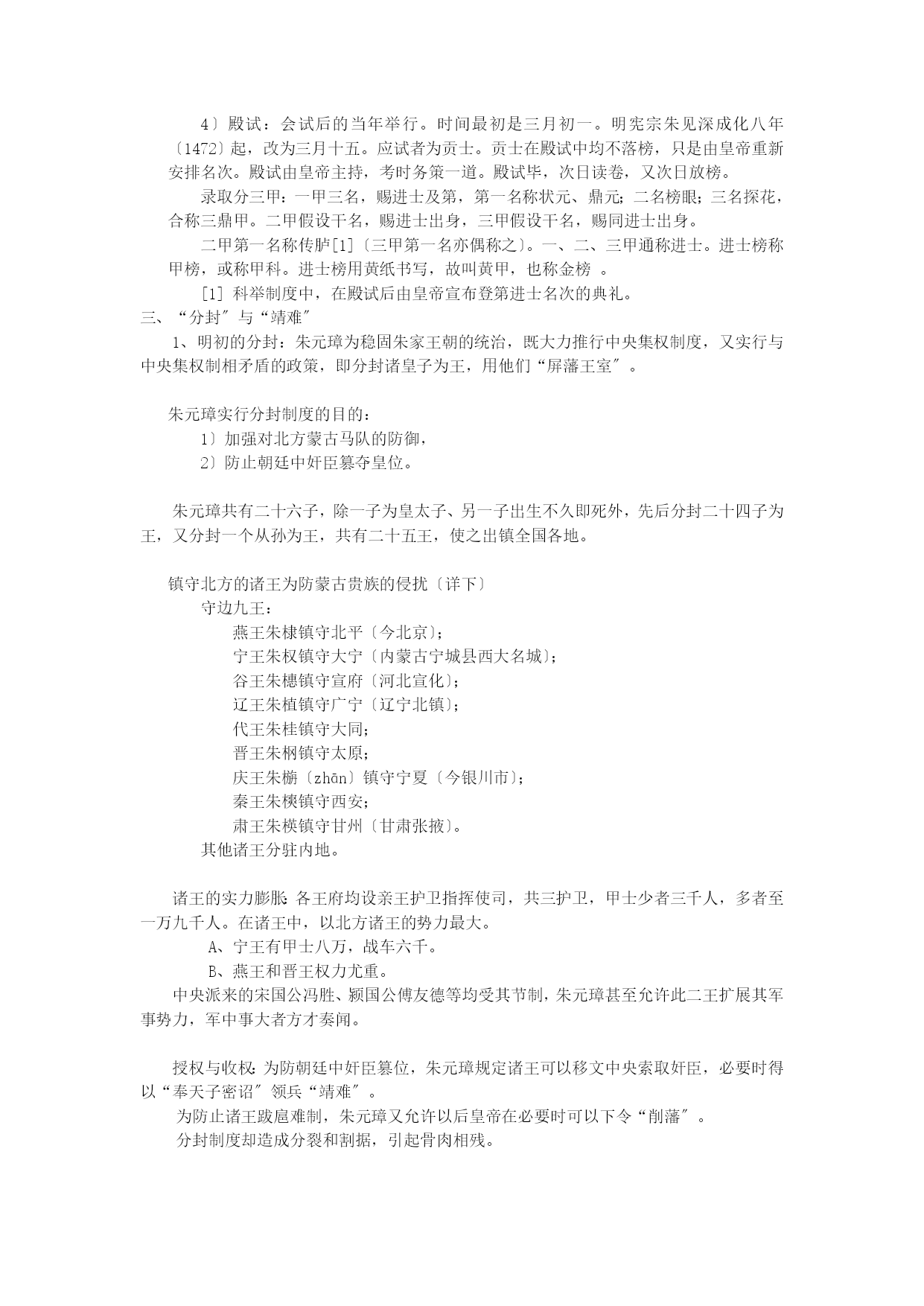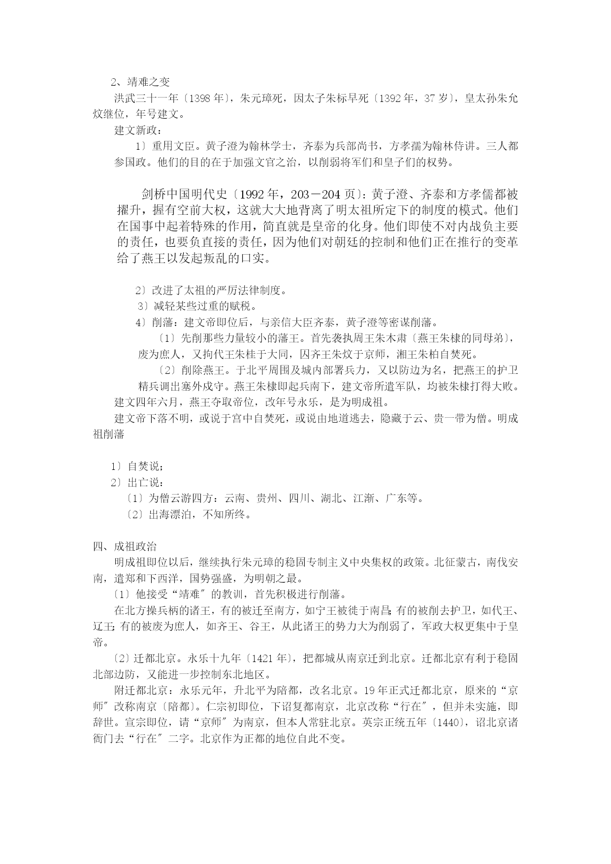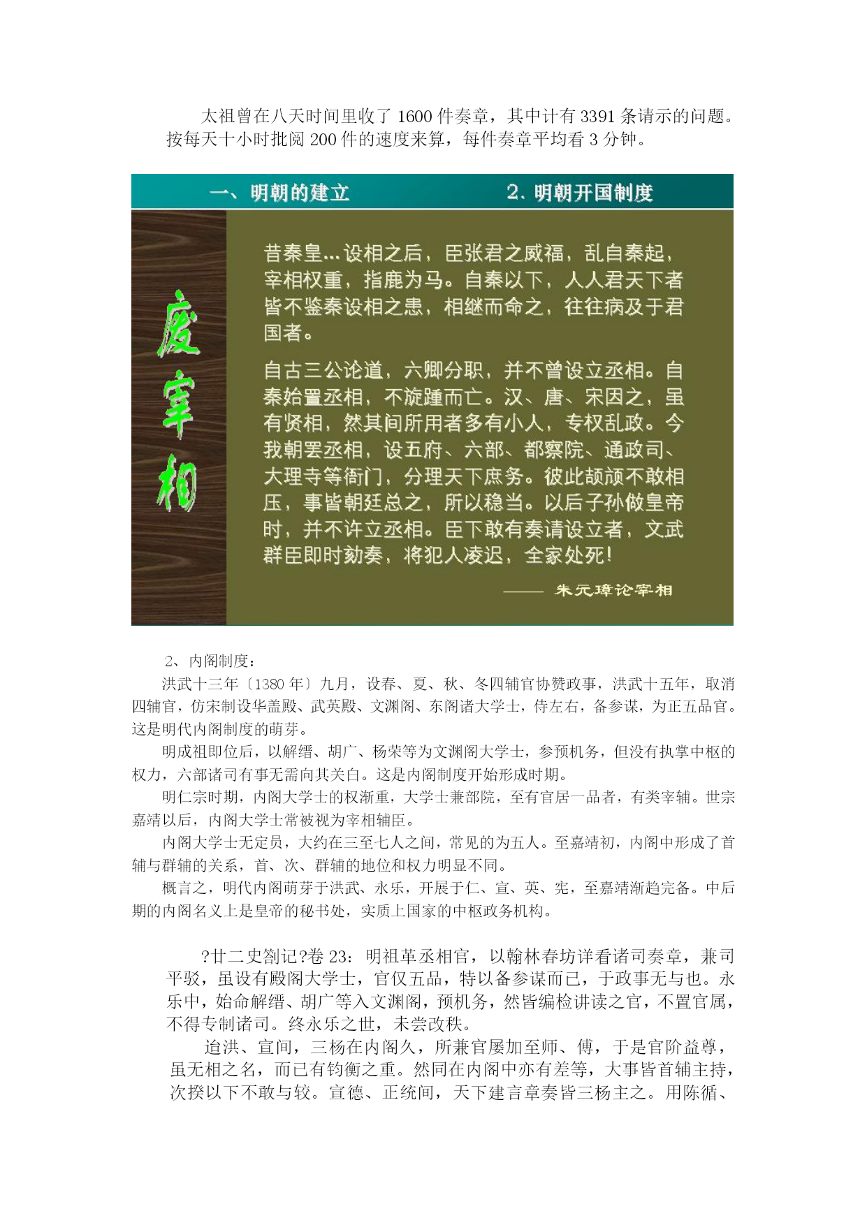 明史讲义【完整版】(文档可以直接使用,也可根据实际需要修订后使用,可编辑放心下载)明史讲义〔1368——1445〕明帝系:太祖〔朱元璋,洪武31年〕—→建文帝〔朱允文,建文4年〕—→成祖〔朱棣,永乐22年〕—→仁宗〔朱高炽,洪熙元年〕—→宣宗〔朱瞻基,宣德10年〕—→英宗〔朱祁镇,正统14年、天顺8年〕—→代宗〔朱祁鈺,景泰7年〕—→宪宗〔朱见深,成化23年〕—→孝宗〔朱祐樘,弘治18年〕—→武宗〔朱厚照,正德16年〕—→世宗〔朱厚熜,嘉靖45年〕—→穆宗〔朱载垕,隆庆6年〕—→神宗〔朱翊钧,万历48年〕—→光宗〔朱常洛,泰昌元年〕—→熹宗〔朱由校,天启7年〕—→思宗〔朱由检,崇祯17年〕雷海宗?中国通史选读?605-606页:帝制的专制程度到明代日愈深刻;秦汉所创的制度,在坏的方面也可说已开展到逻辑的尽头。皇帝现在根本不成认一般臣民人格的存在,廷杖与诏狱是连前此受半开发的外族统治时都没有的野蛮刑制,明初对文人尤其对功臣的极量屠戮更是千古未有的惨案。明初三大案:一、胡蓝之狱1、蓝玉其人:?明史?卷三百八?胡惟庸传?:帝以惟庸為才寵任之惟庸亦自勵嘗以曲謹當上意寵遇日盛獨相數嵗生殺黜陟或不奏徑行内外諸司上封事必先取閲害己者輒匿不必聞四方躁進之徒及功臣武夫失職者爭走其門饋遺金帛名馬玩好不可勝數大將軍徐達深疾其奸從容言於帝惟庸遂誘達閽者福夀以圖達為福夀所發御史中丞劉基亦嘗言其短久之基病帝遣惟庸挟醫視遂以毒中之基死益無所忌。十二年九月占城來貢惟庸等不以聞中官出見之入奏帝怒敇責省臣惟庸及廣洋頓首謝罪而微委其咎於禮部部臣又委之中書帝益怒盡囚諸臣窮詰主者未㡬賜廣洋死廣洋妾陳氏從死帝詢之乃入官陳知縣女也大怒曰沒官婦女止給功臣家文臣何以得給乃敇法司取勘于是惟庸及六部堂屬咸當坐罪明年正月涂節遂上變告惟庸御史中丞商暠時謫為中書省吏亦以惟庸隂事告帝大怒下廷臣更訊詞連寧節廷臣言節本預謀見事不成始上變告不可不誅乃誅惟庸寧并及節。宁节:御史大夫陈宁与中丞涂节。惟庸既死其反狀猶未盡露至十八年李存義為人首告免死安置崇明十九年十月林賢獄成惟庸通倭事始著二十一年藍玉征沙漠獲封績善長不以奏至二十三年五月事發捕績下吏訊得其狀逆謀益大著会善長家奴盧仲謙首善長與惟庸往来狀而陸仲亨家奴封帖木亦首仲亨及唐勝宗費聚趙雄三侯與惟庸共謀不軌帝發怒肅清逆黨詞所連及坐誅者三萬餘人乃為昭示奸黨録布告天下株連蔓引迄數年未靖云。李存义:李善长之弟。林贤:明州卫指挥,胡令其招倭。封绩:元故臣。胡案扩大化与实质:1、李善长:其弟李存义之李佑娶胡女为妻。洪武二十三年〔时胡死已十年〕,朱玩璋定其罪名:善长元勋国戚,知逆谋不发。------孤疑观望怀两端,大逆不道。李时七十,一门七十余人被诛。2、叶升、宋濂受牵连。1〕二十五年(1392)八月,坐交通胡惟庸事觉,诛死。凉国公蓝玉,升姻也,蓝玉败,复连及升,以故名隶两党云。2〕宋濂:洪武十年〔1377〕以年老辞官还乡。后因其长孙宋慎牵连胡惟庸党案,朱元璋本欲杀戮,经皇后、太子力劝,改为全家流放茂州〔四川省茂汶羌族自治县〕,途中病死于夔州〔重庆奉节县〕。胡案坐诛者三万余人。?昭示奸党录?布告天下。谈迁:惟庸非叛也-------积疑成狱。吴晗?胡惟庸党案考?:胡惟庸的本身品格,据明人诸书所记是一个枭猾专权树党的人。以明太祖这样一个十足地自私惨刻的怪杰自然是不能相处在一起。一方面深虑身后子懦孙弱,生怕和他自己并肩起事的一般功臣宿将不受制驭,因示意廷臣,有主张地施行一系列的大屠杀,胡案先起,继以李案,晚年太子死复继以蓝案。胡惟庸的被诛,不过是这一大屠杀的开端。2、蓝玉案:?明史?卷一三二?藍玉傳?:玉長身頳〔chēng〕面饒勇略有大將才中山開平既沒數總大軍多立功太祖遇之厚寖驕蹇自恣多蓄莊奴假子乘勢暴横嘗佔東昌民田御史按問玉怒逐御史北征還夜扣喜峯闗闗吏不時納縱兵毁闗入帝聞之不樂又人言其私元主妃妃慚自經死帝切責玉初帝欲封玉梁國公以過改為涼仍鐫其過於券玉猶不悛侍宴語傲慢在軍擅黜陟將校進止自専帝數譙讓西征還命為太子太傅玉不樂居宋潁兩公下曰我不堪太師耶比奏事多不聴益怏怏二十六年二月錦衣衛指揮蔣瓛告玉謀反下吏鞫訊獄辭云玉同景川侯曹震鶴慶侯張翼舳艫侯朱夀東莞伯何榮及吏部尚書詹徽戸部侍郎傅友文等謀為變將伺帝出耤田舉事獄具族誅之列侯以下坐黨夷滅者不可勝數手詔布告天下條列爰書為逆臣録至九月乃下詔曰藍賊為亂謀泄族誅者萬五千人自今胡黨藍黨概赦不問胡黨丞相惟庸也於是元功宿將相繼盡矣凡列名逆臣録者一公十三侯二伯。?明史?卷一二六本傳——湯和:帝春秋寖髙天下無事魏國曹國皆前卒意不欲諸将乆典兵未有以發也和以間從容言臣犬馬齒長不堪復任驅策願得歸故鄉為容棺之墟以待骸骨帝大悦立賜鈔治第。一、政治体制〔一〕