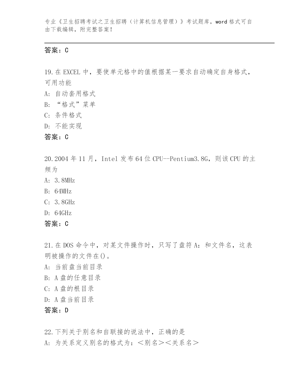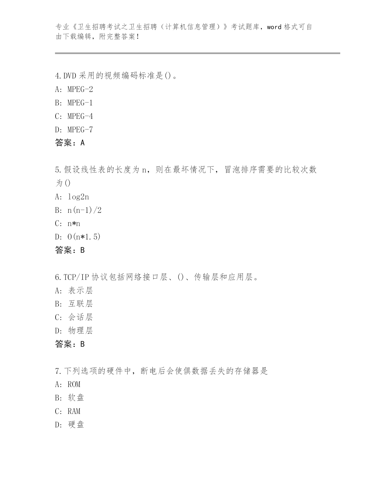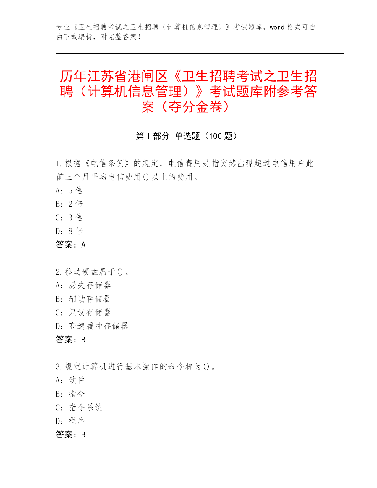 历年江苏省《卫生招聘考试之卫生招聘(计算机信息管理)》考试必刷200题题库大全及参考答案(夺分金卷)