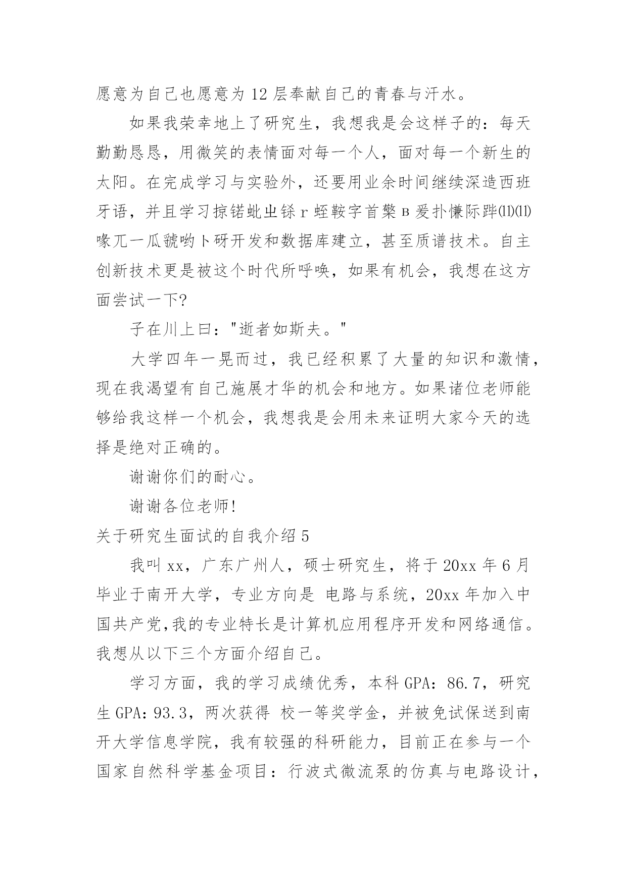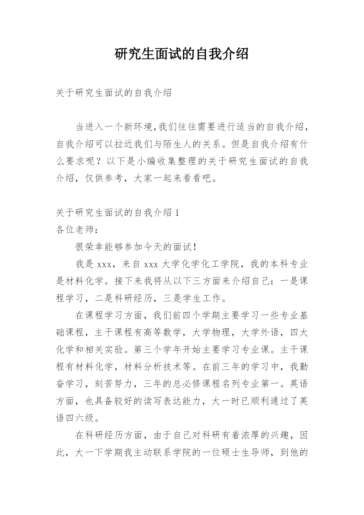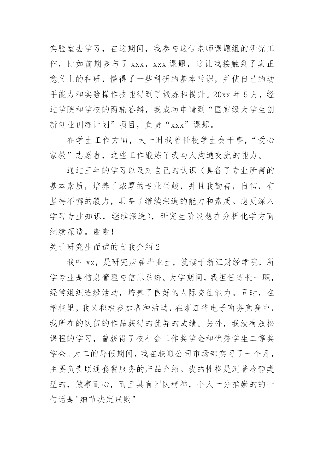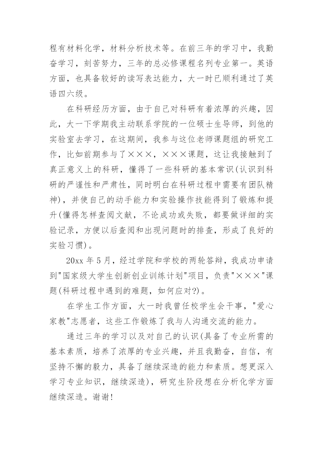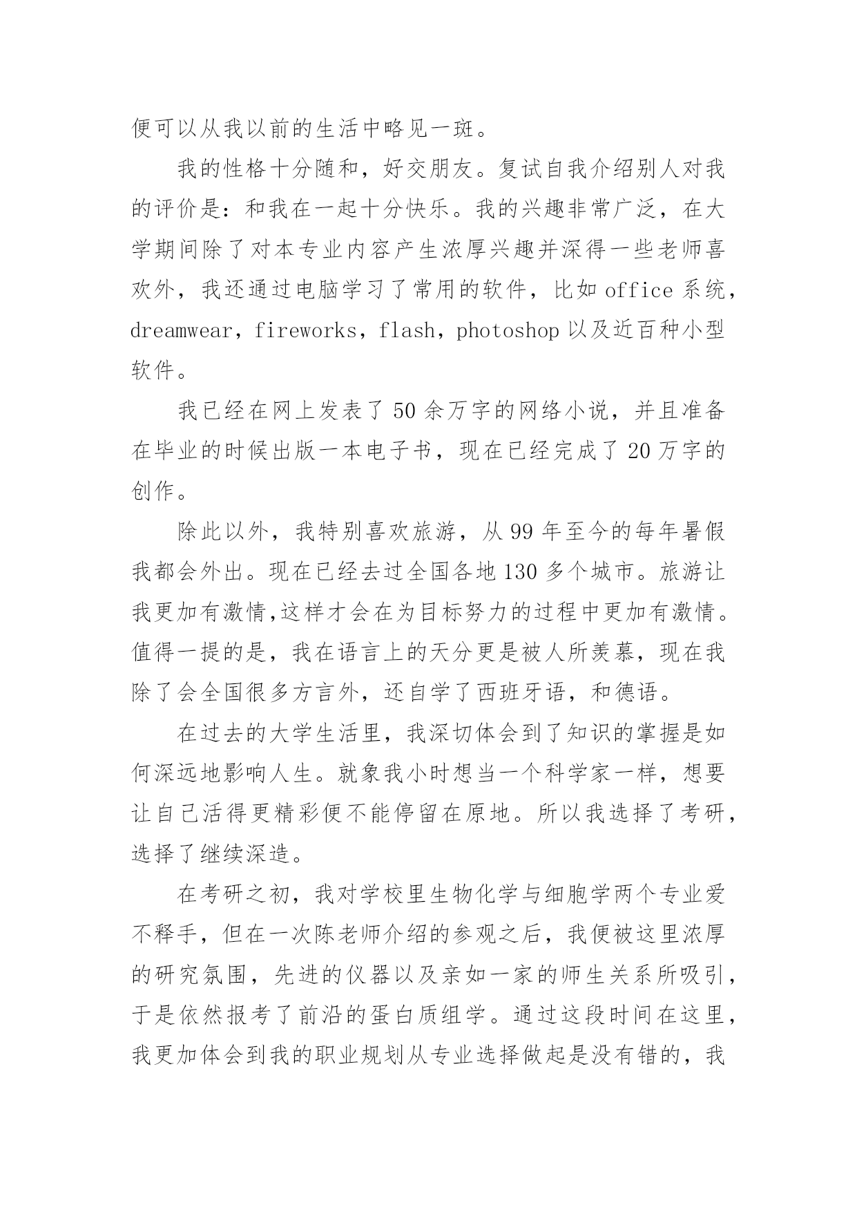 研究生面试的自我介绍关于研究生面试的自我介绍当进入一个新环境,我们往往需要进行适当的自我介绍,自我介绍可以拉近我们与陌生人的关系。但是自我介绍有什么要求呢?以下是小编收集整理的关于研究生面试的自我介绍,仅供参考,大家一起来看看吧。关于研究生面试的自我介绍1各位老师:很荣幸能够参加今天的面试!我是xxx,来自xxx大学化学化工学院,我的本科专业是材料化学。接下来我将从以下三方面来介绍自己:一是课程学习,二是科研经历,三是学生工作。在课程学习方面,我们前四个学期主要学习一些专业基础课程,主干课程有高等数学,大学物理,大学外语,四大化学和相关实验。第三个学年开始主要学习专业课。主干课程有材料化学,材料分析技术等。在前三年的学习中,我勤奋学习,刻苦努力,三年的总必修课程名列专业第一。英语方面,也具备较好的读写表达能力,大一时已顺利通过了英语四六级。在科研经历方面,由于自己对科研有着浓厚的兴趣,因此,大一下学期我主动联系学院的一位硕士生导师,到他的实验室去学习,在这期间,我参与这位老师课题组的研究工作,比如前期参与了xxx,xxx课题,这让我接触到了真正意义上的科研,懂得了一些科研的基本常识,并使自己的动手能力和实验操作技能得到了锻炼和提升。20xx年5月,经过学院和学校的两轮答辩,我成功申请到“国家级大学生创新创业训练计划”项目,负责“xxx”课题。在学生工作方面,大一时我曾任校学生会干事,“爱心家教”志愿者,这些工作锻炼了我与人沟通交流的能力。通过三年的学习以及对自己的认识(具备了专业所需的基本素质,培养了浓厚的专业兴趣,并且我勤奋,自信,有坚持不懈的毅力,具备了继续深造的能力和素质。想更深入学习专业知识,继续深造),研究生阶段想在分析化学方面继续深造。谢谢!关于研究生面试的自我介绍2我叫xx,是研究应届毕业生,就读于浙江财经学院,所学专业是信息管理与信息系统。大学期间,我担任班长一职,经常组织班级活动,培养了良好的人际交往能力。同时,在学校里,我又积极参加各种活动,在浙江省电子商务竞赛中,我所在的队伍的作品获得的优异的成绩。另外,我没有放松课程的学习,曾获得了校社会工作奖学金和优秀学生二等奖学金。大二的暑假期间,我在联通公司市场部实习了一个月,主要负责联通套餐服务的产品介绍。我的性格是沉着冷静类型的,做事耐心,而且具有团队精神,个人十分推崇的的一句话是"细节决定成败"感谢学校能给我这次争取进修研究生的机会,也非常荣幸能够在这里和各位老师面对面的交流。首先请允许我做个自我介绍,梁伟超,河北沙河人,本科阶段主修市场营销专业。除了具有比较强的逻辑思维和系统思维能力,过去的一年多时间,通过参加创业计划竞赛,对管理专业的知识掌握比较熟练。有信心能够胜任研究工作。之所以读研究生,主要基于以下三点原因,一是对管理学的浓厚兴趣,希望能够做一些更深入的研究;一是为实现咨询师的梦想,需要更深层次地自我发展。二是实践的需要,立志在三年研究中建立一套属于自己的全方位管理模式,用于指导中小企业(尤其是家族企业)的管理提升。关于研究生面试的自我介绍3早上好,我亲爱的老师。真的很荣幸有这个机会参加面试。首先,我将简要介绍一下自己。我的名字叫邱cc和我的英文名字是珍妮特。我是一个当地的人是23岁。济南,春天是山东省的省会城市。我认为我的家乡是一个美丽的城市。其次,我想谈谈我的学习经验。我的专业是你以前的专业,毕业于你学校的名字。我很感谢我的大学教育给了我。现在我有一个新计划,我将竭尽全力获得山东中医药大学的关键。我选择诊所作为我的专业。学校简介+你为什么选择这个专业此外,我想说一些关于我的家庭。你可以谈谈你家庭的情况。我有信心,因为我有这样的能力!我是善良,耐心、外向和创造性。我期待着我的研究生学习和生活。我总是相信,你将很容易落后,除非他继续学习。如果我能有机会在这里学习,我将专注于该领域的学习和研究。为了构建一个坚实的基础为我未来的工作中,我将关注理论知识。接下来,我想做一些实际工作与我的导师和同学的帮助。通过这个,我肯定会不能从教科书上获得的东西。此外,我将参加研究生考试的几个原因。首先,我热爱我的专业。我是一个努力工作的学生尤其是做我感兴趣的东西。我将尽我最大努力解决任何问题,无论多么困难。我着迷于大师的清爽和深刻的风格。其次,我喜欢在大学的感觉。它充满了朝气。我的学术氛围深深吸引。关于研究生面试的自我介绍4尊敬的各位老师们:早上好!我很荣幸今天能有这样面试的机会。下面我就开始用中文自我介绍了。我叫朱家得,今年22岁,是这所大学的应届毕业生,在今年考研的时候我报选了李铮老师的蛋白质组学。现在我在12层上完成本科毕业论文。我从小就特别喜欢生物,并立志当一个生物学家。现在家里还有两阳台的花草鱼虫,书柜中更是摆满了生物类书籍。我还曾经在奥林匹克生物竞赛上获