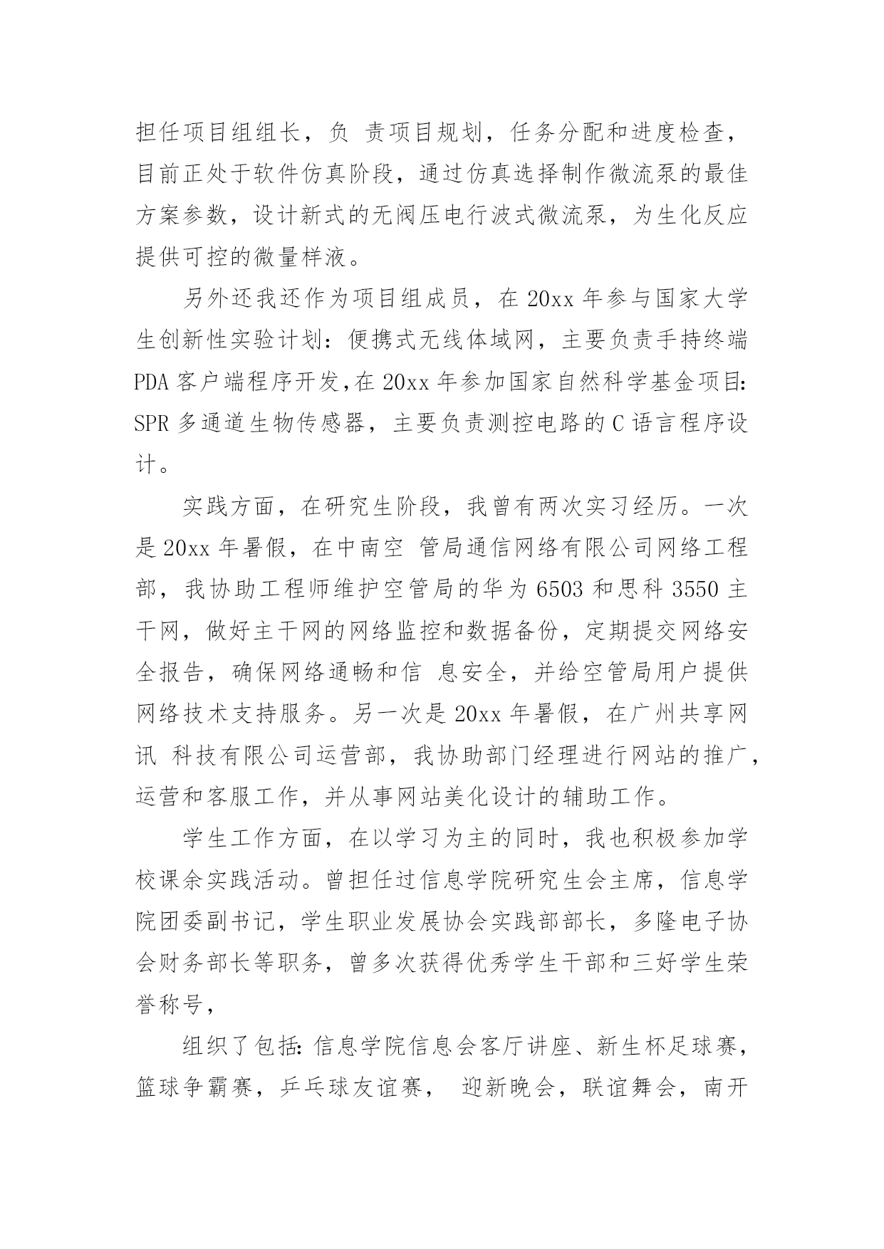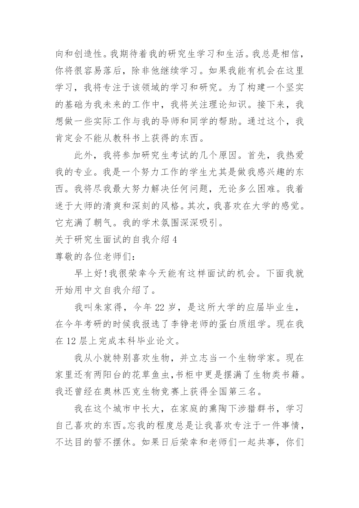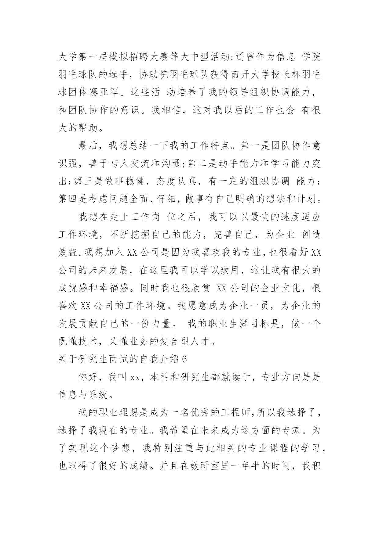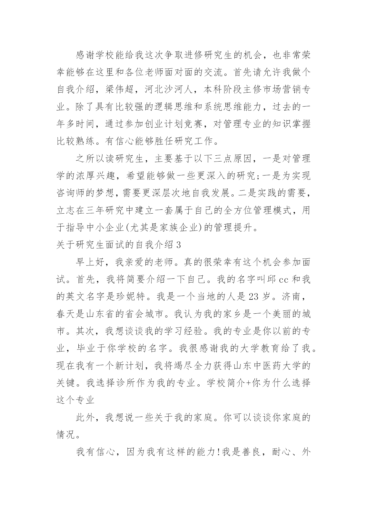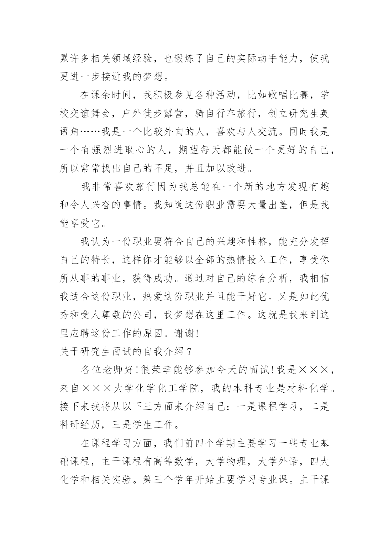 研究生面试的自我介绍关于研究生面试的自我介绍当进入一个新环境,我们往往需要进行适当的自我介绍,自我介绍可以拉近我们与陌生人的关系。但是自我介绍有什么要求呢?以下是小编收集整理的关于研究生面试的自我介绍,仅供参考,大家一起来看看吧。关于研究生面试的自我介绍1各位老师:很荣幸能够参加今天的面试!我是xxx,来自xxx大学化学化工学院,我的本科专业是材料化学。接下来我将从以下三方面来介绍自己:一是课程学习,二是科研经历,三是学生工作。在课程学习方面,我们前四个学期主要学习一些专业基础课程,主干课程有高等数学,大学物理,大学外语,四大化学和相关实验。第三个学年开始主要学习专业课。主干课程有材料化学,材料分析技术等。在前三年的学习中,我勤奋学习,刻苦努力,三年的总必修课程名列专业第一。英语方面,也具备较好的读写表达能力,大一时已顺利通过了英语四六级。在科研经历方面,由于自己对科研有着浓厚的兴趣,因此,大一下学期我主动联系学院的一位硕士生导师,到他的实验室去学习,在这期间,我参与这位老师课题组的研究工作,比如前期参与了xxx,xxx课题,这让我接触到了真正意义上的科研,懂得了一些科研的基本常识,并使自己的动手能力和实验操作技能得到了锻炼和提升。20xx年5月,经过学院和学校的两轮答辩,我成功申请到“国家级大学生创新创业训练计划”项目,负责“xxx”课题。在学生工作方面,大一时我曾任校学生会干事,“爱心家教”志愿者,这些工作锻炼了我与人沟通交流的能力。通过三年的学习以及对自己的认识(具备了专业所需的基本素质,培养了浓厚的专业兴趣,并且我勤奋,自信,有坚持不懈的毅力,具备了继续深造的能力和素质。想更深入学习专业知识,继续深造),研究生阶段想在分析化学方面继续深造。谢谢!关于研究生面试的自我介绍2我叫xx,是研究应届毕业生,就读于浙江财经学院,所学专业是信息管理与信息系统。大学期间,我担任班长一职,经常组织班级活动,培养了良好的人际交往能力。同时,在学校里,我又积极参加各种活动,在浙江省电子商务竞赛中,我所在的队伍的作品获得的优异的成绩。另外,我没有放松课程的学习,曾获得了校社会工作奖学金和优秀学生二等奖学金。大二的暑假期间,我在联通公司市场部实习了一个月,主要负责联通套餐服务的产品介绍。我的性格是沉着冷静类型的,做事耐心,而且具有团队精神,个人十分推崇的的一句话是"细节决定成败"感谢学校能给我这次争取进修研究生的机会,也非常荣幸能够在这里和各位老师面对面的交流。首先请允许我做个自我介绍,梁伟超,河北沙河人,本科阶段主修市场营销专业。除了具有比较强的逻辑思维和系统思维能力,过去的一年多时间,通过参加创业计划竞赛,对管理专业的知识掌握比较熟练。有信心能够胜任研究工作。之所以读研究生,主要基于以下三点原因,一是对管理学的浓厚兴趣,希望能够做一些更深入的研究;一是为实现咨询师的梦想,需要更深层次地自我发展。二是实践的需要,立志在三年研究中建立一套属于自己的全方位管理模式,用于指导中小企业(尤其是家族企业)的管理提升。关于研究生面试的自我介绍3早上好,我亲爱的老师。真的很荣幸有这个机会参加面试。首先,我将简要介绍一下自己。我的名字叫邱cc和我的英文名字是珍妮特。我是一个当地的人是23岁。济南,春天是山东省的省会城市。我认为我的家乡是一个美丽的城市。其次,我想谈谈我的学习经验。我的专业是你以前的专业,毕业于你学校的名字。我很感谢我的大学教育给了我。现在我有一个新计划,我将竭尽全力获得山东中医药大学的关键。我选择诊所作为我的专业。学校简介+你为什么选择这个专业此外,我想说一些关于我的家庭。你可以谈谈你家庭的情况。我有信心,因为我有这样的能力!我是善良,耐心、外向和创造性。我期待着我的研究生学习和生活。我总是相信,你将很容易落后,除非他继续学习。如果我能有机会在这里学习,我将专注于该领域的学习和研究。为了构建一个坚实的基础为我未来的工作中,我将关注理论知识。接下来,我想做一些实际工作与我的导师和同学的帮助。通过这个,我肯定会不能从教科书上获得的东西。此外,我将参加研究生考试的几个原因。首先,我热爱我的专业。我是一个努力工作的学生尤其是做我感兴趣的东西。我将尽我最大努力解决任何问题,无论多么困难。我着迷于大师的清爽和深刻的风格。其次,我喜欢在大学的感觉。它充满了朝气。我的学术氛围深深吸引。关于研究生面试的自我介绍4尊敬的各位老师们:早上好!我很荣幸今天能有这样面试的机会。下面我就开始用中文自我介绍了。我叫朱家得,今年22岁,是这所大学的应届毕业生,在今年考研的时候我报选了李铮老师的蛋白质组学。现在我在12层上完成本科毕业论文。我从小就特别喜欢生物,并立志当一个生物学家。现在家里还有两阳台的花草鱼虫,书柜中更是摆满了生物类书籍。我还曾经在奥林匹克生物竞赛上获