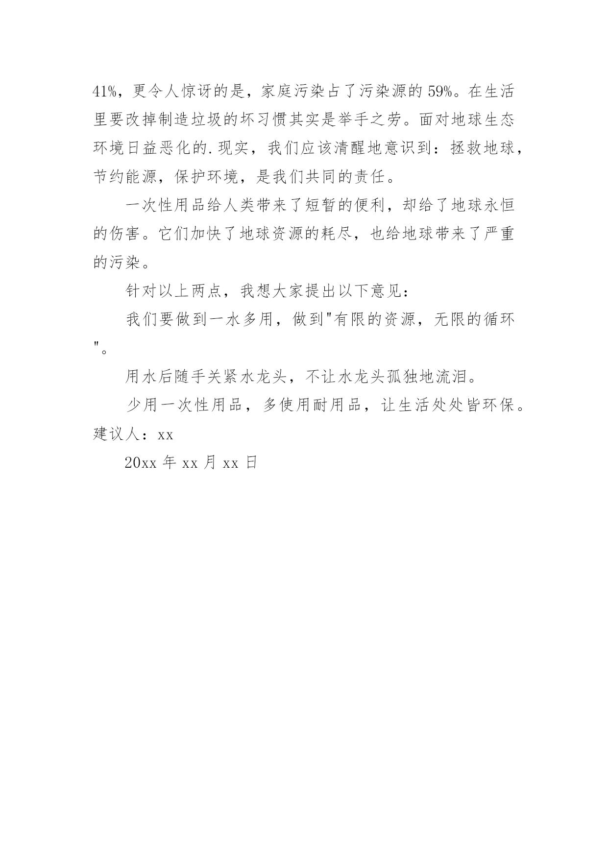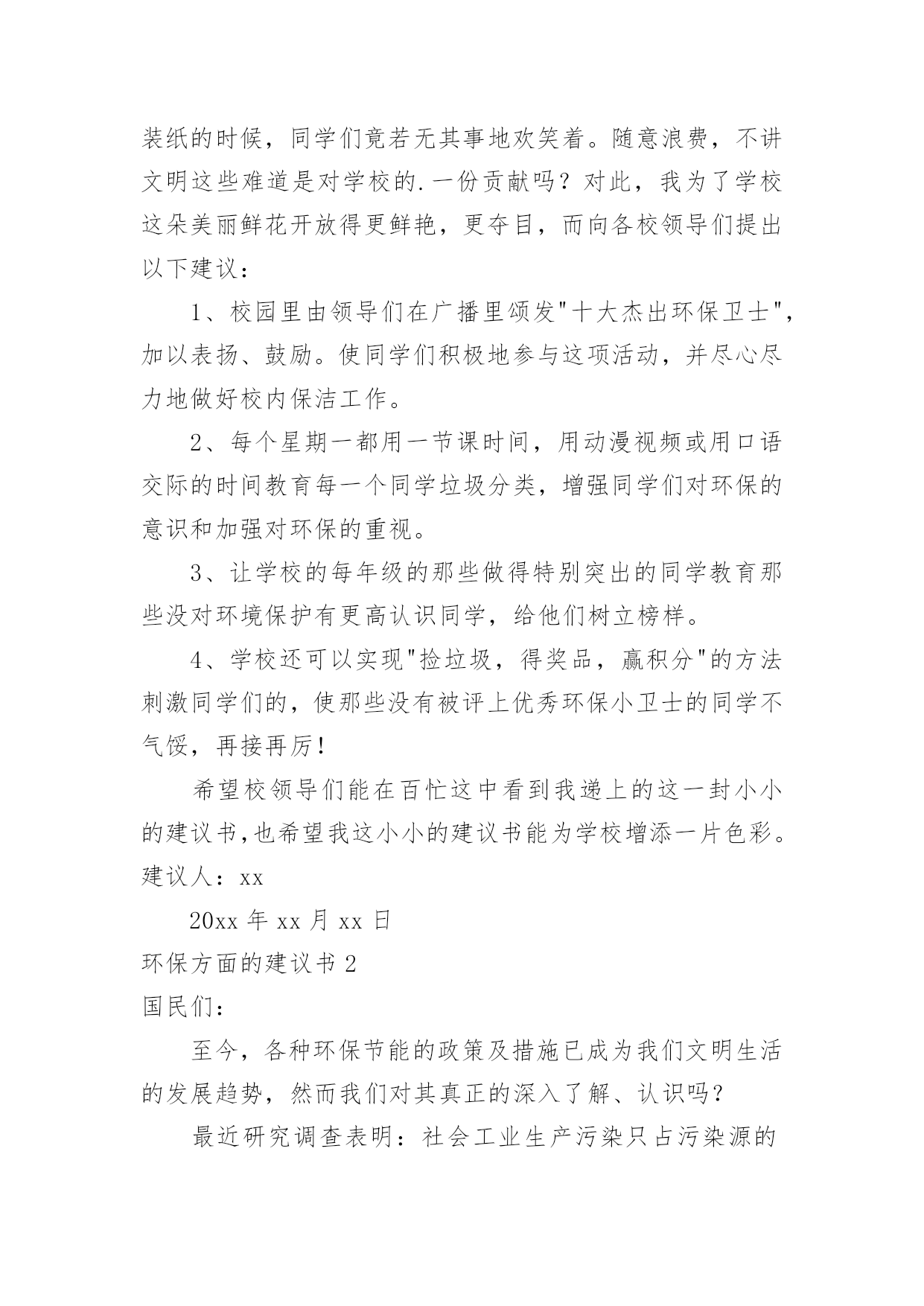 环保方面的建议书环保方面的建议书随着社会不断地进步,建议书与我们的生活息息相关,建议书的写作格式一般由标题、称呼、正文、署名、日期等几部分组成。你知道建议书怎样才能写的好吗?以下是小编帮大家整理的环保方面的建议书,希望能够帮助到大家。环保方面的建议书1尊敬的校领导:我在这个美丽的学校里已生活了六年已久了,只有短短的七十几天,眼看就要告别这所母校,告别那宽敞明亮的教室,告别那你追我赶的赛场,告别那百花齐放的后花园,告别那天真可爱的同学们。也许,就在这几十天后,一张张熟悉面孔,一句句亲切的问候,一朵朵美丽的鲜花,都会在我的记忆里逐渐褪色,一切美好的东西会被蒙上一缕薄薄的轻纱。虽然校园鸟语花香,但也有不中人意的地方:在校园的一些隐蔽的角落里,我们不难发出一些零零丁丁的纸屑。每当看到这些,我就情不自禁地想起一些同学用粉碎的纸作仙女散花的情景……除此之外,校园里还有许多浪费现象,有一些同学写错了字竟不用橡皮而是把整张纸撕下来,揉成一团扔掉了,当修理工人在厕所里捞到一些垃圾、红领巾、包装纸的时候,同学们竟若无其事地欢笑着。随意浪费,不讲文明这些难道是对学校的.一份贡献吗?对此,我为了学校这朵美丽鲜花开放得更鲜艳,更夺目,而向各校领导们提出以下建议:1、校园里由领导们在广播里颂发"十大杰出环保卫士",加以表扬、鼓励。使同学们积极地参与这项活动,并尽心尽力地做好校内保洁工作。2、每个星期一都用一节课时间,用动漫视频或用口语交际的时间教育每一个同学垃圾分类,增强同学们对环保的意识和加强对环保的重视。3、让学校的每年级的那些做得特别突出的同学教育那些没对环境保护有更高认识同学,给他们树立榜样。4、学校还可以实现"捡垃圾,得奖品,赢积分"的方法刺激同学们的,使那些没有被评上优秀环保小卫士的同学不气馁,再接再厉!希望校领导们能在百忙这中看到我递上的这一封小小的建议书,也希望我这小小的建议书能为学校增添一片色彩。建议人:xx20xx年xx月xx日环保方面的建议书2国民们:至今,各种环保节能的政策及措施已成为我们文明生活的发展趋势,然而我们对其真正的深入了解、认识吗?最近研究调查表明:社会工业生产污染只占污染源的41%,更令人惊讶的是,家庭污染占了污染源的59%。在生活里要改掉制造垃圾的坏习惯其实是举手之劳。面对地球生态环境日益恶化的.现实,我们应该清醒地意识到:拯救地球,节约能源,保护环境,是我们共同的责任。一次性用品给人类带来了短暂的便利,却给了地球永恒的伤害。它们加快了地球资源的耗尽,也给地球带来了严重的污染。针对以上两点,我想大家提出以下意见:我们要做到一水多用,做到"有限的资源,无限的循环"。用水后随手关紧水龙头,不让水龙头孤独地流泪。少用一次性用品,多使用耐用品,让生活处处皆环保。建议人:xx20xx年xx月xx日
