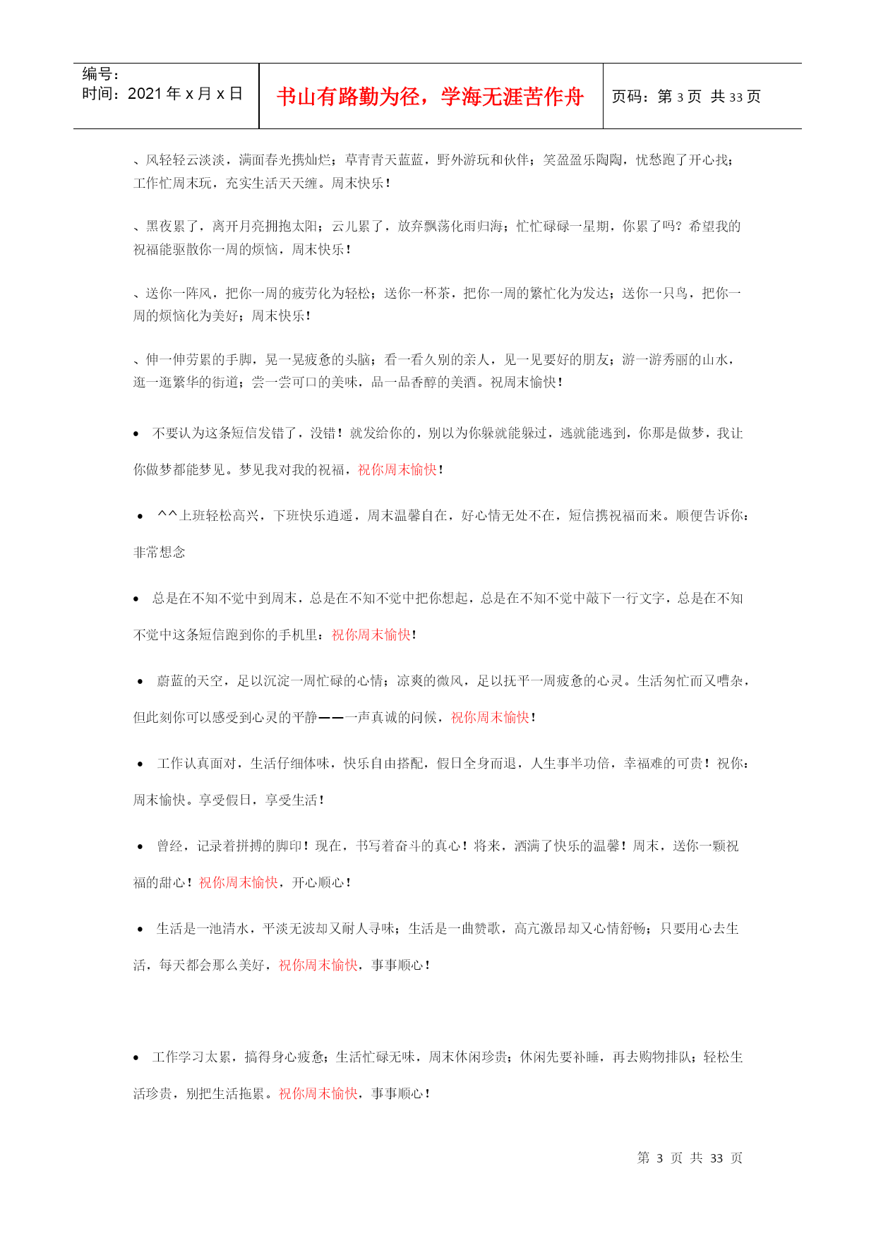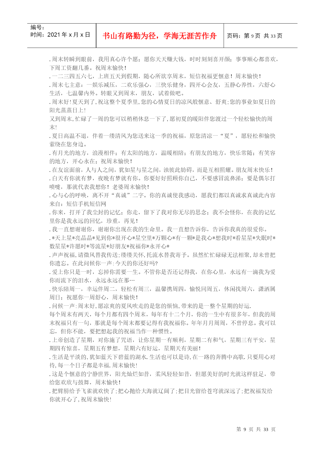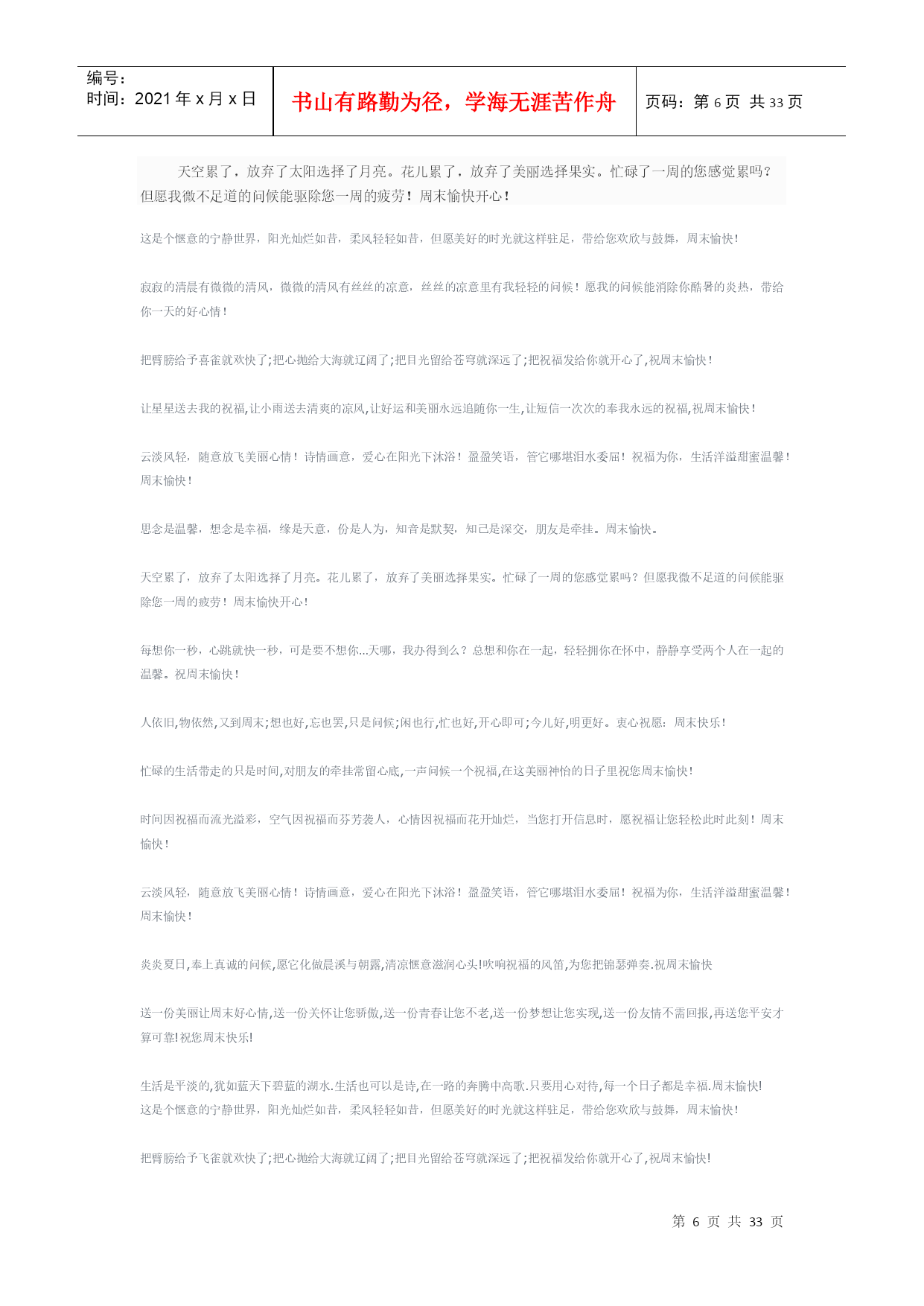 编号:时间:2021年x月x日书山有路勤为径,学海无涯苦作舟页码:第PAGE33页共NUMPAGES33页第PAGE\*MERGEFORMAT33页共NUMPAGES\*MERGEFORMAT33页周末祝福信息送一份美丽让周末好心情,送一份关怀让您骄傲,送一份青春让您不老,送一份梦想让您实现,送一份友情不需回报,再送您平安才算可靠!祝您周末快乐!让星星送去我的祝福,让小雨送去清爽的凉风,让好运和美丽永远追随你一生,让短信一次次的奉我永远的祝福,祝周末愉快!这是个惬意的宁静世界,阳光灿烂如昔,柔风轻轻如昔,但愿美好的时光就这样驻足,带给您欢欣与鼓舞,周末愉快!寂寂的清晨有微微的清风,微微的清风有丝丝的凉意,丝丝的凉意里有我轻轻的问候!愿我的问候能消除你酷暑的炎热,带给你一天的好心情!别因太多的忙碌冷淡温柔莫因无奈的追求湮没享受挣钱不是人生的全部无限风光就在心灵深处停停你匆匆的脚步尽情享受生活的赐福!周末了,别忘了——好好歇歇!炎炎夏日,奉上真诚的问候,愿它化做晨溪与朝露,清凉惬意滋润心头!吹响祝福的风笛,为您把锦瑟弹奏.祝周末愉快天空累了,放弃了太阳选择了月亮。花儿累了,放弃了美丽选择果实。忙碌了一周的您感觉累吗?但愿我微不足道的问候能驱除您一周的疲劳!周末愉快开心!生活是平淡的,犹如蓝天下碧蓝的湖水.生活也可以是诗,在一路的奔腾中高歌.只要用心对待,每一个日子都是幸福.周末愉快!时间因祝福而流光溢彩,空气因祝福而芬芳袭人,心情因祝福而花开灿烂,当您打开信息时,愿祝福让您轻松此时此刻!周末愉快!云淡风轻,随意放飞美丽心情!诗情画意,爱心在阳光下沐浴!盈盈笑语,管它哪堪泪水委屈!祝福为你,生活洋溢甜蜜温馨!周末愉快!别因太多的忙碌冷淡了温柔,别因太多的追求湮没了享受,工作不是人生的全部,停停匆匆的脚步,请享受生活的赐福!周末愉快!喜欢一种声音,是微风吹落露珠;欣赏一幅图画,是朗月点缀星空;陶醉一种气息,是幽兰弥漫旷谷;祝您周末愉快!人依旧,物依然,又到周末;想也好,忘也罢,只是问候;闲也行,忙也好,开心即可;今儿好,明更好衷心祝愿:周末快乐!最近天气多变,请注意您的身体健康,愿初夏的暖阳伴您渡过一个轻松愉快的周末.晨曦出现的第一缕阳光是我对你深深的祝福,夕阳收起的最后一抹嫣红是我对你的衷心问候,在这春暖花开的季节,送上我最真挚的祝福:周末愉快!把臂膀给予飞雀就欢快了;把心抛给大海就辽阔了;把目光留给苍穹就深远了;把祝福发给你就开心了,祝周末愉快!也许祝福只是一种形式,但却能给心灵带来温馨,我们都把关心发给彼此,一样的日子一样的心声:周末愉快!祝你在五一假期的每一天,充满温馨……充满安详……充满喜悦……工作是船,业绩是帆,家是港湾,节日是岸,洗去征尘,绽开笑脸,迎接开心每一天!祝你:五一节快乐!:)、望一望明月,感受思念。抱一抱山峦,亲近自然。泡一泡温泉,放松休闲。周末到了,卸下你的疲惫和压力,和家人散散步、郊郊游、聊聊天,幸福离你并不远!、蔚蓝的天空,足以沉淀一周忙碌的心情;凉爽的微风,足以抚平一周疲惫的心灵。生活匆忙而又嘈杂,但此刻你可以感受到心灵的平静——一声真诚的问候,祝你周末愉快!、风轻轻云淡淡,满面春光携灿烂;草青青天蓝蓝,野外游玩和伙伴;笑盈盈乐陶陶,忧愁跑了开心找;工作忙周末玩,充实生活天天缠。周末快乐!、黑夜累了,离开月亮拥抱太阳;云儿累了,放弃飘荡化雨归海;忙忙碌碌一星期,你累了吗?希望我的祝福能驱散你一周的烦恼,周末快乐!、送你一阵风,把你一周的疲劳化为轻松;送你一杯茶,把你一周的繁忙化为发达;送你一只鸟,把你一周的烦恼化为美好;周末快乐!、伸一伸劳累的手脚,晃一晃疲惫的头脑;看一看久别的亲人,见一见要好的朋友;游一游秀丽的山水,逛一逛繁华的街道;尝一尝可口的美味,品一品香醇的美酒。祝周末愉快!不要认为这条短信发错了,没错!就发给你的,别以为你躲就能躲过,逃就能逃到,你那是做梦,我让你做梦都能梦见。梦见我对我的祝福,祝你周末愉快!^^上班轻松高兴,下班快乐逍遥,周末温馨自在,好心情无处不在,短信携祝福而来。顺便告诉你:非常想念总是在不知不觉中到周末,总是在不知不觉中把你想起,总是在不知不觉中敲下一行文字,总是在不知不觉中这条短信跑到你的手机里:祝你周末愉快!蔚蓝的天空,足以沉淀一周忙碌的心情;凉爽的微风,足以抚平一周疲惫的心灵。生活匆忙而又嘈杂,但此刻你可以感受到心灵的平静——一声真诚的问候,祝你周末愉快!工作认真面对,生活仔细体味,快乐自由搭配,假日全身而退,人生事半功倍,幸福难的可贵!祝你:周末愉快。享受假日,享受生活!曾经,记录着拼搏的脚印!现在,书写着奋斗的真心!将来,洒满了快乐的温馨!周末,送你