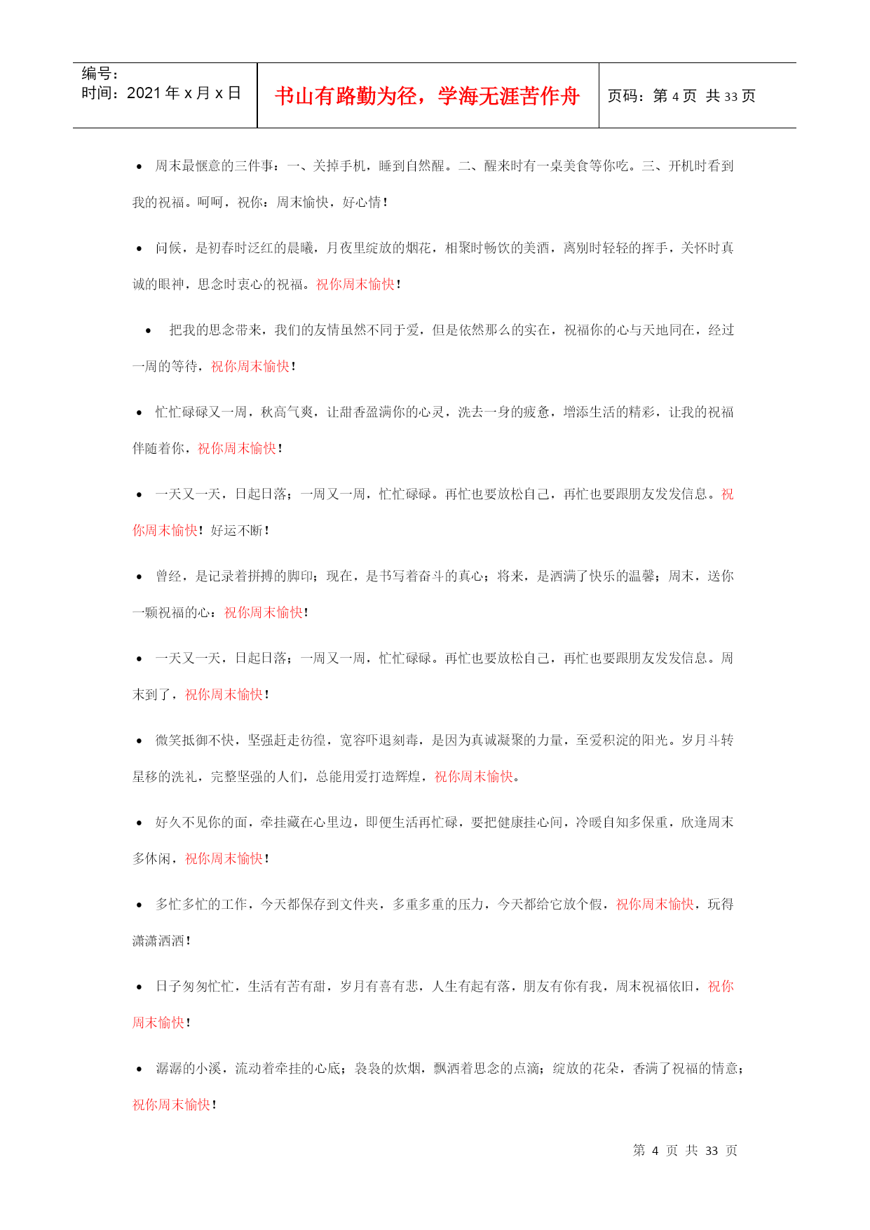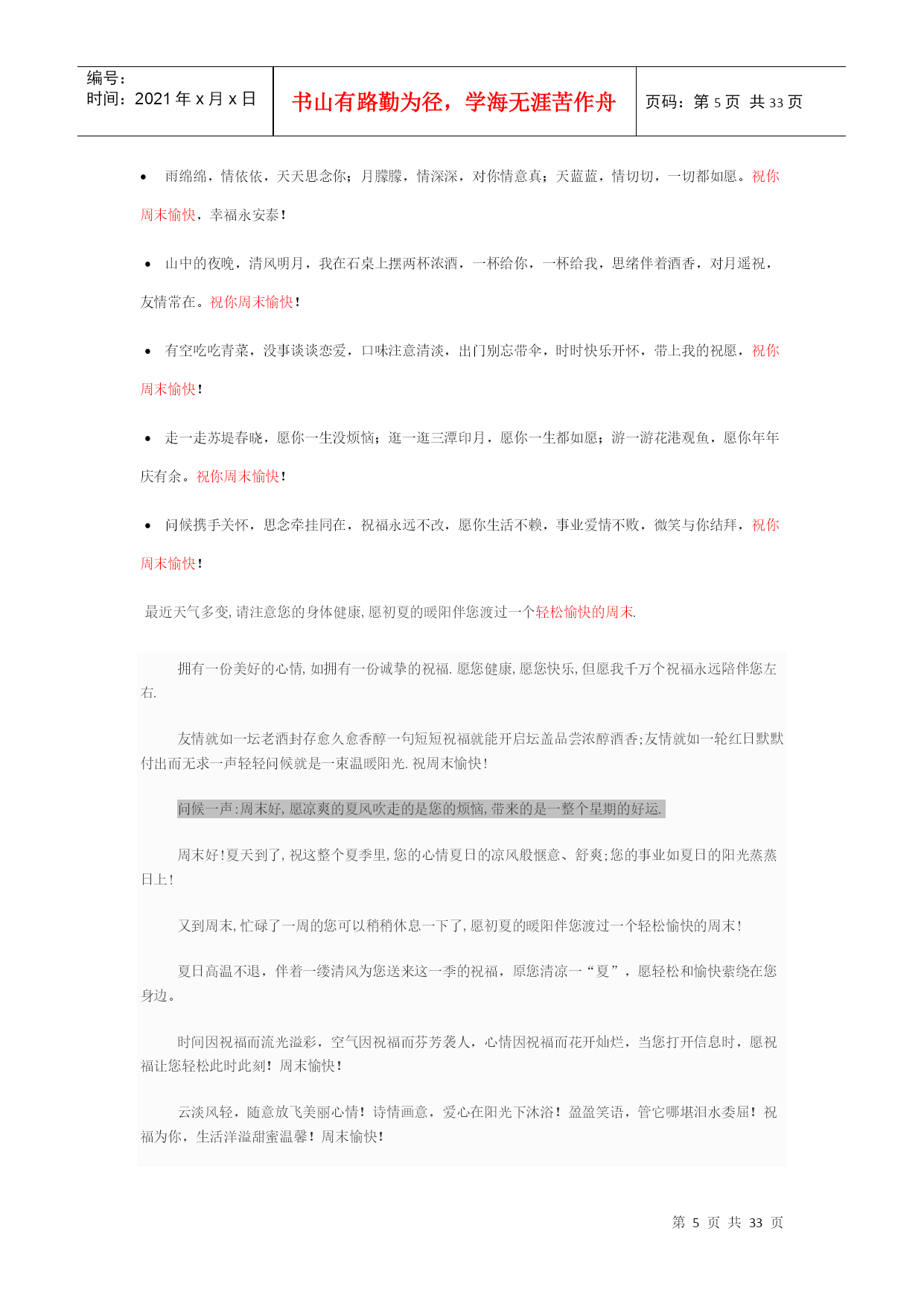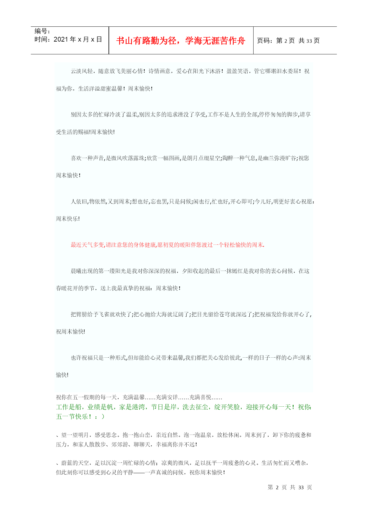 编号:时间:2021年x月x日书山有路勤为径,学海无涯苦作舟页码:第PAGE33页共NUMPAGES33页第PAGE\*MERGEFORMAT33页共NUMPAGES\*MERGEFORMAT33页周末祝福信息送一份美丽让周末好心情,送一份关怀让您骄傲,送一份青春让您不老,送一份梦想让您实现,送一份友情不需回报,再送您平安才算可靠!祝您周末快乐!让星星送去我的祝福,让小雨送去清爽的凉风,让好运和美丽永远追随你一生,让短信一次次的奉我永远的祝福,祝周末愉快!这是个惬意的宁静世界,阳光灿烂如昔,柔风轻轻如昔,但愿美好的时光就这样驻足,带给您欢欣与鼓舞,周末愉快!寂寂的清晨有微微的清风,微微的清风有丝丝的凉意,丝丝的凉意里有我轻轻的问候!愿我的问候能消除你酷暑的炎热,带给你一天的好心情!别因太多的忙碌冷淡温柔莫因无奈的追求湮没享受挣钱不是人生的全部无限风光就在心灵深处停停你匆匆的脚步尽情享受生活的赐福!周末了,别忘了——好好歇歇!炎炎夏日,奉上真诚的问候,愿它化做晨溪与朝露,清凉惬意滋润心头!吹响祝福的风笛,为您把锦瑟弹奏.祝周末愉快天空累了,放弃了太阳选择了月亮。花儿累了,放弃了美丽选择果实。忙碌了一周的您感觉累吗?但愿我微不足道的问候能驱除您一周的疲劳!周末愉快开心!生活是平淡的,犹如蓝天下碧蓝的湖水.生活也可以是诗,在一路的奔腾中高歌.只要用心对待,每一个日子都是幸福.周末愉快!时间因祝福而流光溢彩,空气因祝福而芬芳袭人,心情因祝福而花开灿烂,当您打开信息时,愿祝福让您轻松此时此刻!周末愉快!云淡风轻,随意放飞美丽心情!诗情画意,爱心在阳光下沐浴!盈盈笑语,管它哪堪泪水委屈!祝福为你,生活洋溢甜蜜温馨!周末愉快!别因太多的忙碌冷淡了温柔,别因太多的追求湮没了享受,工作不是人生的全部,停停匆匆的脚步,请享受生活的赐福!周末愉快!喜欢一种声音,是微风吹落露珠;欣赏一幅图画,是朗月点缀星空;陶醉一种气息,是幽兰弥漫旷谷;祝您周末愉快!人依旧,物依然,又到周末;想也好,忘也罢,只是问候;闲也行,忙也好,开心即可;今儿好,明更好衷心祝愿:周末快乐!最近天气多变,请注意您的身体健康,愿初夏的暖阳伴您渡过一个轻松愉快的周末.晨曦出现的第一缕阳光是我对你深深的祝福,夕阳收起的最后一抹嫣红是我对你的衷心问候,在这春暖花开的季节,送上我最真挚的祝福:周末愉快!把臂膀给予飞雀就欢快了;把心抛给大海就辽阔了;把目光留给苍穹就深远了;把祝福发给你就开心了,祝周末愉快!也许祝福只是一种形式,但却能给心灵带来温馨,我们都把关心发给彼此,一样的日子一样的心声:周末愉快!祝你在五一假期的每一天,充满温馨……充满安详……充满喜悦……工作是船,业绩是帆,家是港湾,节日是岸,洗去征尘,绽开笑脸,迎接开心每一天!祝你:五一节快乐!:)、望一望明月,感受思念。抱一抱山峦,亲近自然。泡一泡温泉,放松休闲。周末到了,卸下你的疲惫和压力,和家人散散步、郊郊游、聊聊天,幸福离你并不远!、蔚蓝的天空,足以沉淀一周忙碌的心情;凉爽的微风,足以抚平一周疲惫的心灵。生活匆忙而又嘈杂,但此刻你可以感受到心灵的平静——一声真诚的问候,祝你周末愉快!、风轻轻云淡淡,满面春光携灿烂;草青青天蓝蓝,野外游玩和伙伴;笑盈盈乐陶陶,忧愁跑了开心找;工作忙周末玩,充实生活天天缠。周末快乐!、黑夜累了,离开月亮拥抱太阳;云儿累了,放弃飘荡化雨归海;忙忙碌碌一星期,你累了吗?希望我的祝福能驱散你一周的烦恼,周末快乐!、送你一阵风,把你一周的疲劳化为轻松;送你一杯茶,把你一周的繁忙化为发达;送你一只鸟,把你一周的烦恼化为美好;周末快乐!、伸一伸劳累的手脚,晃一晃疲惫的头脑;看一看久别的亲人,见一见要好的朋友;游一游秀丽的山水,逛一逛繁华的街道;尝一尝可口的美味,品一品香醇的美酒。祝周末愉快!不要认为这条短信发错了,没错!就发给你的,别以为你躲就能躲过,逃就能逃到,你那是做梦,我让你做梦都能梦见。梦见我对我的祝福,祝你周末愉快!^^上班轻松高兴,下班快乐逍遥,周末温馨自在,好心情无处不在,短信携祝福而来。顺便告诉你:非常想念总是在不知不觉中到周末,总是在不知不觉中把你想起,总是在不知不觉中敲下一行文字,总是在不知不觉中这条短信跑到你的手机里:祝你周末愉快!蔚蓝的天空,足以沉淀一周忙碌的心情;凉爽的微风,足以抚平一周疲惫的心灵。生活匆忙而又嘈杂,但此刻你可以感受到心灵的平静——一声真诚的问候,祝你周末愉快!工作认真面对,生活仔细体味,快乐自由搭配,假日全身而退,人生事半功倍,幸福难的可贵!祝你:周末愉快。享受假日,享受生活!曾经,记录着拼搏的脚印!现在,书写着奋斗的真心!将来,洒满了快乐的温馨!周末,送你