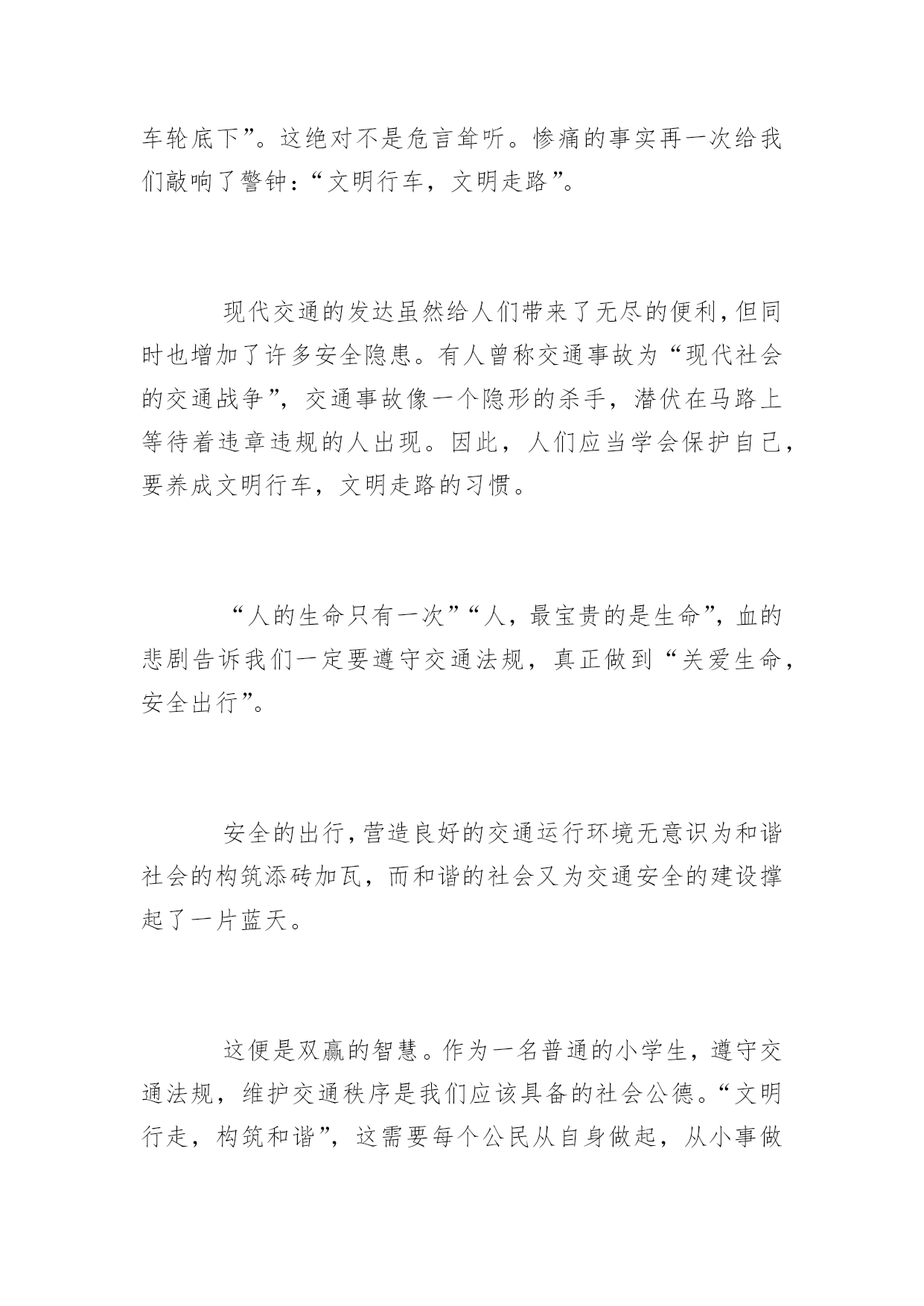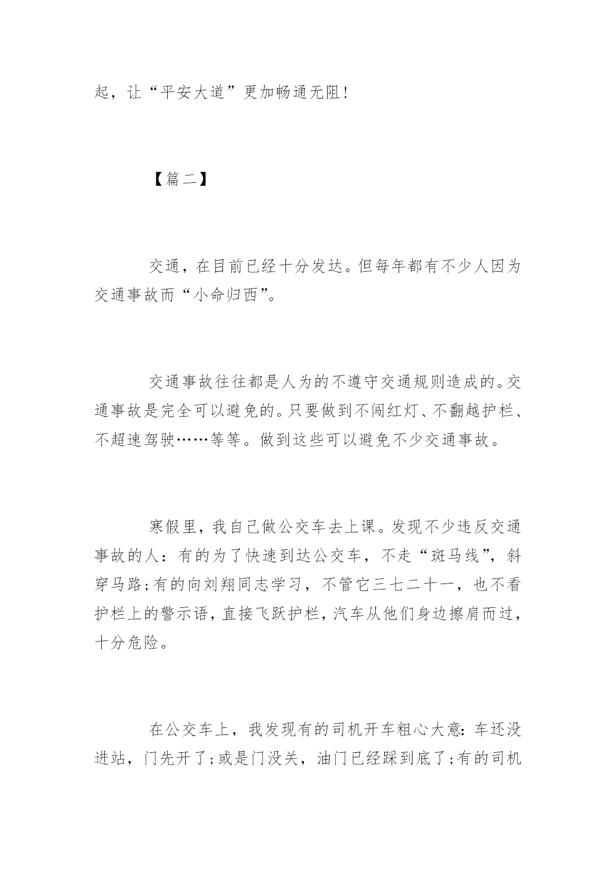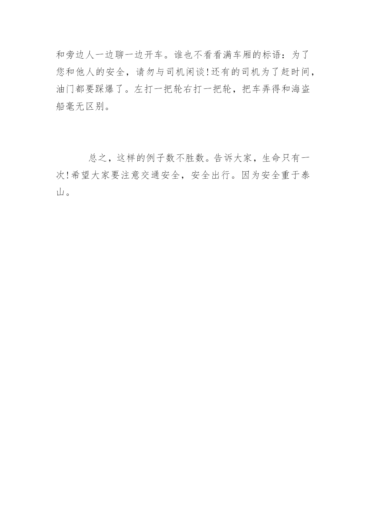 中学生交通安全征文中学生交通安全征文600字精选【篇一】出行安全,不仅关系到自己的生命和安全,同时也是尊重他人生命的体现,是构筑和谐社会的重要因素。透过川流不息行驶的车辆,“关爱生命,安全出行”八个字在我的脑海里显得更加突出。提到出行安全,很难不让人想到交通安全。在日常生活中,交通安全总是围绕在我们身边。只要你一出行,便同交通安全打上了交道。行走时的一次走神,过马路时的一次侥幸,开车时的一次违章,仅仅是一次小小的疏忽,这一切都会使一个生命转瞬即逝。飞旋的车轮会无情地吞噬掉行人的生命。曾经看过一则报道:“全国每六分钟就会有一人死于车轮底下”。这绝对不是危言耸听。惨痛的事实再一次给我们敲响了警钟:“文明行车,文明走路”。现代交通的发达虽然给人们带来了无尽的便利,但同时也增加了许多安全隐患。有人曾称交通事故为“现代社会的交通战争”,交通事故像一个隐形的杀手,潜伏在马路上等待着违章违规的人出现。因此,人们应当学会保护自己,要养成文明行车,文明走路的习惯。“人的生命只有一次”“人,最宝贵的是生命”,血的悲剧告诉我们一定要遵守交通法规,真正做到“关爱生命,安全出行”。安全的出行,营造良好的交通运行环境无意识为和谐社会的构筑添砖加瓦,而和谐的社会又为交通安全的建设撑起了一片蓝天。这便是双赢的智慧。作为一名普通的小学生,遵守交通法规,维护交通秩序是我们应该具备的社会公德。“文明行走,构筑和谐”,这需要每个公民从自身做起,从小事做起,让“平安大道”更加畅通无阻!【篇二】交通,在目前已经十分发达。但每年都有不少人因为交通事故而“小命归西”。交通事故往往都是人为的不遵守交通规则造成的。交通事故是完全可以避免的。只要做到不闯红灯、不翻越护栏、不超速驾驶……等等。做到这些可以避免不少交通事故。寒假里,我自己做公交车去上课。发现不少违反交通事故的人:有的为了快速到达公交车,不走“斑马线”,斜穿马路;有的向刘翔同志学习,不管它三七二十一,也不看护栏上的警示语,直接飞跃护栏,汽车从他们身边擦肩而过,十分危险。在公交车上,我发现有的司机开车粗心大意:车还没进站,门先开了;或是门没关,油门已经踩到底了;有的司机和旁边人一边聊一边开车。谁也不看看满车厢的标语:为了您和他人的安全,请勿与司机闲谈!还有的司机为了赶时间,油门都要踩爆了。左打一把轮右打一把轮,把车弄得和海盗船毫无区别。总之,这样的例子数不胜数。告诉大家,生命只有一次!希望大家要注意交通安全,安全出行。因为安全重于泰山。