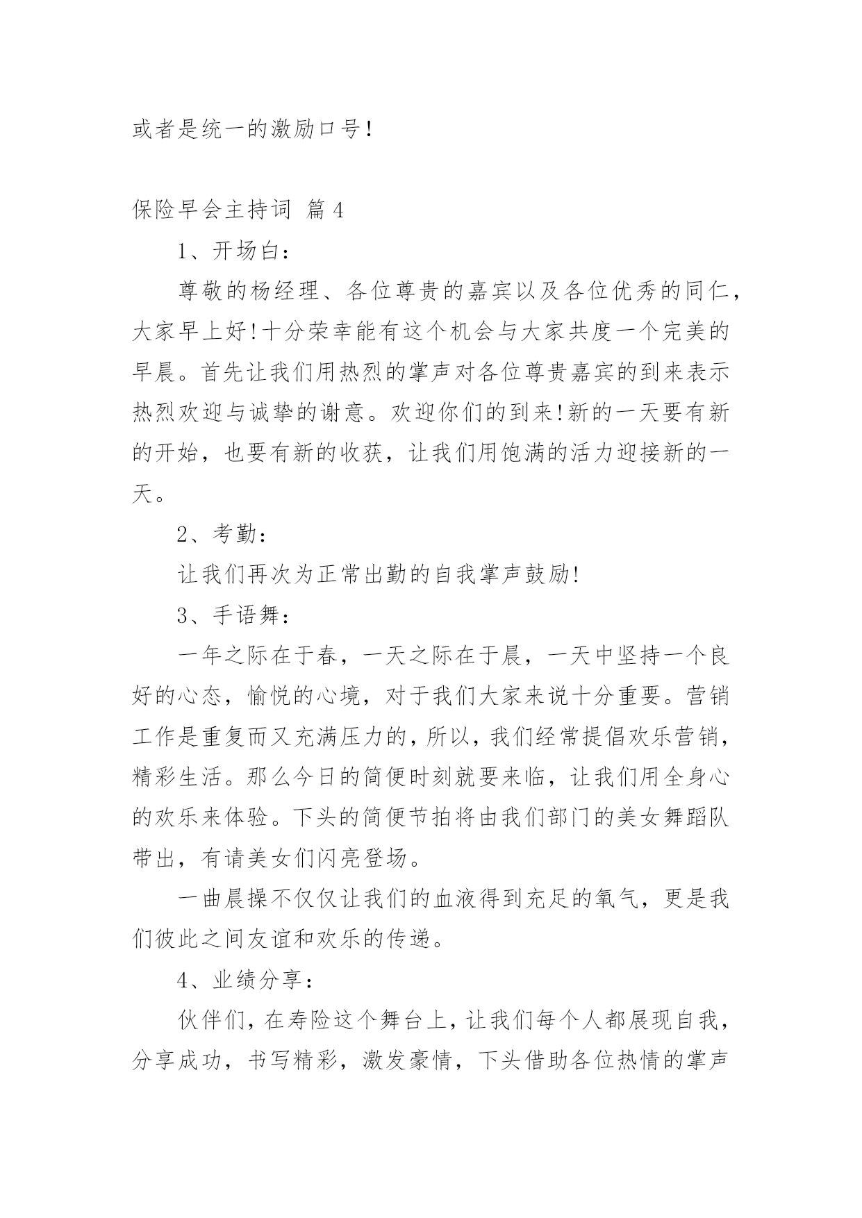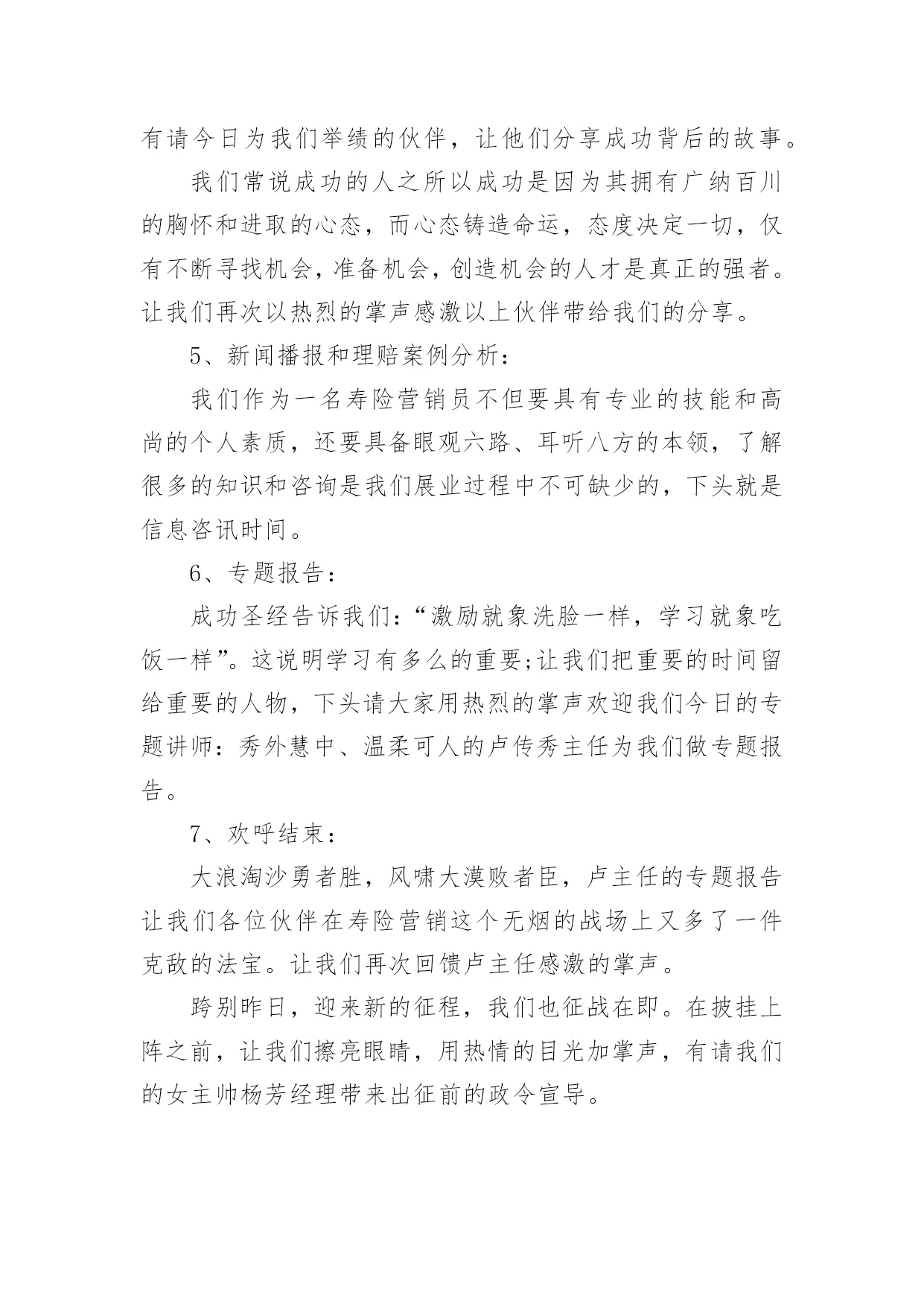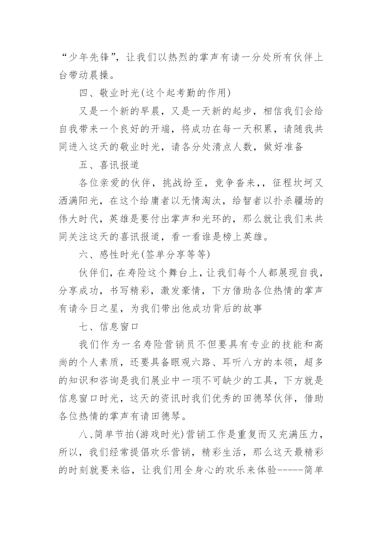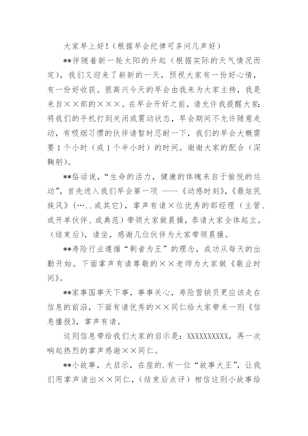 保险早会主持词主持词是主持人在台上表演的灵魂之所在。时代不断在进步,主持词与我们不再陌生,那么你会写主持词吗?下面是小编为大家整理的保险早会主持词4篇,仅供参考,大家一起来看看吧。保险早会主持词篇1一、暖场音乐(眉飞色舞)二、纪律宣导请各位伙伴找到位置,迅速坐好!我们的大晨会马上就要开始了,为了保证会议的质量,请大家把手机关闭或调至震动档,谢谢各位的合作。三、晨操各位优秀的伙伴大家早上好!伙伴们,磅礴坦荡的寿险气势,我们的伙伴无坚不摧,勇往直前,欣欣向荣的营销事业,成功地彼岸郁郁葱葱,繁荣昌盛,那首先让我们带着寿险人应有的无坚不摧、勇往直前的精神带出我们的今日晨操";少年先锋";,让我们以热烈的掌声有请一分处所有伙伴上台带动晨操。四、敬业时间又是一个新的早晨,又是一天新的起步,相信我们会给自己带来一个良好的开端,成功在每一天积累,请随我共同进入今天的敬业时间,请各分处清点人数,做好准备五、喜讯报道各位亲爱的伙伴,挑战纷至,竞争沓来,,征程坎坷又洒满阳光,在这个给庸者以无情淘汰,给智者以扑杀疆场的伟大时代,英雄是要付出掌声和光环的,那么就让我们来共同关注今天的喜讯报道,看一看谁是榜上英雄。六、感性时间伙伴们,在寿险这个舞台上,让我们每个人都展现自我,分享成功,书写精彩,激发豪情,下面借助各位热情的掌声有请今日之星,为我们带出他成功背后的故事七、信息窗口我们作为一名寿险营销员不但要具有专业的技能和高尚的个人素质,还要具备眼观六路、耳听八方的本领,大量的知识和咨是我们展业中一项不可缺少的工具,下面就是信息窗口时间,今天的资讯时我们优秀的田德琴伙伴,借助各位热情的掌声有请田德琴。八、轻松节拍营销工作是重复而又充满压力,所以,我们经常提倡快乐营销,精彩生活,那么今天最精彩的时刻就要来临,让我们用全身心的快乐来体验-----轻松节拍,今天的轻松节拍将由我们团队中最年轻的最具活力的张玲伙伴带出,借助各位热情的掌声有请张玲伙伴。九、专题论坛我们常说成功的人之所以成功是因为其纳百川的胸怀,因为凡是人拥有的是积极的心态,而心态铸造命运,态度决定一切,只有不断寻找机会,准备机会,创造机会的人才是真正的强者,下面就是我们的专题论坛时间。十、业务推动大浪淘沙勇者胜,风啸大漠败者臣,在座的每位伙伴经历了无数次的竞争和挑战,下面就要有请陈主任,为我们带出业务推动环节,掌声有请。十一、政令宣达太阳正在升起,战火硝烟四起,各位诸侯演绎纷争,我们的征战在即,让我们整理好军备,披挂上阵,下面掌声有请李经理为我们带出政令宣达。十二、群体激励跨别昨日,迎来新的征程,未来,奋战新的荣誉,让我们摒弃那拖沓的往昔,共同迎来新的一天,让我们扬帆起锚,主宰自我,用最富激情的呐喊响彻晴天,下面,请全体起立,共同宣读今天的激励口号:不达目标誓不罢休保险早会主持词篇2一、暖场音乐(也能够说是进场音乐)二、纪律宣导请各位伙伴找到位置,迅速坐好!我们的大晨会立刻就要开始了,为了保证会议的质量,请大家把手机关掉或调至震动档,多谢各位的合作。三、晨操(晨操之前必须要问好)各位优秀的伙伴大家早上好!伙伴们,磅礴坦荡的寿险气势,我们的伙伴无坚不摧,勇往直前,欣欣向荣的营销事业,成功地彼岸郁郁葱葱,繁荣昌盛,那首先让我们带着寿险人应有的无坚不摧、勇往直前的精神带出我们的今日晨操“少年先锋”,让我们以热烈的掌声有请一分处所有伙伴上台带动晨操。四、敬业时光(这个起考勤的作用)又是一个新的早晨,又是一天新的起步,相信我们会给自我带来一个良好的开端,将成功在每一天积累,请随我共同进入这天的敬业时光,请各分处清点人数,做好准备五、喜讯报道各位亲爱的伙伴,挑战纷至,竞争沓来,,征程坎坷又洒满阳光,在这个给庸者以无情淘汰,给智者以扑杀疆场的伟大时代,英雄是要付出掌声和光环的,那么就让我们来共同关注这天的喜讯报道,看一看谁是榜上英雄。六、感性时光(签单分享等等)伙伴们,在寿险这个舞台上,让我们每个人都展现自我,分享成功,书写精彩,激发豪情,下方借助各位热情的掌声有请今日之星,为我们带出他成功背后的故事七、信息窗口我们作为一名寿险营销员不但要具有专业的技能和高尚的个人素质,还要具备眼观六路、耳听八方的本领,超多的知识和咨询是我们展业中一项不可缺少的工具,下方就是信息窗口时光,这天的资讯时我们优秀的田德琴伙伴,借助各位热情的掌声有请田德琴。八、简单节拍(游戏时光)营销工作是重复而又充满压力,所以,我们经常提倡欢乐营销,精彩生活,那么这天最精彩的时刻就要来临,让我们用全身心的欢乐来体验-----简单节拍,这天的简单节拍将由我们团队中最年轻的最具活力的张玲伙伴带出,借助各位热情的掌声有请张玲伙伴。九、专题论坛我们常说成功的人之所以成功是因为其纳百川的胸怀,因为凡是人拥有的是用心的心态,而心态铸造命运,态度决定一切,仅