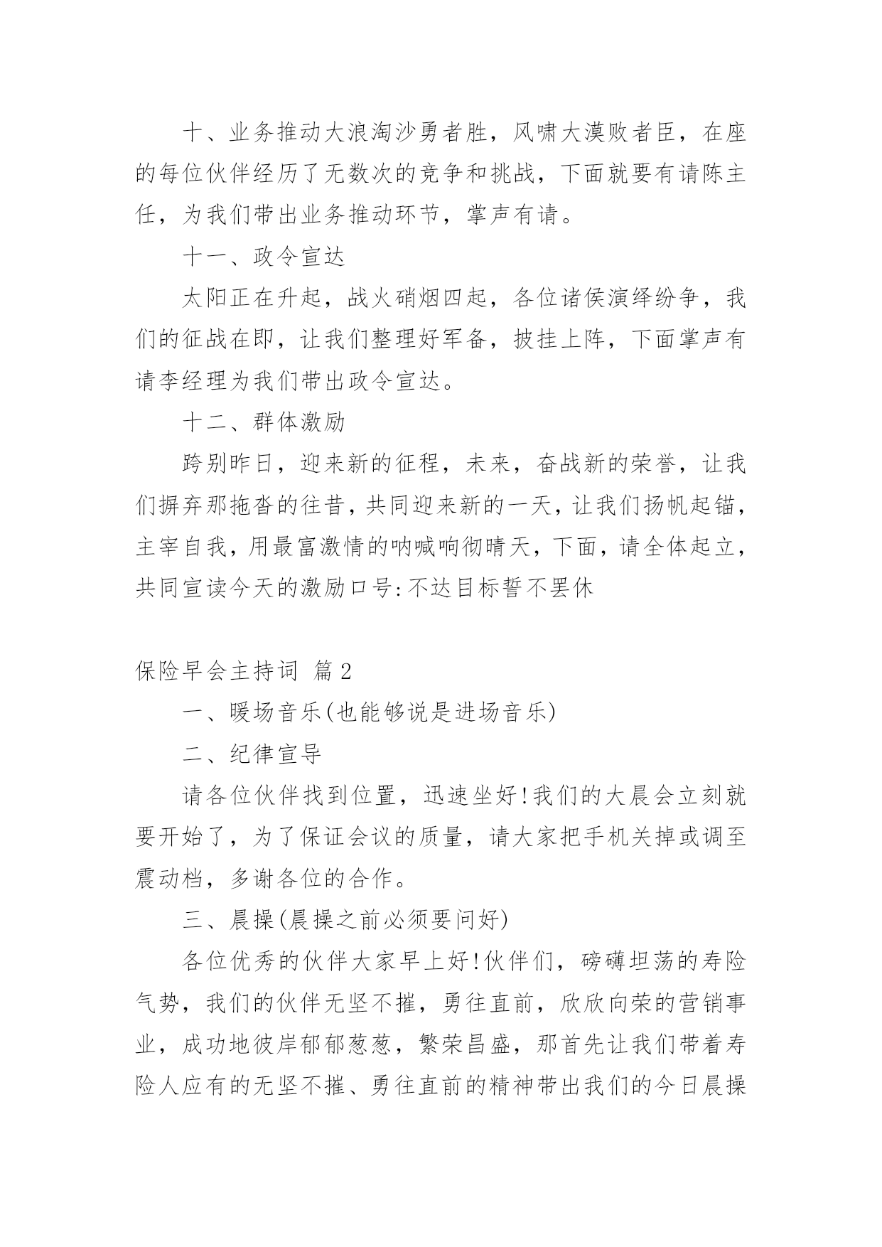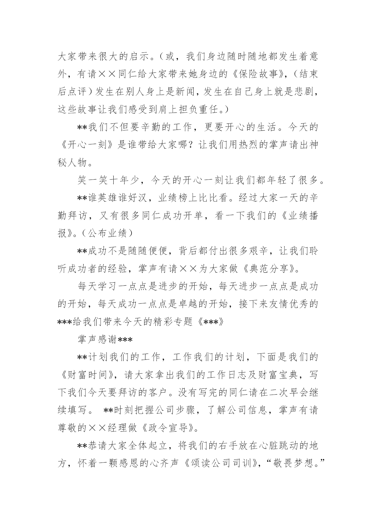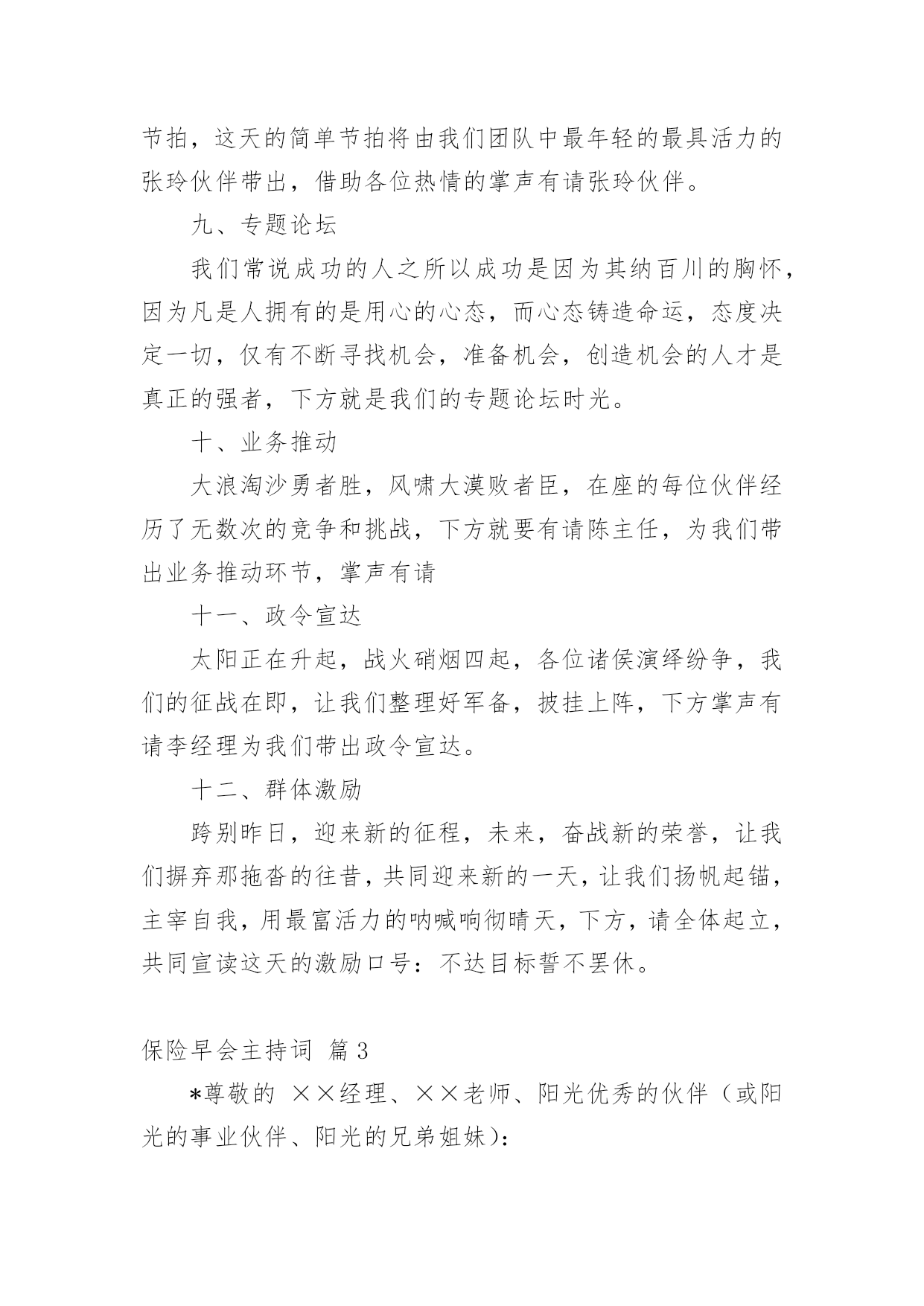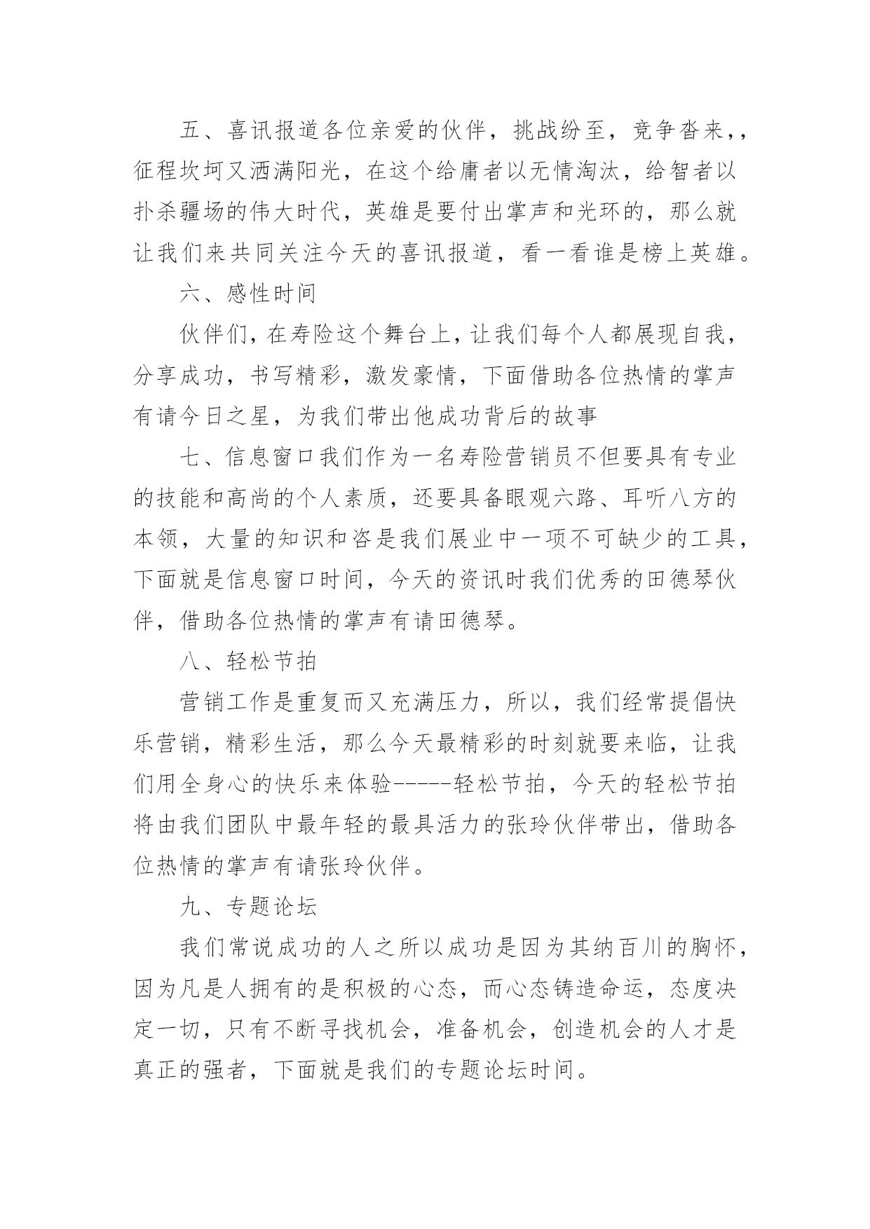 保险早会主持词主持词是主持人在台上表演的灵魂之所在。时代不断在进步,主持词与我们不再陌生,那么你会写主持词吗?下面是小编为大家整理的保险早会主持词4篇,仅供参考,大家一起来看看吧。保险早会主持词篇1一、暖场音乐(眉飞色舞)二、纪律宣导请各位伙伴找到位置,迅速坐好!我们的大晨会马上就要开始了,为了保证会议的质量,请大家把手机关闭或调至震动档,谢谢各位的合作。三、晨操各位优秀的伙伴大家早上好!伙伴们,磅礴坦荡的寿险气势,我们的伙伴无坚不摧,勇往直前,欣欣向荣的营销事业,成功地彼岸郁郁葱葱,繁荣昌盛,那首先让我们带着寿险人应有的无坚不摧、勇往直前的精神带出我们的今日晨操";少年先锋";,让我们以热烈的掌声有请一分处所有伙伴上台带动晨操。四、敬业时间又是一个新的早晨,又是一天新的起步,相信我们会给自己带来一个良好的开端,成功在每一天积累,请随我共同进入今天的敬业时间,请各分处清点人数,做好准备五、喜讯报道各位亲爱的伙伴,挑战纷至,竞争沓来,,征程坎坷又洒满阳光,在这个给庸者以无情淘汰,给智者以扑杀疆场的伟大时代,英雄是要付出掌声和光环的,那么就让我们来共同关注今天的喜讯报道,看一看谁是榜上英雄。六、感性时间伙伴们,在寿险这个舞台上,让我们每个人都展现自我,分享成功,书写精彩,激发豪情,下面借助各位热情的掌声有请今日之星,为我们带出他成功背后的故事七、信息窗口我们作为一名寿险营销员不但要具有专业的技能和高尚的个人素质,还要具备眼观六路、耳听八方的本领,大量的知识和咨是我们展业中一项不可缺少的工具,下面就是信息窗口时间,今天的资讯时我们优秀的田德琴伙伴,借助各位热情的掌声有请田德琴。八、轻松节拍营销工作是重复而又充满压力,所以,我们经常提倡快乐营销,精彩生活,那么今天最精彩的时刻就要来临,让我们用全身心的快乐来体验-----轻松节拍,今天的轻松节拍将由我们团队中最年轻的最具活力的张玲伙伴带出,借助各位热情的掌声有请张玲伙伴。九、专题论坛我们常说成功的人之所以成功是因为其纳百川的胸怀,因为凡是人拥有的是积极的心态,而心态铸造命运,态度决定一切,只有不断寻找机会,准备机会,创造机会的人才是真正的强者,下面就是我们的专题论坛时间。十、业务推动大浪淘沙勇者胜,风啸大漠败者臣,在座的每位伙伴经历了无数次的竞争和挑战,下面就要有请陈主任,为我们带出业务推动环节,掌声有请。十一、政令宣达太阳正在升起,战火硝烟四起,各位诸侯演绎纷争,我们的征战在即,让我们整理好军备,披挂上阵,下面掌声有请李经理为我们带出政令宣达。十二、群体激励跨别昨日,迎来新的征程,未来,奋战新的荣誉,让我们摒弃那拖沓的往昔,共同迎来新的一天,让我们扬帆起锚,主宰自我,用最富激情的呐喊响彻晴天,下面,请全体起立,共同宣读今天的激励口号:不达目标誓不罢休保险早会主持词篇2一、暖场音乐(也能够说是进场音乐)二、纪律宣导请各位伙伴找到位置,迅速坐好!我们的大晨会立刻就要开始了,为了保证会议的质量,请大家把手机关掉或调至震动档,多谢各位的合作。三、晨操(晨操之前必须要问好)各位优秀的伙伴大家早上好!伙伴们,磅礴坦荡的寿险气势,我们的伙伴无坚不摧,勇往直前,欣欣向荣的营销事业,成功地彼岸郁郁葱葱,繁荣昌盛,那首先让我们带着寿险人应有的无坚不摧、勇往直前的精神带出我们的今日晨操“少年先锋”,让我们以热烈的掌声有请一分处所有伙伴上台带动晨操。四、敬业时光(这个起考勤的作用)又是一个新的早晨,又是一天新的起步,相信我们会给自我带来一个良好的开端,将成功在每一天积累,请随我共同进入这天的敬业时光,请各分处清点人数,做好准备五、喜讯报道各位亲爱的伙伴,挑战纷至,竞争沓来,,征程坎坷又洒满阳光,在这个给庸者以无情淘汰,给智者以扑杀疆场的伟大时代,英雄是要付出掌声和光环的,那么就让我们来共同关注这天的喜讯报道,看一看谁是榜上英雄。六、感性时光(签单分享等等)伙伴们,在寿险这个舞台上,让我们每个人都展现自我,分享成功,书写精彩,激发豪情,下方借助各位热情的掌声有请今日之星,为我们带出他成功背后的故事七、信息窗口我们作为一名寿险营销员不但要具有专业的技能和高尚的个人素质,还要具备眼观六路、耳听八方的本领,超多的知识和咨询是我们展业中一项不可缺少的工具,下方就是信息窗口时光,这天的资讯时我们优秀的田德琴伙伴,借助各位热情的掌声有请田德琴。八、简单节拍(游戏时光)营销工作是重复而又充满压力,所以,我们经常提倡欢乐营销,精彩生活,那么这天最精彩的时刻就要来临,让我们用全身心的欢乐来体验-----简单节拍,这天的简单节拍将由我们团队中最年轻的最具活力的张玲伙伴带出,借助各位热情的掌声有请张玲伙伴。九、专题论坛我们常说成功的人之所以成功是因为其纳百川的胸怀,因为凡是人拥有的是用心的心态,而心态铸造命运,态度决定一切,仅