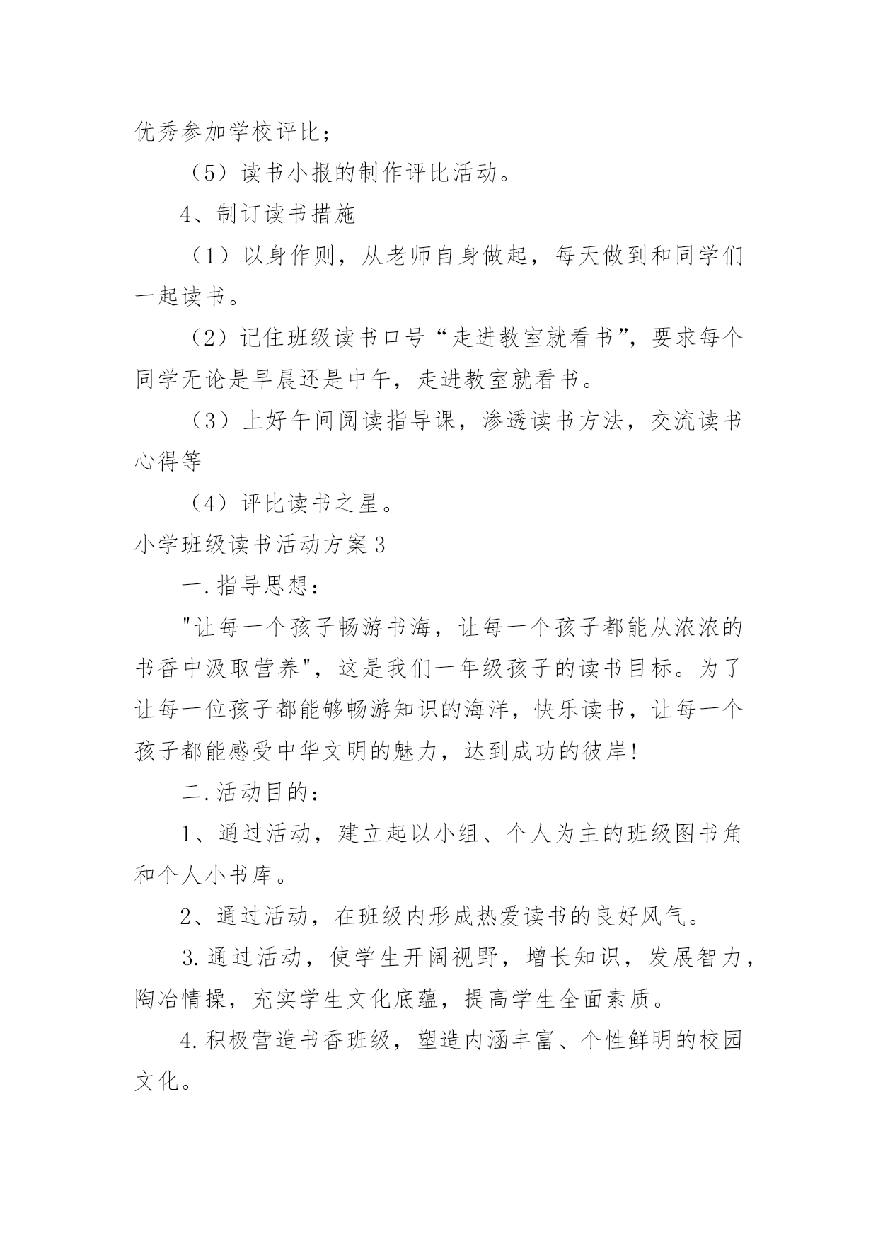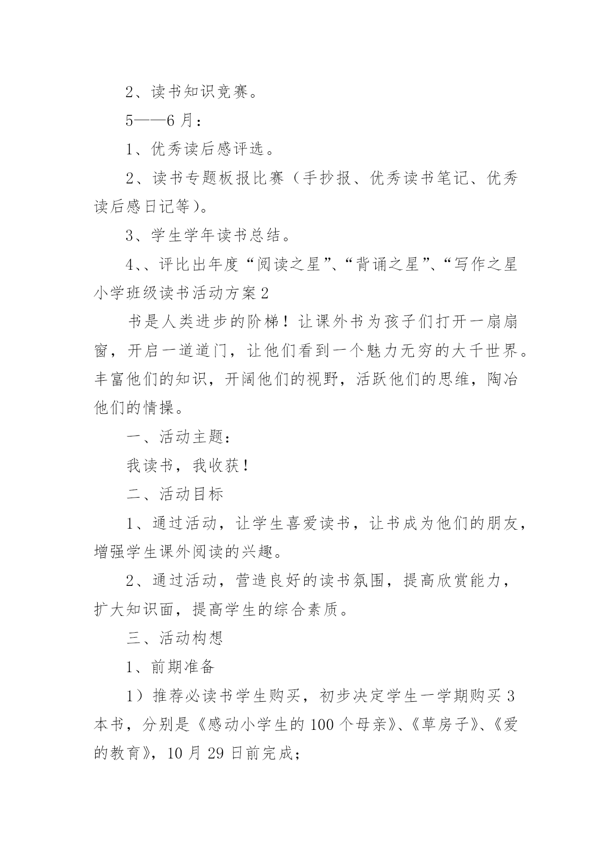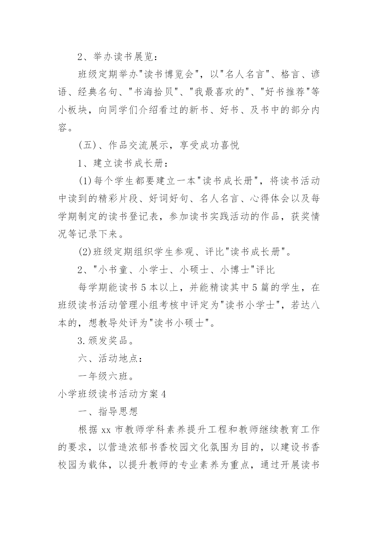 小学班级读书活动方案小学班级读书活动方案为了确保事情或工作扎实开展,常常需要提前准备一份具体、详细、针对性强的方案,方案一般包括指导思想、主要目标、工作重点、实施步骤、政策措施、具体要求等项目。那么你有了解过方案吗?以下是小编整理的小学班级读书活动方案,仅供参考,欢迎大家阅读。小学班级读书活动方案1一、设计理念书是人类进步的阶梯!让课外书为孩子们打开一扇扇窗,开启一道道门,让他们看到一个魅力无穷的大千世界。丰富他们的知识,开阔他们的视野,活跃他们的`思维,陶冶他们的情操,使他们体验读书是快乐的!二、活动目标1、通过活动,让孩子们喜爱读书,让书成为他们的朋友。2、通过活动,提高学生的综合素质。3、通过活动,营造良好的读书氛围,提高欣赏能力。4、让学生在活动中体验到读书给自己带来的快乐。三、活动构想1、制定班级读书计划和个人读书计划⑴根据本班的实际情况,制定班级读书计划:背诵《古诗80首》⑵学生根据本人实际情况制定个人读书计划,准备好一学期要读的书。(读书三本以上)让每位学生制定个人的读书计划,使他们充分合理地利用课余时间来读书。2、营造一个书香班级⑴以身作则,从老师自身做起,每天做到和同学们一起读书。⑵记住班级读书口号“走进教室就看书”,要求每个同学无论是早晨还是中午,走进教室就看书。3、实行图书手手传阅制度。学生每人至少带一本图书,如童话、故事书、科幻等等。在同学之间互相传阅,好书共分享,换一本书,交一个朋友,每周至少写一篇读书笔记,并制定传阅制度。4、开展“读书汇报会”:(1)要求每个学生每学期必读三本书以上,并会讲其中的一个故事,到班上讲给大家听。(2)每天的晨会课背诵经典读物,也可以背一首新学的古诗或诗歌。(3)展示优秀读书笔记。5、提倡在家庭中开展亲子阅读活动,倡议父母引导孩子按本身的兴趣选择合适的读物,拓展学生阅读范围。为孩子营造良好的家庭读书环境,养成良好的读书习惯。6、老师做好导读工作,教给学生阅读方法。提倡个性阅读,教给学生读书做记号,读书做笔记的批注读书法。要求学生将读书活动中读到的精彩片段、好词好句、名人名言摘录在“读书笔记”中,。7、总结评比。(1)、开展讲故事演讲比赛,朗诵比赛,优秀读后感展评。(2)、定期进行班级评比,每月评选出“阅读之星”、“背诵之星”、“写作之星”。(3)、评比“班级读书小明星”(4)、制作读书手抄报。四、具体活动安排:9月:1、宣传发动,学习学校有关读书活动的文件、计划。2、制定班级读书计划、学生个人读书计划。3、布置读书任务。10——11月:1、师教授阅读方法。2、师生同读一本书活动。《爱的教育》3、召开读书主题班会(讲成语故事、朗诵比赛和古诗背诵比赛)。20xx年12月:1、学生读书小结。2、评比、表彰。3——4月:1、召开读书主题班会。2、读书知识竞赛。5——6月:1、优秀读后感评选。2、读书专题板报比赛(手抄报、优秀读书笔记、优秀读后感日记等)。3、学生学年读书总结。4、、评比出年度“阅读之星”、“背诵之星”、“写作之星小学班级读书活动方案2书是人类进步的阶梯!让课外书为孩子们打开一扇扇窗,开启一道道门,让他们看到一个魅力无穷的大千世界。丰富他们的知识,开阔他们的视野,活跃他们的思维,陶冶他们的情操。一、活动主题:我读书,我收获!二、活动目标1、通过活动,让学生喜爱读书,让书成为他们的朋友,增强学生课外阅读的兴趣。2、通过活动,营造良好的读书氛围,提高欣赏能力,扩大知识面,提高学生的综合素质。三、活动构想1、前期准备1)推荐必读书学生购买,初步决定学生一学期购买3本书,分别是《感动小学生的100个母亲》、《草房子》、《爱的教育》,10月29日前完成;2)教师提供读物,语文老师将自己积累的50本左右的适合学生读的书籍带来,放入班级的图书角,供学生阅读。3)制定班级读书计划和个人读书计划a、根据本班的实际情况,制定班级读书计划:背诵《经典诗文》、阅读必读书等;b、学生根据本人实际情况制定个人读书计划,准备好一学期要读的书。(读书三本以上,养成晨诵、午读、暮醒的习惯。)2、落实读书内容(1)读必读书:3本必读书在本学期必须读完,其中《感动小学生的100个母亲》以早晨在家朗诵为主,《草房子》、《爱的教育》以睡前、午间等空闲时间阅读为主。教师安排时间做好比读书的指导与检查。(2)背诵经典诗文10首(六年级考级的前10首)。(3)熟读、背诵读书名言10句。(4)学生自由阅读,结合读书漂流和老师推荐等方式,让学生自己挑选图书角内的.图书进行阅读积累的50本左右的适合学生读的书籍带来。3、开展读书活动。(1)出好黑板报,营造读书氛围。(2)制作书签比赛,学生自制书签,并在书签上写上读书名言供自己使用、参加班级评比等。(3)经典、读书名言诵读比赛活动。(4)写必读书的读后感。(结合周记