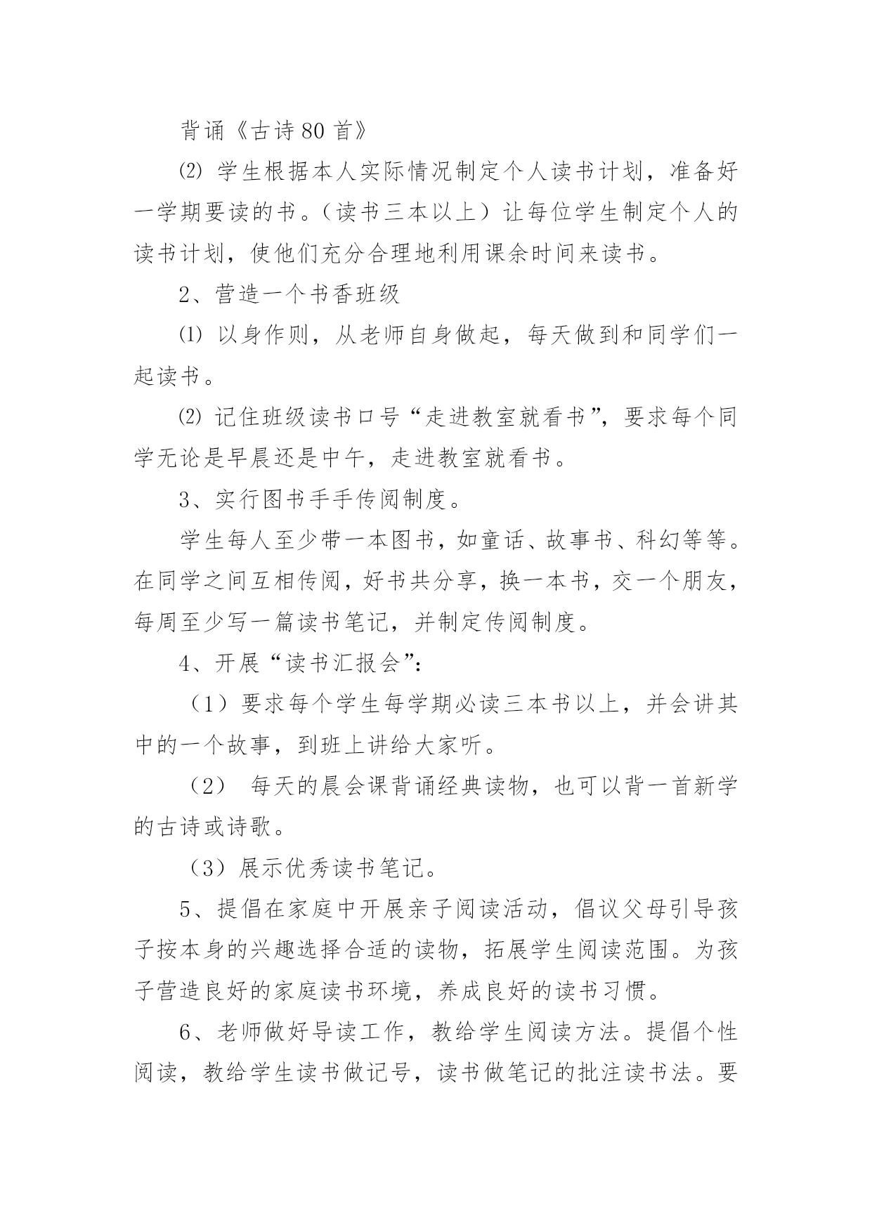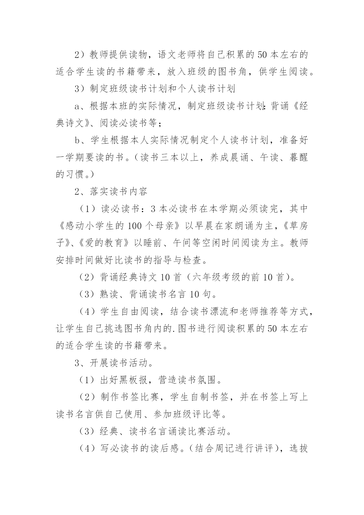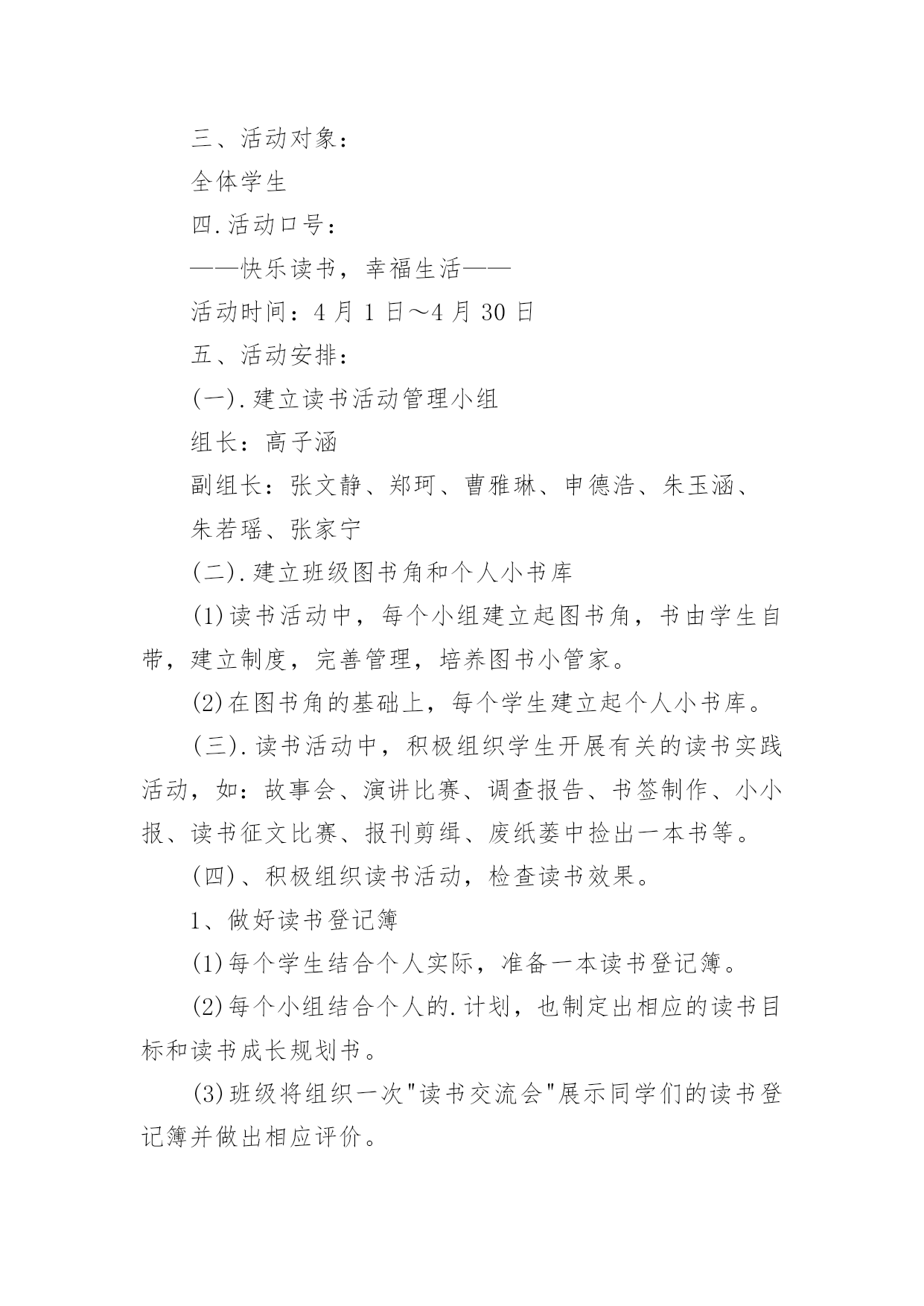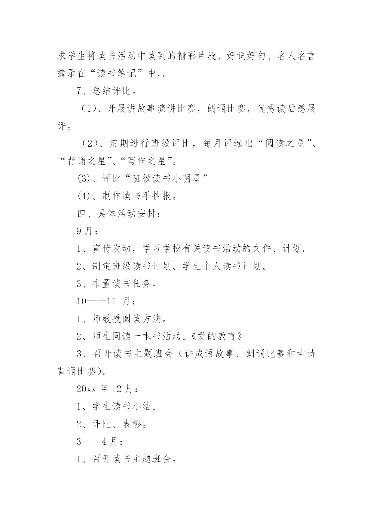 小学班级读书活动方案小学班级读书活动方案为了确保事情或工作扎实开展,常常需要提前准备一份具体、详细、针对性强的方案,方案一般包括指导思想、主要目标、工作重点、实施步骤、政策措施、具体要求等项目。那么你有了解过方案吗?以下是小编整理的小学班级读书活动方案,仅供参考,欢迎大家阅读。小学班级读书活动方案1一、设计理念书是人类进步的阶梯!让课外书为孩子们打开一扇扇窗,开启一道道门,让他们看到一个魅力无穷的大千世界。丰富他们的知识,开阔他们的视野,活跃他们的`思维,陶冶他们的情操,使他们体验读书是快乐的!二、活动目标1、通过活动,让孩子们喜爱读书,让书成为他们的朋友。2、通过活动,提高学生的综合素质。3、通过活动,营造良好的读书氛围,提高欣赏能力。4、让学生在活动中体验到读书给自己带来的快乐。三、活动构想1、制定班级读书计划和个人读书计划⑴根据本班的实际情况,制定班级读书计划:背诵《古诗80首》⑵学生根据本人实际情况制定个人读书计划,准备好一学期要读的书。(读书三本以上)让每位学生制定个人的读书计划,使他们充分合理地利用课余时间来读书。2、营造一个书香班级⑴以身作则,从老师自身做起,每天做到和同学们一起读书。⑵记住班级读书口号“走进教室就看书”,要求每个同学无论是早晨还是中午,走进教室就看书。3、实行图书手手传阅制度。学生每人至少带一本图书,如童话、故事书、科幻等等。在同学之间互相传阅,好书共分享,换一本书,交一个朋友,每周至少写一篇读书笔记,并制定传阅制度。4、开展“读书汇报会”:(1)要求每个学生每学期必读三本书以上,并会讲其中的一个故事,到班上讲给大家听。(2)每天的晨会课背诵经典读物,也可以背一首新学的古诗或诗歌。(3)展示优秀读书笔记。5、提倡在家庭中开展亲子阅读活动,倡议父母引导孩子按本身的兴趣选择合适的读物,拓展学生阅读范围。为孩子营造良好的家庭读书环境,养成良好的读书习惯。6、老师做好导读工作,教给学生阅读方法。提倡个性阅读,教给学生读书做记号,读书做笔记的批注读书法。要求学生将读书活动中读到的精彩片段、好词好句、名人名言摘录在“读书笔记”中,。7、总结评比。(1)、开展讲故事演讲比赛,朗诵比赛,优秀读后感展评。(2)、定期进行班级评比,每月评选出“阅读之星”、“背诵之星”、“写作之星”。(3)、评比“班级读书小明星”(4)、制作读书手抄报。四、具体活动安排:9月:1、宣传发动,学习学校有关读书活动的文件、计划。2、制定班级读书计划、学生个人读书计划。3、布置读书任务。10——11月:1、师教授阅读方法。2、师生同读一本书活动。《爱的教育》3、召开读书主题班会(讲成语故事、朗诵比赛和古诗背诵比赛)。20xx年12月:1、学生读书小结。2、评比、表彰。3——4月:1、召开读书主题班会。2、读书知识竞赛。5——6月:1、优秀读后感评选。2、读书专题板报比赛(手抄报、优秀读书笔记、优秀读后感日记等)。3、学生学年读书总结。4、、评比出年度“阅读之星”、“背诵之星”、“写作之星小学班级读书活动方案2书是人类进步的阶梯!让课外书为孩子们打开一扇扇窗,开启一道道门,让他们看到一个魅力无穷的大千世界。丰富他们的知识,开阔他们的视野,活跃他们的思维,陶冶他们的情操。一、活动主题:我读书,我收获!二、活动目标1、通过活动,让学生喜爱读书,让书成为他们的朋友,增强学生课外阅读的兴趣。2、通过活动,营造良好的读书氛围,提高欣赏能力,扩大知识面,提高学生的综合素质。三、活动构想1、前期准备1)推荐必读书学生购买,初步决定学生一学期购买3本书,分别是《感动小学生的100个母亲》、《草房子》、《爱的教育》,10月29日前完成;2)教师提供读物,语文老师将自己积累的50本左右的适合学生读的书籍带来,放入班级的图书角,供学生阅读。3)制定班级读书计划和个人读书计划a、根据本班的实际情况,制定班级读书计划:背诵《经典诗文》、阅读必读书等;b、学生根据本人实际情况制定个人读书计划,准备好一学期要读的书。(读书三本以上,养成晨诵、午读、暮醒的习惯。)2、落实读书内容(1)读必读书:3本必读书在本学期必须读完,其中《感动小学生的100个母亲》以早晨在家朗诵为主,《草房子》、《爱的教育》以睡前、午间等空闲时间阅读为主。教师安排时间做好比读书的指导与检查。(2)背诵经典诗文10首(六年级考级的前10首)。(3)熟读、背诵读书名言10句。(4)学生自由阅读,结合读书漂流和老师推荐等方式,让学生自己挑选图书角内的.图书进行阅读积累的50本左右的适合学生读的书籍带来。3、开展读书活动。(1)出好黑板报,营造读书氛围。(2)制作书签比赛,学生自制书签,并在书签上写上读书名言供自己使用、参加班级评比等。(3)经典、读书名言诵读比赛活动。(4)写必读书的读后感。(结合周记