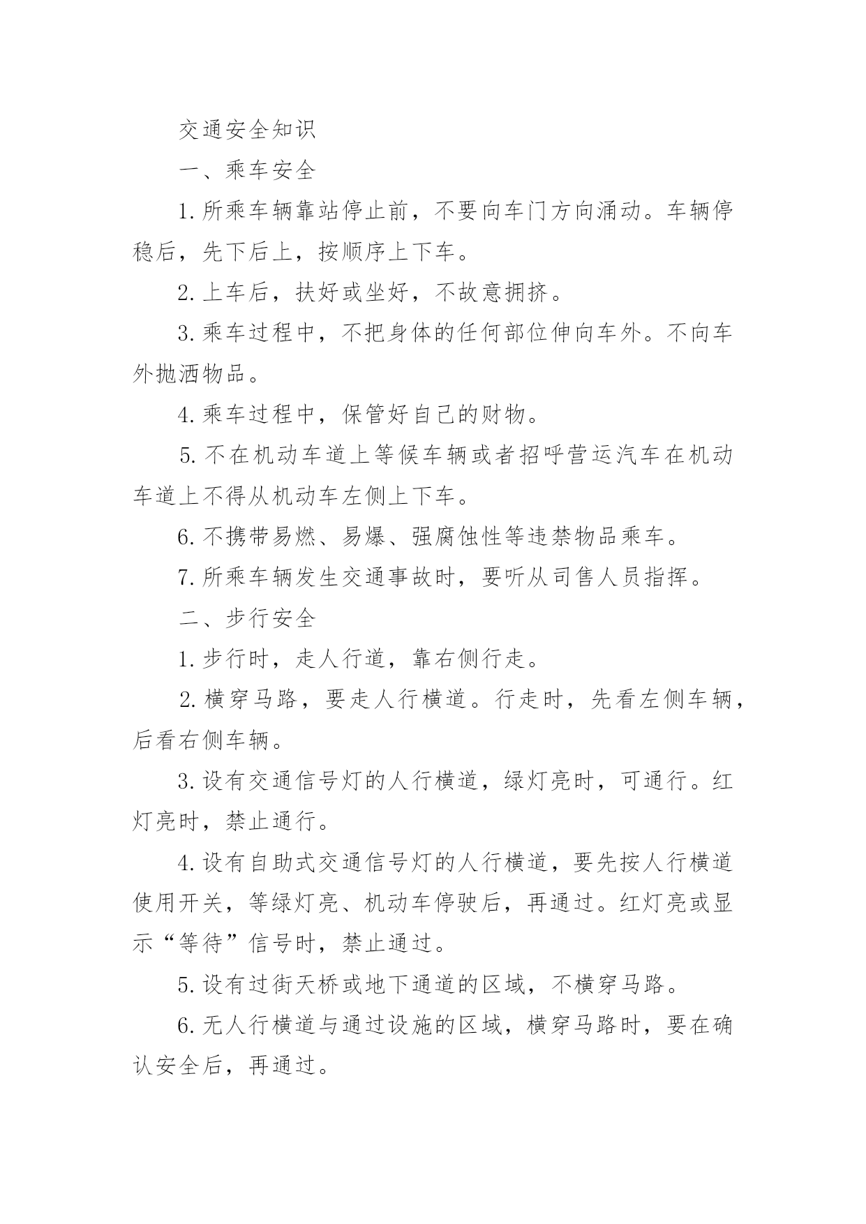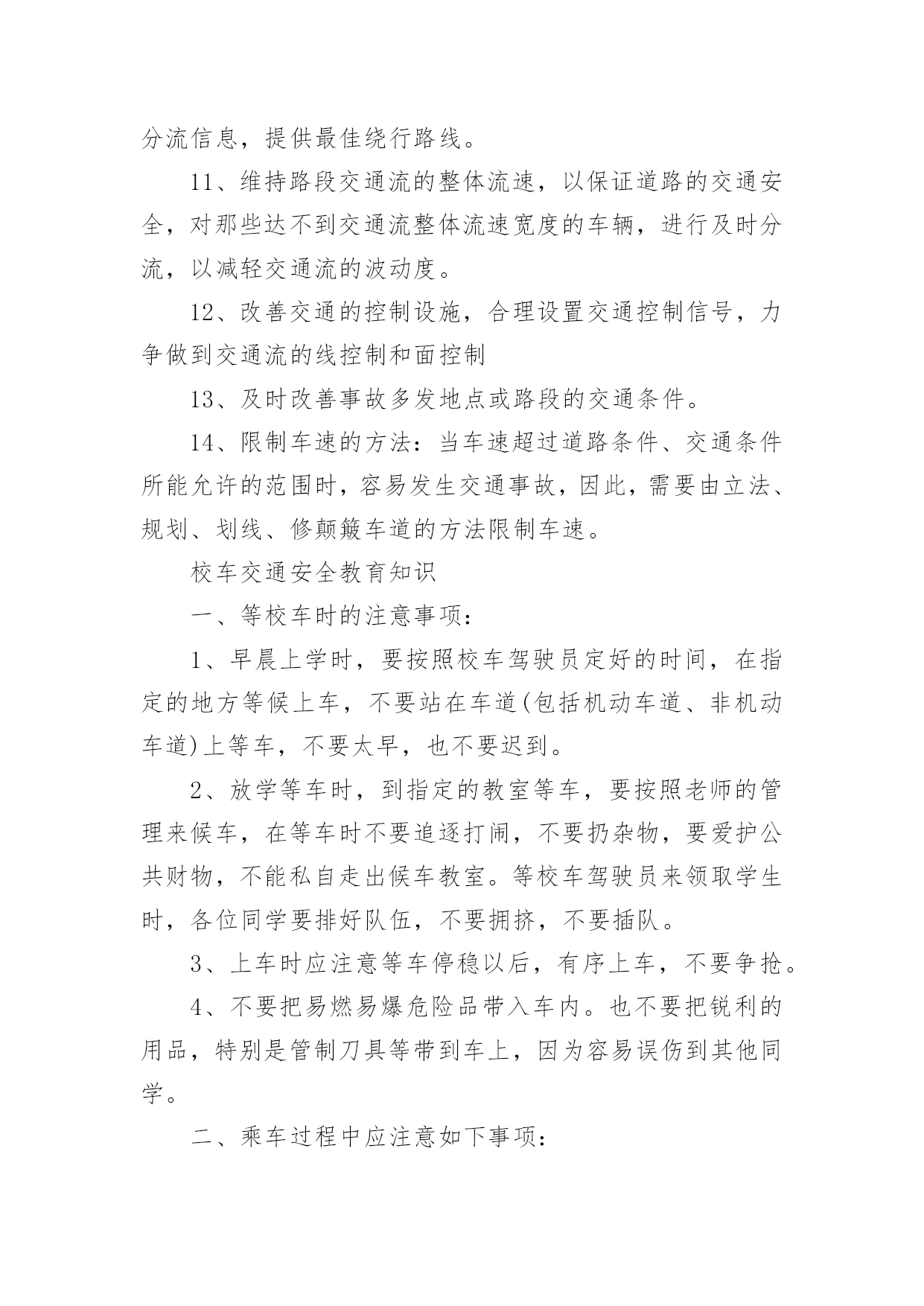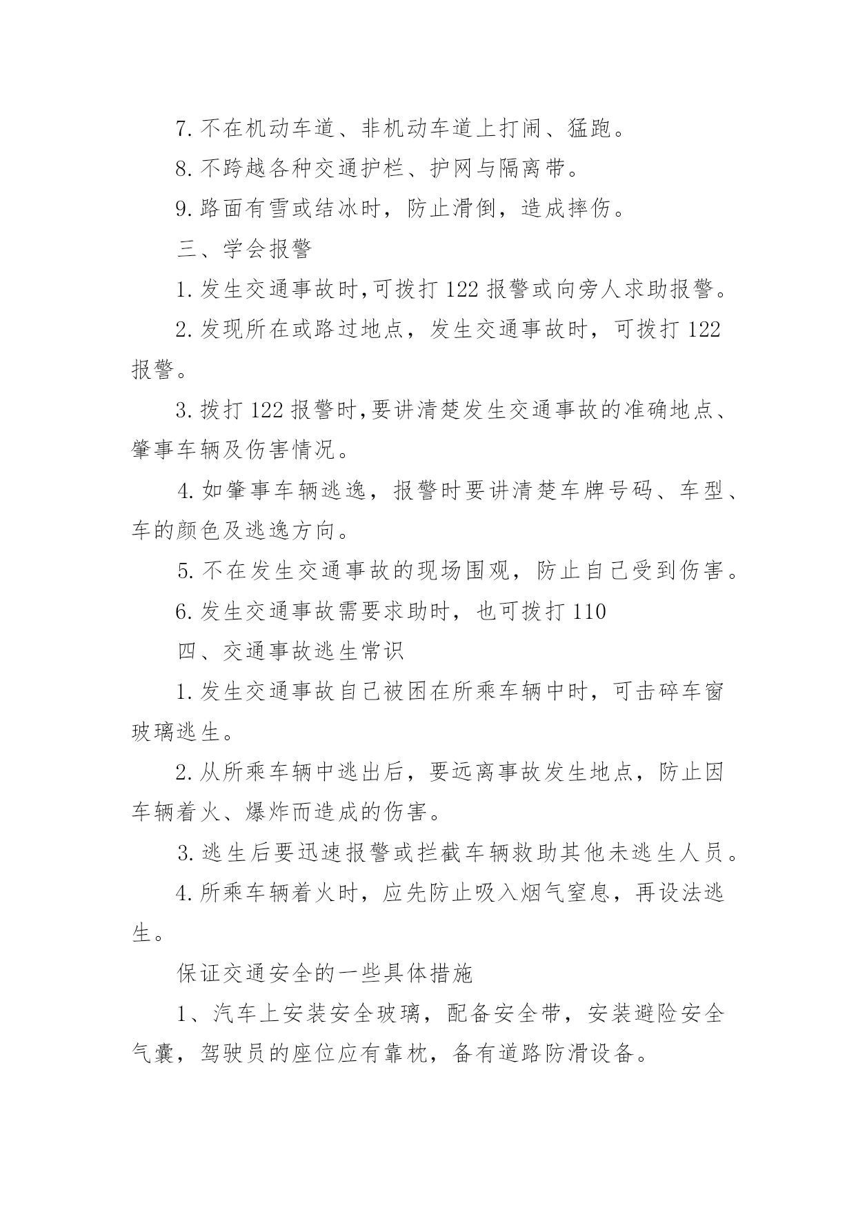 交通安全教育知识交通安全教育知识交通安全教育主要分为两大部分,即对机动车驾驶员的教育和对全社会人员的安全教育。下面是百分网小编为大家整理的关于交通安全教育知识,希望大家喜欢!交通安全教育知识1、对驾驶员的教育内容主要分为驾驶员定期学习交通法规;学习机动车的新技术、新操作技能、机械理论,对驾驶员定期进行的理论考核、操纵考核和车辆审验都可以归纳到这个范围内。2、对全社会人员的教育主要是学校教育,国外十分重视交通安全的学校教育。1920~1925年,美国在中小学实行了交通安全教育。实验证明,受过交通安全教育的中小学生的交通事故率明显下降。目前,发达国家在中小学开设交通安全课已经十分普遍,在第三世界国家给中小学开设交通安全课的尚属少数。我国在一定数量的大中城市虽然也开展了对中小学生的交通安全教育,但作为课程开设的还不普遍,交通安全活动开展得也不普遍和不是经常性,这是十分遗憾的事情。利用一切新闻媒介和宣传手对全社会进行交通安全教育和对交通法规的宣传是交通安全社会教育的主要方法和内容,目的是加强和提高人们的交通安全意识和交通法制的观念,从而达到全面提高交通安全的水平。交通安全知识一、乘车安全1.所乘车辆靠站停止前,不要向车门方向涌动。车辆停稳后,先下后上,按顺序上下车。2.上车后,扶好或坐好,不故意拥挤。3.乘车过程中,不把身体的任何部位伸向车外。不向车外抛洒物品。4.乘车过程中,保管好自己的财物。5.不在机动车道上等候车辆或者招呼营运汽车在机动车道上不得从机动车左侧上下车。6.不携带易燃、易爆、强腐蚀性等违禁物品乘车。7.所乘车辆发生交通事故时,要听从司售人员指挥。二、步行安全1.步行时,走人行道,靠右侧行走。2.横穿马路,要走人行横道。行走时,先看左侧车辆,后看右侧车辆。3.设有交通信号灯的人行横道,绿灯亮时,可通行。红灯亮时,禁止通行。4.设有自助式交通信号灯的人行横道,要先按人行横道使用开关,等绿灯亮、机动车停驶后,再通过。红灯亮或显示“等待”信号时,禁止通过。5.设有过街天桥或地下通道的区域,不横穿马路。6.无人行横道与通过设施的区域,横穿马路时,要在确认安全后,再通过。7.不在机动车道、非机动车道上打闹、猛跑。8.不跨越各种交通护栏、护网与隔离带。9.路面有雪或结冰时,防止滑倒,造成摔伤。三、学会报警1.发生交通事故时,可拨打122报警或向旁人求助报警。2.发现所在或路过地点,发生交通事故时,可拨打122报警。3.拨打122报警时,要讲清楚发生交通事故的准确地点、肇事车辆及伤害情况。4.如肇事车辆逃逸,报警时要讲清楚车牌号码、车型、车的颜色及逃逸方向。5.不在发生交通事故的现场围观,防止自己受到伤害。6.发生交通事故需要求助时,也可拨打110四、交通事故逃生常识1.发生交通事故自己被困在所乘车辆中时,可击碎车窗玻璃逃生。2.从所乘车辆中逃出后,要远离事故发生地点,防止因车辆着火、爆炸而造成的伤害。3.逃生后要迅速报警或拦截车辆救助其他未逃生人员。4.所乘车辆着火时,应先防止吸入烟气窒息,再设法逃生。保证交通安全的一些具体措施1、汽车上安装安全玻璃,配备安全带,安装避险安全气囊,驾驶员的座位应有靠枕,备有道路防滑设备。2、道路的设计要求更合理和更科学,道路沿线应该有完备的交通设施和服务机构,道路的数量应该和道路交通运输相配套。3、人车分流,进行合理的交通渠化,科学地控制道路的进、出口。4、有条件的道路应该实施立体交叉,对平面交叉要进行科学的管理,应用高科技管理设备和措施。5、实现国家和地方两级的交通立法,全面实行交通法治的科学手段。6、大力发展交通通信事业,加强车与车、车与交通指挥中心及社会的通信联系。交通信息的有效传递,能够增加驾驶员安全驾驶的能力。7、道路的沿线应该设置道路交通信息动态信息板,及时地向驾驶员传递道路具体情况、天气情况等,使驾驶员能做到有的放矢地进行驾驶,增加驾驶的安全性。8、应用高科技技术,提高车辆的防撞能力和智能化程度,有效地减少车辆的碰撞、追尾事故发生。9、按期培训机动车驾驶员的技术能力,及时介绍关于车辆、道路等方面的新科技、新技术、新产品。10、通过限制交通流量的方法来保证交通安全,在任何道路段通过对道路的通行能力计算,并利用该路段交通流特性的分析,找到一个最佳的交通量,当交通量达到此值时,将对道路的入口进行流量的控制,以调整路段的交通量保持在最佳值同时,路段的管理者在流量调整阶段,向车辆发布分流信息,提供最佳绕行路线。11、维持路段交通流的整体流速,以保证道路的交通安全,对那些达不到交通流整体流速宽度的车辆,进行及时分流,以减轻交通流的波动度。12、改善交通的控制设施,合理设置交通控制信号,力争做到交通流的线控制和面控制13、及时改善事故多发地点或路段的交通条件。14、限制车速的方法:当车速超过道