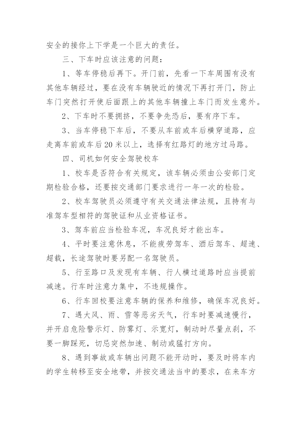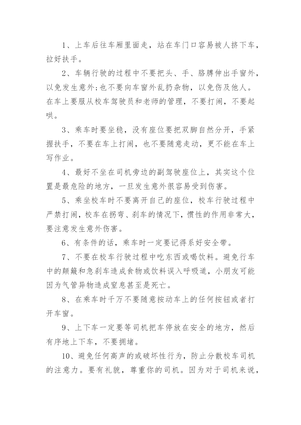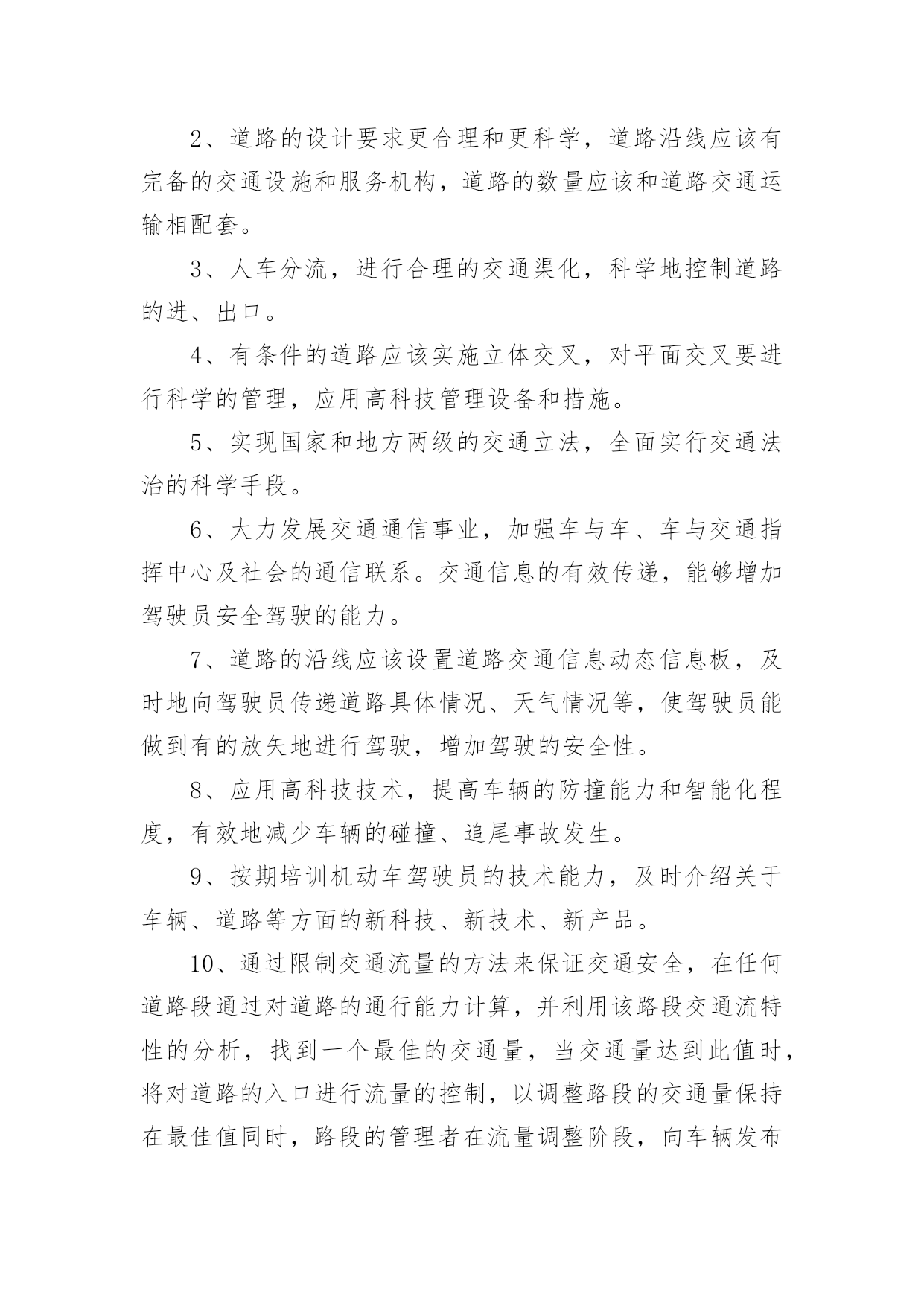 交通安全教育知识交通安全教育知识交通安全教育主要分为两大部分,即对机动车驾驶员的教育和对全社会人员的安全教育。下面是百分网小编为大家整理的关于交通安全教育知识,希望大家喜欢!交通安全教育知识1、对驾驶员的教育内容主要分为驾驶员定期学习交通法规;学习机动车的新技术、新操作技能、机械理论,对驾驶员定期进行的理论考核、操纵考核和车辆审验都可以归纳到这个范围内。2、对全社会人员的教育主要是学校教育,国外十分重视交通安全的学校教育。1920~1925年,美国在中小学实行了交通安全教育。实验证明,受过交通安全教育的中小学生的交通事故率明显下降。目前,发达国家在中小学开设交通安全课已经十分普遍,在第三世界国家给中小学开设交通安全课的尚属少数。我国在一定数量的大中城市虽然也开展了对中小学生的交通安全教育,但作为课程开设的还不普遍,交通安全活动开展得也不普遍和不是经常性,这是十分遗憾的事情。利用一切新闻媒介和宣传手对全社会进行交通安全教育和对交通法规的宣传是交通安全社会教育的主要方法和内容,目的是加强和提高人们的交通安全意识和交通法制的观念,从而达到全面提高交通安全的水平。交通安全知识一、乘车安全1.所乘车辆靠站停止前,不要向车门方向涌动。车辆停稳后,先下后上,按顺序上下车。2.上车后,扶好或坐好,不故意拥挤。3.乘车过程中,不把身体的任何部位伸向车外。不向车外抛洒物品。4.乘车过程中,保管好自己的财物。5.不在机动车道上等候车辆或者招呼营运汽车在机动车道上不得从机动车左侧上下车。6.不携带易燃、易爆、强腐蚀性等违禁物品乘车。7.所乘车辆发生交通事故时,要听从司售人员指挥。二、步行安全1.步行时,走人行道,靠右侧行走。2.横穿马路,要走人行横道。行走时,先看左侧车辆,后看右侧车辆。3.设有交通信号灯的人行横道,绿灯亮时,可通行。红灯亮时,禁止通行。4.设有自助式交通信号灯的人行横道,要先按人行横道使用开关,等绿灯亮、机动车停驶后,再通过。红灯亮或显示“等待”信号时,禁止通过。5.设有过街天桥或地下通道的区域,不横穿马路。6.无人行横道与通过设施的区域,横穿马路时,要在确认安全后,再通过。7.不在机动车道、非机动车道上打闹、猛跑。8.不跨越各种交通护栏、护网与隔离带。9.路面有雪或结冰时,防止滑倒,造成摔伤。三、学会报警1.发生交通事故时,可拨打122报警或向旁人求助报警。2.发现所在或路过地点,发生交通事故时,可拨打122报警。3.拨打122报警时,要讲清楚发生交通事故的准确地点、肇事车辆及伤害情况。4.如肇事车辆逃逸,报警时要讲清楚车牌号码、车型、车的颜色及逃逸方向。5.不在发生交通事故的现场围观,防止自己受到伤害。6.发生交通事故需要求助时,也可拨打110四、交通事故逃生常识1.发生交通事故自己被困在所乘车辆中时,可击碎车窗玻璃逃生。2.从所乘车辆中逃出后,要远离事故发生地点,防止因车辆着火、爆炸而造成的伤害。3.逃生后要迅速报警或拦截车辆救助其他未逃生人员。4.所乘车辆着火时,应先防止吸入烟气窒息,再设法逃生。保证交通安全的一些具体措施1、汽车上安装安全玻璃,配备安全带,安装避险安全气囊,驾驶员的座位应有靠枕,备有道路防滑设备。2、道路的设计要求更合理和更科学,道路沿线应该有完备的交通设施和服务机构,道路的数量应该和道路交通运输相配套。3、人车分流,进行合理的交通渠化,科学地控制道路的进、出口。4、有条件的道路应该实施立体交叉,对平面交叉要进行科学的管理,应用高科技管理设备和措施。5、实现国家和地方两级的交通立法,全面实行交通法治的科学手段。6、大力发展交通通信事业,加强车与车、车与交通指挥中心及社会的通信联系。交通信息的有效传递,能够增加驾驶员安全驾驶的能力。7、道路的沿线应该设置道路交通信息动态信息板,及时地向驾驶员传递道路具体情况、天气情况等,使驾驶员能做到有的放矢地进行驾驶,增加驾驶的安全性。8、应用高科技技术,提高车辆的防撞能力和智能化程度,有效地减少车辆的碰撞、追尾事故发生。9、按期培训机动车驾驶员的技术能力,及时介绍关于车辆、道路等方面的新科技、新技术、新产品。10、通过限制交通流量的方法来保证交通安全,在任何道路段通过对道路的通行能力计算,并利用该路段交通流特性的分析,找到一个最佳的交通量,当交通量达到此值时,将对道路的入口进行流量的控制,以调整路段的交通量保持在最佳值同时,路段的管理者在流量调整阶段,向车辆发布分流信息,提供最佳绕行路线。11、维持路段交通流的整体流速,以保证道路的交通安全,对那些达不到交通流整体流速宽度的车辆,进行及时分流,以减轻交通流的波动度。12、改善交通的控制设施,合理设置交通控制信号,力争做到交通流的线控制和面控制13、及时改善事故多发地点或路段的交通条件。14、限制车速的方法:当车速超过道