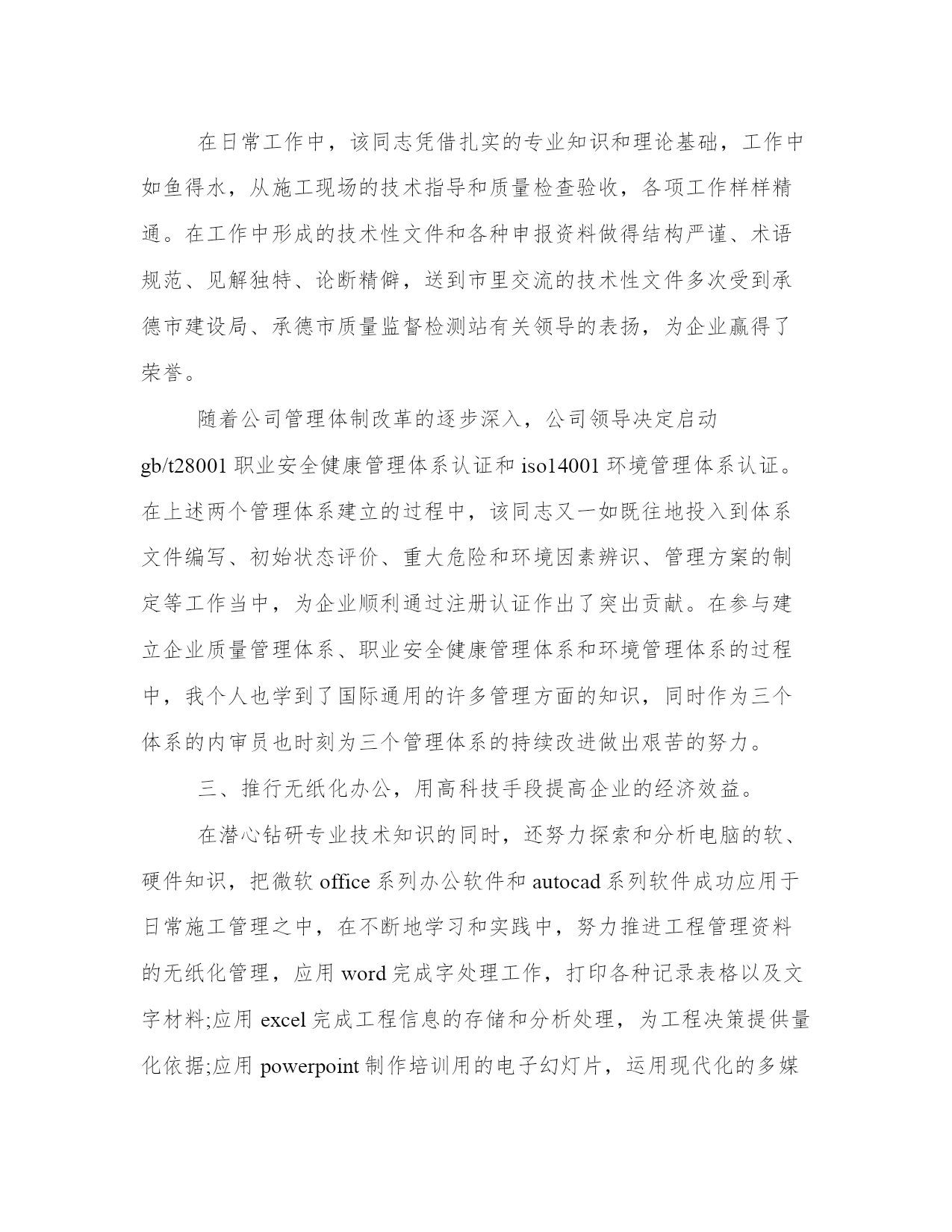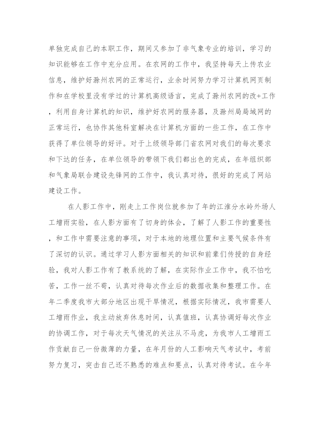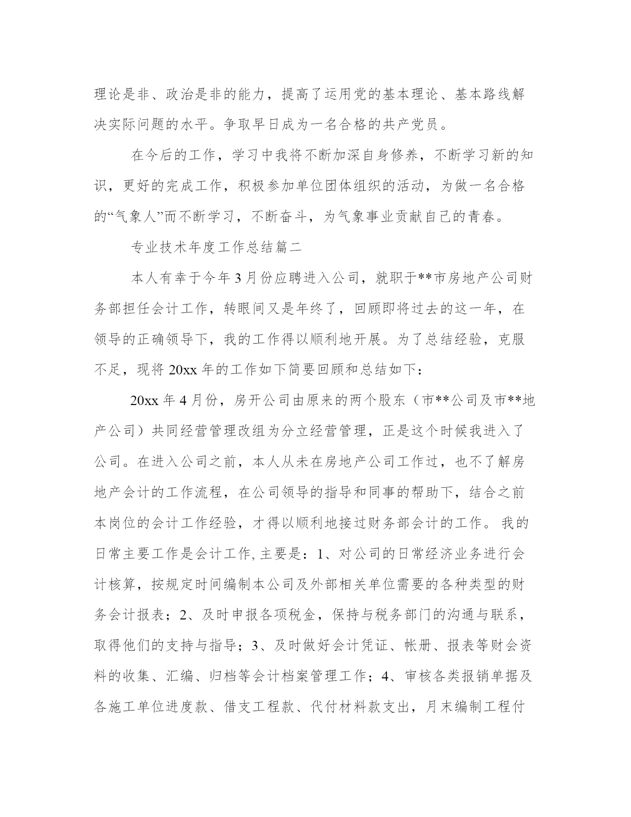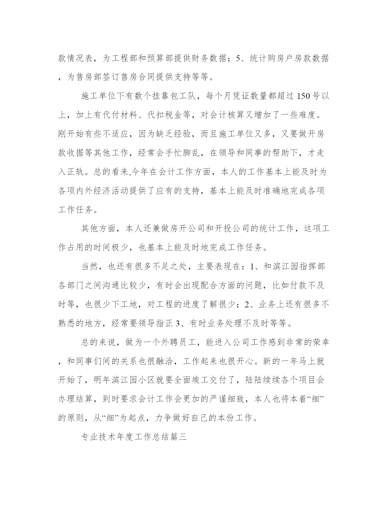 最新专业技术年度工作总结(大全14篇)对某一单位、某一部门工作进行全面性总结,既反映工作的概况,取得的成绩,存在的问题、缺点,也要写经验教训和今后如何改进的意见等。那么,我们该怎么写总结呢?下面是小编整理的个人今后的总结范文,欢迎阅读分享,希望对大家有所帮助。专业技术年度工作总结篇一我自年月分在市气象局参加工作以来,以近年时间,在这一年的实习期中,我不断加深个人方面的学习,认真工作,努力学习新的知识,为更好的胜任这份工作而加倍努力。在学习中,我深知自己所学专业不是气象专业,在工作中会用困难,所以我不断学习气象知识,有难题就向前辈们请教。更抓住在年非气象专业学习的机会,不断摄取气象知识,上课认真听讲,不迟到不早退,遵守学校纪律和单位纪律,认真对待每次考核。课后自学与气象专业相联系的相关知识。也很热爱班级小集体,维护班级荣誉,积极参加班级组织的活动。在学习结束时,我获得了“优秀学员”的称号。但我深知自己所学的知识还很肤浅,在日后工作中我将加倍学习,用知识武装自己,更好的完成组织和单位交予的任务。在工作中,参加工作以来,在滁州市气象局农网中心和人影办实习,刚刚走出校门的我刚实习时对业务工作很不熟悉,在单位领导和前辈们,孜孜不倦的教导和指教下,我逐渐能够胜任岗位工作,能够单独完成自己的本职工作,期间又参加了非气象专业的培训,学习的知识能够在工作中充分应用。在农网的工作中,我坚持每天上传农业信息,维护好滁州农网的正常运行,业余时间努力学习计算机网页制作和在学校里没有学过的计算机高级语言,完成了滁州农网的改+工作,利用自身计算机的知识,维护好农网的服务器,及滁州局局域网的正常运行,也协作其他科室解决在计算机方面的一些工作,在工作中获得了单位领导的好评。对于上级领导部门省农网对我们的每次要求和下达的任务,在单位领导的带领下我们都出色的完成,在年组织部和气象局联合建设先锋网的工作中,我认真对待,很好的完成了网站建设工作。在人影工作中,刚走上工作岗位就参加了年的江淮分水岭外场人工增雨实验,在人影方面有了切身的体会,了解了人影工作的重要性,和工作中需要注意的事项,对于本地的地理位置和主要气候条件有了深切的认识。通过学习人影方面相关的知识和前辈们传授的自身经验,我对人影工作有了教系统的了解,在实际作业工作中,我不怕吃苦,工作一丝不苟,认真对待每次作业后的数据收集和整理工作。在年二季度我市大部分地区出现干旱情况,根据实际情况,我市需要人工增雨作业,我主动放弃休息时间,认真值班,认真协调好每次作业的协调工作,对于每次天气情况的关注从不马虎,为我市人工增雨工作贡献自己一份微薄的力量,在年月份的人工影响天气考试中,考前努力复习,突击自己还不熟悉的难点和要点,认真对待考试。在今年的江淮分水岭外场实验中,我将继续发挥不怕吃苦的精神,认真对待每次作业。诚然由于参加工作时间还比较短,在工作中我处理有些事务的方法还很不成熟,对于突发事件的应变能力还很欠缺,我将在日后的工作中不断磨练自己。在思想上,由于自身是非气象专业毕业的学生,单位领导和组织多次找我谈话,我认清的思想路线,热爱气象,贡献气象是我的理念,无论何时都不动摇,在单位党组织每次的会议中我都积极参加,认真听讲,坚持向党组织汇报自己的思想情况和工作情况。作为预备党员的我,更要发挥老一代人的优良作风,扎实肯干,努力学习。对一名中共党员来说,最重要的还是要认真学习马克思列宁主义、毛泽东思想、邓小平理论和党的基本知识,不断提高自己的共产主义觉悟,不断提高自己的政治素质、业务素质和工作能力。在学习过程中,我坚持理论联系实际,把改造客观世界与改造主观世界结合起来,真正按照jzm同志所要求的:"在解决世界观、人生观、价值观问题上下功夫,在实践中不断坚定自己的信仰、志向,锤炼自己的意志、品质,真正养成共产党人的高风亮节"。一年来,我不断认真学习马列主义、毛泽东思想和邓小平理论及自然科学知识,用理论、用知识武装头脑、指导实践,始终以饱满的政治热情、积极的工作态度为实现崇高理想而坚持不懈地努力。通过学习,我更加坚定了自己的政治方向和政治立场,牢固地树立正确的世界观、人生观和价值观,掌握了观察事物的科学方法,增强了分辨理论是非、政治是非的能力,提高了运用党的基本理论、基本路线解决实际问题的水平。争取早日成为一名合格的共产党员。在今后的工作,学习中我将不断加深自身修养,不断学习新的知识,更好的完成工作,积极参加单位团体组织的活动,为做一名合格的“气象人”而不断学习,不断奋斗,为气象事业贡献自己的青春。专业技术年度工作总结篇二本人有幸于今年3月份应聘进入公司,就职于**市房地产公司财务部担任会计工作,转眼间又是年终了,回顾即将过去的这一年,在领导的正确领导下,我的工作得以顺利地开展。为了总结经验,克服不足,现将