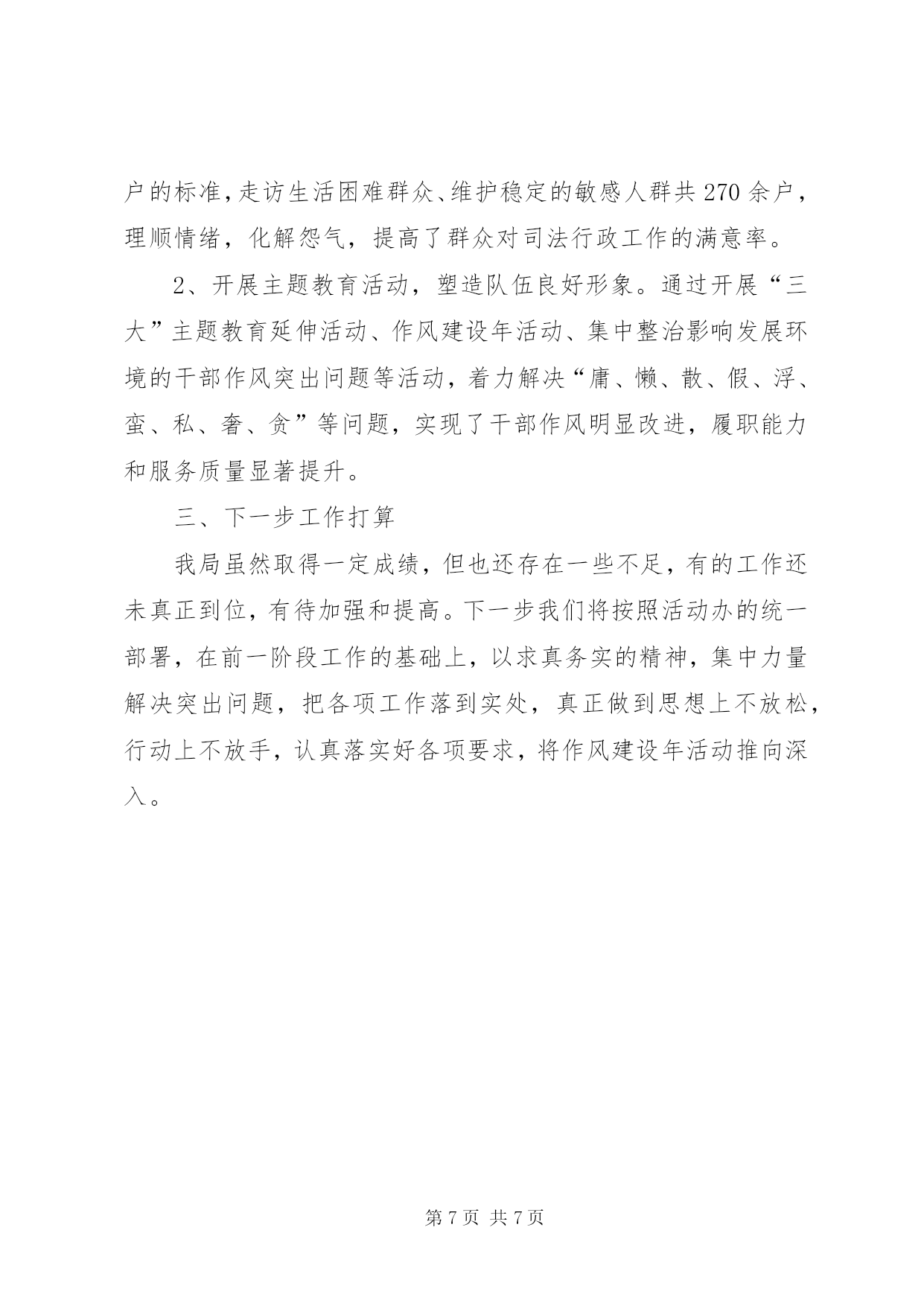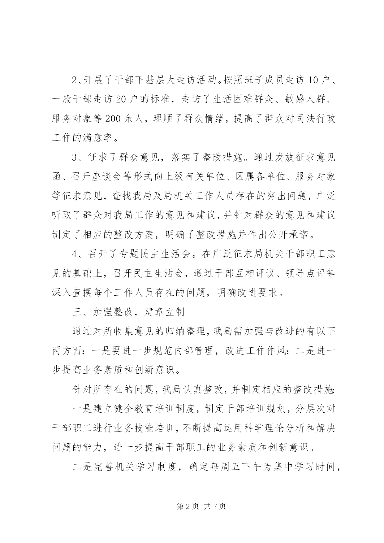 第PAGE\*Arabic\*MERGEFORMAT7页共NUMPAGES\*MERGEFORMAT7页司法局作风建设整改汇报2篇第一篇根据区委、区政府的统一部署,我局自2012年3月份起进入作风建设年自查自纠阶段。在这个阶段中,我局通过各种形式和渠道,广泛征求意见和建议,认真查找存在的问题和不足,并结合实际,深入剖析,制定落实了整改方案,确保活动取得实效。现将第二阶段工作小结如下:一、思想重视,动员及时自查自纠阶段是作风建设年活动的一个重要环节,只有切实找准、找实存在的问题和不足,才能明确前进的方向,才能使整个工作更完善,作风更深入,才能使工作效率更高,才能真正实现活动的目标。因此,我局对这一阶段予以高度重视,一方面及时召开全局会议,进行了动员,增强机关干部对做好这个阶段工作重要性的认识;另一方面及时进行研究部署,确保准备充分,工作及时,目标明确,进展顺利。二、认真查摆,切实整改1、全面开展了个人自查。要求全体机关干部职工认真对照《区司法局作风建设年暨集中整治影响发展环境的干部作风突出问题活动实施方案》(吉区司发〔2012〕2号)指出的干部作风十项突出问题,找准问题,认真查摆,并将自查情况形成自查报告上交。2、开展了干部下基层大走访活动。按照班子成员走访10户、一般干部走访20户的标准,走访了生活困难群众、敏感人群、服务对象等200余人,理顺了群众情绪,提高了群众对司法行政工作的满意率。3、征求了群众意见,落实了整改措施。通过发放征求意见函、召开座谈会等形式向上级有关单位、区属各单位、服务对象等征求意见,查找我局及局机关工作人员存在的突出问题,广泛听取了群众对我局工作的意见和建议,并针对群众的意见和建议制定了相应的整改方案,明确了整改措施并作出公开承诺。4、召开了专题民主生活会。在广泛征求局机关干部职工意见的基础上,召开民主生活会,通过干部互相评议、领导点评等深入查摆每个工作人员存在的问题,明确改进要求。三、加强整改,建章立制通过对所收集意见的归纳整理,我局需加强与改进的有以下两方面:一是要进一步规范内部管理,改进工作作风;二是进一步提高业务素质和创新意识。针对所存在的问题,我局认真整改,并制定相应的整改措施:一是建立健全教育培训制度,制定干部培训规划,分层次对干部职工进行业务技能培训,不断提高运用科学理论分析和解决问题的能力,进一步提高干部职工的业务素质和创新意识。二是完善机关学习制度,确定每周五下午为集中学习时间,由机关各股(室)轮流主持,开展政治思想理论学习和司法业务知识学习。通过自查自纠阶段活动的开展,我局党员干部履行职责、服务群众意识进一步增强,工作作风进一步转变,干部队伍素质进一步提高,服务进一步提升,局机关的凝聚力、战斗力得到进一步的加强。下一步,我们将继续深入开展作风建设年活动,积极拓宽投诉渠道,接受群众监督,加强监督检查,对发现的问题及时予以纠正,把活动的成果转化为加强干部作风建设的长效机制,确保活动取得真正实效。第二篇根据区作风建设年活动办公室的统一部署,我局对作风建设年活动开展情况进行了认真自查,现将自查情况汇报如下:一、加强领导,周密部署按照区委统一部署,我局深入扎实地开展了作风建设年自查自纠活动。在充分动员部署、深刻自查的基础上,通过走访、召开座谈会、发放征求意见函等多种形式,广泛深入地征求各方面对我区司法行政工作作风建设的意见和建议。在广泛征求意见的基础上,召开了局专题民主生活会,通过干部互相评议、领导点评等深入查摆问题,明确改进要求。实事求是地查找作风建设等存在的突出问题,并制定相应的整改方案,明确整改措施,公开服务承诺,接受群众监督。二、主要工作成效(一)法制宣传教育工作。继续开展“法律六进”,大力宣传与改革发展、群众生产生活、社会和谐稳定密切相关的法律法规,重点就土地征用、拆迁安置、优化环境、安全生产等容易引发社会矛盾的领域,有针对性地组织开展专题宣传教育活动,印制了四万份《吉州区公民法律法规简明知识手册》准备予以发放。参与了政法委牵头组织的综治宣传月活动,制作了宣传展板,指定专人参与活动,宣传公证、法律援助等司法行政有关知识。配合市司法局、市妇联、区妇联在城北德邦广场开展“践行雷锋精神,百万巾帼志愿者在行动”活动发放宣传资料1500余份,发放法律援助便民卡500余张。(二)基层基础工作1、司法所建设工作。全区11个乡镇、街道司法所所长均已配齐,对因调动出缺的3个副科级司法所长职位,经过全区公开选拔领导干部考试,已确定人选,6月初将到位。2、人民调解工作。围绕党委、政府中心工作,积极介入群众来访接待和矛盾纠纷调处工作,安排了一批政治素质高、业务能力强的干部参与我区的定期联合接访,配合我区中心工作的开展;加大矛盾纠纷集中排查化解力度。在全区各级人民调解组织中广泛开展了