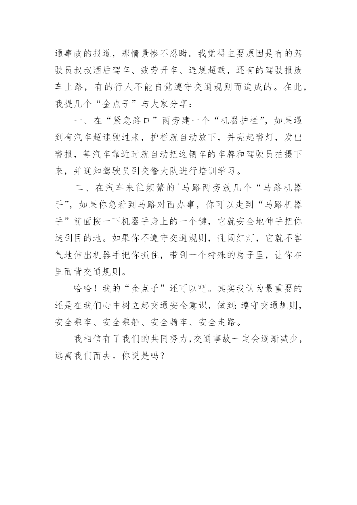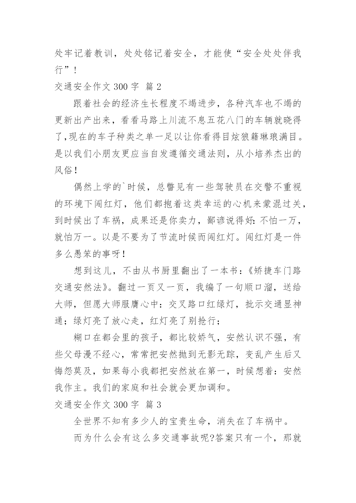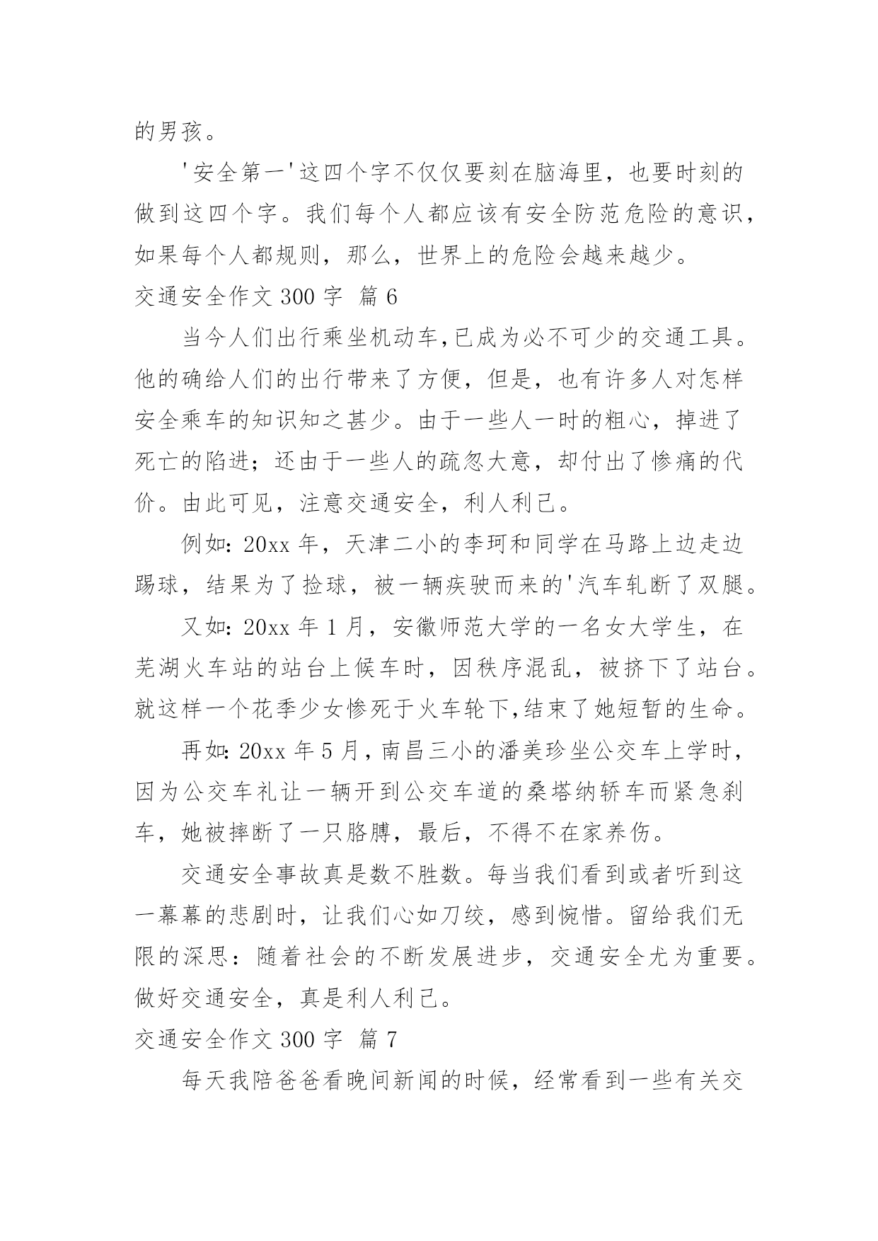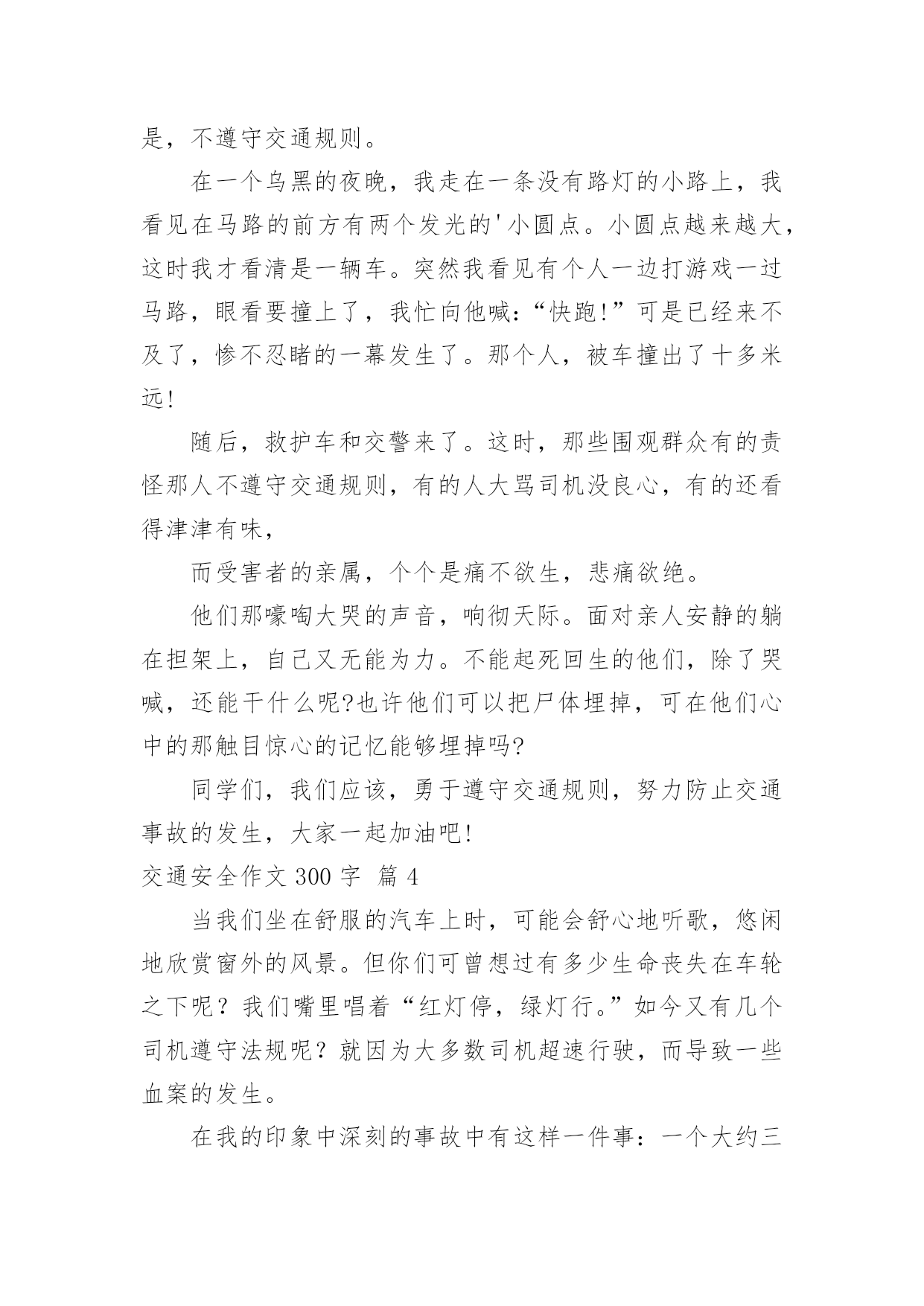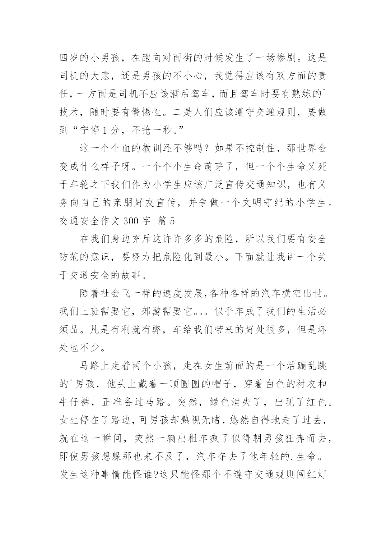 交通安全作文300字交通安全作文300字【共7篇】无论是在学校还是在社会中,大家一定都接触过作文吧,借助作文人们可以实现文化交流的目的。相信写作文是一个让许多人都头痛的问题,下面是小编收集整理的交通安全作文300字7篇,欢迎大家借鉴与参考,希望对大家有所帮助。交通安全作文300字篇1随着社会地发展,汽车成为人们出门必不可少的交通工具,然后它给人们带来了前所未有的方便。大家在享受它便利的同时,也给我们带来了灾难:前一秒还生龙活虎的人,后一秒就消失在飞驰而来的车轮下,带走了原先美满快乐的家庭,给我们许多惨痛的.教训。多少鲜活的生命,在这些庞然大物的车轮下丧生,然后又有多少起车祸,是源自于一些不规范的大型工程车。有的大型工程车司机,为了抢时间,为了多赚钱,无视交通法规,不顾行人安全,横冲直撞。被撞的人,轻则受伤,重则死亡,场面惨不忍睹。这样的杯具不知重演过多少次,多少人因此失去生命,多少家庭因此支离破碎,多少亲人从此陷入无尽的痛苦之中。多么惨痛的教训啊!真的期望这样的杯具不要再发生了。在此,我要提醒大家,不管你是走路的,骑车的,还是开车的,都要格外留意,都要自觉遵守交通法规。个性是那些开车的司机们,请你们提高警惕,礼貌开车。只有心中处处牢记着教训,处处铭记着安全,才能使“安全处处伴我行”!交通安全作文300字篇2跟着社会的经济生长程度不竭进步,各种汽车也不竭的更新出产出来,看看马路上川流不息五花八门的车辆就晓得了,现在的车子种类之单一足以让你看得目炫狼籍琳琅满目。是以我们小朋友更应当自发遵循交通法则,从小培养杰出的风俗!偶然上学的`时候,总瞥见有一些驾驶员在交警不重视的环境下闯红灯,他们都抱着这类幸运的心机来蒙混过关,到时候出了车祸,成果还是你卖力,鄙谚说得好:不怕一万,就怕万一。以是不要为了节流时候而闯红灯。闯红灯是一件多么愚笨的事呀!想到这儿,不由从书厨里翻出了一本书:《矫捷车门路交通安然法》。翻过一页又一页,我编了一句顺口溜,送给大师,但愿大师服膺心中:交叉路口红绿灯,批示交通显神通;绿灯亮了放心走,红灯亮了别抢行;糊口在都会里的孩子,都比较娇气,安然认识不强,有些父母漫不经心,常常把安然抛到无影无踪,变乱产生后又悔怨莫及,如果每小我都把安然放在第一,时候想着:安然我作主。我们的家庭和社会就会更加调和。交通安全作文300字篇3全世界不知有多少人的宝贵生命,消失在了车祸中。而为什么会有这么多交通事故呢?答案只有一个,那就是,不遵守交通规则。在一个乌黑的夜晚,我走在一条没有路灯的小路上,我看见在马路的前方有两个发光的'小圆点。小圆点越来越大,这时我才看清是一辆车。突然我看见有个人一边打游戏一过马路,眼看要撞上了,我忙向他喊:“快跑!”可是已经来不及了,惨不忍睹的一幕发生了。那个人,被车撞出了十多米远!随后,救护车和交警来了。这时,那些围观群众有的责怪那人不遵守交通规则,有的人大骂司机没良心,有的还看得津津有味,而受害者的亲属,个个是痛不欲生,悲痛欲绝。他们那嚎啕大哭的声音,响彻天际。面对亲人安静的躺在担架上,自己又无能为力。不能起死回生的他们,除了哭喊,还能干什么呢?也许他们可以把尸体埋掉,可在他们心中的那触目惊心的记忆能够埋掉吗?同学们,我们应该,勇于遵守交通规则,努力防止交通事故的发生,大家一起加油吧!交通安全作文300字篇4当我们坐在舒服的汽车上时,可能会舒心地听歌,悠闲地欣赏窗外的风景。但你们可曾想过有多少生命丧失在车轮之下呢?我们嘴里唱着“红灯停,绿灯行。”如今又有几个司机遵守法规呢?就因为大多数司机超速行驶,而导致一些血案的发生。在我的印象中深刻的事故中有这样一件事:一个大约三四岁的小男孩,在跑向对面街的时候发生了一场惨剧。这是司机的大意,还是男孩的不小心,我觉得应该有双方面的责任,一方面是司机不应该酒后驾车,而且驾车时要有熟练的`技术,随时要有警惕性。二是人们应该遵守交通规则,要做到“宁停1分,不抢一秒。”这一个个血的教训还不够吗?如果不控制住,那世界会变成什么样子呀。一个个小生命萌芽了,但一个个生命又死于车轮之下我们作为小学生应该广泛宣传交通知识,也有义务向自己的亲朋好友宣传,并争做一个文明守纪的小学生。交通安全作文300字篇5在我们身边充斥这许许多多的危险,所以我们要有安全防范的意识,要努力把危险化到最小。下面就让我讲一个关于交通安全的故事。随着社会飞一样的速度发展,各种各样的汽车横空出世。我们上班需要它,郊游需要它。。。似乎车成了我们的生活必须品。凡是有利就有弊,车给我们带来的好处很多,但是坏处也不少。马路上走着两个小孩,走在女生前面的是一个活蹦乱跳的'男孩,他头上戴着一顶圆圆的帽子,穿着白色的衬衣和牛仔裤,正准备过马路。突然,绿色消失了,出现了红色。女生停在了路边,可男孩却熟视无睹,悠然自得地走了过去,就