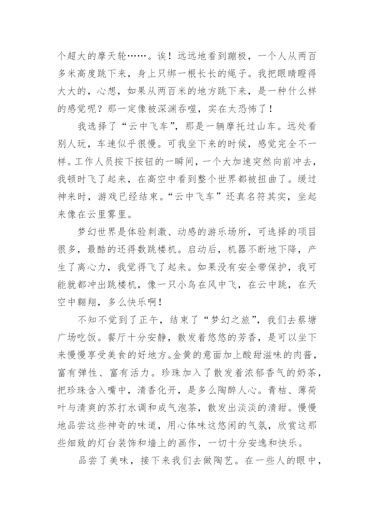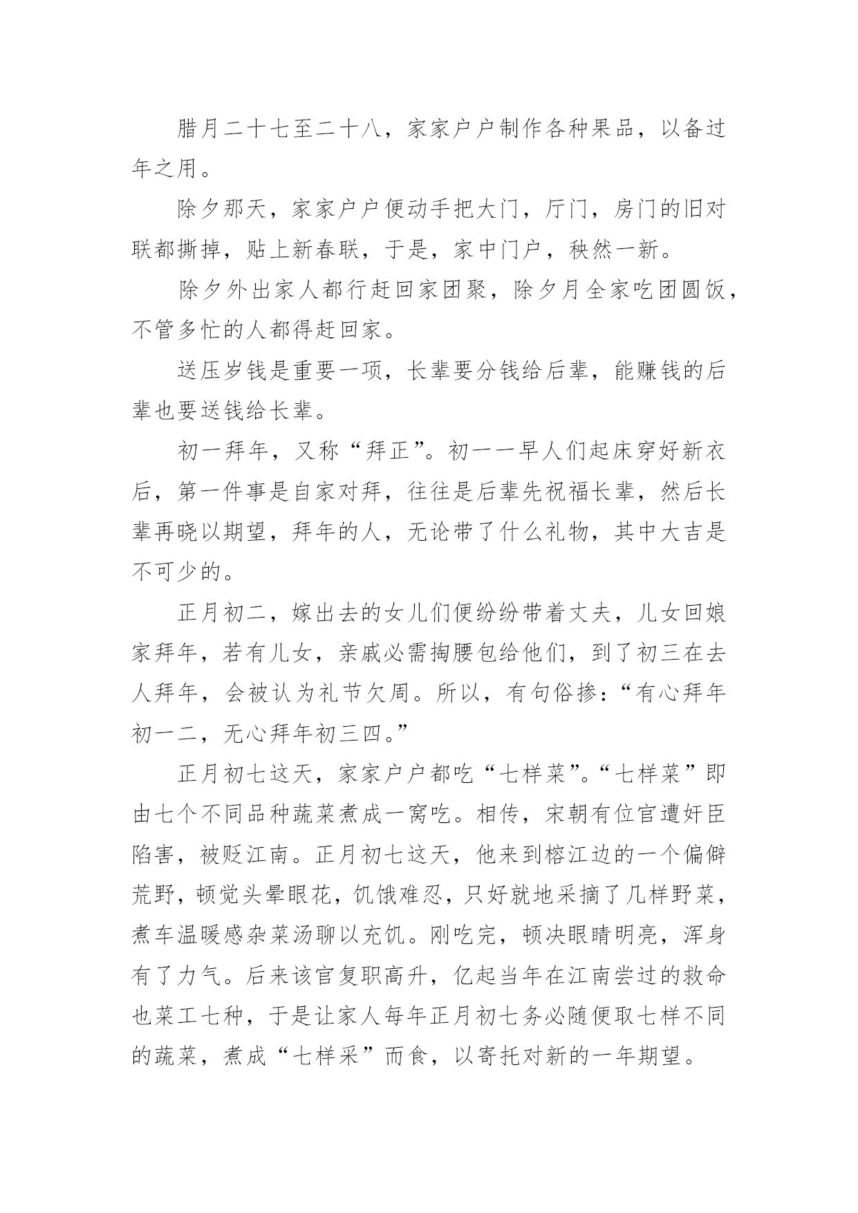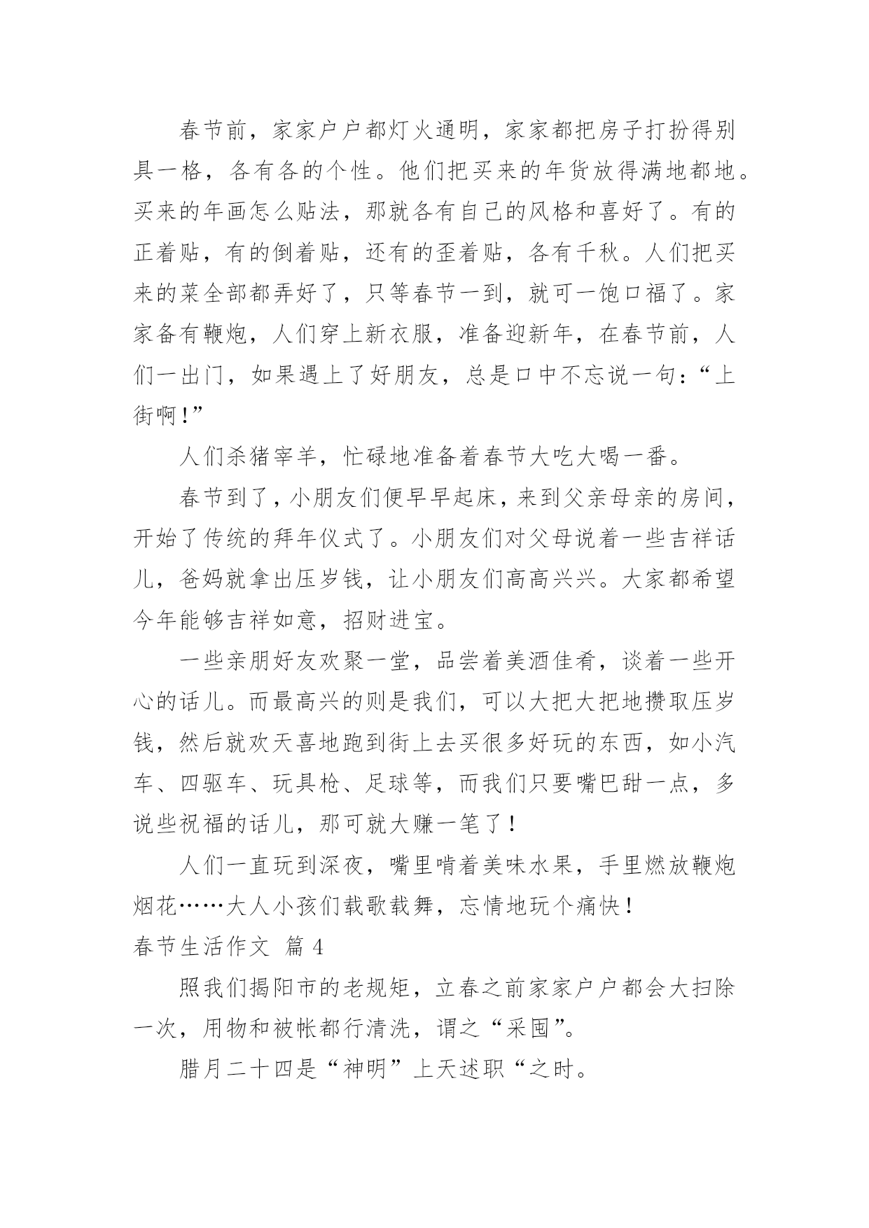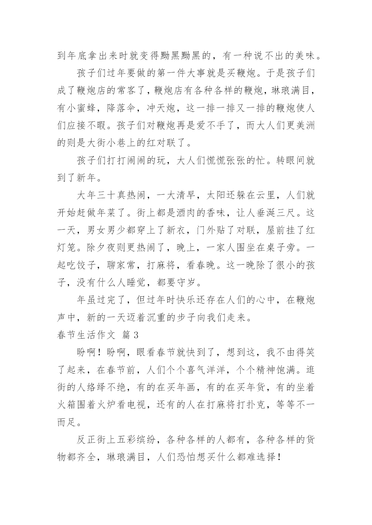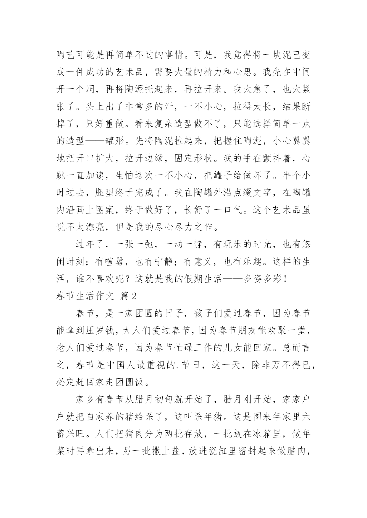 春节生活作文【必备】春节生活作文四篇在平时的学习、工作或生活中,大家都经常看到作文的身影吧,作文是一种言语活动,具有高度的综合性和创造性。相信写作文是一个让许多人都头痛的问题,下面是小编收集整理的春节生活作文4篇,欢迎阅读,希望大家能够喜欢。春节生活作文篇1今天是正月初四,清晨,从睡梦中醒来,忽然,听到窗外鸟儿十分高亢的鸣叫声,它彷佛催促我起床。我再也睡不着了。恰好第一缕晨光透过了窗户,照射到桌上,就像一只手把我从被窝里揪了起来。此时,我想起了一个约定,今天要和好友谢佳昕一起去观音山游乐场玩。一想到向往已久的“梦幻世界”,我立即脱“困”了,刷牙、洗脸、吃早餐,很快做好了出发前的一切准备工作。我们乘车前往观音山,路上行人和车辆熙熙攘攘,只看到路边的树木和楼房,没有往常的拥堵,马路好像比平时宽敞了许多,也十分幽静。驱车速度真快!将近半个小时,就到达目的地——观音山梦幻世界。我下车张望了一下,这里景象与路上完全是两个天地,道路两旁停满小车,售票处挤满了人,广场上,小孩和大人堆在一起。有的摆pose拍照,有的看地图研究游玩攻略,有的跑来跑去,有的打打闹闹。梦幻世界想必很好玩,才吸引了这么多人!游乐设施真多啊,有跳楼机、大摆锤、过山车,还有一个超大的摩天轮……。诶!远远地看到蹦极,一个人从两百多米高度跳下来,身上只绑一根长长的绳子。我把眼睛瞪得大大的,心想,如果从两百米的地方跳下来,是一种什么样的感觉呢?那一定像被深渊吞噬,实在太恐怖了!我选择了“云中飞车”,那是一辆摩托过山车。远处看别人玩,车速似乎很慢。可我坐下来的时候,感觉完全不一样。工作人员按下按钮的一瞬间,一个大加速突然向前冲去,我顿时飞了起来,在高空中看到整个世界都被扭曲了。缓过神来时,游戏已经结束。“云中飞车”还真名符其实,坐起来像在云里雾里。梦幻世界是体验刺激、动感的游乐场所,可选择的项目很多,最酷的还得数跳楼机。启动后,机器不断地下降,产生了离心力,我觉得飞了起来。如果没有安全带保护,我可能就都冲出跳楼机,像一只小鸟在风中飞,在云中跳,在天空中翱翔,多么快乐啊!不知不觉到了正午,结束了“梦幻之旅”,我们去蔡塘广场吃饭。餐厅十分安静,散发着悠悠的芳香,是可以坐下来慢慢享受美食的好地方。金黄的意面加上酸甜滋味的肉酱,富有弹性、富有活力。珍珠加入了散发着浓郁香气的奶茶,把珍珠含入嘴中,清香化开,是多么陶醉人心。青桔、薄荷叶与清爽的苏打水调和成气泡茶,散发出淡淡的清甜。慢慢地品尝这些神奇的味道,用心体味这悠闲的气氛,欣赏这那些细致的灯台装饰和墙上的画作,一切十分安逸和快乐。品尝了美味,接下来我们去做陶艺。在一些人的眼中,陶艺可能是再简单不过的事情。可是,我觉得将一块泥巴变成一件成功的艺术品,需要大量的精力和心思。我先在中间开一个洞,再将陶泥托起来,再拉开来。我太急了,也太紧张了。头上出了非常多的汗,一不小心,拉得太长,结果断掉了,只好重做。看来复杂造型做不了,只能选择简单一点的造型——罐形。先将陶泥拉起来,把握住陶泥,小心翼翼地把开口扩大,拉开边缘,固定形状。我的手在颤抖着,心跳一直加速,生怕这次一不小心,把罐子给做坏了。半个小时过去,胚型终于完成了。我在陶罐外沿点缀文字,在陶罐内沿画上图案,终于做好了,长舒了一口气。这个艺术品虽说不太漂亮,但是我的尽心尽力之作。过年了,一张一弛,一动一静,有玩乐的时光,也有悠闲时刻;有喧嚣,也有宁静;有意义,也有乐趣。这样的生活,谁不喜欢呢?这就是我的假期生活——多姿多彩!春节生活作文篇2春节,是一家团圆的日子,孩子们爱过春节,因为春节能拿到压岁钱,大人们爱过春节,因为春节朋友能欢聚一堂,老人们爱过春节,因为春节忙碌工作的儿女能回家。总而言之,春节是中国人最重视的.节日,这一天,除非万不得已,必定赶回家走团圆饭。家乡有春节从腊月初旬就开始了,腊月刚开始,家家户户就把自家养的猪给杀了,这叫杀年猪。这是图来年家里六蓄兴旺。人们把猪肉分为两批存放,一批放在冰箱里,做年菜时再拿出来,另一批撒上盐,放进瓷缸里密封起来做腊肉,到年底拿出来时就变得黝黑黝黑的,有一种说不出的美味。孩子们过年要做的第一件大事就是买鞭炮。于是孩子们成了鞭炮店的常客了,鞭炮店有各种各样的鞭炮,琳琅满目,有小蜜蜂,降落伞,冲天炮,这一排一排又一排的鞭炮使人们应接不暇。孩子们对鞭炮再是爱不手了,而大人们更美洲的则是大街小巷上的红对联了。孩子们打打闹闹的玩,大人们慌慌张张的忙。转眼间就到了新年。大年三十真热闹,一大清早,太阳还躲在云里,人们就开始赶做年菜了。街上都是酒肉的香味,让人垂涎三尺。这一天,男女男少都穿上了新衣,门外贴了对联,屋前挂了红灯笼。除夕夜则更热闹了,晚上,一家人围坐在桌子旁。一起吃饺子,聊家常,打麻将,看春晚。这一晚除了很小的孩子,没有什么人睡觉,都要守岁。年虽过