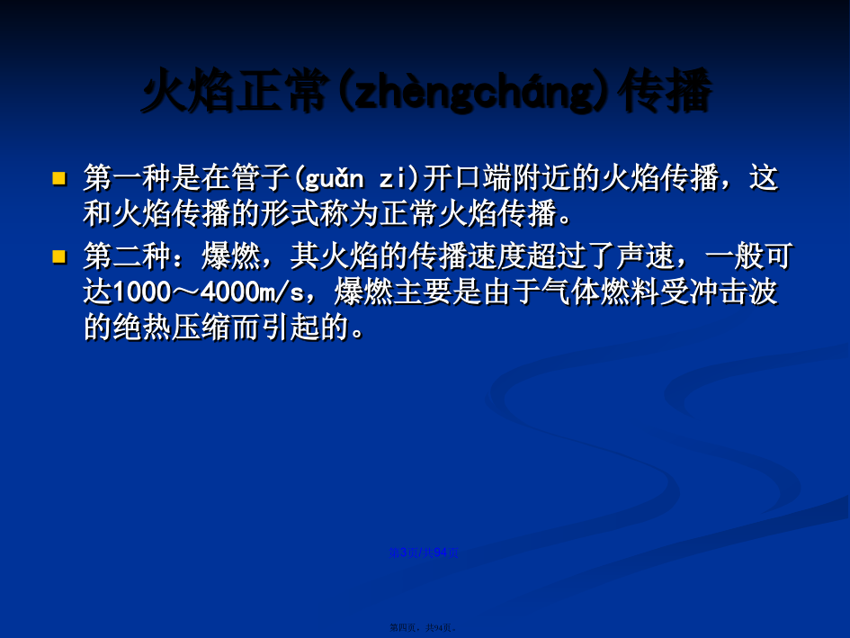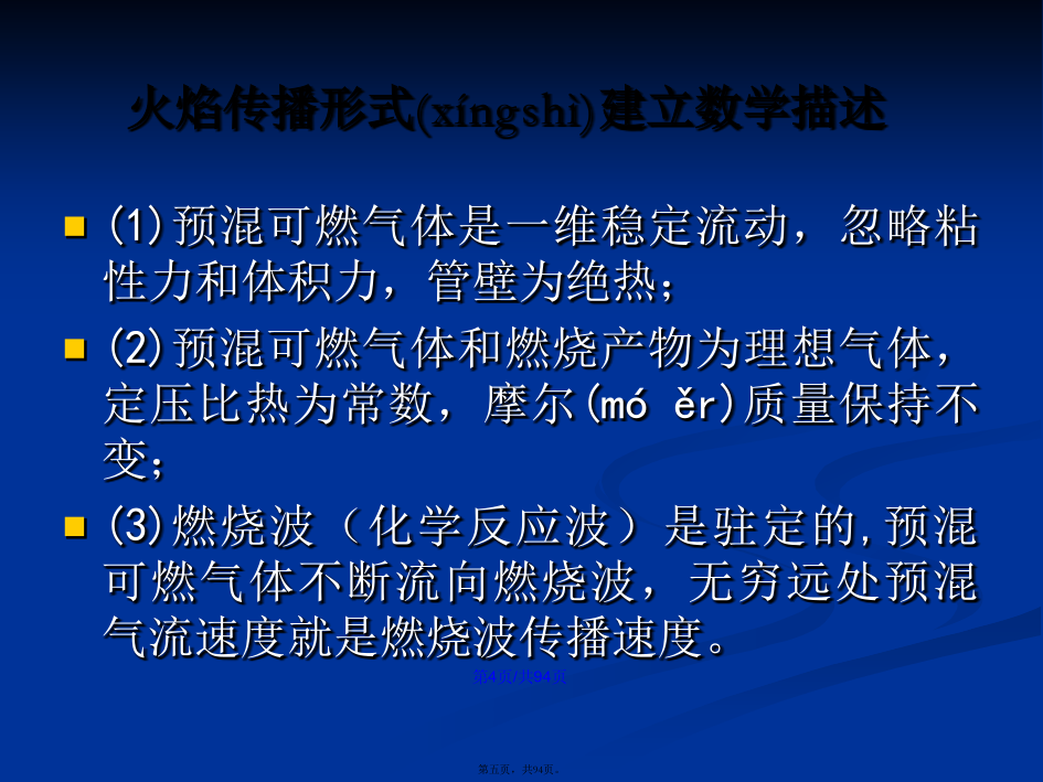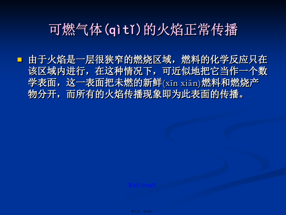 会计学//火焰正常(zhèngcháng)传播火焰传播形式(xíngshì)建立数学描述图3-2雨果(yǔɡuǒ)尼特(Hugoniot)方程火焰(huǒyàn)的定义可燃气体(qìtǐ)的火焰正常传播图3-3火焰(huǒyàn)正常传播火焰(huǒyàn)传播速度本生灯测量(cèliáng)火焰传播速度/图3-5本生灯的火焰(huǒyàn)前沿图3-6本生灯的火焰(huǒyàn)内锥表面/可燃气体和空气混合物在20及760厘米水银柱下的火焰(huǒyàn)前沿移动的正常速度值研究火焰(huǒyàn)正常传播的理论的目的,就是为了找到层流火焰(huǒyàn)速度uH。火焰正常扩张(kuòzhāng)的理论用于简化(jiǎnhuà)近似分析的热理论/数学模型结论结论捷尔道维奇等的分区(fēnqū)近似解法/结果火焰传播的精确(jīngquè)解法Tanford等的扩散(kuòsàn)理论假设层流(cénɡliú)火焰速度的表达式/层流(cénɡliú)火焰问题的数值求解方法Herimerl和Coffee计算的燃烧速度与Streng和Grosse的试验(shìyàn)值的比较//火焰(huǒyàn)正常传播速度影响火焰(huǒyàn)正常传播速度的主要因素过量(guò〃liàng)空气系数的影响/燃料(ránliào)化学结构的影响/添加剂的影响(yǐngxiǎng)/混合可燃物初始温度(wēndù)T0的影响//火焰(huǒyàn)温度的影响//压力(yālì)的影响/惰性(duòxìng)物质含量的影响//热扩散系数和比热(bǐrè)的影响/火焰(huǒyàn)传播界限/几种气体在与空气混合时的火焰(huǒyàn)传播浓度极限(在0.1MPa,20℃时火焰(huǒyàn)正常传播速度的测量火焰正常(zhèngcháng)传播速度的测量圆柱(yuánzhù)管法/定容球法肥皂泡法(定压法)此方法的一个明显不足是难于确定温度比Tu/Tb。虽然可以假定烟气(yānqì)具有理论火焰温度,但对比膨胀比的计算值与实测值,往往出现严重偏差。而且,由于计算中要用到肥皂泡半径的立方,所以必需很准确地知道肥皂泡的初始和最终尺寸,而实际上最终尺寸却难于精确测量。此外,还有一些其它问题:a用此法去研究干可燃物的火焰速度是不合适的,这是因为肥皂溶液的蒸发会使混合物变潮。b不可避免地会产生向电极的传热c.对于缓慢的燃烧,火焰锋面不可能保持球形,而且反应区会变厚。d.对于快速反应,由于火焰结构呈蜂窝状,火焰锋面不可能总是光滑的。粒子(lìzǐ)示踪法//平面(píngmiàn)火焰燃烧器法/可燃气体层流(cénɡliú)动力燃烧和扩散燃烧///6火焰(huǒyàn)稳定的基本原理和方法////火焰稳定的基本(jīběn)方法///////////
