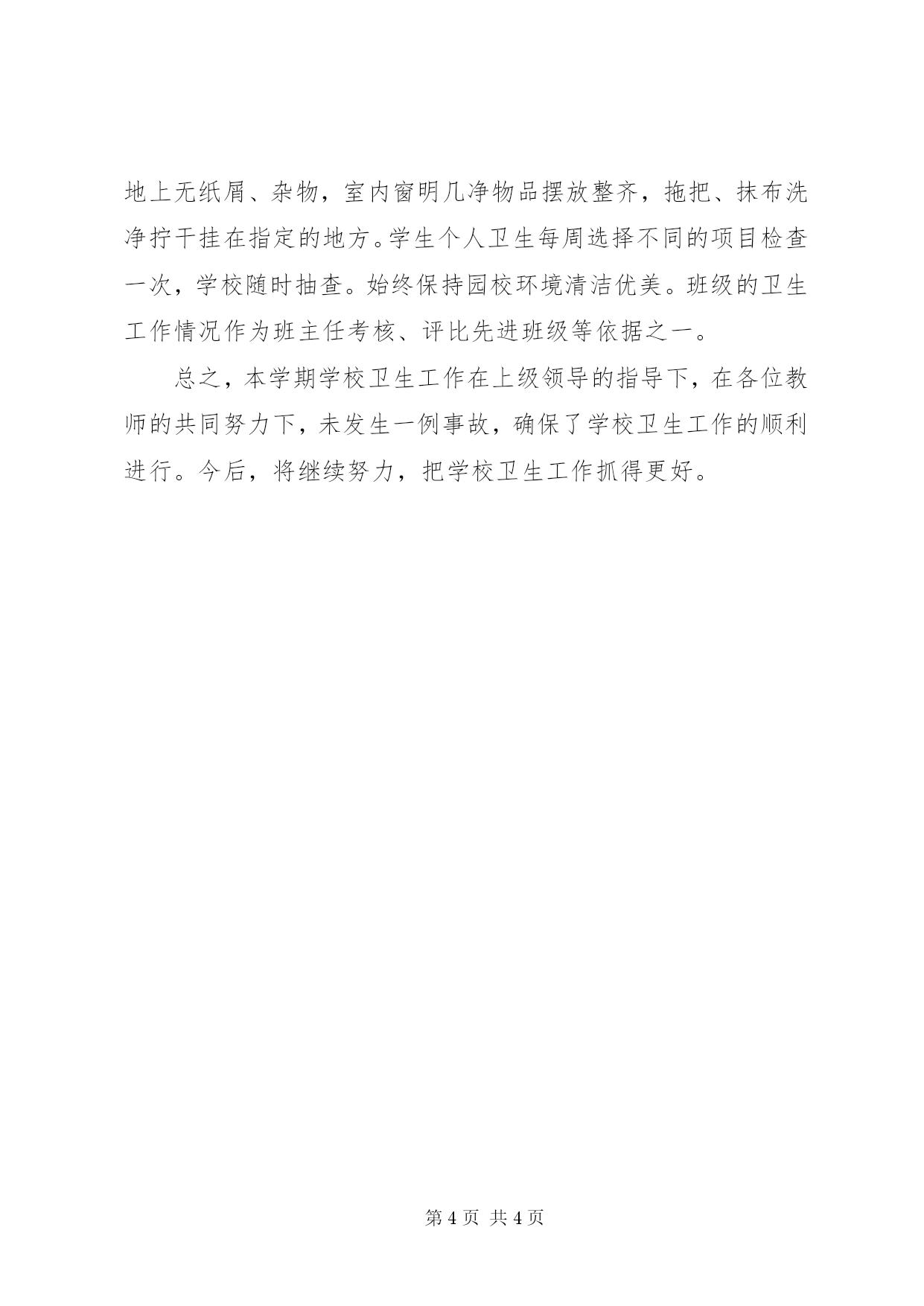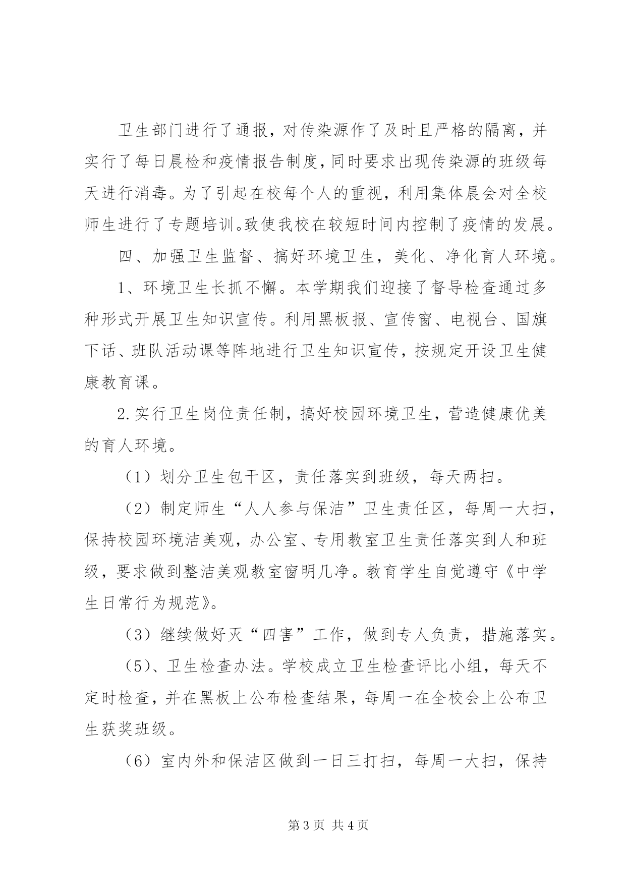 第PAGE\*Arabic\*MERGEFORMAT4页共NUMPAGES\*MERGEFORMAT4页学校环保卫生工作总结小编精心推荐环保工作总结|环保年度工作总结|环保年终工作总结|环保个人工作总结学校环保卫生工作总结为了全面贯彻党的教育方针和学校卫生工作条例,监测学生健康状况,对学生进行健康教育,培养学生良好的卫生习惯,改善学校的卫生环境和教学卫生条件,提高师生的健康水平,做好服务育人的工作,本学期做了如下工作:一、领导重视,管理规范、资金保障。学校卫生工作领导小组多次召开会议,就学校卫生工作要点和一些突发的重要工作及时布置安排,各部门各负其责,使学校卫生工作有了强大的支持力,另外学校还投入相当的资金用于添置常用器械和药品。二、积极开展健康教育活动,强化健康意识1、健康教育课纳入课表正常运行,做到有计划、有进度、授课认真,测试规范,并组织开展两次教研活动。2、有计划性、针对性地开展健康教育宣传,本学期共开展健康教育讲座三次,黑板报宣传二次,画廊宣传牌二块,横幅宣传一次。3、开展健康知识宣传活动,做好学生预防接种及师生常见病的防治工作。教育学生注意用眼卫生,认真做好眼保健操和广播操;加强个人卫生教育,进行个人卫生习惯抽查,以养成讲卫生光荣,不卫生耻辱的新风尚。对学生进行一次健康体检,建立健康档案。做好青春期卫生知识宣教,开展卫生知识专题讲座。班主任及任课老师辅导、督促学生勤剪指甲,勤洗手、正确做好广播操和眼保健操。三、健康监督,疾病防治1、体检工作有条不紊,组织学生参加一年一度的学生体检工作,做到准备充分,秩序井然,顺利完成任务,体检结束后,认真做好近视眼、沙眼、龋齿、寄生虫营养不良等常见病及传染病的防治工作,做好资料的统计汇总。2、防近工作持之以恒,本学期九月份的防近周我们进行了专题防近讲座和横幅宣传,给每位视力低下的学生发了一份“爱眼、护眼”家校联系卡,家校结合共同防治近视。校医室与政教处联手定期检查学生眼保健操,读写姿势,并组织全体教师学习教学卫生要求,在课教学中关心每个学生的生长发育,身心健康。3、传染病防治细致扎实,秋冬季是许多呼吸道传染病的好发时期,流感和其它呼吸道传染病都有可能因为气温的急剧变化而出现反季节流行。为了抵御任何传染病的侵袭,我们严守把关,通过发放学生每天病缺登记表来密切关注学生身体状况,以便能随时起动传染应急预案。本学期12月,我校断断续续出现了几例“水痘患者”,我们在第一时间内向上级卫生部门进行了通报,对传染源作了及时且严格的隔离,并实行了每日晨检和疫情报告制度,同时要求出现传染源的班级每天进行消毒。为了引起在校每个人的重视,利用集体晨会对全校师生进行了专题培训。致使我校在较短时间内控制了疫情的发展。四、加强卫生监督、搞好环境卫生,美化、净化育人环境。1、环境卫生长抓不懈。本学期我们迎接了督导检查通过多种形式开展卫生知识宣传。利用黑板报、宣传窗、电视台、国旗下话、班队活动课等阵地进行卫生知识宣传,按规定开设卫生健康教育课。2.实行卫生岗位责任制,搞好校园环境卫生,营造健康优美的育人环境。(1)划分卫生包干区,责任落实到班级,每天两扫。(2)制定师生“人人参与保洁”卫生责任区,每周一大扫,保持校园环境洁美观,办公室、专用教室卫生责任落实到人和班级,要求做到整洁美观教室窗明几净。教育学生自觉遵守《中学生日常行为规范》。(3)继续做好灭“四害”工作,做到专人负责,措施落实。(5)、卫生检查办法。学校成立卫生检查评比小组,每天不定时检查,并在黑板上公布检查结果,每周一在全校会上公布卫生获奖班级。(6)室内外和保洁区做到一日三打扫,每周一大扫,保持地上无纸屑、杂物,室内窗明几净物品摆放整齐,拖把、抹布洗净拧干挂在指定的地方。学生个人卫生每周选择不同的项目检查一次,学校随时抽查。始终保持园校环境清洁优美。班级的卫生工作情况作为班主任考核、评比先进班级等依据之一。总之,本学期学校卫生工作在上级领导的指导下,在各位教师的共同努力下,未发生一例事故,确保了学校卫生工作的顺利进行。今后,将继续努力,把学校卫生工作抓得更好。