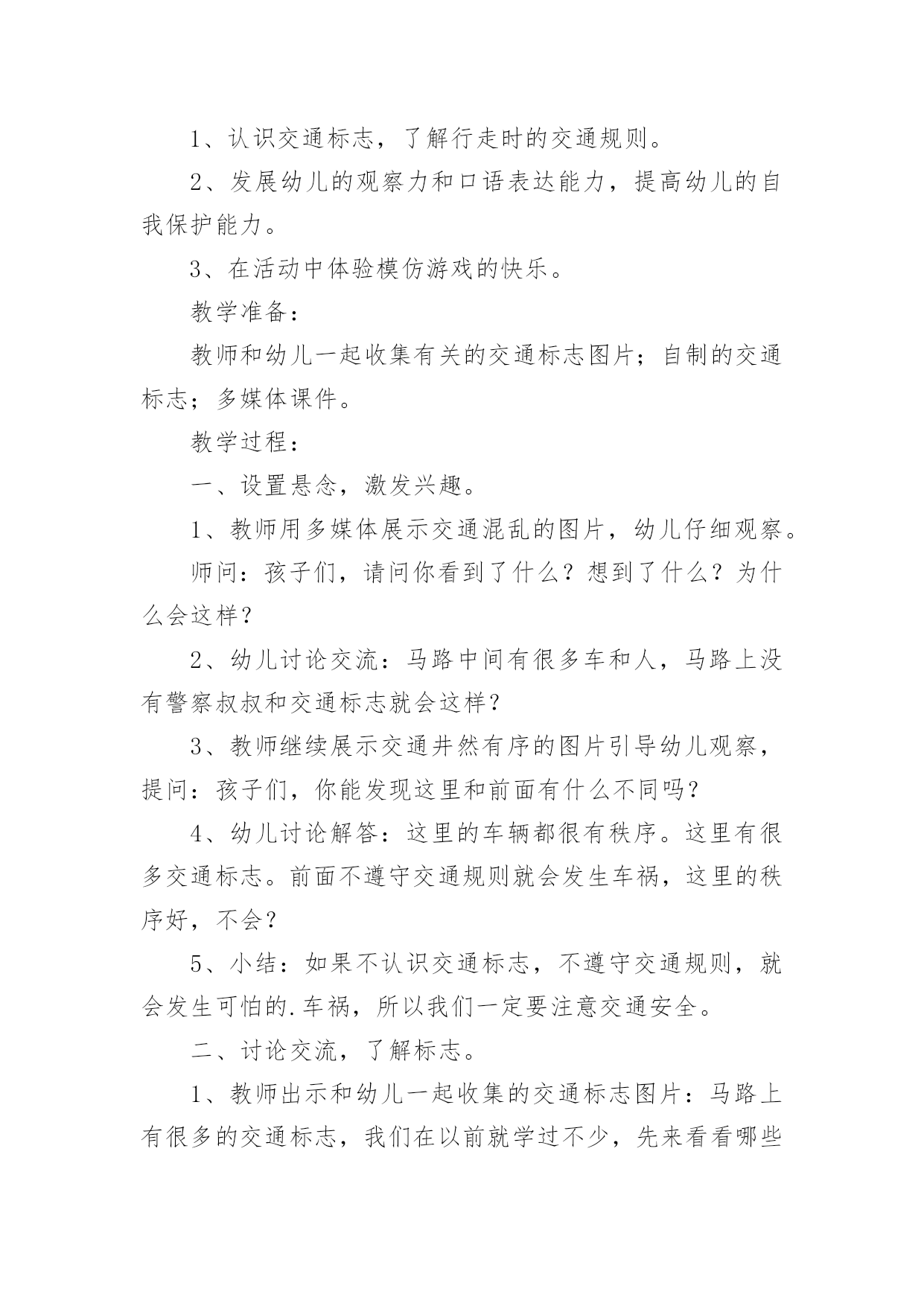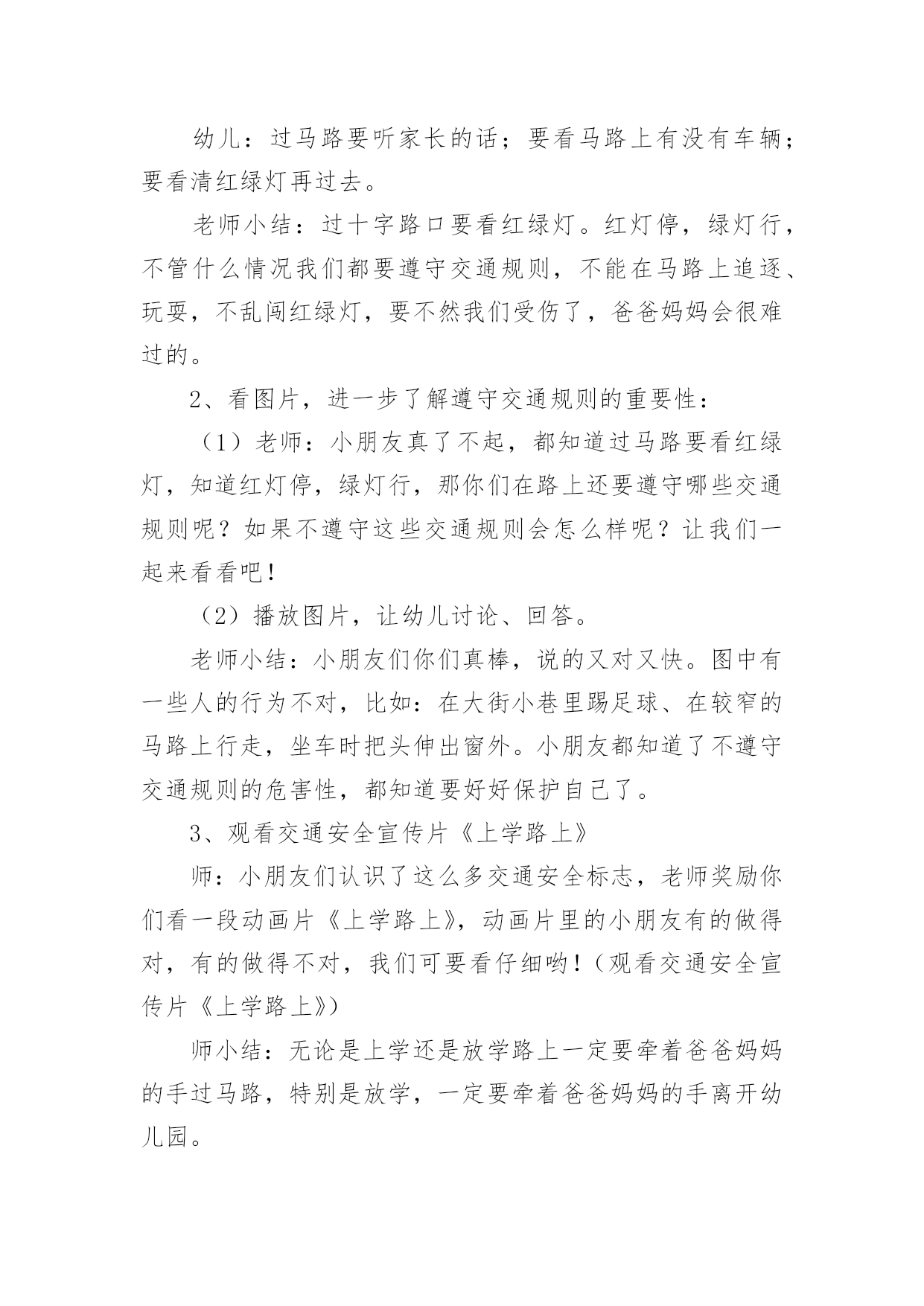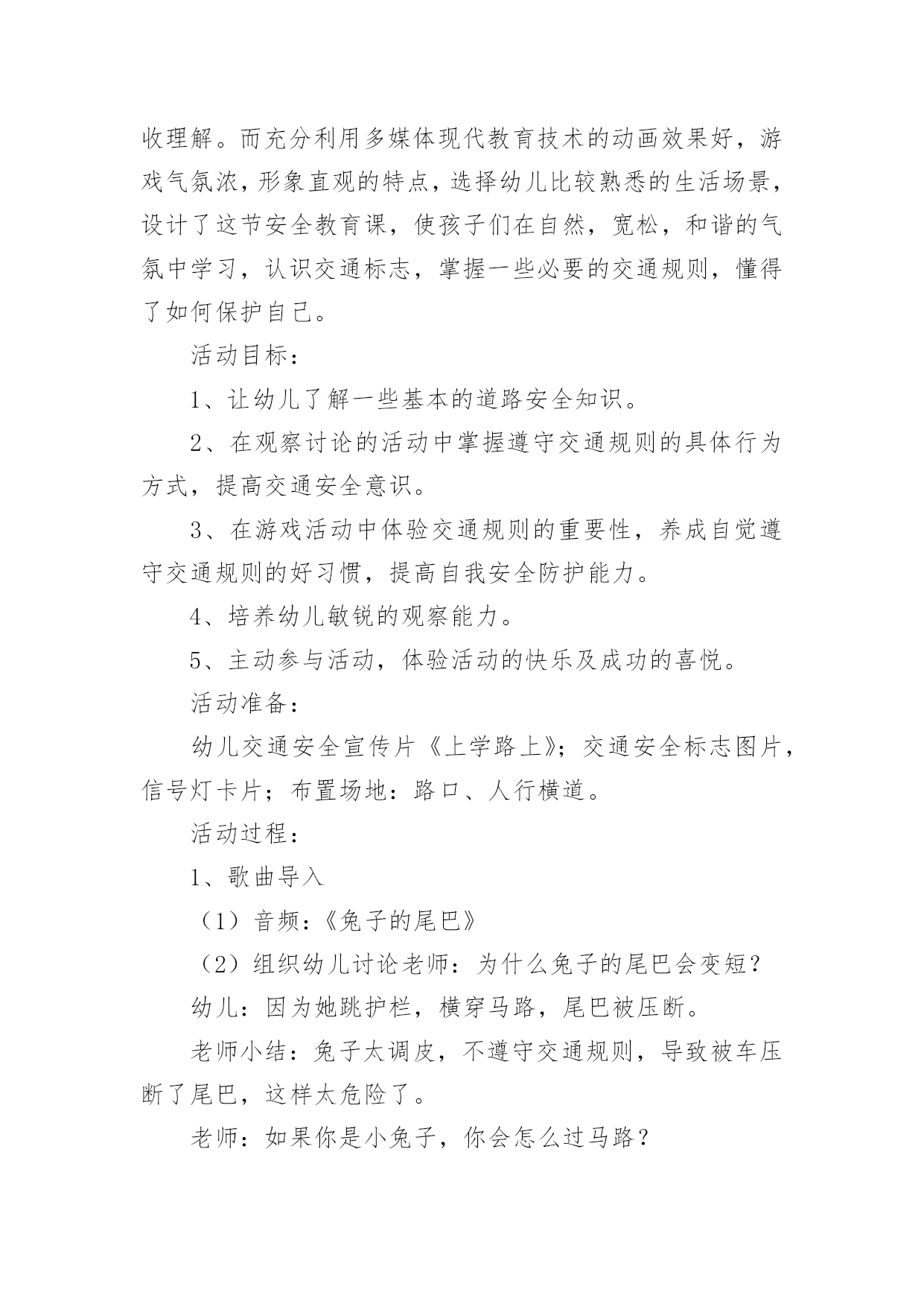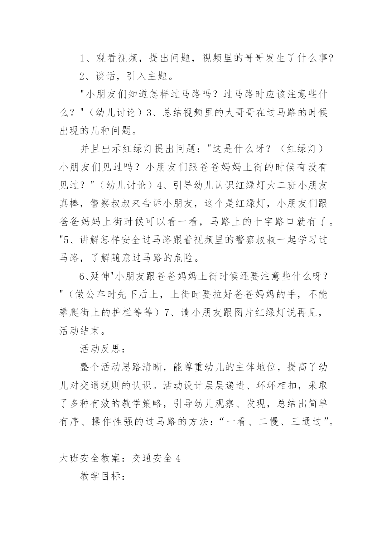 大班安全教案:交通安全作为一名专为他人授业解惑的人民教师,很有必要精心设计一份教案,教案是备课向课堂教学转化的关节点。那么优秀的教案是什么样的呢?下面是小编帮大家整理的大班安全教案:交通安全,欢迎大家借鉴与参考,希望对大家有所帮助。大班安全教案:交通安全1一、活动目标:1、让幼儿在交流活动中认识一些常见的交通标志。2、让幼儿在游戏活动中体验交通规则的重要性,从而自觉地遵守交通规则。3、让幼儿在合作学习中学得一些基本的学习方法。二、活动准备:1、精心布置活动场景。2、收集各种交通标志(照片或图片)。3、字卡:交通安全、红灯停,绿灯行、人行道、非机动车道、汽车道。三、活动过程:(一)展开联想,揭示活动主题1、出示交通事故图片,请幼儿仔细观察。提问:孩子们,刚才你们看到了什么?想到了什么?1、多么可怕的车祸,为了不让这样的事情再发生,我们一定要注意交通安全。(出示字卡“交通安全”)(二)在活动中体会交通规则的重要性2、孩子们,看看我们坐的队形像什么?十字路口的学问可多了,现在我们就在十字路口做个游戏。老师请出三个司机,三个骑车的以及五个行人。参加游戏活动的孩子听到老师说完“开始”之后,立即向自己的对面出发。其他孩子仔细观察,看看会发生什么事情?(1)孩子们,刚才你们看到了什么?你们想说什么?(2)如果生活中也是这样可不行啊!为什么会发生这种情况呢?(3)(教师拿出信号灯标志)这是什么?谁能编句儿歌来说说信号灯的作用。(将标志贴在黑板上)幼儿回答后出示字卡“红灯停,绿灯行”。2、认识了红绿灯,我们还要知道自己应该走哪条路,这就要知道每条路的'名称。孩子们,看看这个十字路口,你认识这些道路吗?(人行道、非机动车道、汽车道)(三)初步了解常见交通标志的作用(出示交通标志)在车辆穿梭的马路上,除了信号灯这个交通标志外,还有很多交通标志,这些交通标志都有什么用呢?(四)现场指挥1、刚才我们认识的交通标志对维护交通安全起着重要的作用。车辆的顺畅,人们的生命安全,更离不开交通警察。老师向交警叔叔学了一些指挥交通的本领,请小朋友仔细看,猜一猜是什么意思。2、老师来当交通警察,请小朋友站在这个十字路口,听警察叔叔的指挥,一起动一动吧!(五)评价幼儿游戏情况,结束。儿童安全小知识:1.增强红绿灯意识。红绿灯是设在街道路口的交通信号装置。`红灯停,绿灯行'按信号灯的指示通行,起步时向左右两边看是否有来车,然后从人行横道横过马路。自觉地接受交通信号的指挥。2.学龄前儿童过马路要让大人牵引。不要让儿童单独上街.他们如在街道或公路上行走,必须有成年人带领。3.不要在车辆临近时突然横过马路。人的大脑从接受外界信号到是否决定停步到最后停下来有一个过程。汽车也是这样,当紧急制动时也有一个过程;再加上行驶的汽车有惯性,不能一刹即停。最安全之策,只能是:不要在汽车临近时突然横穿马路。4.不要扒车.一些小孩出于好奇,常常利用车辆起步、上坡、减速时扒车,或作游戏或以扒车代步。这样很容易跌倒或摔伤.甚至造成生命危险.大班安全教案:交通安全2设计意图:现代城市交通的不断发展导致越来越多的儿童交通事故让人触目惊心,不得不引起关注,而幼儿园课堂教育属于单纯的理论教育,难以集中儿童的注意力,也不利于幼儿吸收理解。而充分利用多媒体现代教育技术的动画效果好,游戏气氛浓,形象直观的特点,选择幼儿比较熟悉的生活场景,设计了这节安全教育课,使孩子们在自然,宽松,和谐的气氛中学习,认识交通标志,掌握一些必要的交通规则,懂得了如何保护自己。活动目标:1、让幼儿了解一些基本的道路安全知识。2、在观察讨论的活动中掌握遵守交通规则的具体行为方式,提高交通安全意识。3、在游戏活动中体验交通规则的重要性,养成自觉遵守交通规则的好习惯,提高自我安全防护能力。4、培养幼儿敏锐的观察能力。5、主动参与活动,体验活动的快乐及成功的喜悦。活动准备:幼儿交通安全宣传片《上学路上》;交通安全标志图片,信号灯卡片;布置场地:路口、人行横道。活动过程:1、歌曲导入(1)音频:《兔子的尾巴》(2)组织幼儿讨论老师:为什么兔子的尾巴会变短?幼儿:因为她跳护栏,横穿马路,尾巴被压断。老师小结:兔子太调皮,不遵守交通规则,导致被车压断了尾巴,这样太危险了。老师:如果你是小兔子,你会怎么过马路?幼儿:过马路要听家长的话;要看马路上有没有车辆;要看清红绿灯再过去。老师小结:过十字路口要看红绿灯。红灯停,绿灯行,不管什么情况我们都要遵守交通规则,不能在马路上追逐、玩耍,不乱闯红绿灯,要不然我们受伤了,爸爸妈妈会很难过的。2、看图片,进一步了解遵守交通规则的重要性:(1)老师:小朋友真了不起,都知道过马路要看红绿灯,知道红灯停,绿灯行,那你们在路上还要遵守哪些交通规则呢?如果不遵守这些交通规则会怎么样呢?让我们一起来看看吧!(2)播放图