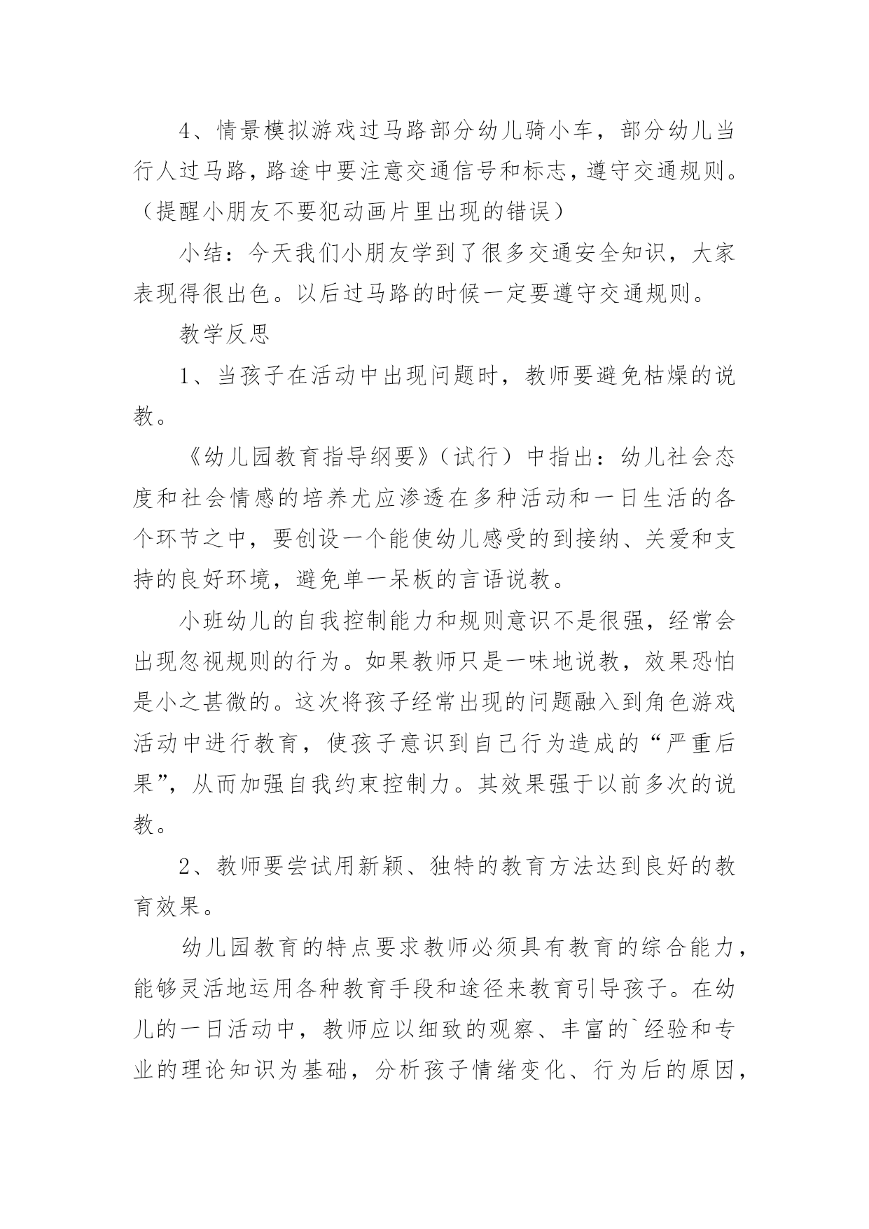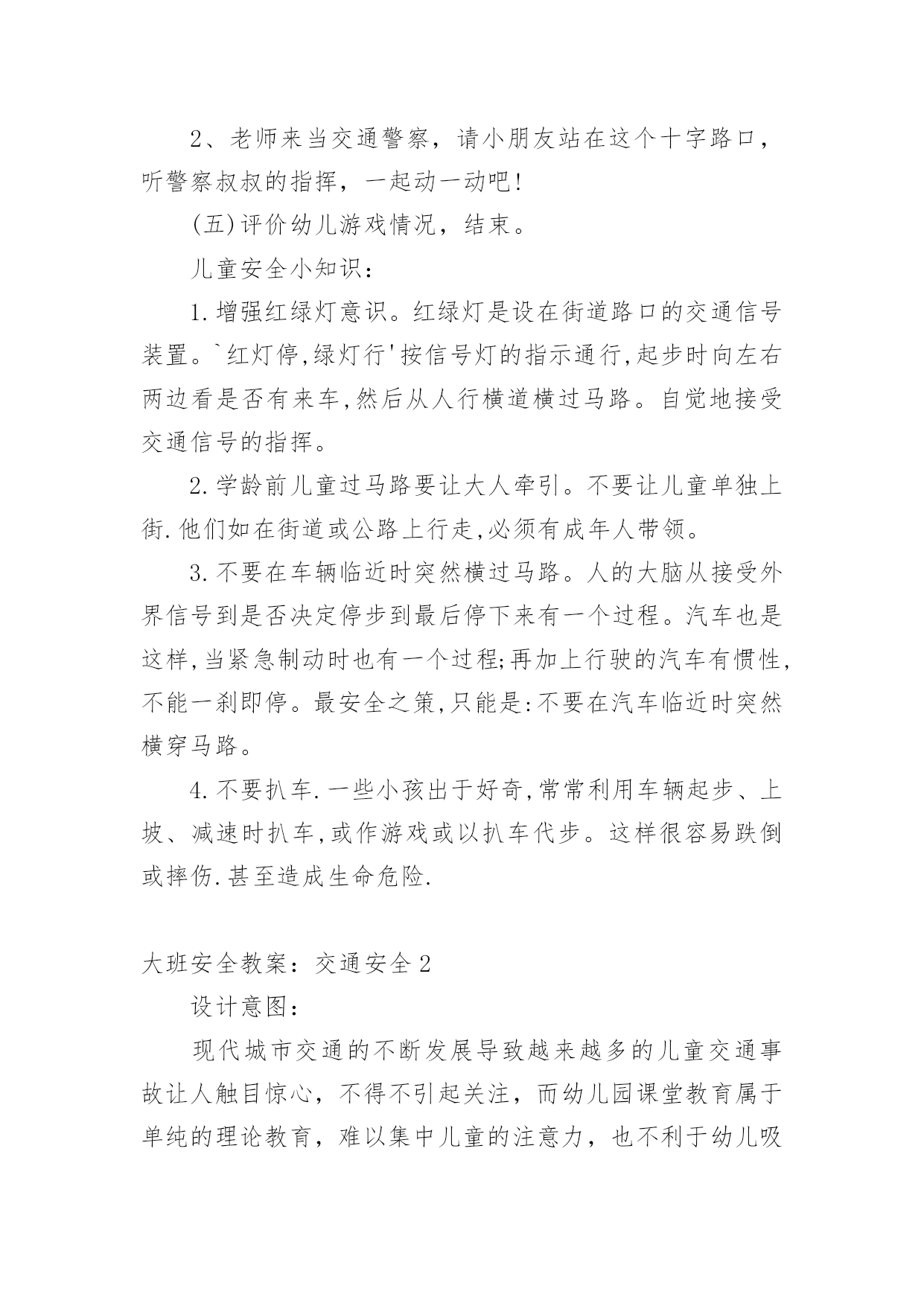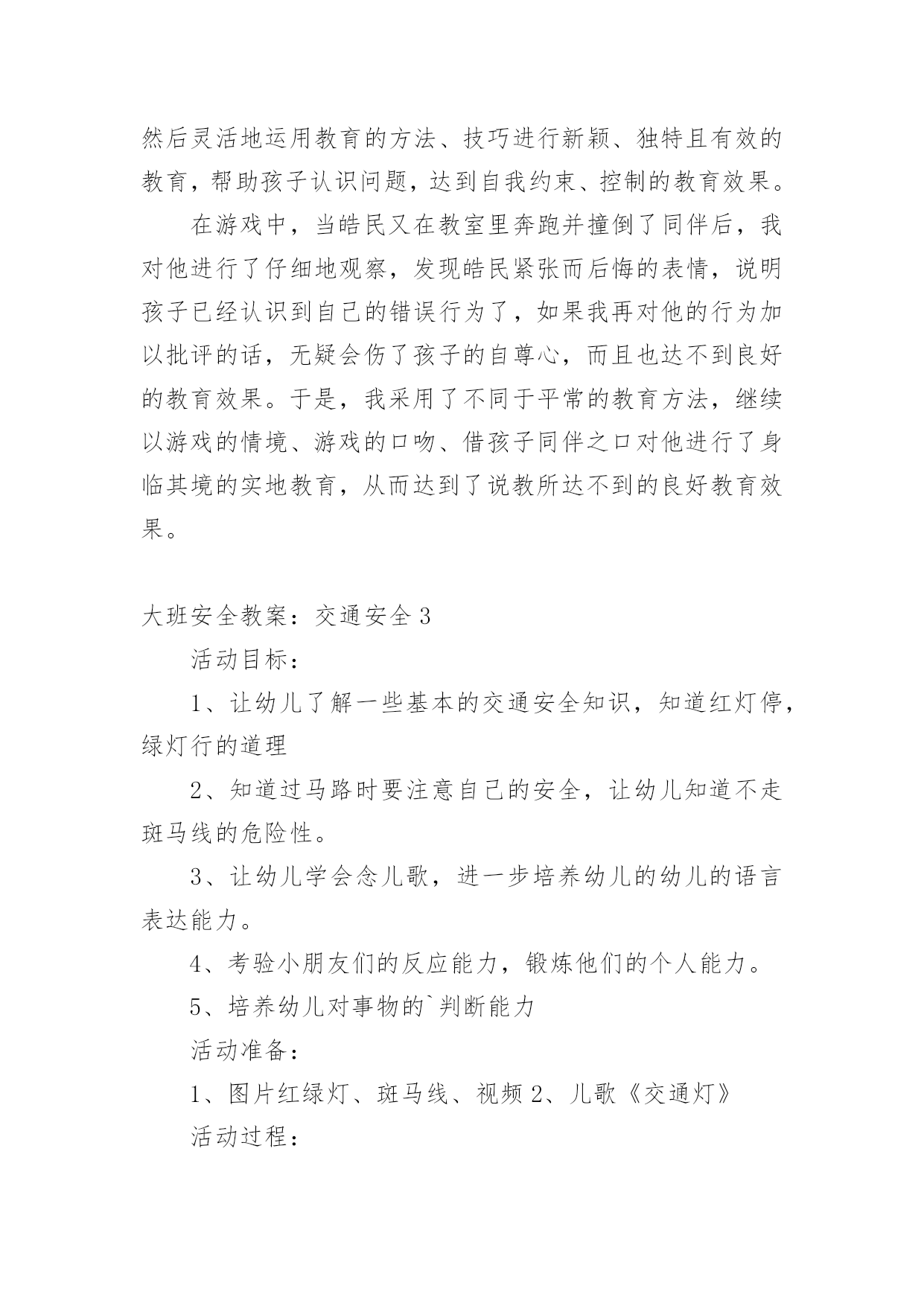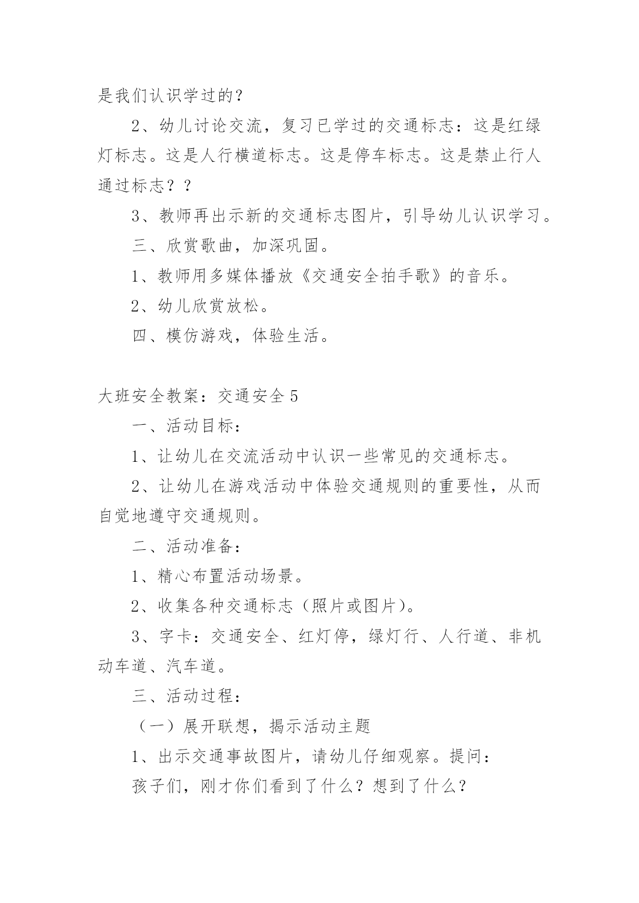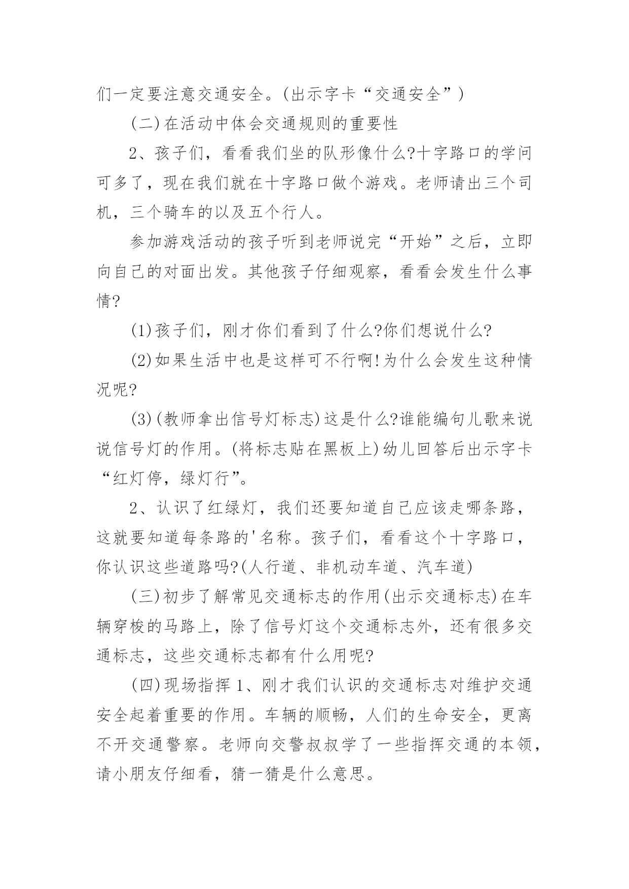 大班安全教案:交通安全作为一名专为他人授业解惑的人民教师,很有必要精心设计一份教案,教案是备课向课堂教学转化的关节点。那么优秀的教案是什么样的呢?下面是小编帮大家整理的大班安全教案:交通安全,欢迎大家借鉴与参考,希望对大家有所帮助。大班安全教案:交通安全1一、活动目标:1、让幼儿在交流活动中认识一些常见的交通标志。2、让幼儿在游戏活动中体验交通规则的重要性,从而自觉地遵守交通规则。3、让幼儿在合作学习中学得一些基本的学习方法。二、活动准备:1、精心布置活动场景。2、收集各种交通标志(照片或图片)。3、字卡:交通安全、红灯停,绿灯行、人行道、非机动车道、汽车道。三、活动过程:(一)展开联想,揭示活动主题1、出示交通事故图片,请幼儿仔细观察。提问:孩子们,刚才你们看到了什么?想到了什么?1、多么可怕的车祸,为了不让这样的事情再发生,我们一定要注意交通安全。(出示字卡“交通安全”)(二)在活动中体会交通规则的重要性2、孩子们,看看我们坐的队形像什么?十字路口的学问可多了,现在我们就在十字路口做个游戏。老师请出三个司机,三个骑车的以及五个行人。参加游戏活动的孩子听到老师说完“开始”之后,立即向自己的对面出发。其他孩子仔细观察,看看会发生什么事情?(1)孩子们,刚才你们看到了什么?你们想说什么?(2)如果生活中也是这样可不行啊!为什么会发生这种情况呢?(3)(教师拿出信号灯标志)这是什么?谁能编句儿歌来说说信号灯的作用。(将标志贴在黑板上)幼儿回答后出示字卡“红灯停,绿灯行”。2、认识了红绿灯,我们还要知道自己应该走哪条路,这就要知道每条路的'名称。孩子们,看看这个十字路口,你认识这些道路吗?(人行道、非机动车道、汽车道)(三)初步了解常见交通标志的作用(出示交通标志)在车辆穿梭的马路上,除了信号灯这个交通标志外,还有很多交通标志,这些交通标志都有什么用呢?(四)现场指挥1、刚才我们认识的交通标志对维护交通安全起着重要的作用。车辆的顺畅,人们的生命安全,更离不开交通警察。老师向交警叔叔学了一些指挥交通的本领,请小朋友仔细看,猜一猜是什么意思。2、老师来当交通警察,请小朋友站在这个十字路口,听警察叔叔的指挥,一起动一动吧!(五)评价幼儿游戏情况,结束。儿童安全小知识:1.增强红绿灯意识。红绿灯是设在街道路口的交通信号装置。`红灯停,绿灯行'按信号灯的指示通行,起步时向左右两边看是否有来车,然后从人行横道横过马路。自觉地接受交通信号的指挥。2.学龄前儿童过马路要让大人牵引。不要让儿童单独上街.他们如在街道或公路上行走,必须有成年人带领。3.不要在车辆临近时突然横过马路。人的大脑从接受外界信号到是否决定停步到最后停下来有一个过程。汽车也是这样,当紧急制动时也有一个过程;再加上行驶的汽车有惯性,不能一刹即停。最安全之策,只能是:不要在汽车临近时突然横穿马路。4.不要扒车.一些小孩出于好奇,常常利用车辆起步、上坡、减速时扒车,或作游戏或以扒车代步。这样很容易跌倒或摔伤.甚至造成生命危险.大班安全教案:交通安全2设计意图:现代城市交通的不断发展导致越来越多的儿童交通事故让人触目惊心,不得不引起关注,而幼儿园课堂教育属于单纯的理论教育,难以集中儿童的注意力,也不利于幼儿吸收理解。而充分利用多媒体现代教育技术的动画效果好,游戏气氛浓,形象直观的特点,选择幼儿比较熟悉的生活场景,设计了这节安全教育课,使孩子们在自然,宽松,和谐的气氛中学习,认识交通标志,掌握一些必要的交通规则,懂得了如何保护自己。活动目标:1、让幼儿了解一些基本的道路安全知识。2、在观察讨论的活动中掌握遵守交通规则的具体行为方式,提高交通安全意识。3、在游戏活动中体验交通规则的重要性,养成自觉遵守交通规则的好习惯,提高自我安全防护能力。4、培养幼儿敏锐的观察能力。5、主动参与活动,体验活动的快乐及成功的喜悦。活动准备:幼儿交通安全宣传片《上学路上》;交通安全标志图片,信号灯卡片;布置场地:路口、人行横道。活动过程:1、歌曲导入(1)音频:《兔子的尾巴》(2)组织幼儿讨论老师:为什么兔子的尾巴会变短?幼儿:因为她跳护栏,横穿马路,尾巴被压断。老师小结:兔子太调皮,不遵守交通规则,导致被车压断了尾巴,这样太危险了。老师:如果你是小兔子,你会怎么过马路?幼儿:过马路要听家长的话;要看马路上有没有车辆;要看清红绿灯再过去。老师小结:过十字路口要看红绿灯。红灯停,绿灯行,不管什么情况我们都要遵守交通规则,不能在马路上追逐、玩耍,不乱闯红绿灯,要不然我们受伤了,爸爸妈妈会很难过的。2、看图片,进一步了解遵守交通规则的重要性:(1)老师:小朋友真了不起,都知道过马路要看红绿灯,知道红灯停,绿灯行,那你们在路上还要遵守哪些交通规则呢?如果不遵守这些交通规则会怎么样呢?让我们一起来看看吧!(2)播放图