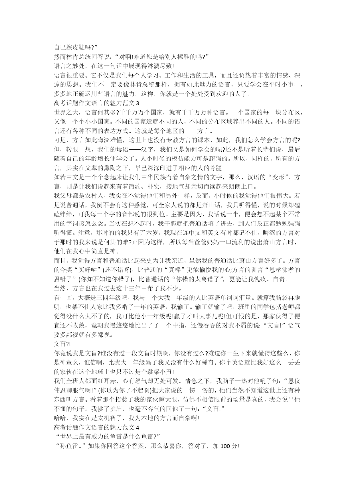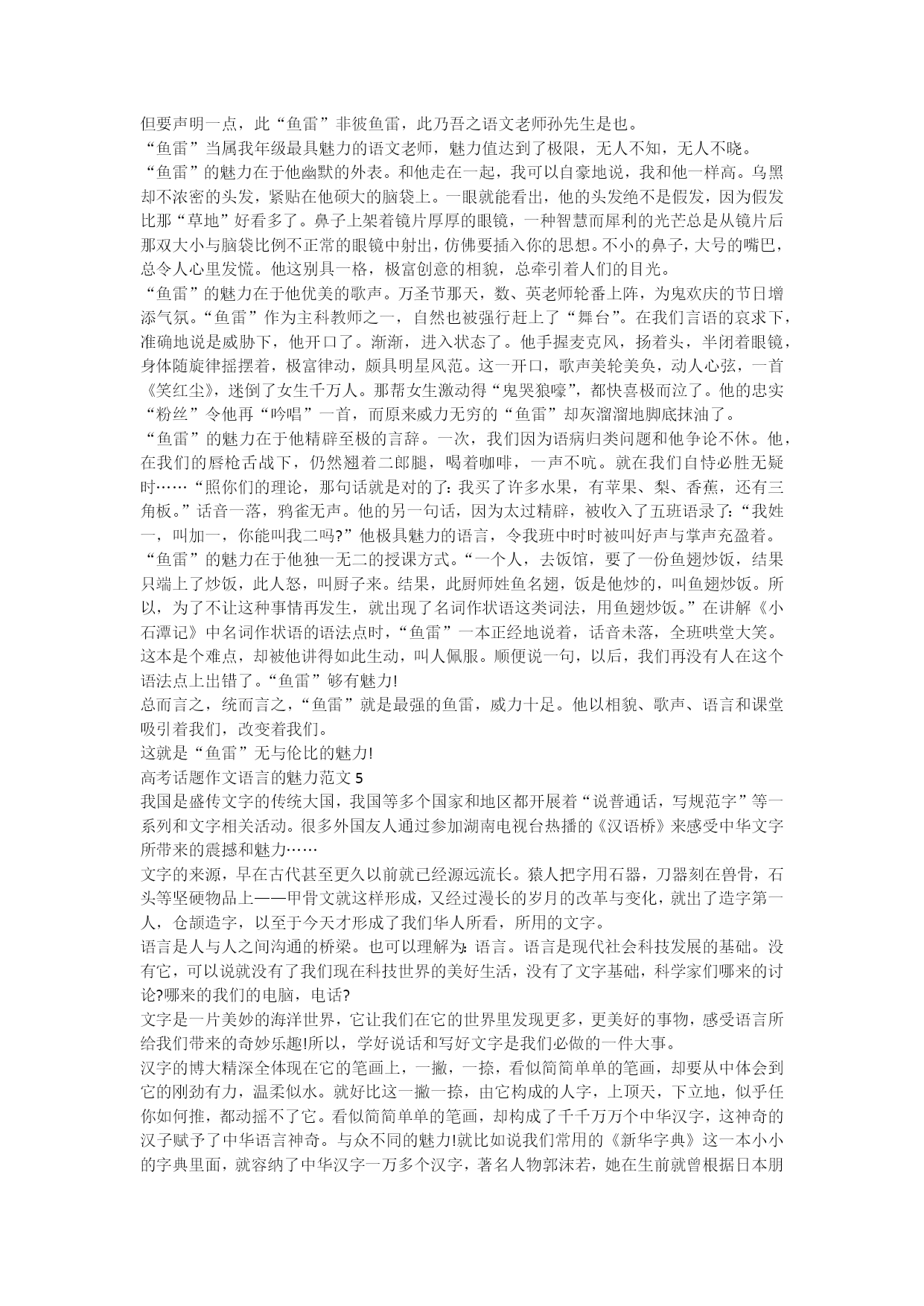 高考话题作文语言的魅力地球上只要有人生存的地方,都会有语言,但却不一定每个地方都能存在“语言”上的“魅力”。一起来看看关于高考话题作文语言的魅力,欢迎大家查阅!高考话题作文语言的魅力范文1看,那边有人在吵架,是什么原因导致他们吵起来呢?我们一起去看看。起因:在于甲方因衣服被乙方不小心给刺破了一个洞,非常生气的骂了乙方几句,那满口的脏的语言激怒了乙方,乙方因此和甲方吵了起来。这是一见非常小件的事情,可又是一件常见到的事情。如果当时换一种方式,甲方没有粗口骂乙方,也将不会导致一个不圆满的结果,如:甲方衣服不小心被乙方刺破时,可以说:“对不起,我的衣服不小心钩到你的东西。”这样一来,乙方会不仅会感到惭愧,而且也不会导致个不圆满的结果。可见,这就是语言的魅力,如果我们每个人能够好好利用语言,那么处处就会体现出“语言的魅力”,而且社会也将会和谐起来。语言的魅力不只是能无吵架的、安安静静的解开一些误会,而且还在——在我们每个人伤心、遇上挫折的时候,都需要朋友来安慰和帮助,这时候贴心,温馨的语言,也是语言的魅力。我也一样,以前我曾因为考试考砸了,很难过。这时我的朋友就会来安慰我,如:说:“没事的,下次考好就不就行了吗`”“.你这次是粗心了,以后要细心检查就好了……”“人都会失误的时候,这只不过是你的一个失误,成功总会在后面等你的……”听了这些话,我还会难过伤心吗?语言处处可见,但如果我们让语言充满爱的魅力的话,社会将会更加和谐、幸福。高考话题作文语言的魅力范文2语言,是殿堂,巍峨而冷峻;是大厦,文明而庄严。有无数的奥妙,然他们静静地在那里,等待被世人发掘。人类的进化史,其实也是语言的进化史。说来惭愧,我很少意识到语言的魅力,直到那一天:“我不是叫你帮我拿的吗?浑球!”这天上学,由于我来得迟,肚子饿得发慌。然而当我匆匆忙忙赶到班级时,却发现今天的早餐——牛奶,早已被抢夺一空。若不是我来得及时,连面包恐怕也会被吃光。而且令人气愤的是,我曾经拜托一位同学帮我留一份早餐,然而他竟一脸无辜地告诉我忘记了!这让我十分气愤!怒气冲冲地说出这样一句话来,我突然有些后悔:因为毕竟是我有求于别人,而来迟是我的错,那位同学平时也比较忙,我这样吼他,实在有些不应该……气氛僵得可怕。我不想失去一个好朋友,于是拼命想着该如何化解这个尴尬的场面。半晌,我说了一句:“非人哉!”这句话是我们语文课本上的一句古老的骂人话,译为:“简直不是人啊!”当时我们读到这一段的时候大家都笑了。出乎意料的是:僵局顿时被打破了,同学们哈哈大笑起来。刚才的尴尬烟消云散……就这么,我领略到了语言的魅力。这种魅力不一定是要像辩论赛一样,将别人压迫得无法反抗。其妙处在于化解尴尬,让大家愉快起来。如果一个人的语言还有更强的魅力的话,他还能够潜移默化地在不伤害感情的前提下让别人知道:你错了。而且还能够让别人心服口服。还有个更加厉害的故事,是关于美国前总统林肯的。一次,林肯总统在会议开始前为自己擦皮鞋。一位记者不无讥讽地问道:“总统,您总是给自己擦皮鞋吗?”然而林肯总统回答说:“对啊!难道您是给别人擦鞋的吗?”语言之妙处,在这一句话中展现得淋漓尽致!语言很重要。它不仅是我们每个人学习、工作和生活的工具,而且还负载着丰富的情感、深邃的思想。我们不一定要像林肯总统那样,拥有如此魅力的语言,只要学会在平时小事中,多多地正确运用些语言的魅力,这样,你就是一个处处受到欢迎的人了。高考话题作文语言的魅力范文3世界之大,语言何其多?千千万万个国家,就有千千万万种语言。一个国家的每一块分布区,又像一个个小小国家。不同的国家造就不同的人,不同的分布区域养出不同的人。不同的语言还有各种不同的表达方式。这就是每个地区的——方言。可是,方言如此晦涩难懂,这世上也没有专教方言的课本,如此,我们怎么学会方言的呢?但,转眼一想,我们的母语——汉字,我们又是如何学会的呢?还不是听着长辈们说,最后随着自己的年龄增长便学会了。人小时候的模仿能力可是超强的。所以,同样的,所有的方言,其实在父辈的熏陶之下,早已深深印进了相应的人的骨髓。如若中文是一个个念起来让我们中华民族有着自豪之情的文字,那么,汉语的“变形”,方言,则是让我们说起来有着简约、朴实,接地气却亲切而读起来朗朗上口。我父母都是农村人,我实在不觉得他们和另外一样。反而,小时候的我觉得他们很伟大。若是说普通话,我倒不会有这种感觉,可全家人说的都是萧山话,我只听得懂,说的时候却磕磕绊绊,可我每一个字的音都说的很到位。主要是因为,我话说一半,便会想不起某个不常用的字词该怎么念。当实在想不起时,我干脆就把普通话填了进去,到人们反正都勉勉强强听得懂。注意,那时的的我只有五六岁,我现在连中文和英文有时都记不住,晦涩的方言对于那时的