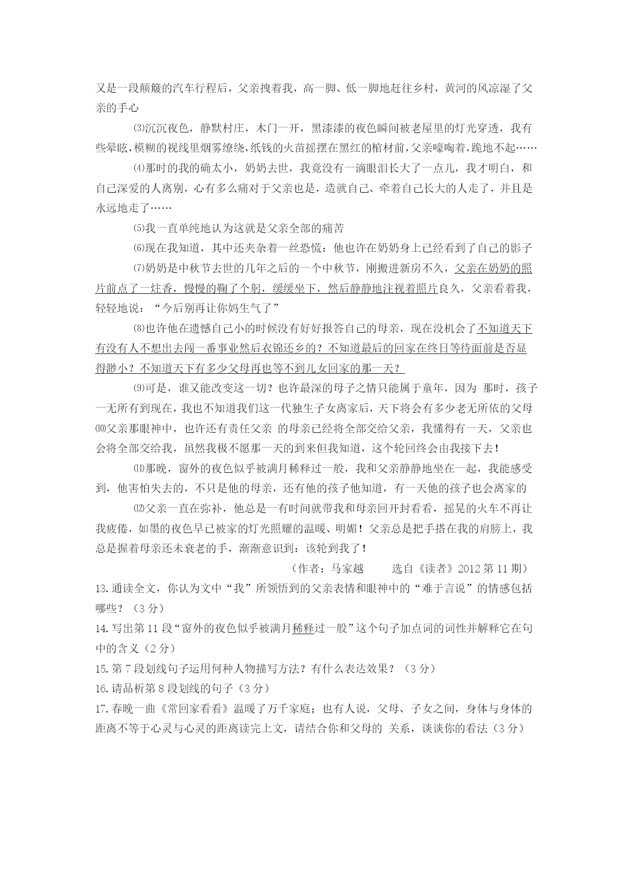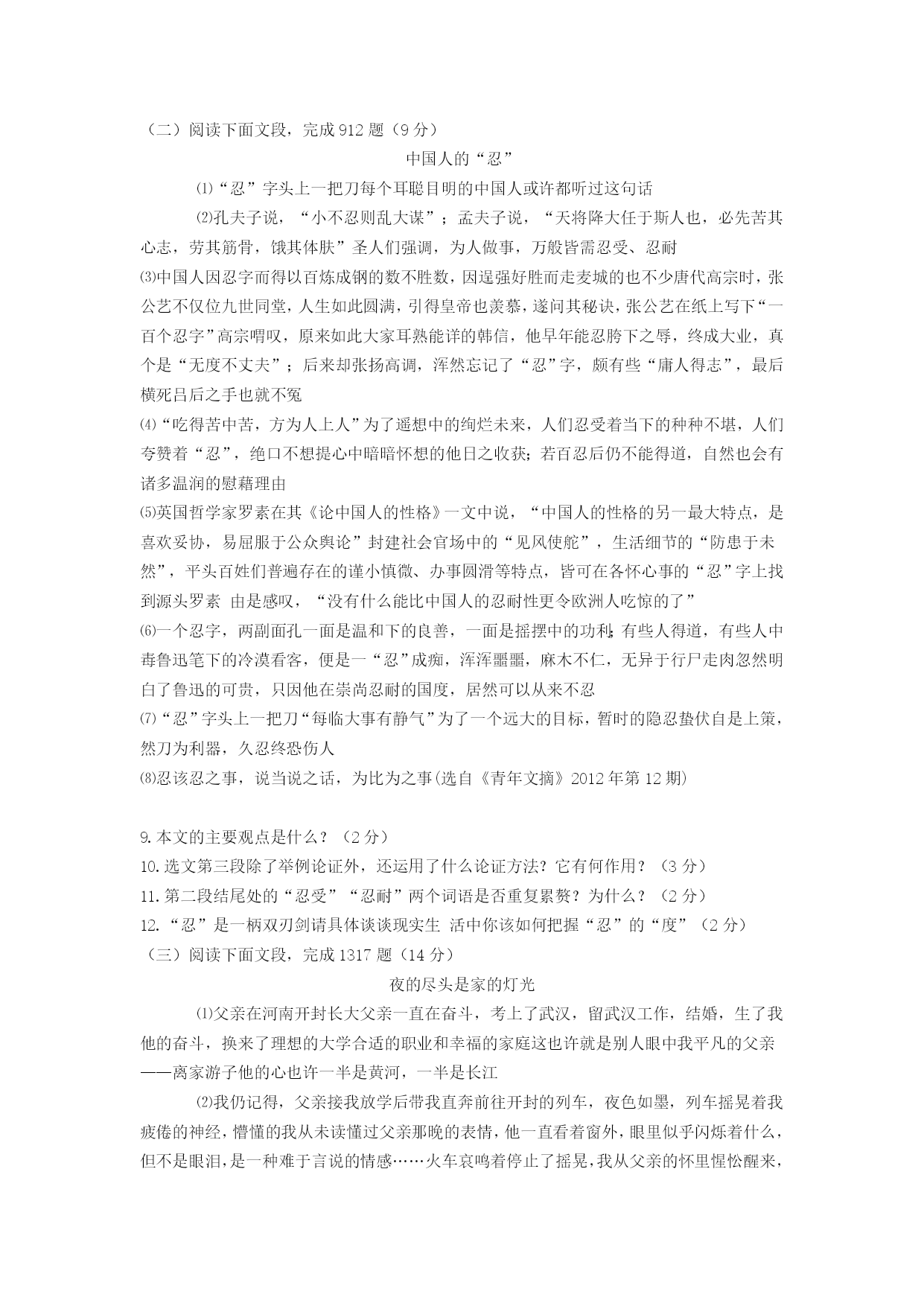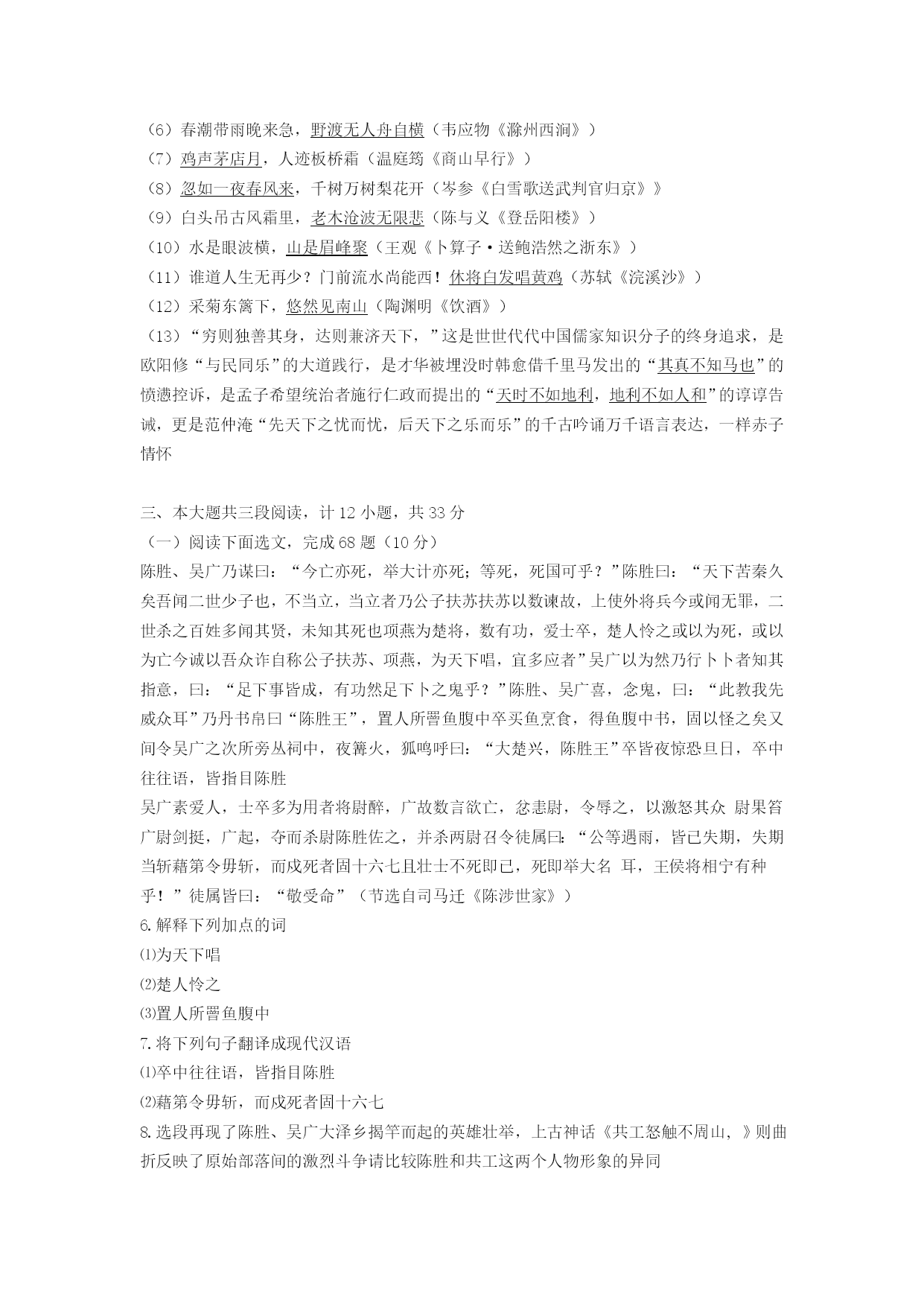2012年广东省深圳语文中考试题第一部分选择题(1—4题)一、本大题共4小题,每题3分,共12分1.请选出下列词语中加点字读音正确的一项()A.褶皱zhě汲取jí峥嵘róng锲而不舍qìB.剽悍piāo荫蔽yìn伫立zhù面面相觑qùC.追溯sù叱咤chà箱箧qiè瘦骨嶙峋xúnD.骷髅lóu殷红yīn炽痛chì盛气凌人lín2.请选出下列句子中加点成语运用有误的一项()A.被誉为“最美司机”的吴斌,几十年如一日服务乘客,任劳任怨,在生命的最后时刻,顶着肋骨被撞断和肝脏破裂的剧痛,停稳汽车,保障了乘客的安全B.这堂诗歌鉴赏课,语文老师匠心独运,以画配诗,诗画相得益彰,意蕴无穷C.欧洲杯盛大开幕,各路绿茵豪强捉对厮杀,一时成为球迷们津津乐道的话题D.这篇小说,人物个性鲜明,情节抑扬顿挫,语言幽默诙谐,让人只想先睹为快3.请选出下列选项中衔接排序正确的一项()桂花象征着友好、吉祥和光荣①月桂树叶编织成的“桂冠”成了“光荣称号”的代名词②《吕氏春秋》中以“物之美者,招摇之桂”称赞桂花是世界上最美好的东西③“蟾宫折桂”则成为人们对读书人金榜题名的美好祝愿④某些少数民族地区青年男女也常以赠送桂花来表示爱慕之情⑤战国时期,韩燕两国曾以相互馈赠桂花来表示亲善友好A.⑤③②④①B.①⑤②④③C.⑤④②③①D.②⑤①③④4.请选出下列说法正确的一项()A.“那晚,妹妹的角色没有一句台词”这个单句的主干是“妹妹没有台词”B.序是一种文体,有书序和赠序之分,《送东阳马生序》是一篇赠序C.“闭了眼,树上仿佛已经满是桃儿、杏儿、梨儿”这句话运用了比喻的修辞手法D.“通过新闻传媒对深圳‘5.26’酒后飙车致人伤亡事件”的追踪报道,使我们深刻认识到醉驾的严重危害”这个句子没有语病第二部分非选择题(5—18)二、本大题共1小题,没空1分,共15分5.请在下面横线上填空相应的句子(1)锦江春色来天地,玉垒浮云变古今(杜甫《登楼》(2)绿树村边合,青山郭外斜(孟浩然《过故人庄》)(3)不畏浮云遮望眼,自缘身在最高层(王安石《登飞来峰》)(4)海日生残夜,江春入旧年(王湾《次北固山下》)(5)月下飞天境,云生结海楼(李白《渡荆门送别》)(6)春潮带雨晚来急,野渡无人舟自横(韦应物《滁州西涧》)(7)鸡声茅店月,人迹板桥霜(温庭筠《商山早行》)(8)忽如一夜春风来,千树万树梨花开(岑参《白雪歌送武判官归京》》(9)白头吊古风霜里,老木沧波无限悲(陈与义《登岳阳楼》)(10)水是眼波横,山是眉峰聚(王观《卜算子·送鲍浩然之浙东》)(11)谁道人生无再少?门前流水尚能西!休将白发唱黄鸡(苏轼《浣溪沙》)(12)采菊东篱下,悠然见南山(陶渊明《饮酒》)(13)“穷则独善其身,达则兼济天下,”这是世世代代中国儒家知识分子的终身追求,是欧阳修“与民同乐”的大道践行,是才华被埋没时韩愈借千里马发出的“其真不知马也”的愤懑控诉,是孟子希望统治者施行仁政而提出的“天时不如地利,地利不如人和”的谆谆告诫,更是范仲淹“先天下之忧而忧,后天下之乐而乐”的千古吟诵万千语言表达,一样赤子情怀三、本大题共三段阅读,计12小题,共33分(一)阅读下面选文,完成68题(10分)陈胜、吴广乃谋曰:“今亡亦死,举大计亦死;等死,死国可乎?”陈胜曰:“天下苦秦久矣吾闻二世少子也,不当立,当立者乃公子扶苏扶苏以数谏故,上使外将兵今或闻无罪,二世杀之百姓多闻其贤,未知其死也项燕为楚将,数有功,爱士卒,楚人怜之或以为死,或以为亡今诚以吾众诈自称公子扶苏、项燕,为天下唱,宜多应者”吴广以为然乃行卜卜者知其指意,曰:“足下事皆成,有功然足下卜之鬼乎?”陈胜、吴广喜,念鬼,曰:“此教我先威众耳”乃丹书帛曰“陈胜王”,置人所罾鱼腹中卒买鱼烹食,得鱼腹中书,固以怪之矣又间令吴广之次所旁丛祠中,夜篝火,狐鸣呼曰:“大楚兴,陈胜王”卒皆夜惊恐旦日,卒中往往语,皆指目陈胜吴广素爱人,士卒多为用者将尉醉,广故数言欲亡,忿恚尉,令辱之,以激怒其众尉果笞广尉剑挺,广起,夺而杀尉陈胜佐之,并杀两尉召令徒属曰:“公等遇雨,皆已失期,失期当斩藉第令毋斩,而戍死者固十六七且壮士不死即已,死即举大名耳,王侯将相宁有种乎!”徒属皆曰:“敬受命”(节选自司马迁《陈涉世家》)6.解释下列加点的词⑴为天下唱⑵楚人怜之⑶置人所罾鱼腹中7.将下列句子翻译成现代汉语⑴卒中往往语,皆指目陈胜⑵藉第令毋斩,而戍死者固十六七8.选段再现了陈胜、吴广大泽乡揭竿而起的英雄壮举,上古神话《共工怒触不周山,》则曲折反映了原始部落间的激烈斗争请比较陈胜和共工这两个人物形象的异同(二)阅读下面文段,完成912题(9分)中国人的“忍”⑴“忍”字头上一把刀每个耳聪目