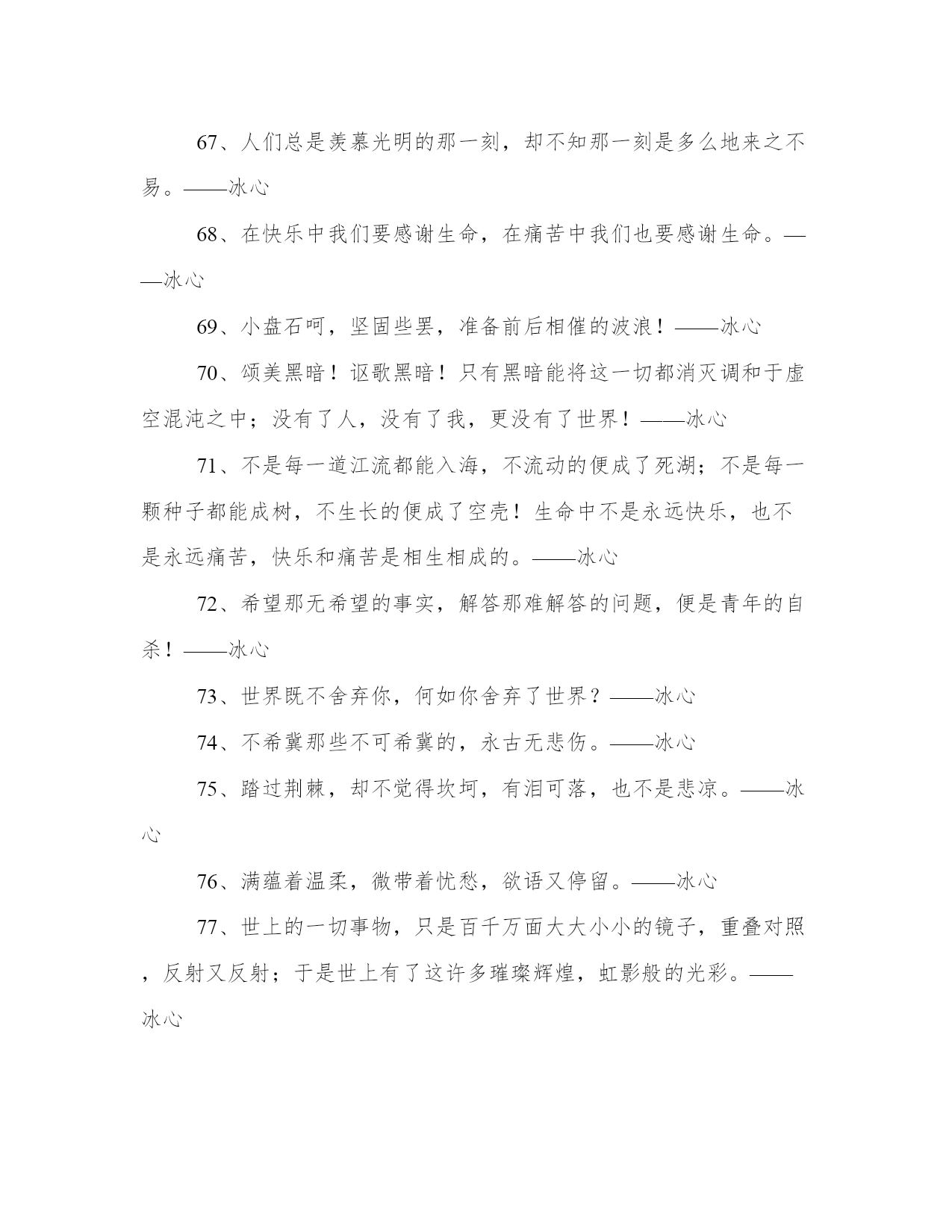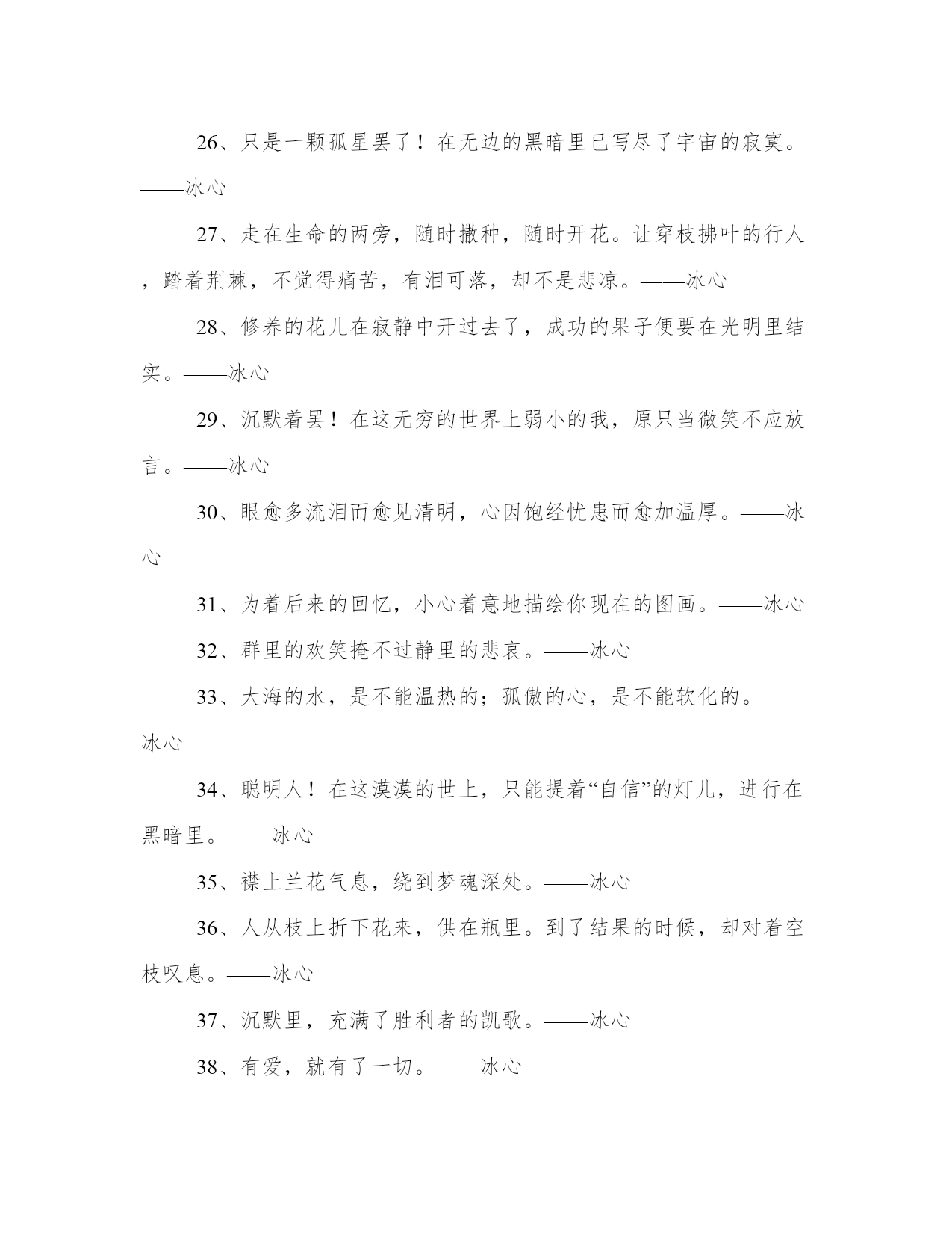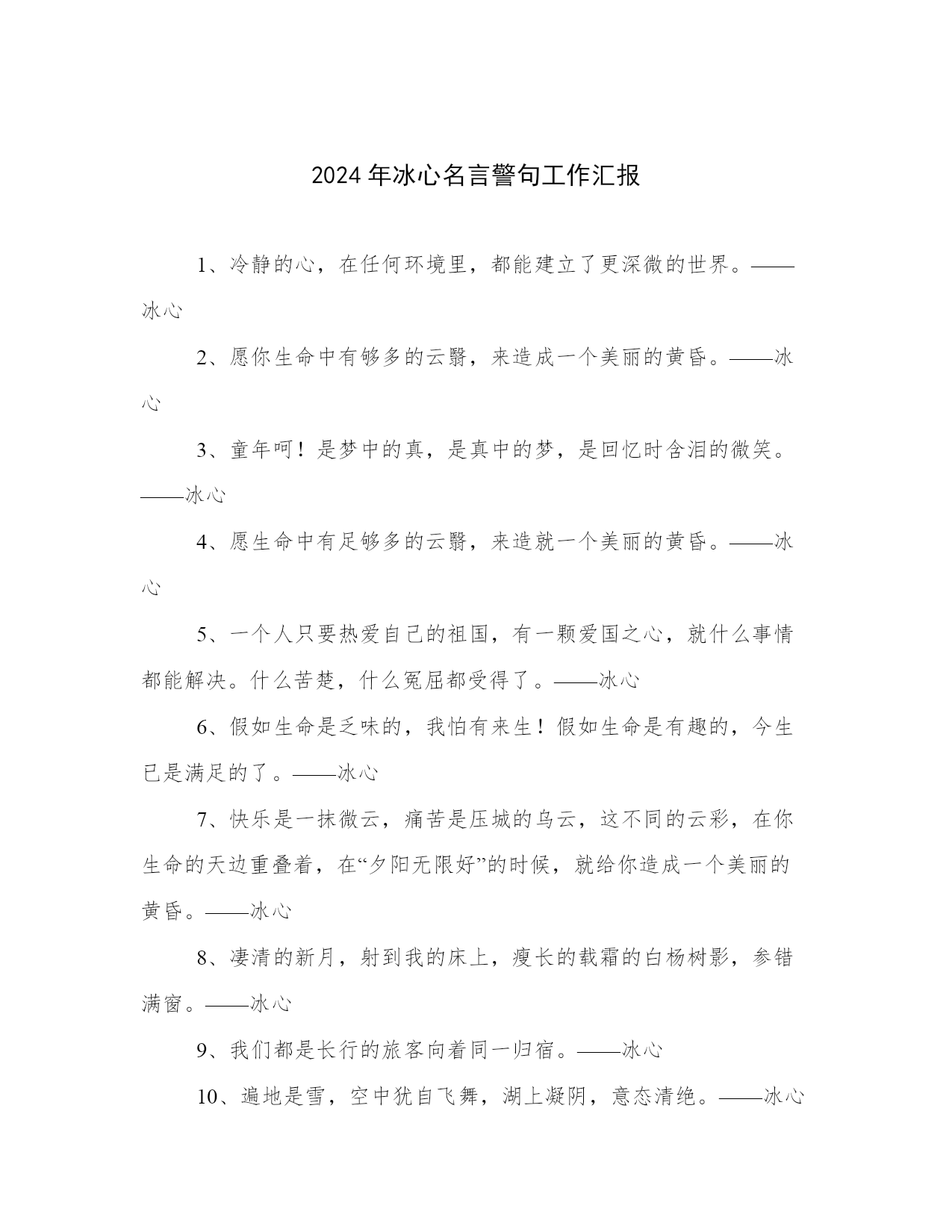 2024年冰心名言警句工作汇报1、冷静的心,在任何环境里,都能建立了更深微的世界。——冰心2、愿你生命中有够多的云翳,来造成一个美丽的黄昏。——冰心3、童年呵!是梦中的真,是真中的梦,是回忆时含泪的微笑。——冰心4、愿生命中有足够多的云翳,来造就一个美丽的黄昏。——冰心5、一个人只要热爱自己的祖国,有一颗爱国之心,就什么事情都能解决。什么苦楚,什么冤屈都受得了。——冰心6、假如生命是乏味的,我怕有来生!假如生命是有趣的,今生已是满足的了。——冰心7、快乐是一抹微云,痛苦是压城的乌云,这不同的云彩,在你生命的天边重叠着,在“夕阳无限好”的时候,就给你造成一个美丽的黄昏。——冰心8、凄清的新月,射到我的床上,瘦长的载霜的白杨树影,参错满窗。——冰心9、我们都是长行的旅客向着同一归宿。——冰心10、遍地是雪,空中犹自飞舞,湖上凝阴,意态清绝。——冰心11、山头独立,宇宙只一人占有了么?——冰心12、这无收束的尘寰,可有众生归路;世界上,来路便是归途,归途也成来路。——冰心13、青春活泼的心,决不作悲哀的留滞。——冰心14、成功的花,人们只惊羡她现时的明艳!然而当初她的芽儿,浸透了奋斗的泪泉,洒遍了牺牲的血雨。——冰心15、愿你的生命有够多的云翳,造成一个美丽的黄昏。——冰心16、白的花胜似绿的叶,浓的酒不如淡的茶。——冰心17、墙角的花!你孤芳自赏时,天地便小了。——冰心18、心灵的灯,在寂静中光明,在热闹中熄灭。——冰心19、踏着荆棘,也不觉悲苦;有泪可落,亦不是悲凉。——冰心20、倘若世间没有风和雨,这枝上繁花,又归何处?只惹得人心生烦厌。——冰心21、童年是梦中的真,是真中的梦,是回忆时含泪的微笑。——冰心22、少年的梦想是风的梦想,青春的思念是长长的思念。——冰心23、冠冕?是暂时的光辉,是永久的束缚。——冰心24、如果你的心简单,那么这个世界也就简单。——冰心25、记忆是时间停留在过去的影子。为了未来的记忆,请着手你现在的画。——冰心26、只是一颗孤星罢了!在无边的黑暗里已写尽了宇宙的寂寞。——冰心27、走在生命的两旁,随时撒种,随时开花。让穿枝拂叶的行人,踏着荆棘,不觉得痛苦,有泪可落,却不是悲凉。——冰心28、修养的花儿在寂静中开过去了,成功的果子便要在光明里结实。——冰心29、沉默着罢!在这无穷的世界上弱小的我,原只当微笑不应放言。——冰心30、眼愈多流泪而愈见清明,心因饱经忧患而愈加温厚。——冰心31、为着后来的回忆,小心着意地描绘你现在的图画。——冰心32、群里的欢笑掩不过静里的悲哀。——冰心33、大海的水,是不能温热的;孤傲的心,是不能软化的。——冰心34、聪明人!在这漠漠的世上,只能提着“自信”的灯儿,进行在黑暗里。——冰心35、襟上兰花气息,绕到梦魂深处。——冰心36、人从枝上折下花来,供在瓶里。到了结果的时候,却对着空枝叹息。——冰心37、沉默里,充满了胜利者的凯歌。——冰心38、有爱,就有了一切。——冰心39、雨后的青山,好像泪洗过的良心。——冰心40、然而我不敢说来生,也不敢信来生。——冰心41、走呵!即或走不到,人生不过是这么一回事。——冰心42、无希望的永古不失望,不希翼那不可希翼的,永古无悲哀。——冰心43、流星,飞走天空,可能有一秒时的凝望?然而这一瞥的光明,已长久遗留在人的心怀里。——冰心44、父爱是沉默的,如果你感觉到了那就不是父爱了!——冰心45、读书好,好读书,读好书。——冰心46、光阴难道就这般的过去么?除却缥缈的思想之外,一事无成!——冰心47、天上的风雨来了,鸟儿躲在它的巢里,心中的风雨来了,我只躲到你的怀里。——冰心48、夜中的雨,丝丝的织就了诗人的情绪。——冰心49、我的朋友!为什么说我“默默”呢?世间原有些作为,超乎语言文字之外。——冰心50、无聊的文字,抛在炉里,也化作无聊的火光。——冰心51、何用写呢?诗人自己,便是诗了。——冰心52、墙的黑影覆住我,我在影中抬头望月。——冰心53、无限的神秘,何处寻它?微笑之后,便是无限的神秘了。——冰心54、愿再不为谁动心,也永不做谁的梦,无希望的永远不失望,不希冀那不可希冀的,永古不悲哀!——冰心55、黑暗不是阴霾,我恨阴霾,却爱黑暗。——冰心56、青年人!信你自己罢!只有你自己是真实的,也只有你自己能创造你自己。——冰心57、我和你,是无限之生中的偶遇,也是无限之生中的永别;再来时,万千同类中,何处更寻你?——冰心58、聪明人,文字是空洞的,言语是虚伪的;你要引导你的朋友,只在你,自然流露的行为上。——冰心59、有多少有恨无情之泪,乘今夜几点星辉挥洒。——冰心60、窗外是苦雨,窗内是孤灯。——冰心61、父亲呵