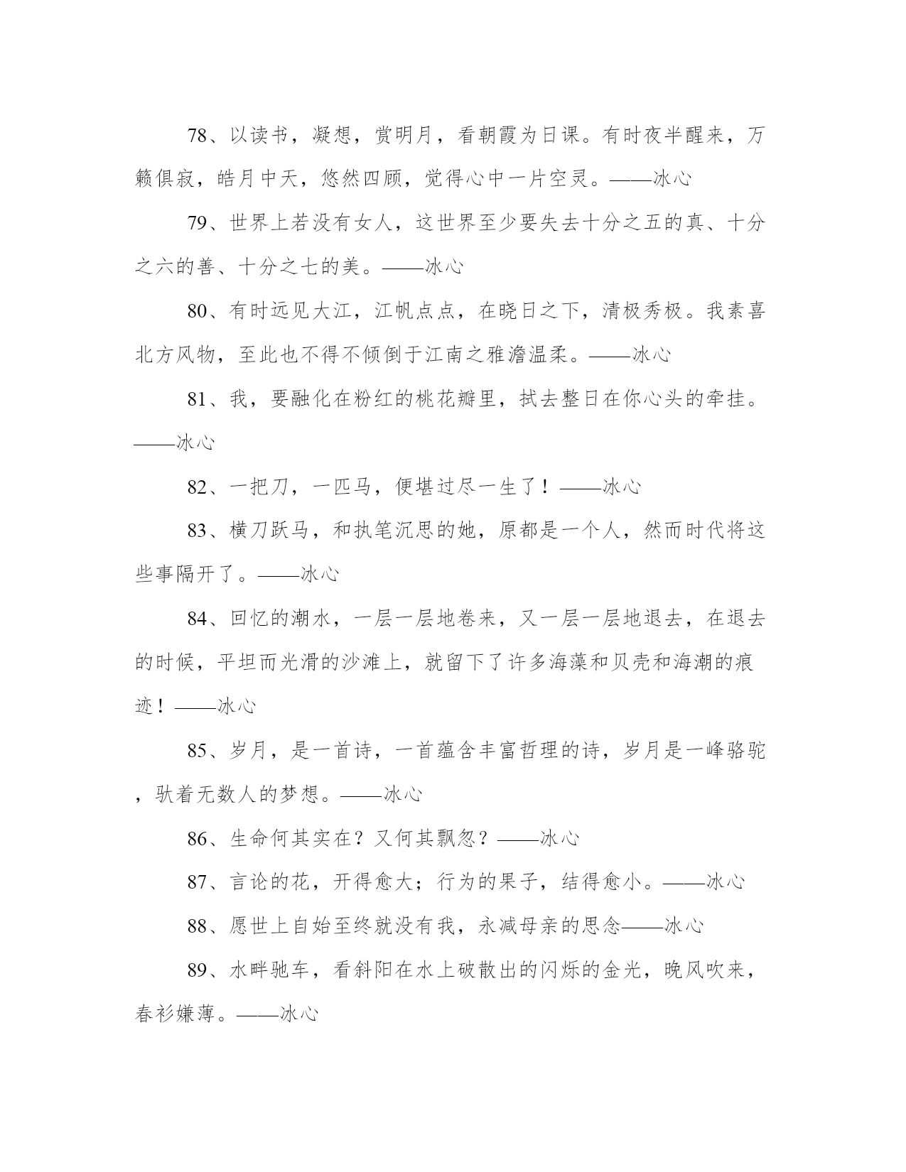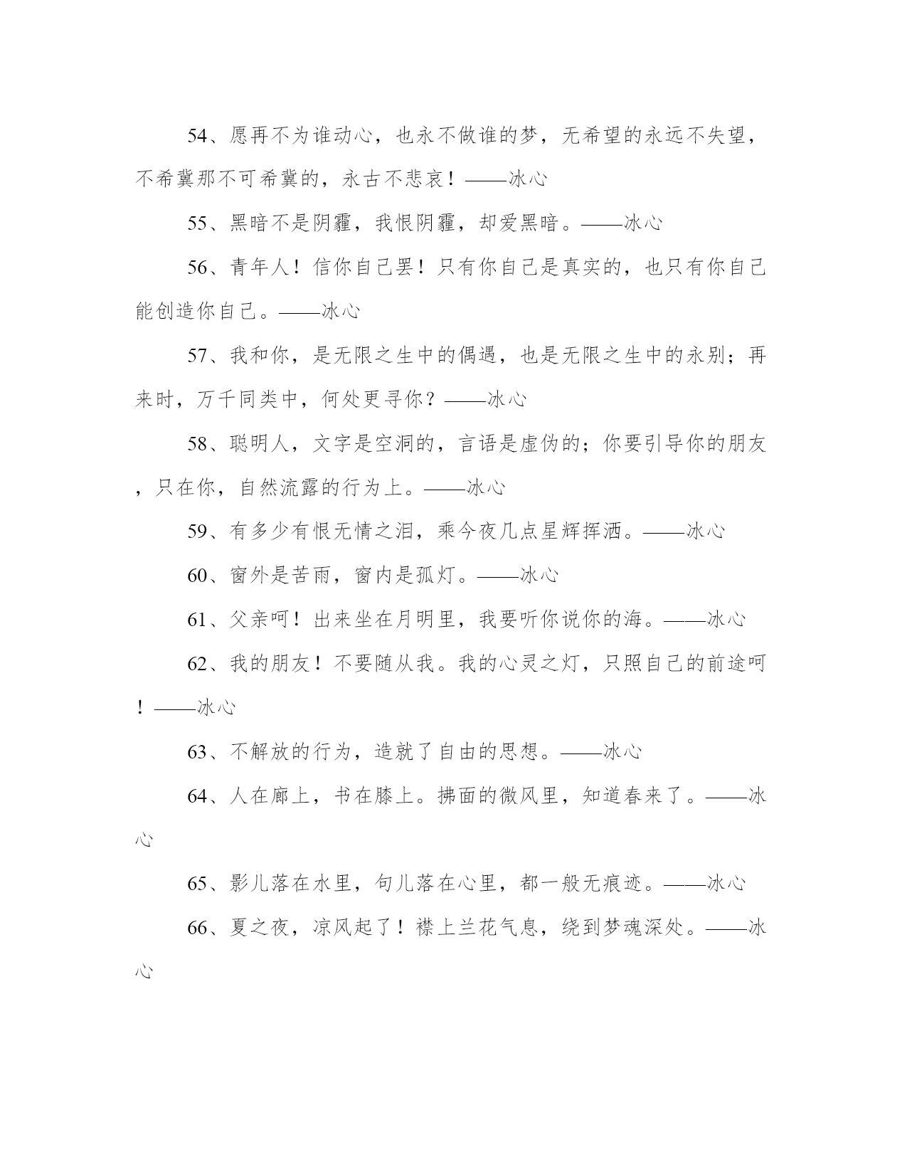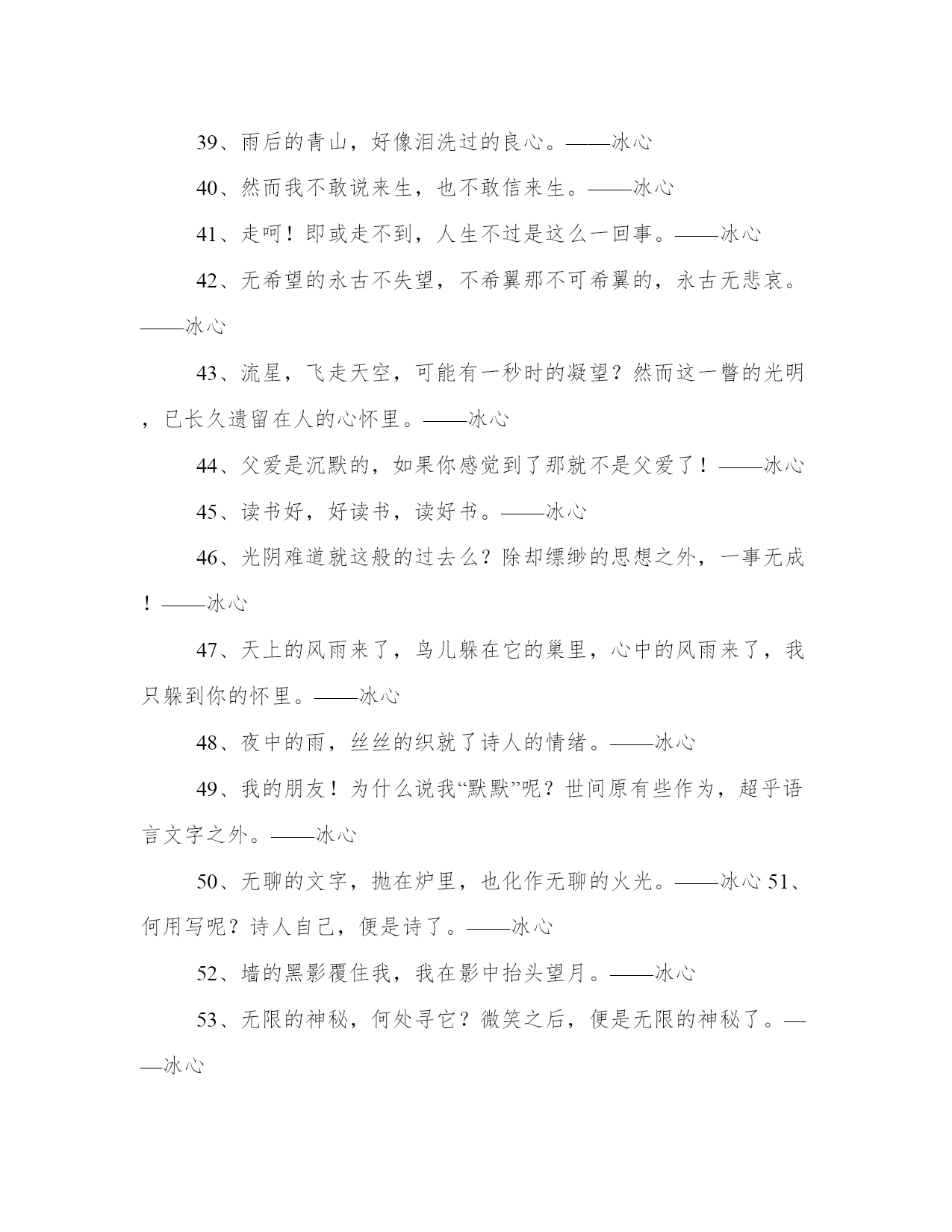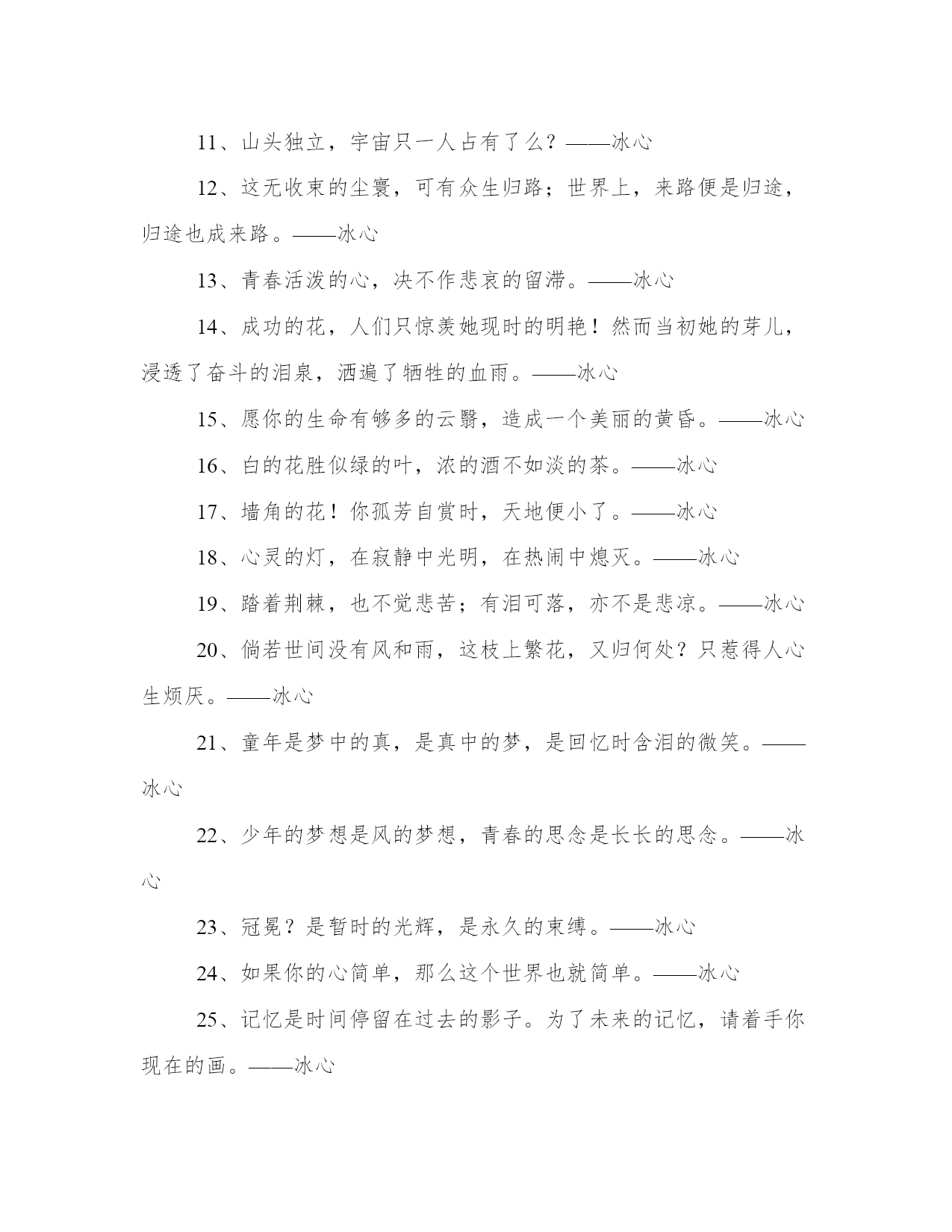 2024年冰心名言警句工作汇报1、冷静的心,在任何环境里,都能建立了更深微的世界。——冰心2、愿你生命中有够多的云翳,来造成一个美丽的黄昏。——冰心3、童年呵!是梦中的真,是真中的梦,是回忆时含泪的微笑。——冰心4、愿生命中有足够多的云翳,来造就一个美丽的黄昏。——冰心5、一个人只要热爱自己的祖国,有一颗爱国之心,就什么事情都能解决。什么苦楚,什么冤屈都受得了。——冰心6、假如生命是乏味的,我怕有来生!假如生命是有趣的,今生已是满足的了。——冰心7、快乐是一抹微云,痛苦是压城的乌云,这不同的云彩,在你生命的天边重叠着,在“夕阳无限好”的时候,就给你造成一个美丽的黄昏。——冰心8、凄清的新月,射到我的床上,瘦长的载霜的白杨树影,参错满窗。——冰心9、我们都是长行的旅客向着同一归宿。——冰心10、遍地是雪,空中犹自飞舞,湖上凝阴,意态清绝。——冰心11、山头独立,宇宙只一人占有了么?——冰心12、这无收束的尘寰,可有众生归路;世界上,来路便是归途,归途也成来路。——冰心13、青春活泼的心,决不作悲哀的留滞。——冰心14、成功的花,人们只惊羡她现时的明艳!然而当初她的芽儿,浸透了奋斗的泪泉,洒遍了牺牲的血雨。——冰心15、愿你的生命有够多的云翳,造成一个美丽的黄昏。——冰心16、白的花胜似绿的叶,浓的酒不如淡的茶。——冰心17、墙角的花!你孤芳自赏时,天地便小了。——冰心18、心灵的灯,在寂静中光明,在热闹中熄灭。——冰心19、踏着荆棘,也不觉悲苦;有泪可落,亦不是悲凉。——冰心20、倘若世间没有风和雨,这枝上繁花,又归何处?只惹得人心生烦厌。——冰心21、童年是梦中的真,是真中的梦,是回忆时含泪的微笑。——冰心22、少年的梦想是风的梦想,青春的思念是长长的思念。——冰心23、冠冕?是暂时的光辉,是永久的束缚。——冰心24、如果你的心简单,那么这个世界也就简单。——冰心25、记忆是时间停留在过去的影子。为了未来的记忆,请着手你现在的画。——冰心26、只是一颗孤星罢了!在无边的黑暗里已写尽了宇宙的寂寞。——冰心27、走在生命的两旁,随时撒种,随时开花。让穿枝拂叶的行人,踏着荆棘,不觉得痛苦,有泪可落,却不是悲凉。——冰心28、修养的花儿在寂静中开过去了,成功的果子便要在光明里结实。——冰心29、沉默着罢!在这无穷的世界上弱小的我,原只当微笑不应放言。——冰心30、眼愈多流泪而愈见清明,心因饱经忧患而愈加温厚。——冰心31、为着后来的回忆,小心着意地描绘你现在的图画。——冰心32、群里的欢笑掩不过静里的悲哀。——冰心33、大海的水,是不能温热的;孤傲的心,是不能软化的。——冰心34、聪明人!在这漠漠的世上,只能提着“自信”的灯儿,进行在黑暗里。——冰心35、襟上兰花气息,绕到梦魂深处。——冰心36、人从枝上折下花来,供在瓶里。到了结果的时候,却对着空枝叹息。——冰心37、沉默里,充满了胜利者的凯歌。——冰心38、有爱,就有了一切。——冰心39、雨后的青山,好像泪洗过的良心。——冰心40、然而我不敢说来生,也不敢信来生。——冰心41、走呵!即或走不到,人生不过是这么一回事。——冰心42、无希望的永古不失望,不希翼那不可希翼的,永古无悲哀。——冰心43、流星,飞走天空,可能有一秒时的凝望?然而这一瞥的光明,已长久遗留在人的心怀里。——冰心44、父爱是沉默的,如果你感觉到了那就不是父爱了!——冰心45、读书好,好读书,读好书。——冰心46、光阴难道就这般的过去么?除却缥缈的思想之外,一事无成!——冰心47、天上的风雨来了,鸟儿躲在它的巢里,心中的风雨来了,我只躲到你的怀里。——冰心48、夜中的雨,丝丝的织就了诗人的情绪。——冰心49、我的朋友!为什么说我“默默”呢?世间原有些作为,超乎语言文字之外。——冰心50、无聊的文字,抛在炉里,也化作无聊的火光。——冰心51、何用写呢?诗人自己,便是诗了。——冰心52、墙的黑影覆住我,我在影中抬头望月。——冰心53、无限的神秘,何处寻它?微笑之后,便是无限的神秘了。——冰心54、愿再不为谁动心,也永不做谁的梦,无希望的永远不失望,不希冀那不可希冀的,永古不悲哀!——冰心55、黑暗不是阴霾,我恨阴霾,却爱黑暗。——冰心56、青年人!信你自己罢!只有你自己是真实的,也只有你自己能创造你自己。——冰心57、我和你,是无限之生中的偶遇,也是无限之生中的永别;再来时,万千同类中,何处更寻你?——冰心58、聪明人,文字是空洞的,言语是虚伪的;你要引导你的朋友,只在你,自然流露的行为上。——冰心59、有多少有恨无情之泪,乘今夜几点星辉挥洒。——冰心60、窗外是苦雨,窗内是孤灯。——冰心61、父亲呵