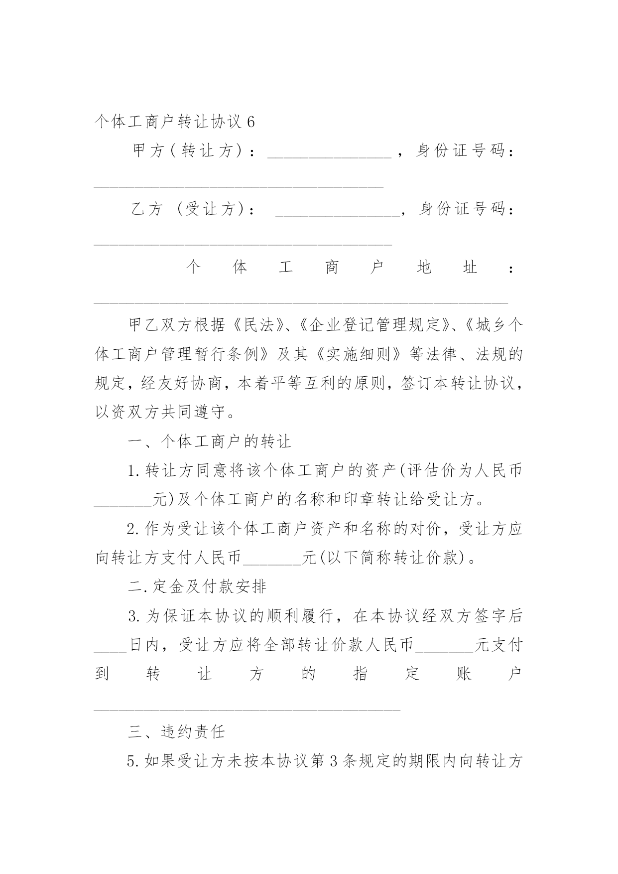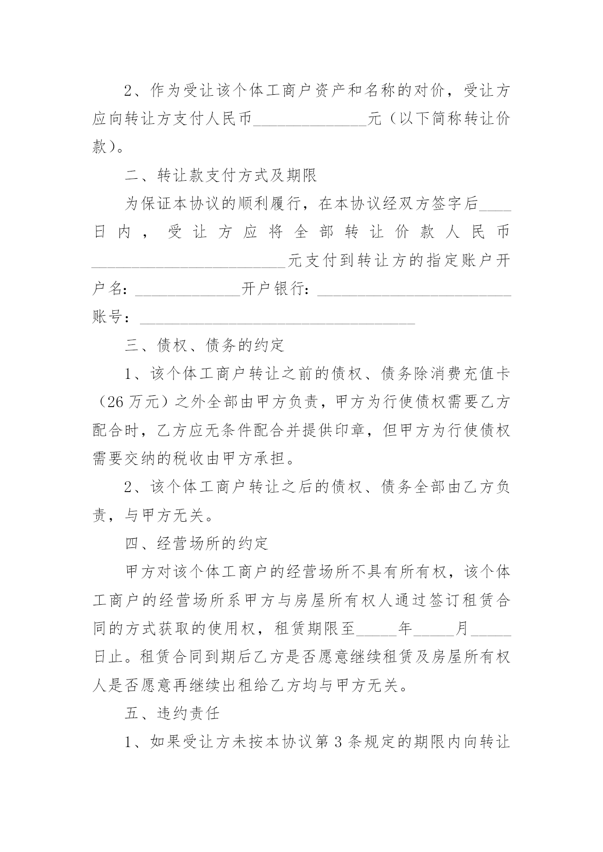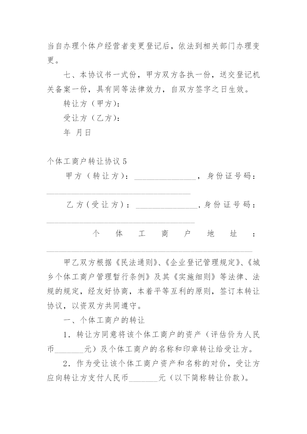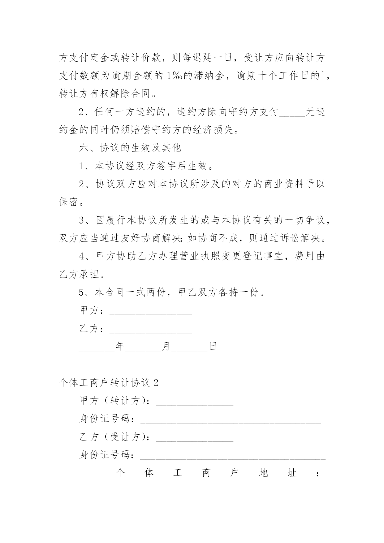 个体工商户转让协议随着社会一步步向前发展,协议在生活中的使用越来越广泛,签订协议能够保证双方合作愉快。想写协议却不知道该请教谁?下面是小编收集整理的个体工商户转让协议,仅供参考,大家一起来看看吧。个体工商户转让协议1甲方(转让方):__________身份证号码:________________乙方(受让方):__________身份证号码:______________个体工商户地址:___________________________________个体工商户名称:____________________________________甲乙双方根据《民法》、《企业登记管理规定》、《城乡个体工商户管理暂行条例》及其《实施细则》等法律、法规的规定,经友好协商,本着平等互利的原则,签订本转让协议,以资双方共同遵守。一、个体工商户的转让1、转让方同意以人民币_______________元的价格将该个体工商户的资产及个体工商户的名称和印章转让给受让方。2、作为受让该个体工商户资产和名称的对价,受让方应向转让方支付人民币______________元(以下简称转让价款)。二、转让款支付方式及期限为保证本协议的顺利履行,在本协议经双方签字后____日内,受让方应将全部转让价款人民币________________________元支付到转让方的指定账户开户名:_____________开户银行:________________________账号:__________________________________三、债权、债务的约定1、该个体工商户转让之前的债权、债务除消费充值卡(26万元)之外全部由甲方负责,甲方为行使债权需要乙方配合时,乙方应无条件配合并提供印章,但甲方为行使债权需要交纳的税收由甲方承担。2、该个体工商户转让之后的债权、债务全部由乙方负责,与甲方无关。四、经营场所的约定甲方对该个体工商户的经营场所不具有所有权,该个体工商户的经营场所系甲方与房屋所有权人通过签订租赁合同的方式获取的使用权,租赁期限至_____年_____月_____日止。租赁合同到期后乙方是否愿意继续租赁及房屋所有权人是否愿意再继续出租给乙方均与甲方无关。五、违约责任1、如果受让方未按本协议第3条规定的期限内向转让方支付定金或转让价款,则每迟延一日,受让方应向转让方支付数额为逾期金额的1‰的滞纳金,逾期十个工作日的`,转让方有权解除合同。2、任何一方违约的,违约方除向守约方支付_____元违约金的同时仍须赔偿守约方的经济损失。六、协议的生效及其他1、本协议经双方签字后生效。2、协议双方应对本协议所涉及的对方的商业资料予以保密。3、因履行本协议所发生的或与本协议有关的一切争议,双方应当通过友好协商解决;如协商不成,则通过诉讼解决。4、甲方协助乙方办理营业执照变更登记事宜,费用由乙方承担。5、本合同一式两份,甲乙双方各持一份。甲方:________________乙方:_______________________年_______月_______日个体工商户转让协议2甲方(转让方):_______________身份证号码:___________________________________乙方(受让方):_______________身份证号码:____________________________________个体工商户地址:__________________________________________________甲乙双方根据《民法》、《企业登记管理规定》、《城乡个体工商户管理暂行条例》及其《实施细则》等法律、法规的规定,经友好协商,本着平等互利的原则,签订本转让协议,以资双方共同遵守。一、个体工商户的转让1、转让方同意将该个体工商户的资产(评估价为人民币_______元)及个体工商户的名称和印章转让给受让方。2、作为受让该个体工商户资产和名称的对价,受让方应向转让方支付人民币_______元(以下简称转让价款)。二、定金及付款安排3、为保证本协议的顺利履行,在本协议经双方签字后____日内,受让方应将全部转让价款人民币_______元支付到转让方的指定账户_____________________________________三、违约责任5、如果受让方未按本协议第3条规定的期限内向转让方支付定金或转让价款,则每迟延一日,受让方应向转让方支付数额为逾期金额的1‰的滞纳金,逾期十个工作日的,转让方有权解除合同。6、一方违约,经另一方发函催告并明确告知所将遭受的损失的`,违约方仍拒不履行的,违约方须赔偿守约方该经济损失。四、协议的生效及其他7、本协议经双方签字后生效。8、协议双方应对本协议所涉及的对方的商业资料予以保密,该保密义务