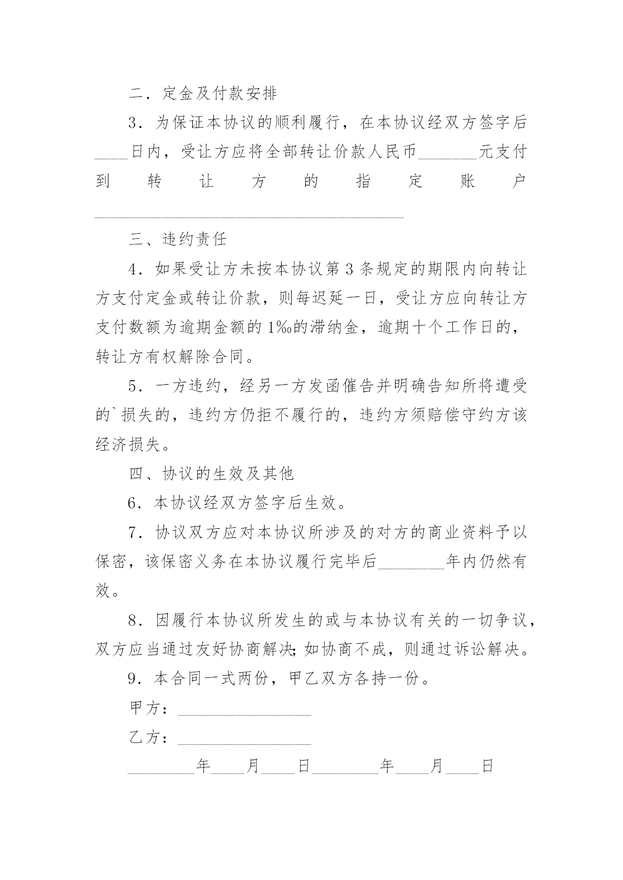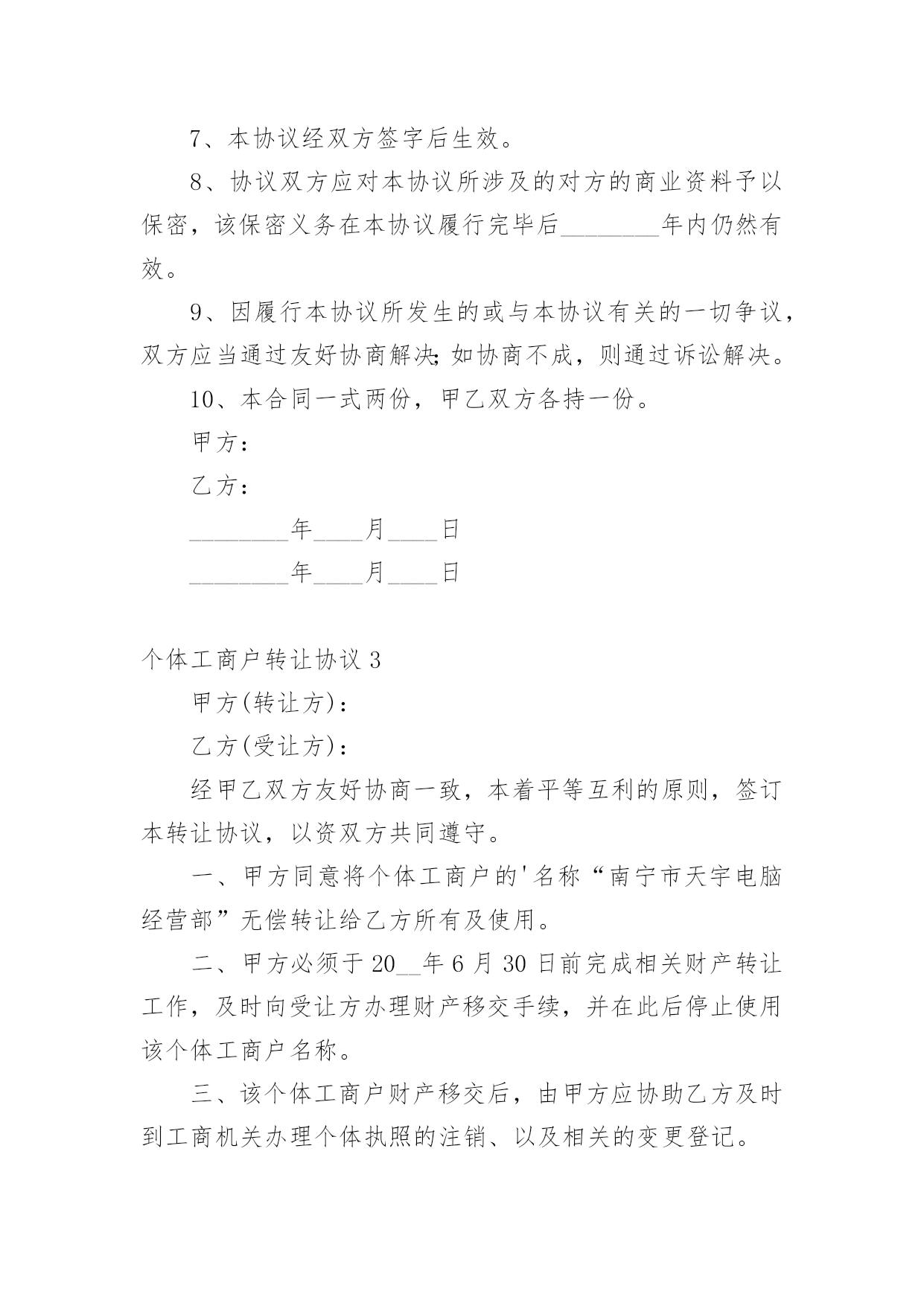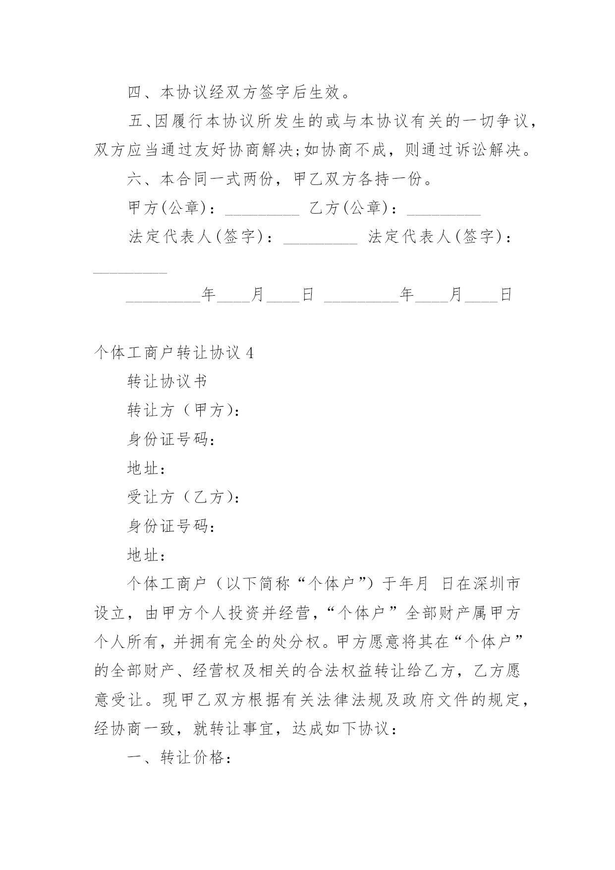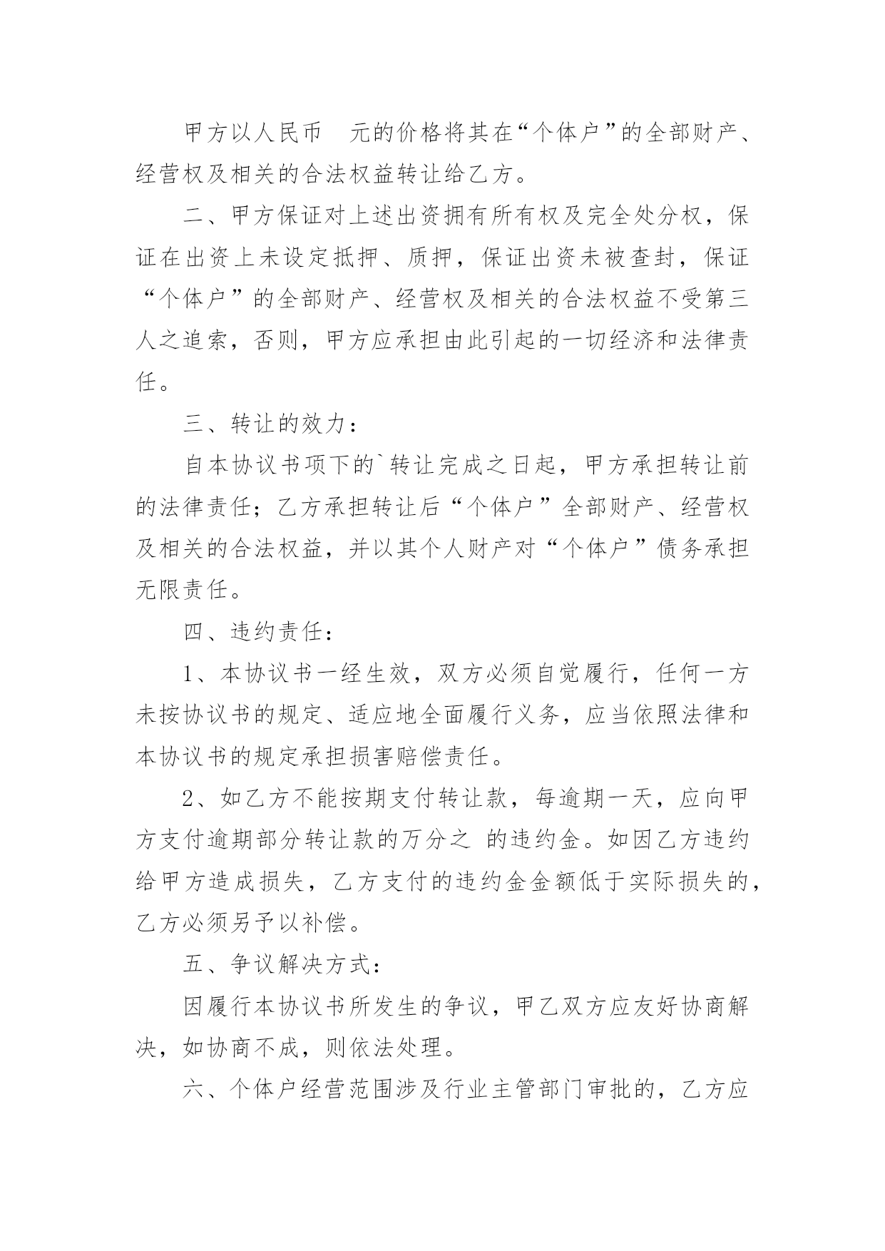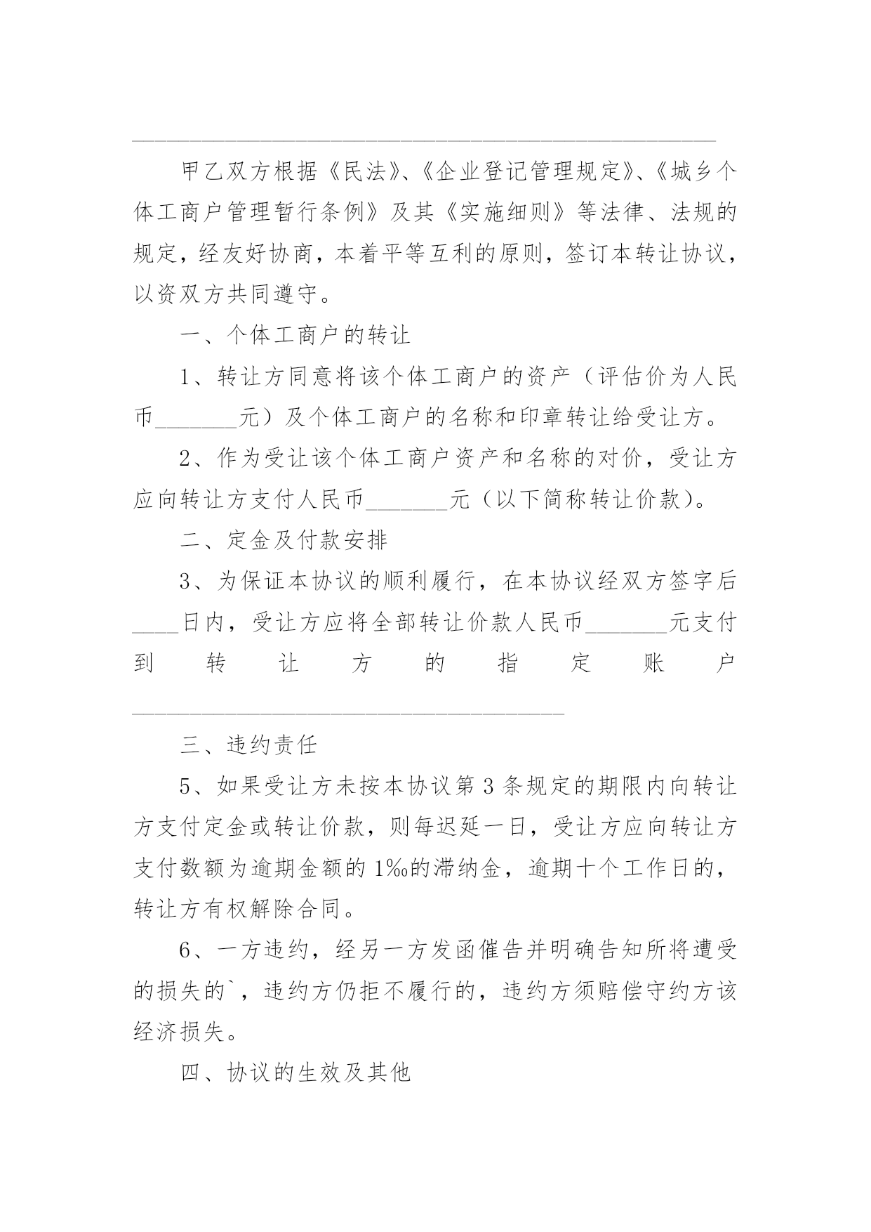 个体工商户转让协议随着社会一步步向前发展,协议在生活中的使用越来越广泛,签订协议能够保证双方合作愉快。想写协议却不知道该请教谁?下面是小编收集整理的个体工商户转让协议,仅供参考,大家一起来看看吧。个体工商户转让协议1甲方(转让方):__________身份证号码:________________乙方(受让方):__________身份证号码:______________个体工商户地址:___________________________________个体工商户名称:____________________________________甲乙双方根据《民法》、《企业登记管理规定》、《城乡个体工商户管理暂行条例》及其《实施细则》等法律、法规的规定,经友好协商,本着平等互利的原则,签订本转让协议,以资双方共同遵守。一、个体工商户的转让1、转让方同意以人民币_______________元的价格将该个体工商户的资产及个体工商户的名称和印章转让给受让方。2、作为受让该个体工商户资产和名称的对价,受让方应向转让方支付人民币______________元(以下简称转让价款)。二、转让款支付方式及期限为保证本协议的顺利履行,在本协议经双方签字后____日内,受让方应将全部转让价款人民币________________________元支付到转让方的指定账户开户名:_____________开户银行:________________________账号:__________________________________三、债权、债务的约定1、该个体工商户转让之前的债权、债务除消费充值卡(26万元)之外全部由甲方负责,甲方为行使债权需要乙方配合时,乙方应无条件配合并提供印章,但甲方为行使债权需要交纳的税收由甲方承担。2、该个体工商户转让之后的债权、债务全部由乙方负责,与甲方无关。四、经营场所的约定甲方对该个体工商户的经营场所不具有所有权,该个体工商户的经营场所系甲方与房屋所有权人通过签订租赁合同的方式获取的使用权,租赁期限至_____年_____月_____日止。租赁合同到期后乙方是否愿意继续租赁及房屋所有权人是否愿意再继续出租给乙方均与甲方无关。五、违约责任1、如果受让方未按本协议第3条规定的期限内向转让方支付定金或转让价款,则每迟延一日,受让方应向转让方支付数额为逾期金额的1‰的滞纳金,逾期十个工作日的`,转让方有权解除合同。2、任何一方违约的,违约方除向守约方支付_____元违约金的同时仍须赔偿守约方的经济损失。六、协议的生效及其他1、本协议经双方签字后生效。2、协议双方应对本协议所涉及的对方的商业资料予以保密。3、因履行本协议所发生的或与本协议有关的一切争议,双方应当通过友好协商解决;如协商不成,则通过诉讼解决。4、甲方协助乙方办理营业执照变更登记事宜,费用由乙方承担。5、本合同一式两份,甲乙双方各持一份。甲方:________________乙方:_______________________年_______月_______日个体工商户转让协议2甲方(转让方):_______________身份证号码:___________________________________乙方(受让方):_______________身份证号码:____________________________________个体工商户地址:__________________________________________________甲乙双方根据《民法》、《企业登记管理规定》、《城乡个体工商户管理暂行条例》及其《实施细则》等法律、法规的规定,经友好协商,本着平等互利的原则,签订本转让协议,以资双方共同遵守。一、个体工商户的转让1、转让方同意将该个体工商户的资产(评估价为人民币_______元)及个体工商户的名称和印章转让给受让方。2、作为受让该个体工商户资产和名称的对价,受让方应向转让方支付人民币_______元(以下简称转让价款)。二、定金及付款安排3、为保证本协议的顺利履行,在本协议经双方签字后____日内,受让方应将全部转让价款人民币_______元支付到转让方的指定账户_____________________________________三、违约责任5、如果受让方未按本协议第3条规定的期限内向转让方支付定金或转让价款,则每迟延一日,受让方应向转让方支付数额为逾期金额的1‰的滞纳金,逾期十个工作日的,转让方有权解除合同。6、一方违约,经另一方发函催告并明确告知所将遭受的损失的`,违约方仍拒不履行的,违约方须赔偿守约方该经济损失。四、协议的生效及其他7、本协议经双方签字后生效。8、协议双方应对本协议所涉及的对方的商业资料予以保密,该保密义务