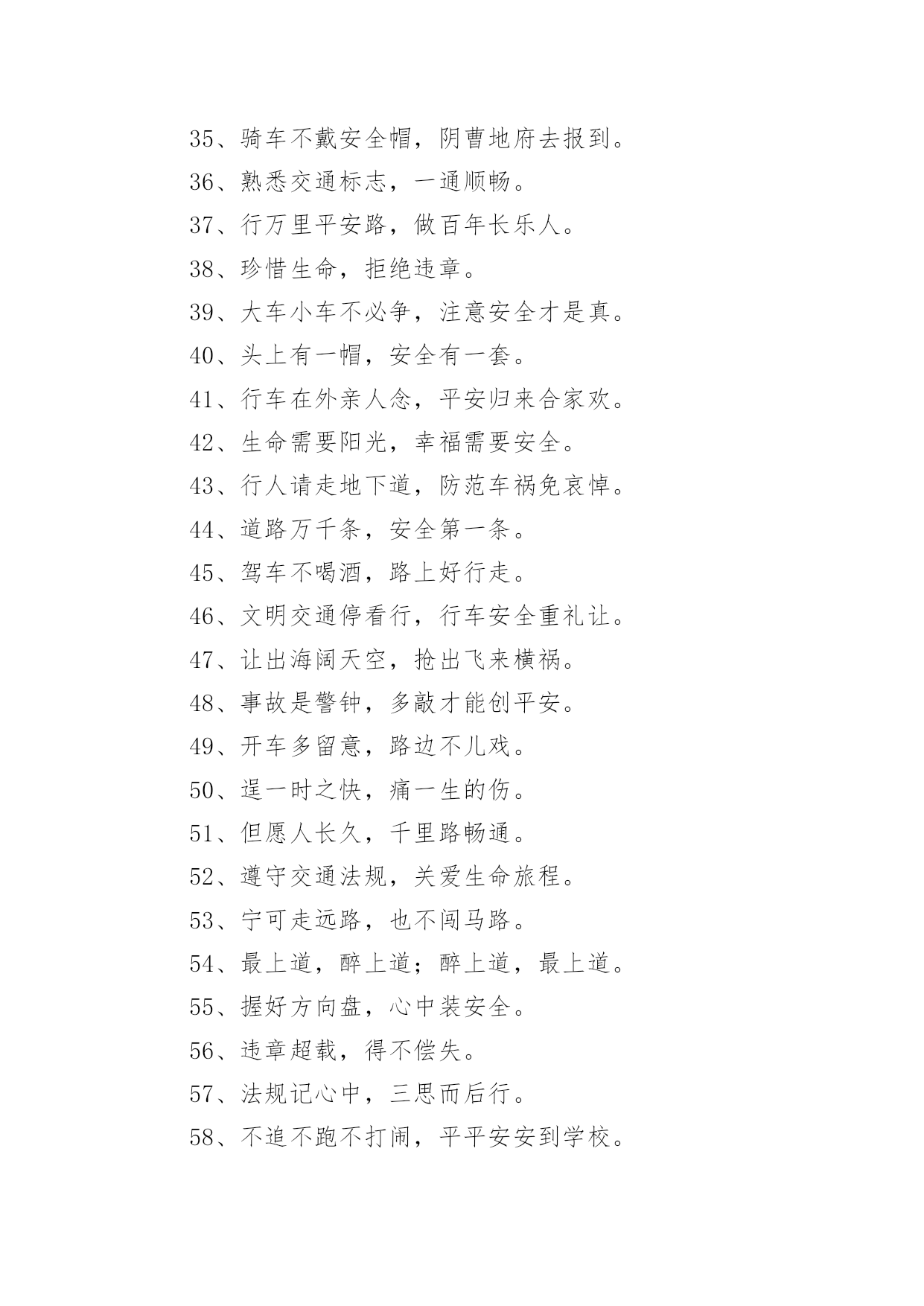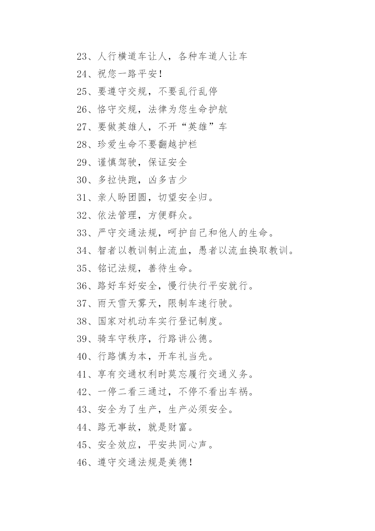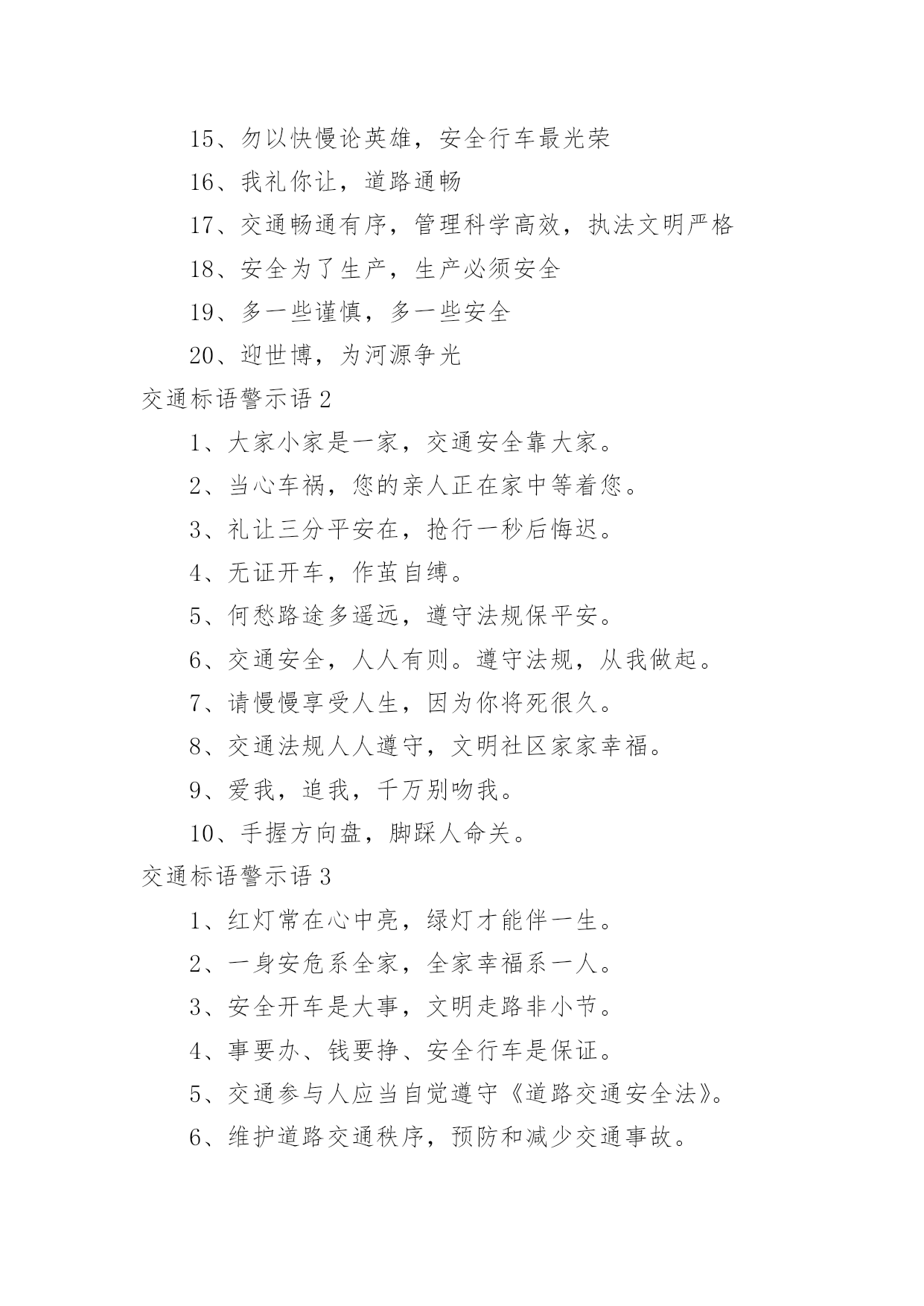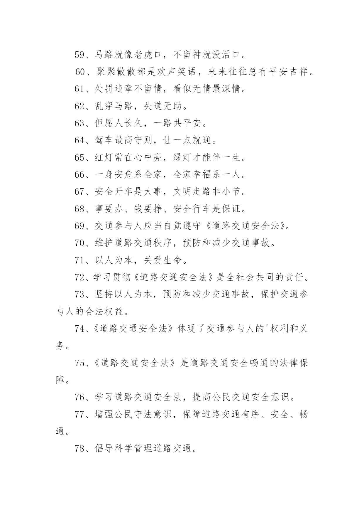 交通标语警示语交通标语警示语在日常学习、工作抑或是生活中,大家都对那些朗朗上口的标语很是熟悉吧,标语在一定程度上反映了社会经济制度的本质和社会的文明程度,它的意义十分重大。还苦于找不到好的标语?以下是小编为大家整理的交通标语警示语,欢迎大家分享。交通标语警示语11、交通安全抛脑后,交通事故在前头2、您保持车况良好,车容整洁3、交通安全在我心中!4、加强综合治理,保障交通安全5、学龄前儿童上街要有成年人带领6、穿马路,跨护栏,少公德,多危险7、上有老,下有小,出了交通事故不得了8、宣传交通法规,提高交通文明意识9、最大的浪费是事故,最大的节约是安全10、行横道是您横过马路的安全带!11、人行道车莫占,车行道人莫钻12、您是河源的`客人,您是遵章守规的楷模13、酒后开车,危险万分!14、行经路口要观望,拐弯示意要礼让15、勿以快慢论英雄,安全行车最光荣16、我礼你让,道路通畅17、交通畅通有序,管理科学高效,执法文明严格18、安全为了生产,生产必须安全19、多一些谨慎,多一些安全20、迎世博,为河源争光交通标语警示语21、大家小家是一家,交通安全靠大家。2、当心车祸,您的亲人正在家中等着您。3、礼让三分平安在,抢行一秒后悔迟。4、无证开车,作茧自缚。5、何愁路途多遥远,遵守法规保平安。6、交通安全,人人有则。遵守法规,从我做起。7、请慢慢享受人生,因为你将死很久。8、交通法规人人遵守,文明社区家家幸福。9、爱我,追我,千万别吻我。10、手握方向盘,脚踩人命关。交通标语警示语31、红灯常在心中亮,绿灯才能伴一生。2、一身安危系全家,全家幸福系一人。3、安全开车是大事,文明走路非小节。4、事要办、钱要挣、安全行车是保证。5、交通参与人应当自觉遵守《道路交通安全法》。6、维护道路交通秩序,预防和减少交通事故。7、以人为本,关爱生命。8、学习贯彻《道路交通安全法》是全社会共同的责任。9、坚持以人为本,预防和减少交通事故,保护交通参与人的.合法权益。10、《道路交通安全法》体现了交通参与人的权利和义务。11、《道路交通安全法》是道路交通安全畅通的法律保障。12、学习道路交通安全法,提高公民交通安全意识。13、增强公民守法意识,保障道路交通有序、安全、畅通。14、倡导科学管理道路交通。15、提高交通警察素质,公正、严格、文明、高效执法。交通标语警示语41、驾车打瞌睡,一觉起不来。2、礼让礼让,人车无恙。3、一时快,一世毁礼让行驶,交通顺畅。4、交通规则若遵守,全国各地安心走。5、维护交通秩序,争做文明公民。6、手拉手打造文明交通,心连心创建和谐社会。7、遵守交通法,安全你我他。8、只要你我多用心,交通恶运不降临。9、酒后驾车罚款重;肇事丧命亲人痛。10、生命只有一次,平安伴君一生。11、遵守交通法规,上路绝不吃亏。12、过马路不着急,红灯停绿灯行。13、人人关心交通安全,路路小心伴您平安。14、心灵少一丝麻痹,安全就多一道护栏。15、文明行车千里共婵娟,遵纪守法万家得团圆。16、酒后驾车,拿命。17、让一下海阔天空,退一下保百年身。18、人行道莫侵占,车行道人莫闯。19、高速公路,行驶适速。20、赠人玫瑰,手留余香,予人礼让,一生平安。21、交通标志百百款,重点是你看不看。22、安全是琴弦,常拉只为奏和谐。23、贪一时之快,危险跟着来。24、千里之行,慎于足下。25、没有红灯停,哪来绿灯行。26、高速公路莫超速,生命安全保得住。27、彼此让一让,安全有保障。28、酒喝过似泥泞,车开上道如赌命。29、开车拨接手机,如同手持。30、酒后开车,先醉人后坠车。31、开车不系安全带,牛头马面在等待。32、爱妻爱子爱家庭,无视交规等于零。33、宁绕百步远,不抢一步险。34、遵守交通法规,安全伴你永远。35、骑车不戴安全帽,阴曹地府去报到。36、熟悉交通标志,一通顺畅。37、行万里平安路,做百年长乐人。38、珍惜生命,拒绝违章。39、大车小车不必争,注意安全才是真。40、头上有一帽,安全有一套。41、行车在外亲人念,平安归来合家欢。42、生命需要阳光,幸福需要安全。43、行人请走地下道,防范车祸免哀悼。44、道路万千条,安全第一条。45、驾车不喝酒,路上好行走。46、文明交通停看行,行车安全重礼让。47、让出海阔天空,抢出飞来横祸。48、事故是警钟,多敲才能创平安。49、开车多留意,路边不儿戏。50、逞一时之快,痛一生的伤。51、但愿人长久,千里路畅通。52、遵守交通法规,关爱生命旅程。53、宁可走远路,也不闯马路。54、最上道,醉上道;醉上道,最上道。55、握好方向盘,心中装安全。56、违章超载,得不偿失。57、法规记心中,三思而后行。58、不追不跑不打闹,平平安安到学校。59、马路就像老虎口,不留神就没活口。60、聚聚散散都是欢声笑语,来来往往总有