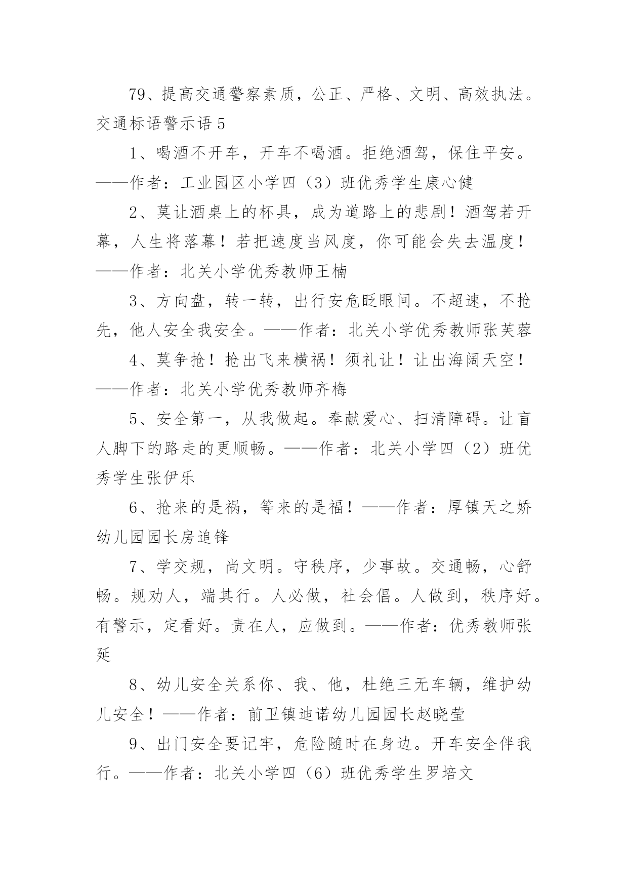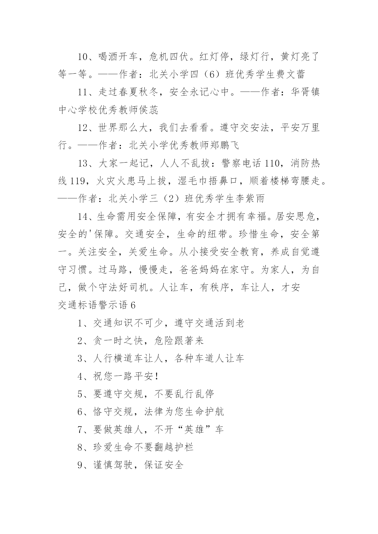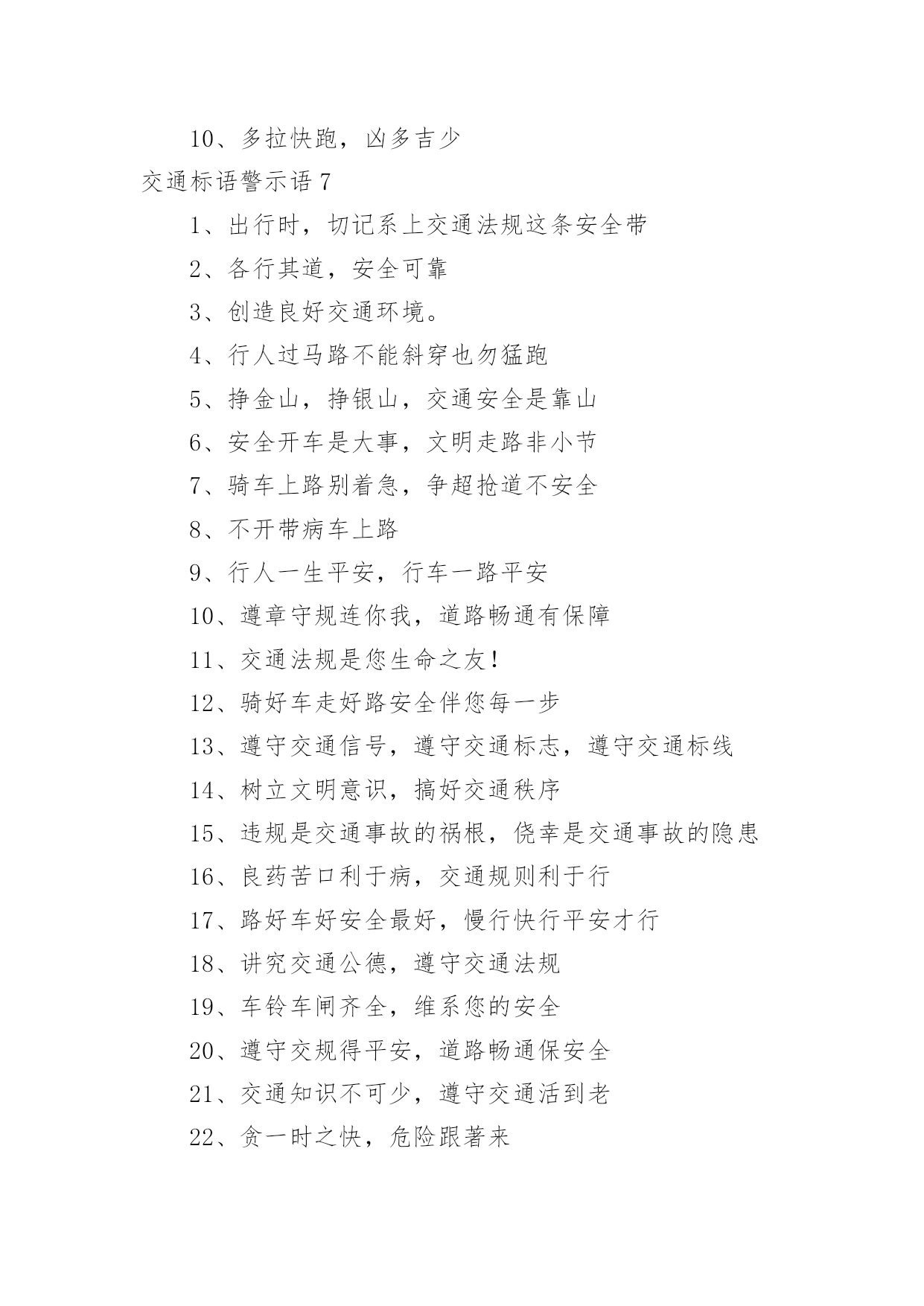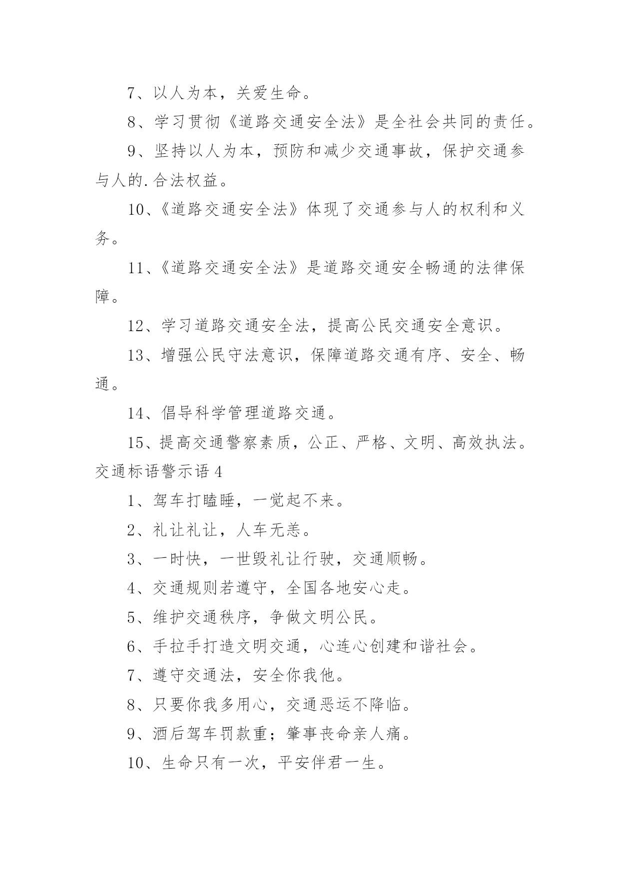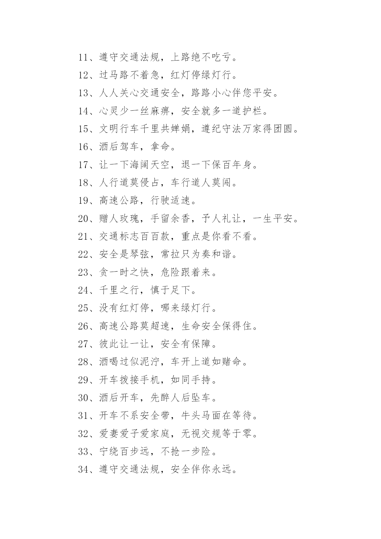 交通标语警示语交通标语警示语在日常学习、工作抑或是生活中,大家都对那些朗朗上口的标语很是熟悉吧,标语在一定程度上反映了社会经济制度的本质和社会的文明程度,它的意义十分重大。还苦于找不到好的标语?以下是小编为大家整理的交通标语警示语,欢迎大家分享。交通标语警示语11、交通安全抛脑后,交通事故在前头2、您保持车况良好,车容整洁3、交通安全在我心中!4、加强综合治理,保障交通安全5、学龄前儿童上街要有成年人带领6、穿马路,跨护栏,少公德,多危险7、上有老,下有小,出了交通事故不得了8、宣传交通法规,提高交通文明意识9、最大的浪费是事故,最大的节约是安全10、行横道是您横过马路的安全带!11、人行道车莫占,车行道人莫钻12、您是河源的`客人,您是遵章守规的楷模13、酒后开车,危险万分!14、行经路口要观望,拐弯示意要礼让15、勿以快慢论英雄,安全行车最光荣16、我礼你让,道路通畅17、交通畅通有序,管理科学高效,执法文明严格18、安全为了生产,生产必须安全19、多一些谨慎,多一些安全20、迎世博,为河源争光交通标语警示语21、大家小家是一家,交通安全靠大家。2、当心车祸,您的亲人正在家中等着您。3、礼让三分平安在,抢行一秒后悔迟。4、无证开车,作茧自缚。5、何愁路途多遥远,遵守法规保平安。6、交通安全,人人有则。遵守法规,从我做起。7、请慢慢享受人生,因为你将死很久。8、交通法规人人遵守,文明社区家家幸福。9、爱我,追我,千万别吻我。10、手握方向盘,脚踩人命关。交通标语警示语31、红灯常在心中亮,绿灯才能伴一生。2、一身安危系全家,全家幸福系一人。3、安全开车是大事,文明走路非小节。4、事要办、钱要挣、安全行车是保证。5、交通参与人应当自觉遵守《道路交通安全法》。6、维护道路交通秩序,预防和减少交通事故。7、以人为本,关爱生命。8、学习贯彻《道路交通安全法》是全社会共同的责任。9、坚持以人为本,预防和减少交通事故,保护交通参与人的.合法权益。10、《道路交通安全法》体现了交通参与人的权利和义务。11、《道路交通安全法》是道路交通安全畅通的法律保障。12、学习道路交通安全法,提高公民交通安全意识。13、增强公民守法意识,保障道路交通有序、安全、畅通。14、倡导科学管理道路交通。15、提高交通警察素质,公正、严格、文明、高效执法。交通标语警示语41、驾车打瞌睡,一觉起不来。2、礼让礼让,人车无恙。3、一时快,一世毁礼让行驶,交通顺畅。4、交通规则若遵守,全国各地安心走。5、维护交通秩序,争做文明公民。6、手拉手打造文明交通,心连心创建和谐社会。7、遵守交通法,安全你我他。8、只要你我多用心,交通恶运不降临。9、酒后驾车罚款重;肇事丧命亲人痛。10、生命只有一次,平安伴君一生。11、遵守交通法规,上路绝不吃亏。12、过马路不着急,红灯停绿灯行。13、人人关心交通安全,路路小心伴您平安。14、心灵少一丝麻痹,安全就多一道护栏。15、文明行车千里共婵娟,遵纪守法万家得团圆。16、酒后驾车,拿命。17、让一下海阔天空,退一下保百年身。18、人行道莫侵占,车行道人莫闯。19、高速公路,行驶适速。20、赠人玫瑰,手留余香,予人礼让,一生平安。21、交通标志百百款,重点是你看不看。22、安全是琴弦,常拉只为奏和谐。23、贪一时之快,危险跟着来。24、千里之行,慎于足下。25、没有红灯停,哪来绿灯行。26、高速公路莫超速,生命安全保得住。27、彼此让一让,安全有保障。28、酒喝过似泥泞,车开上道如赌命。29、开车拨接手机,如同手持。30、酒后开车,先醉人后坠车。31、开车不系安全带,牛头马面在等待。32、爱妻爱子爱家庭,无视交规等于零。33、宁绕百步远,不抢一步险。34、遵守交通法规,安全伴你永远。35、骑车不戴安全帽,阴曹地府去报到。36、熟悉交通标志,一通顺畅。37、行万里平安路,做百年长乐人。38、珍惜生命,拒绝违章。39、大车小车不必争,注意安全才是真。40、头上有一帽,安全有一套。41、行车在外亲人念,平安归来合家欢。42、生命需要阳光,幸福需要安全。43、行人请走地下道,防范车祸免哀悼。44、道路万千条,安全第一条。45、驾车不喝酒,路上好行走。46、文明交通停看行,行车安全重礼让。47、让出海阔天空,抢出飞来横祸。48、事故是警钟,多敲才能创平安。49、开车多留意,路边不儿戏。50、逞一时之快,痛一生的伤。51、但愿人长久,千里路畅通。52、遵守交通法规,关爱生命旅程。53、宁可走远路,也不闯马路。54、最上道,醉上道;醉上道,最上道。55、握好方向盘,心中装安全。56、违章超载,得不偿失。57、法规记心中,三思而后行。58、不追不跑不打闹,平平安安到学校。59、马路就像老虎口,不留神就没活口。60、聚聚散散都是欢声笑语,来来往往总有