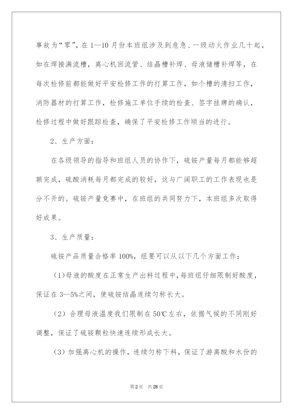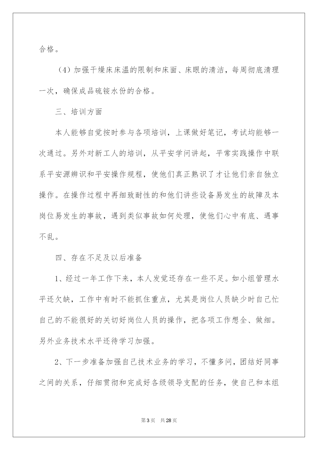 第PAGE\*Arabic\*MERGEFORMAT28页共NUMPAGES\*Arabic\*MERGEFORMAT28页第PAGE\*MERGEFORMAT28页共NUMPAGES\*MERGEFORMAT28页第PAGE\*MERGEFORMAT28页共NUMPAGES\*MERGEFORMAT28页第PAGE\*MERGEFORMAT28页共NUMPAGES\*MERGEFORMAT28页第PAGE\*MERGEFORMAT28页共NUMPAGES\*MERGEFORMAT28页第PAGE\*MERGEFORMAT28页共NUMPAGES\*MERGEFORMAT28页第PAGE\*MERGEFORMAT28页共NUMPAGES\*MERGEFORMAT28页第PAGE\*MERGEFORMAT28页共NUMPAGES\*MERGEFORMAT28页第PAGE\*MERGEFORMAT28页共NUMPAGES\*MERGEFORMAT28页第PAGE\*MERGEFORMAT28页共NUMPAGES\*MERGEFORMAT28页第PAGE\*MERGEFORMAT28页共NUMPAGES\*MERGEFORMAT28页2022企业技术员个人工作总结企业技术员个人工作总结总结是把肯定阶段内的有关状况分析探讨,做出有指导性的阅历方法以及结论的书面材料,写总结有利于我们学习和工作实力的提高,不如马上行动起来写一份总结吧。但是却发觉不知道该写些什么,以下是我整理的企业技术员个人工作总结,仅供参考,希望能够帮助到大家。企业技术员个人工作总结1本人能遵守好各项规章制度,按时上下班,无迟到、早退现象。班中不做与工作无关的事严格根据操作规程操作,团结好同事,相互关切并仔细贯彻和执行好上级领导的有关文件精神和要求,自觉维护好企业形象。二、平安生产方面1、平安方面:本人上班前能够自觉的穿戴好劳保用品,仔细参与各项平安培训,做好笔记。坚固树立起“平安第一,预防为主”的思想,并仔细贯彻到每位组员,真正做到生产在忙平安不忘。从而保证了本组各类平安事故为“零”,在1—10月份本班组涉及到危急、一级动火作业几十起,如在焊接满流槽,离心机回流管、结晶槽补焊、母液储槽补焊等,在每次检修前都能做好平安检修工作的打算工作,如个槽的清扫工作,消防器材的打算工作,检修施工单位手续的检查、签字挂牌的确认,检修过程中做好跟踪检查,确保了平安检修工作顺当的进行。2、生产方面:在各级领导的指导和班组人员的协作下,硫铵产量每月都能够超额完成,硫酸消耗每月都完成的较好,这与广阔职工的工作表现也是分不开的。硫铵产量竞赛中,在班组的共同努力下,本班组多次取得好成果。3、生产质量:硫铵产品质量合格率100%,组要可以从以下几个方面工作:(1)母液的酸度在正常生产出料过程中,每班组仔细限制好酸度,保证在3—5%之间,使硫铵结晶连续匀称长大。(2)合理母液温度我们限制在50℃左右,依据气候的不同刚好调整,保证了硫铵颗粒快速连续形成长大。(3)加强离心机的操作,连续匀称下料,保证了游离酸和水份的合格。(4)加强干燥床床温的限制和床面、床眼的清洁,每周彻底清理一次,确保成品硫铵水份的合格。三、培训方面本人能够自觉按时参与各项培训,上课做好笔记,考试均能够一次通过。另外对新工人的培训,从平安学问讲起,平常实践操作中联系平安源辨识和平安操作规程,使他们真正熟识了才让他们亲自独立操作。在操作过程中再细致耐性的和他们讲些设备易发生的故障及本岗位易发生的事故,遇到类似事故如何处理,使他们心中有底、遇事不乱。四、存在不足及以后准备1、经过一年工作下来,本人发觉还存在一些不足。如小组管理水平还欠缺,工作中有时不能抓住重点,尤其是岗位人员缺少时自己忙自己的不能很好的关切好岗位人员的操作,把各项工作想全、做细。另外业务技术水平还待学习加强。2、下一步准备加强自己技术业务的学习,不懂多问,团结好同事之间的关系,仔细贯彻和完成好各级领导支配的任务,使自己和本组有新的进步。企业技术员个人工作总结2参与工作已多年了,依据自身工作的实际情景,我对自我的工作做出分析评定,总结阅历教训,提出改善方法,以便自我在今后的工作中扬长避短,为今后不断改善工作方法,提高工作效率供应依据,就本人的工作总结如下:作为一名技术人员,我将工作定位为帮助好技术负责人的工作和不断的自我学习充溢,在参加建设的工程中,在完成工程的施工测量放线的同时,还帮助技术负责人编制施工方案、技术交底,并负责工程技术资料的指导与编制,和施工员一齐进行现场质量检查,以及帮助平安员落实、督促、检查施工现