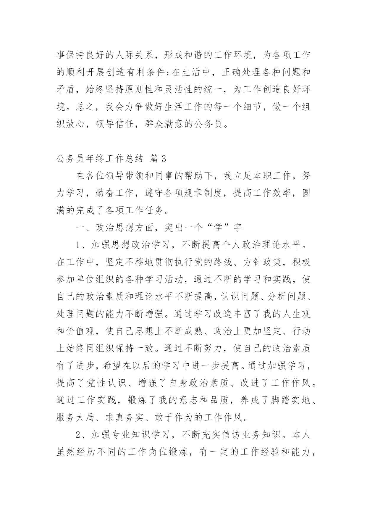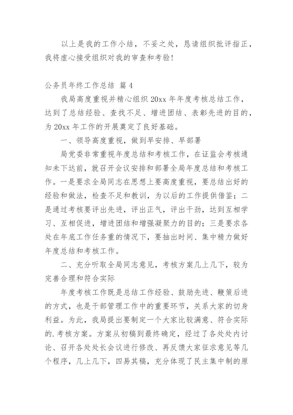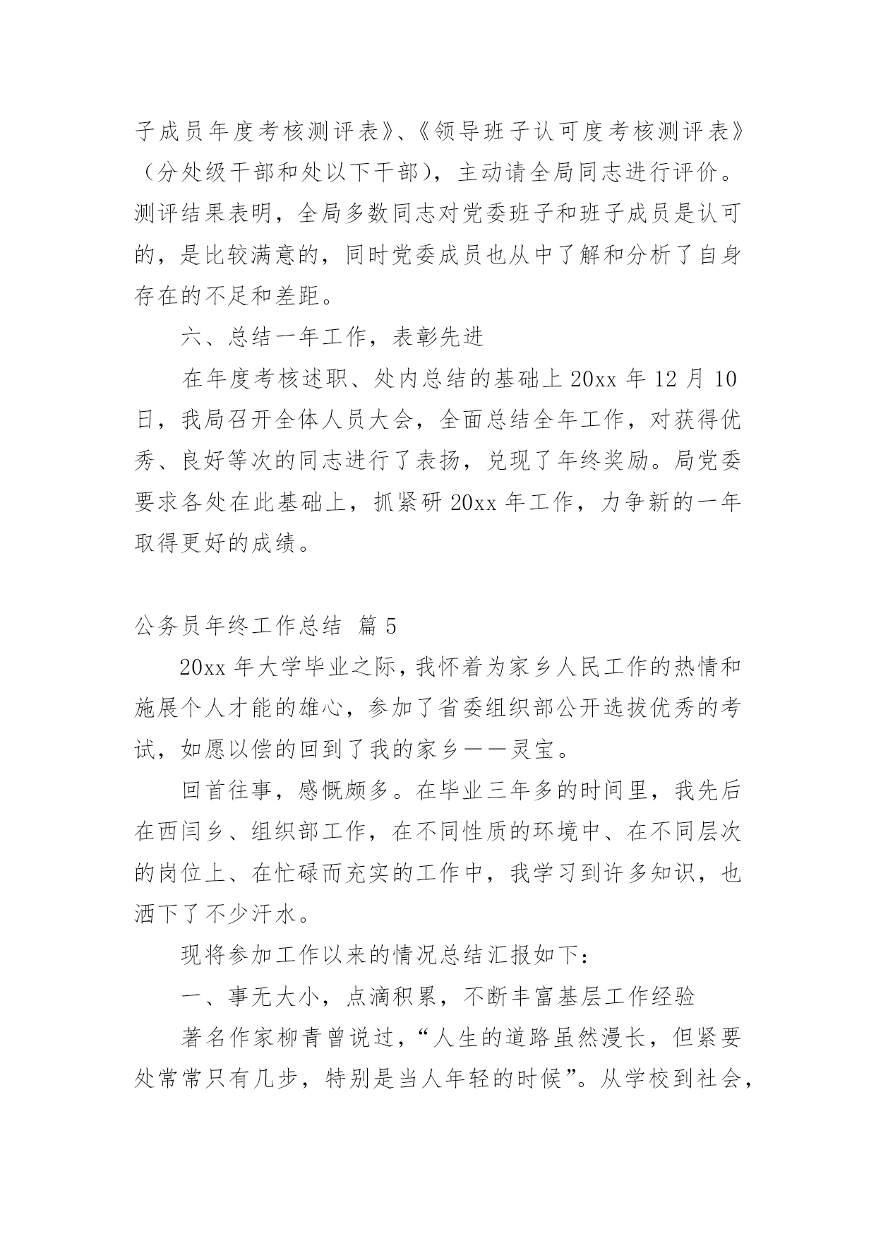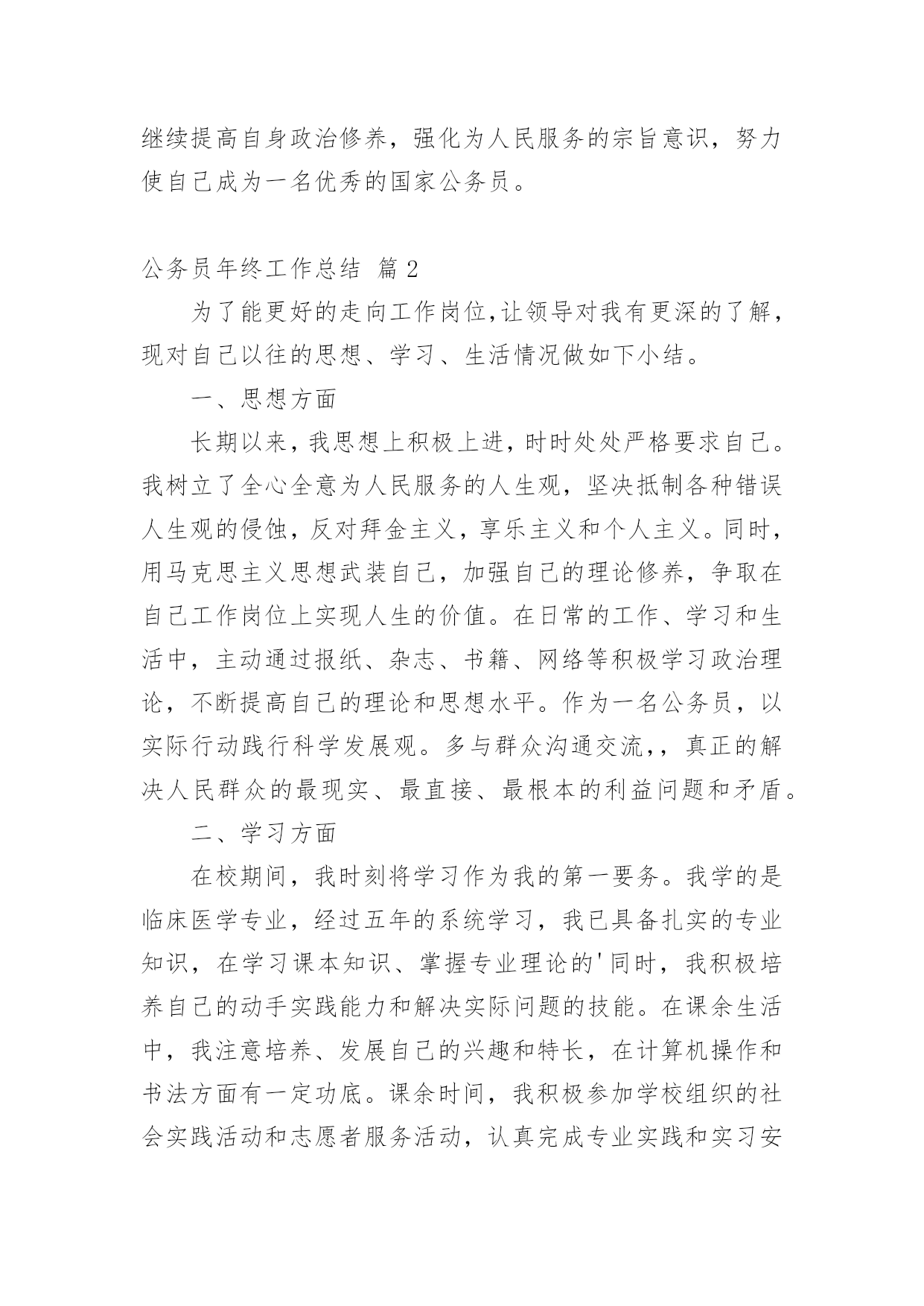 公务员年终工作总结公务员年终工作总结模板锦集五篇总结是指对某一阶段的工作、学习或思想中的经验或情况进行分析研究,做出带有规律性结论的书面材料,它可以帮助我们有寻找学习和工作中的规律,让我们来为自己写一份总结吧。但是却发现不知道该写些什么,下面是小编为大家收集的公务员年终工作总结5篇,欢迎大家借鉴与参考,希望对大家有所帮助。公务员年终工作总结篇1一年来,我热衷于本职工作,严格要求自己,摆正工作位置,时刻保持“谦虚”、“谨慎”、“律己”的态度,在领导的关心栽培和同事们的帮助支持下积极进取/勤奋工作,履行好岗位职责。现将一年来的学习、工作情况简要总结如下:一、努力学习,不断提高政治理论水平书到用时方恨少,我越来越深刻地认识到知识的欠缺,只有抓紧一切可利用的时间努力学习,才能适应日趋激烈的竞争,胜任本职工作。努力学习理论知识,学习相关政策法规,领会上级部门重大会议精神,在政治上、思想上始终同党中央保持一致,保证在行动上不偏离正确的轨道。同时,结合本职工作,我认真学习有关的中央八项规定精神的相关政策法规以及财经纪律,不断武装自己的头脑。并根据工作实际情况,努力用理论指导实践,解决自己在工作中出现的问题。二、踏实肯干,努力完成好各项业务工作在工作中,始终把耐得平淡、舍得付出、默默无闻作为自己的`准则,始终把作风建设的重点放在严谨、细致、扎实、求实脚踏实地埋头苦干上,以制度、纪律规范自己的一切言行,严格遵守机关各项规章制度。对每一项工作任务,都能遵照领导安排,做到分清轻重缓急,科学安排时间,按时、按质、按量地完成。同时,努力从每一件事情上进行总结,不断摸索,掌握方法,提高工作效率和工作质量。通过一年实践,使我不仅在政治上得到进一步锤炼,文字上得到提高,而且在个人整体素质上和工作能力上得到了强化训练。三、严于律己,努力提高个人素质坚持正直、谦虚、朴实的生活作风,摆正自己的位置,尊重领导,团结同志,平等相处,以诚待人,不趋炎附势,也不欺上压下,正确处理好与领导、同事相处的尺与度的关系,大事讲原则,小事讲风格,自觉抵制腐朽思想的侵蚀。这一年,我在学习和工作中逐步成长、成熟,但我清楚自身还有很多不足,比如工作能力和创新意识不足、政治理论水平有待提高等。今后我将努力做到以下几点,希望领导和同志们对我进行监督指导:自觉加强学习,向理论学习,向专业知识学习,向身边的同事学习,逐步提高自己的理论水平和业务能力。克服年轻气躁,做到脚踏实地,提高工作主动性,不怕多做事,不怕做小事,在点滴实践中完善提高自己。继续提高自身政治修养,强化为人民服务的宗旨意识,努力使自己成为一名优秀的国家公务员。公务员年终工作总结篇2为了能更好的走向工作岗位,让领导对我有更深的了解,现对自己以往的思想、学习、生活情况做如下小结。一、思想方面长期以来,我思想上积极上进,时时处处严格要求自己。我树立了全心全意为人民服务的人生观,坚决抵制各种错误人生观的侵蚀,反对拜金主义,享乐主义和个人主义。同时,用马克思主义思想武装自己,加强自己的理论修养,争取在自己工作岗位上实现人生的价值。在日常的工作、学习和生活中,主动通过报纸、杂志、书籍、网络等积极学习政治理论,不断提高自己的理论和思想水平。作为一名公务员,以实际行动践行科学发展观。多与群众沟通交流,,真正的解决人民群众的最现实、最直接、最根本的利益问题和矛盾。二、学习方面在校期间,我时刻将学习作为我的第一要务。我学的是临床医学专业,经过五年的系统学习,我已具备扎实的专业知识,在学习课本知识、掌握专业理论的'同时,我积极培养自己的动手实践能力和解决实际问题的技能。在课余生活中,我注意培养、发展自己的兴趣和特长,在计算机操作和书法方面有一定功底。课余时间,我积极参加学校组织的社会实践活动和志愿者服务活动,认真完成专业实践和实习安排,使自己能够学习与实践相结合,学以致用,在实践过程中更提高了我发现问题、分析问题、解决问题的能力,提高了我综合运用知识的能力。对于学习,无论是在学校还是以后工作,我始终树立全面学习、创新学习、终身学习的理念,因为只有这样才能使自己的知识水平得到不断的提高,才能更好做好本职工作,更好的完成各项任务。三、生活方面在生活上,我严格要求自己,与同学、朋友和谐相处,尊敬领导和长辈。多年来,我一直坚持自我检查和自我反省,生活上勤俭节约,不乱花一分钱。在学校和家庭,我总是友好对人,从不和同学朋友及家人争吵打架。当同学在生活和学习上有困难的时候,我也总是尽自己的努力去帮助他们。对于领导和长辈,我都十分敬重和尊重,因为他们传授了我知识并在我成长的历程中给了我指导和帮助。总结自己多一年来的学习、生活情况,尽管有了一定的进步和成绩,但在一些方面还存在着不足。比如由于一直在校学习,工作经验不足,这就需要在今后的工作中不断加强学习,向领导和同事