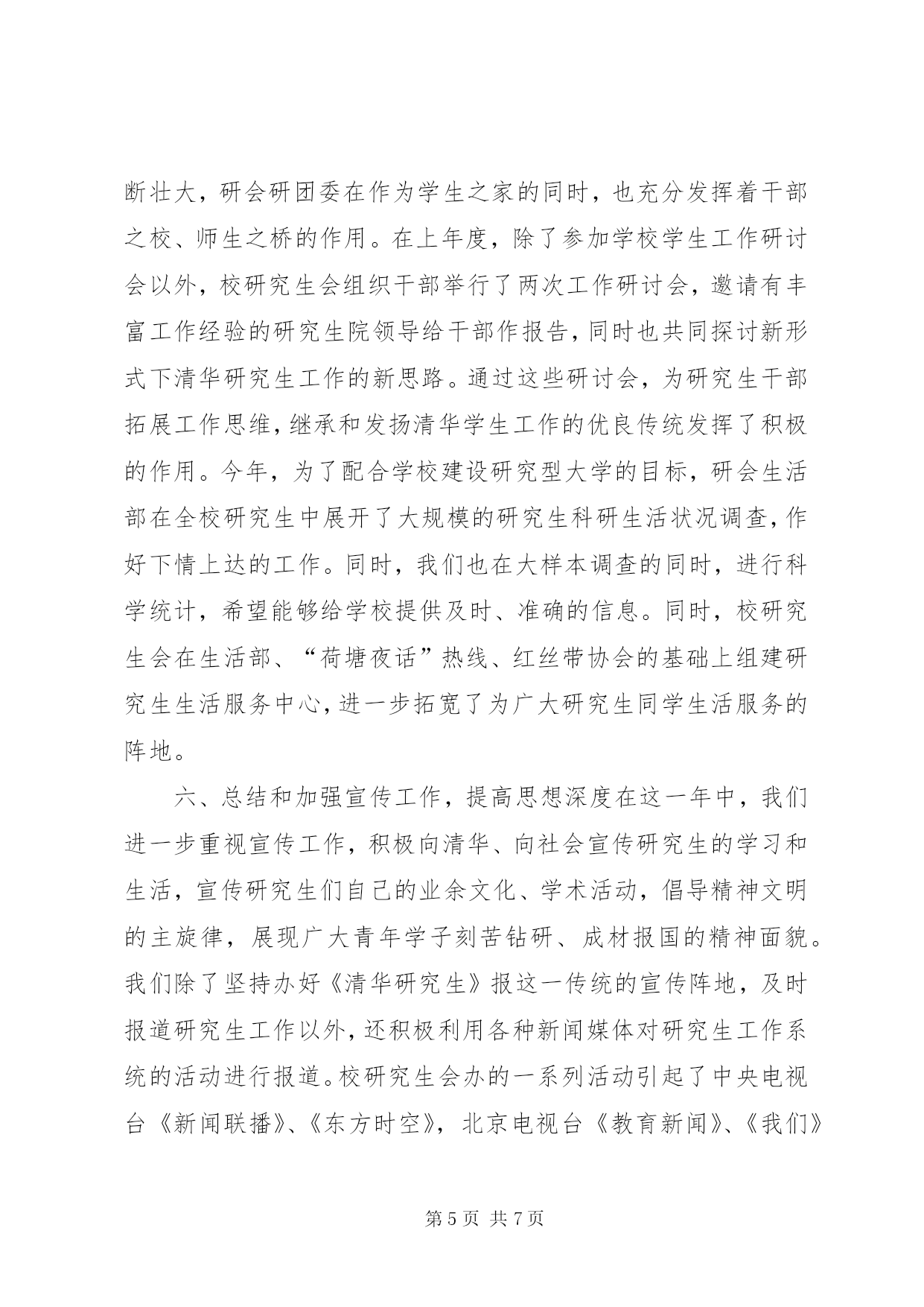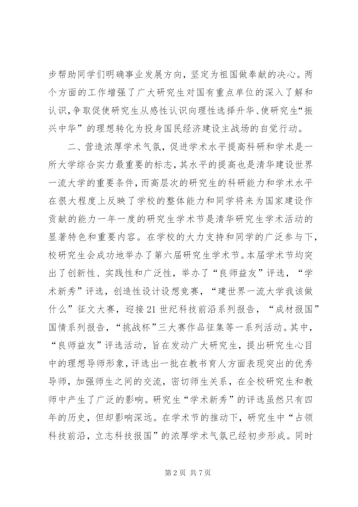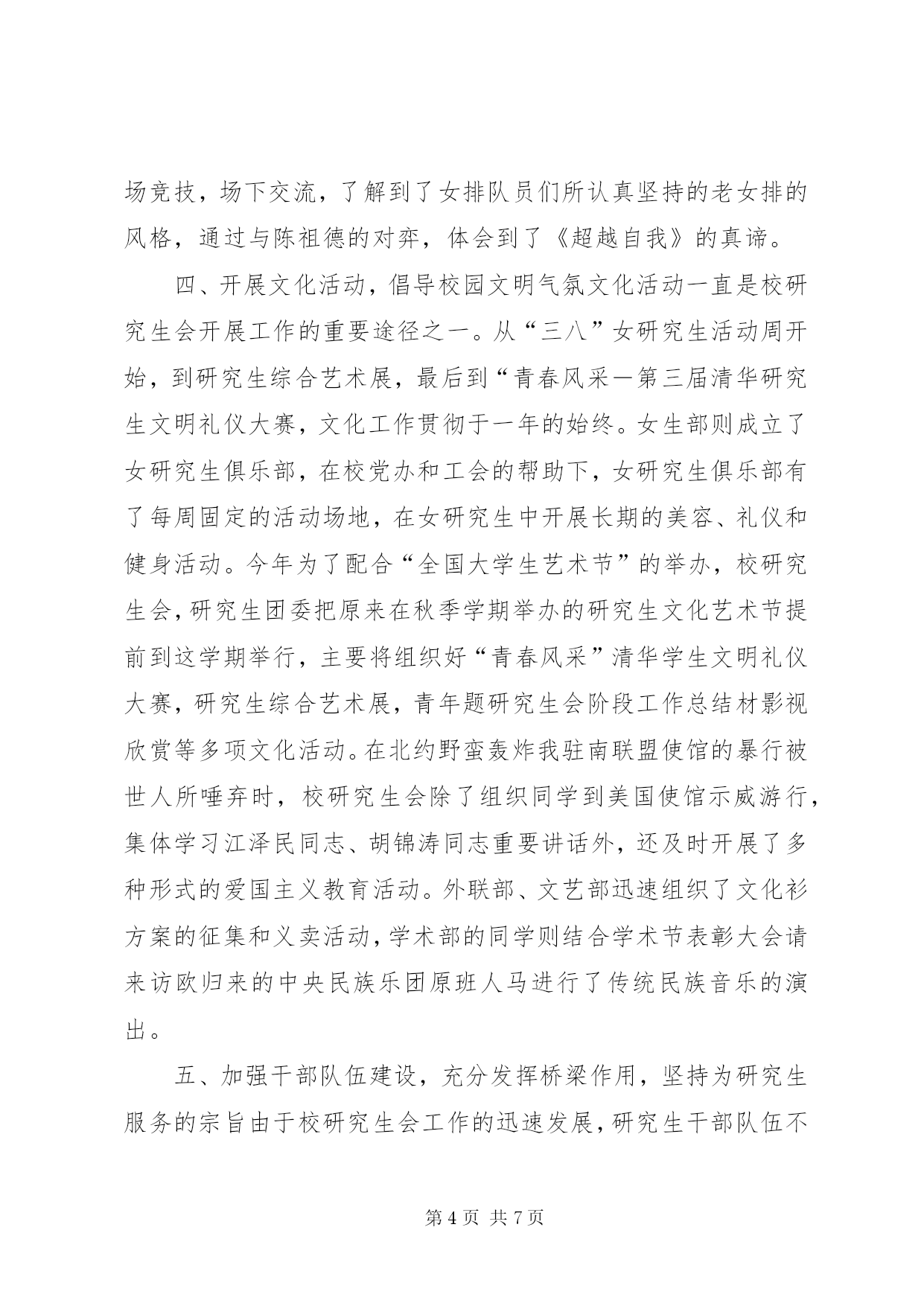 第PAGE\*Arabic\*MERGEFORMAT7页共NUMPAGES\*MERGEFORMAT7页研究生会阶段工作总结一、加强思想引导,弘扬爱国主义,努力成才报国校研究生会紧密围绕学校以“以中华富强为己任,为民族经济作贡献”的思想教育主题,配合学校育人的中心工作,在全校研究生中开展了一系列弘扬爱国主义传统的主题教育活动。一方面,我们走出去。校研究生会通过组织各种社会实践活动和实践成果的宣传活动,使广大同学在实践中了解国情,进行爱国主义教育。98年暑假,我们组织清华博士生科技服务考察团赴山东六个地市的十七家企业或产业集团进行科技服务和社会实践,受到了XX省委书记吴官正的亲切接见,并对考察团同学提出四点希望:1.认真学习马克思主义和邓小平理论,做有坚定的政治信仰和远大理想的人;2.做爱国主义者,为祖国建设贡献力量;3.全心全意为人民服务;4.培养创新精神,同学们结合自己的体会,就吴官正书记的四点希望进行了认真的讨论,认为这些话语不仅使同学们更加明确了此次考察活动的目的,而且也指出了我们今后的努力方向。今年暑假,我们还将组织博士生科技考察服务团到XX省XX市进行社会实践活动,了解曾经闻名全国的“温州模式”在新时期是如何进行科技二次创业的。另一方面,我们请进来,通过举办“民族工业和科技”系列报告会,“我为国企分忧”系列活动,进一步帮助同学们明确事业发展方向,坚定为祖国做奉献的决心。两个方面的工作增强了广大研究生对国有重点单位的深入了解和认识,争取促使研究生从感性认识向理性选择升华、使研究生“振兴中华”的理想转化为投身国民经济建设主战场的自觉行动。二、营造浓厚学术气氛,促进学术水平提高科研和学术是一所大学综合实力最重要的标志,其水平的提高也是清华建设世界一流大学的重要条件,而高层次的研究生的科研能力和学术水平在很大程度上反映了学校的整体能力和同学将来为国家建设作贡献的能力一年一度的研究生学术节是清华研究生学术活动的显著特色和重要内容。在学校的大力支持和同学的广泛参与下,校研究生会成功地举办了第六届研究生学术节。本届学术节均突出了创新性、实践性和广泛性,举办了“良师益友”评选,“学术新秀”评选,创造性设计设想竞赛,“建世界一流大学我该做什么”征文大赛,迎接21世纪科技前沿系列报告,“成材报国”国情系列报告,“挑战杯”三大赛作品征集等一系列活动。其中,“良师益友”评选活动,旨在发动广大研究生,提出研究生心目中的理想导师形象,评选出一批在教书育人方面表现突出的优秀导师,加强师生之间的交流,密切师生关系,在全校研究生和教师中产生了广泛的影响。研究生“学术新秀”的评选虽然只有四年的历史,但却影响深远。在学术节的推动下,研究生中“占领科技前沿,立志科技报国”的浓厚学术气氛已经初步形成。同时为了响应清华建设综合性大学的目标,本届学术节针对文科建设推出了新举措,除了在“学术新秀”的评选中对文科有一定的倾斜政策外,还针对社会科学领域举办了一系列的学术讲座。更值得一提的是,为了配合知识创新体系的建设,鼓励研究生同学开展课外科技创新,研究生院支持建立了研究生华实创新基金,由研会华实中心负责,目前已进入正常运转。三、开展全民健身运动,倡导体育锻炼之风由于体育不再作为研究生培养的必修环节、多数研究生科研任务繁重而作息不规律等原因,使很多研究生不再保持或养成坚持体育锻炼的习惯,造成了研究生身体素质普遍下降,一些同学适应繁重的科研和学业已经力不从心。因此,校研究生会和研团委一方面一直在不同场合大声疾呼,希望学校开设体育必修课,另一方面同时把研会体育工作的重点放在了群众体育的推动上。作为研究生体育工作的重头戏,第十四届研究生运动会采取了各种鼓励措施推动研究生群体运动的开展,如设立拔河、原地投篮、接力跑等群众性项目。同时也鼓励破记录,对于打破研运会记录的同学将给予物质鼓励。在过去的一年中,除了举办受同学们欢迎的篮球、足球、排球三大球联赛以外,我们也开始推动小球运动在研究生中的普及,如乒乓球、羽毛球、台球等等。已经举办了三次的“体育名人进清华”系列讲座,更是通过介绍体育明星们的拼搏历程,把体育精神融入到同学们的人生观中。同学们通过和国家女排的同场竞技,场下交流,了解到了女排队员们所认真坚持的老女排的风格,通过与陈祖德的对弈,体会到了《超越自我》的真谛。四、开展文化活动,倡导校园文明气氛文化活动一直是校研究生会开展工作的重要途径之一。从“三八”女研究生活动周开始,到研究生综合艺术展,最后到“青春风采-第三届清华研究生文明礼仪大赛,文化工作贯彻于一年的始终。女生部则成立了女研究生俱乐部,在校党办和工会的帮助下,女研究生俱乐部有了每周固定的活动场地,在女研究生中开展长期的美容、礼仪和健身活动。今年为了配合“全国大学生艺术节”的举办,校研究生会,研