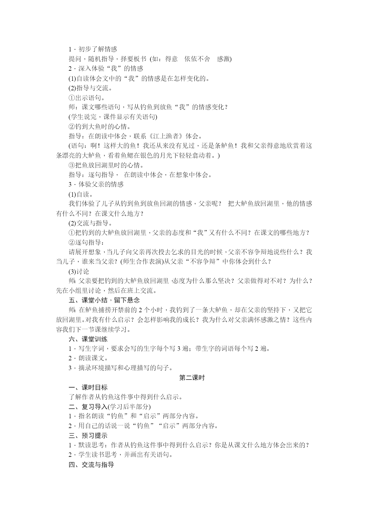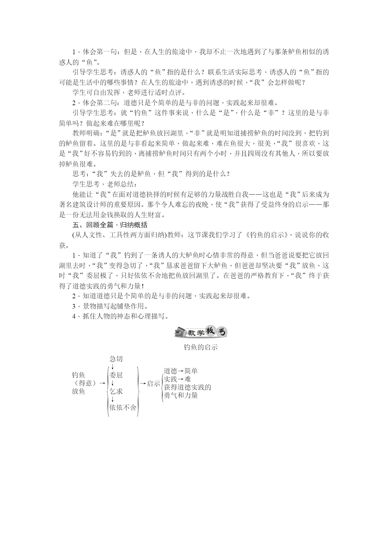 13钓鱼的启示知识与技能:(1)正确、流利、有感情地朗读课文。(2)理解课文内容,仔细体会“我”的心理变化过程。(3)从作者钓鱼的启示中受到教育,懂得要严格按道德标准来约束、规范自己的言行,做一个正直、守纪的人。过程与方法:(1)联系上下文,学习生字词。(2)引导学生通过反复读,来体会作者的心理变化过程。情感、态度与价值观:通过阅读,引导学生做一个严格遵守道德标准的孩子。教学重点:抓住重点词句,体会“我”钓到鲈鱼和放回鲈鱼的心情变化。教学难点:联系上下文内容,体会从钓鱼中受到的启示。教学时间:两课时第一课时课时目标:(1)正确、流利、有感情地朗读课文。(2)理解课文内容,仔细体会“我”的心理变化过程。一、谈话导入,揭示课题1.导语:知道詹姆斯·兰费蒂斯吗?他是美国的一位著名的建筑师,他为我国广大读者所了解,不是因为他的建筑成就,而是他写的一篇短文,叫《做得对做得好——天知地知》。天知地知,就是无人知,在无人知晓的情况下,有件事做得对做得好,这究竟是一件什么事呢?这就是我们今天要学习的一篇课文。选入课文时题目改为《钓鱼的启示》(板书课题)。我们一起把课文的题目读一遍。2.理解题目意思。师:“启示”是什么意思?课文题目的意思是:________________二、预习要求1.读准字音,理解词语意思。2.读课文,边读边思,体验课文情感。三、检查预习情况1.生字读音。老师把课文中的生字做成了词串,请自己读一读。2.部分词语的意思。词串中的词语,有什么不明白的,请提出来。3.课文内容。谁来告诉大家:课文先写什么,再写什么,最后写什么?(板书:钓鱼放鱼启示)四、深入体验课文情感1.初步了解情感提问,随机指导,择要板书(如:得意依依不舍感激)2.深入体验“我”的情感(1)自读体会文中的“我”的情感是在怎样变化的。(2)指导与交流。①出示语句。师:课文哪些语句,写从钓鱼到放鱼“我”的情感变化?(学生说完,课件显示有关语句)②钓到大鱼时的心情。指导:在朗读中体会,联系《江上渔者》体会。(语句:啊!这样大的鱼!我还从来没有见过,还是条鲈鱼!我和父亲得意地欣赏着这条漂亮的大鲈鱼,看着鱼鳃在银色的月光下轻轻翕动着。)③把鱼放回湖里时的心情。指导:逐句指导,在朗读中体会,在想象中体会。3.体验父亲的情感(1)自读。我们体验了儿子从钓到鱼到放鱼回湖的情感,父亲呢?把大鲈鱼放回湖里,他的情感有什么不同?在课文什么地方?(2)交流与指导。①把钓到的大鲈鱼放回湖里,父亲的态度和“我”又有什么不同?在课文的哪些地方?②逐句指导:请展开想象,当儿子向父亲再次投去乞求的目光的时候,父亲不容争辩地说些什么?我当儿子,谁来当父亲?(师生合作表演)从父亲“不容争辩”中你体会到什么?(3)讨论师:父亲要把钓到的大鲈鱼放回湖里,态度为什么那么坚决?父亲做得对不对?为什么?先在小组里讨论,然后在班上交流。五、课堂小结,留下悬念师:在鲈鱼捕捞开禁前的2个小时,我钓到了一条大鲈鱼,却在父亲的坚持下,又把它放回湖里。对我有什么启示?会怎样影响我的成长?我为什么对父亲满怀感激之情?这些内容我们下一节课继续学习。六、课堂训练1.写生字词,要求会写的生字每个写3遍;带生字的词语每个写2遍。2.朗读课文。3.摘录环境描写和心理描写的句子。第二课时一、课时目标了解作者从钓鱼这件事中得到什么启示。二、复习导入(学习后半部分)1.指名朗读“钓鱼”和“启示”两部分内容。2.用自己的话说一说“钓鱼”“启示”两部分内容。三、预习提示1.默读思考:作者从钓鱼这件事中得到什么启示?你是从课文什么地方体会出来的?2.学生读书思考,并画出有关语句。四、交流与指导1.体会第一句:但是,在人生的旅途中,我却不止一次地遇到了与那条鲈鱼相似的诱惑人的“鱼”。引导学生思考:诱惑人的“鱼”指的是什么?联系生活实际思考,诱惑人的“鱼”指的可能是生活中的哪些事情?在人生的旅途中,遇到诱惑的时候,“我”会怎样做呢?学生可自由发挥,老师进行适时点评。2.体会第二句:道德只是个简单的是与非的问题,实践起来却很难。引导学生思考:就“钓鱼”这件事来说,什么是“是”,什么是“非”?这里的是与非简单吗?做起来难在哪里呢?教师明确:“是”就是把鲈鱼放回湖里,“非”就是明知道捕捞鲈鱼的时间没到,把钓到的鲈鱼留着。这里的是与非看起来简单,做起来难,难在鱼很大,很美,“我”很喜欢,这是“我”好不容易钓到的,离捕捞鲈鱼时间只有两个小时,并且四周没有其他人,所以要放掉鲈鱼很难。思考:“我”失去的是鲈鱼,但“我”得到的是什么?学生思考,老师总结:他能让“我”在面对道德抉择的时候有足够的力量战