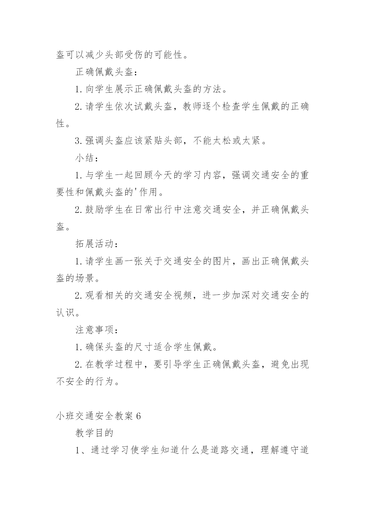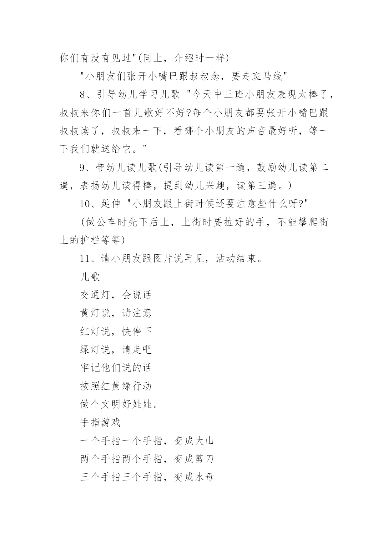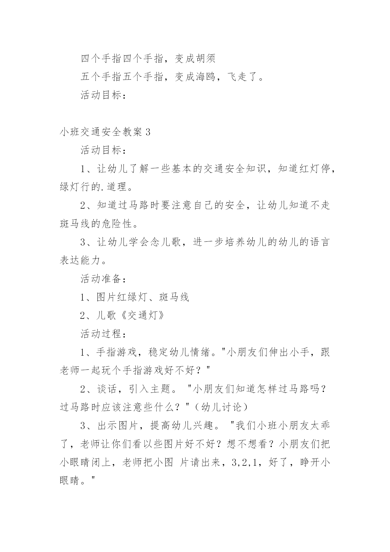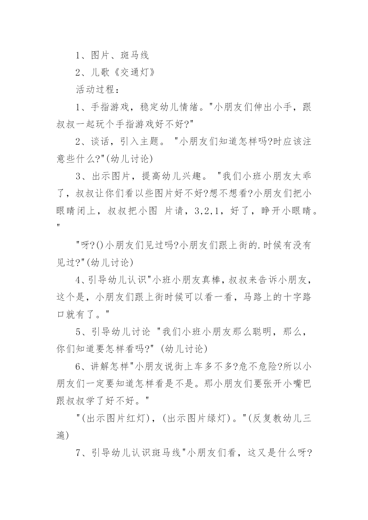 小班交通安全教案作为一无名无私奉献的教育工作者,编写教案是必不可少的,教案是实施教学的主要依据,有着至关重要的作用。教案应该怎么写呢?以下是小编为大家收集的小班交通安全教案,希望能够帮助到大家。小班交通安全教案1一、教学目标:1.了解交通安全意识,掌握交通安全知识。2.了解佩戴头盔的重要性,掌握佩戴头盔的正确方法。二、教学内容:1.交通安全知识2.佩戴头盔的正确方法三、教学方法:1.讲解法:通过图片、视频等形式向孩子们介绍交通安全知识和佩戴头盔的正确方法。2.互动法:让孩子们互相帮忙佩戴头盔,练习正确佩戴头盔的方法。四、教学材料:1.头盔2.图片、视频等教学辅助材料五、教学时间:40分钟六、教学过程:1.引入:老师先向孩子们介绍一下交通安全的重要性,告诉孩子们在路上要注意什么,如何避免交通事故。2.交通安全知识:老师通过图片、视频等形式向孩子们介绍一些基本的交通安全知识,如过马路要走人行横道,看红灯停绿灯行等。3.佩戴头盔的.正确方法:老师向孩子们展示一下头盔的种类和佩戴方法,并让孩子们互相帮忙佩戴头盔,练习正确佩戴头盔的方法。4.小结:老师再次强调交通安全的重要性,告诉孩子们在日常生活中要时刻注意交通安全,佩戴头盔是保护头部安全的重要措施。七、教学评价:1.观察孩子们的学习情况,检查孩子们是否能正确佩戴头盔。2.通过提问的方式检查孩子们对交通安全知识的掌握情况。小班交通安全教案21、让幼儿了解一些基本的交通安全知识,知道,的道理。2、知道时要注意自己的安全,让幼儿知道不走斑马线的危险性。活动准备:1、图片、斑马线2、儿歌《交通灯》活动过程:1、手指游戏,稳定幼儿情绪。"小朋友们伸出小手,跟叔叔一起玩个手指游戏好不好?"2、谈话,引入主题。"小朋友们知道怎样吗?时应该注意些什么?"(幼儿讨论)3、出示图片,提高幼儿兴趣。"我们小班小朋友太乖了,叔叔让你们看以些图片好不好?想不想看?小朋友们把小眼睛闭上,叔叔把小图片请,3,2,1,好了,睁开小眼睛。""呀?()小朋友们见过吗?小朋友们跟上街的.时候有没有见过?"(幼儿讨论)4、引导幼儿认识"小班小朋友真棒,叔叔来告诉小朋友,这个是,小朋友们跟上街时候可以看一看,马路上的十字路口就有了。"5、引导幼儿讨论"我们小班小朋友那么聪明,那么,你们知道要怎样看吗?"(幼儿讨论)6、讲解怎样"小朋友说街上车多不多?危不危险?所以小朋友们一定要知道怎样看是不是。那小朋友们要张开小嘴巴跟叔叔学了好不好。""(出示图片红灯),(出示图片绿灯)。"(反复教幼儿三遍)7、引导幼儿认识斑马线"小朋友们看,这又是什么呀?你们有没有见过"(同上,介绍时一样)"小朋友们张开小嘴巴跟叔叔念,要走斑马线"8、引导幼儿学习儿歌"今天中三班小朋友表现太棒了,叔叔来你们一首儿歌好不好?每个小朋友都要张开小嘴巴跟叔叔读了,叔叔来一下,看哪个小朋友的声音最好听,等一下我们就送给它。"9、带幼儿读儿歌(引导幼儿读第一遍,鼓励幼儿读第二遍,表扬幼儿读得棒,提到幼儿兴趣,读第三遍。)10、延伸"小朋友跟上街时候还要注意些什么呀?"(做公车时先下后上,上街时要拉好的手,不能攀爬街上的护栏等等)11、请小朋友跟图片说再见,活动结束。儿歌交通灯,会说话黄灯说,请注意红灯说,快停下绿灯说,请走吧牢记他们说的话按照红黄绿行动做个文明好娃娃。手指游戏一个手指一个手指,变成大山两个手指两个手指,变成剪刀三个手指三个手指,变成水母四个手指四个手指,变成胡须五个手指五个手指,变成海鸥,飞走了。活动目标:小班交通安全教案3活动目标:1、让幼儿了解一些基本的交通安全知识,知道红灯停,绿灯行的.道理。2、知道过马路时要注意自己的安全,让幼儿知道不走斑马线的危险性。3、让幼儿学会念儿歌,进一步培养幼儿的幼儿的语言表达能力。活动准备:1、图片红绿灯、斑马线2、儿歌《交通灯》活动过程:1、手指游戏,稳定幼儿情绪。"小朋友们伸出小手,跟老师一起玩个手指游戏好不好?"2、谈话,引入主题。"小朋友们知道怎样过马路吗?过马路时应该注意些什么?"(幼儿讨论)3、出示图片,提高幼儿兴趣。"我们小班小朋友太乖了,老师让你们看以些图片好不好?想不想看?小朋友们把小眼睛闭上,老师把小图片请出来,3,2,1,好了,睁开小眼睛。"4、引导幼儿认识红绿灯"小班小朋友真棒,老师来告诉小朋友,这个是红绿灯,小朋友们跟爸爸妈妈上街时候可以看一看,马路上的十字路口就有了。"5、引导幼儿讨论"我们小班小朋友那么聪明,那么,你们知道要怎样看红绿灯吗?"(幼儿讨论)6、讲解怎样安全过马路"小朋友说街上车多不多?危不危险?所以小朋友们一定要知道怎样看红绿灯是不是。那小朋友们要张开小嘴巴跟老师学了好不好。""红灯停(出示图片红灯),绿灯行(出示图片绿灯)。"7、延伸"小朋友跟爸爸妈妈上街时候还