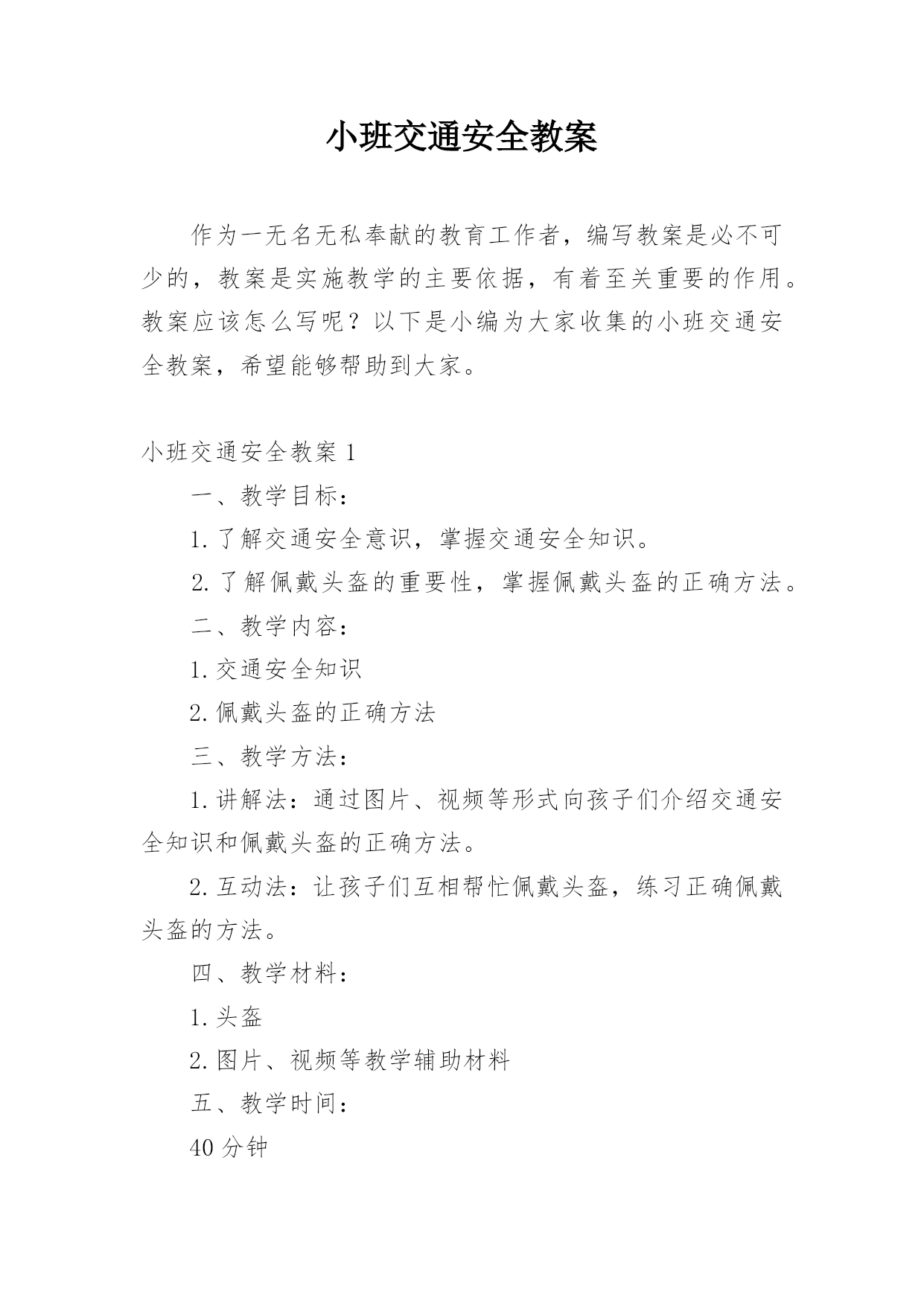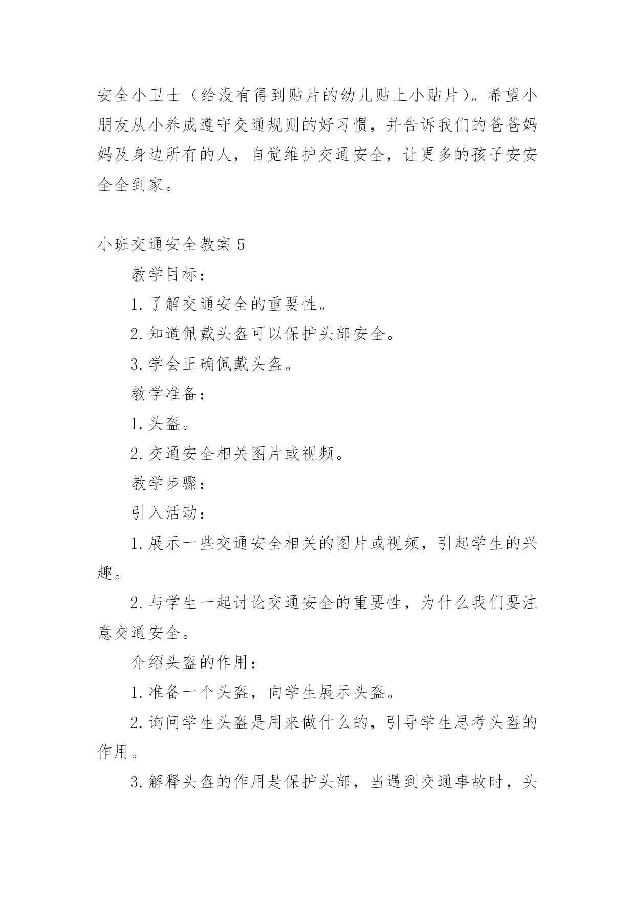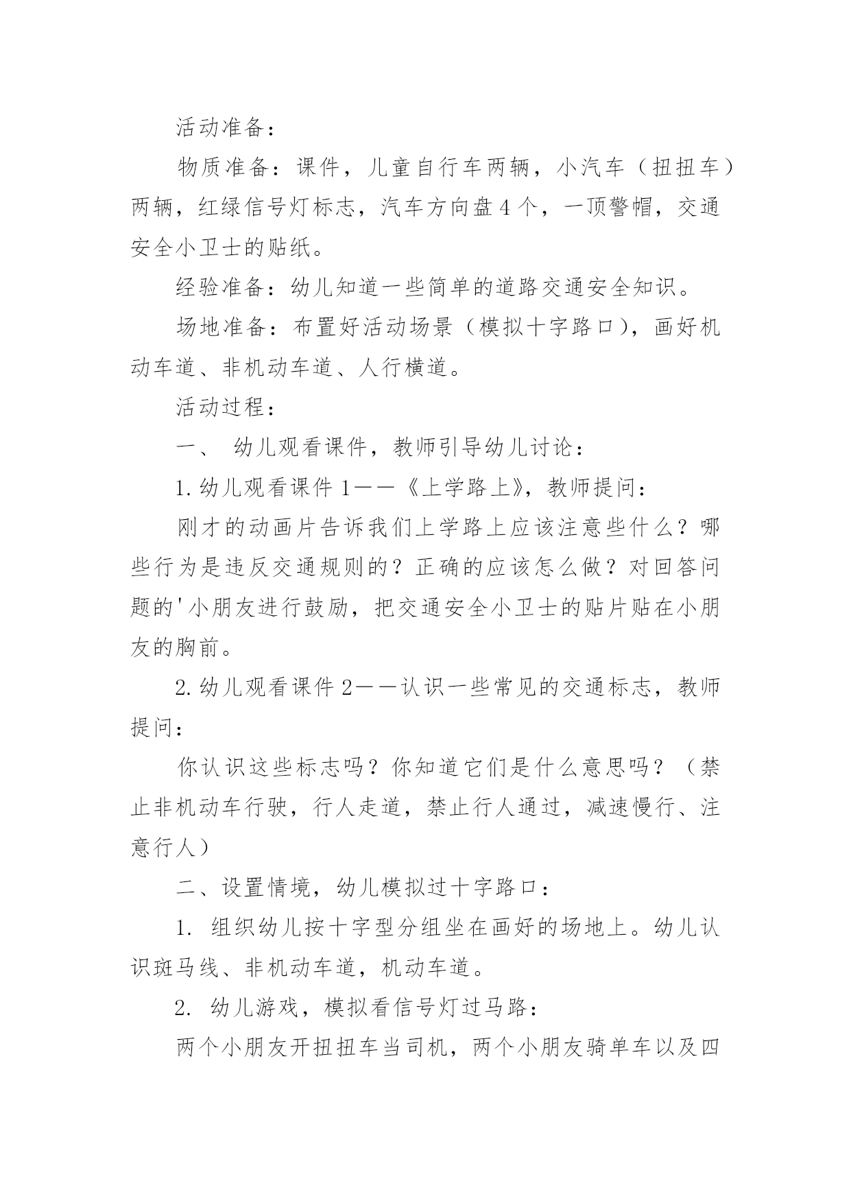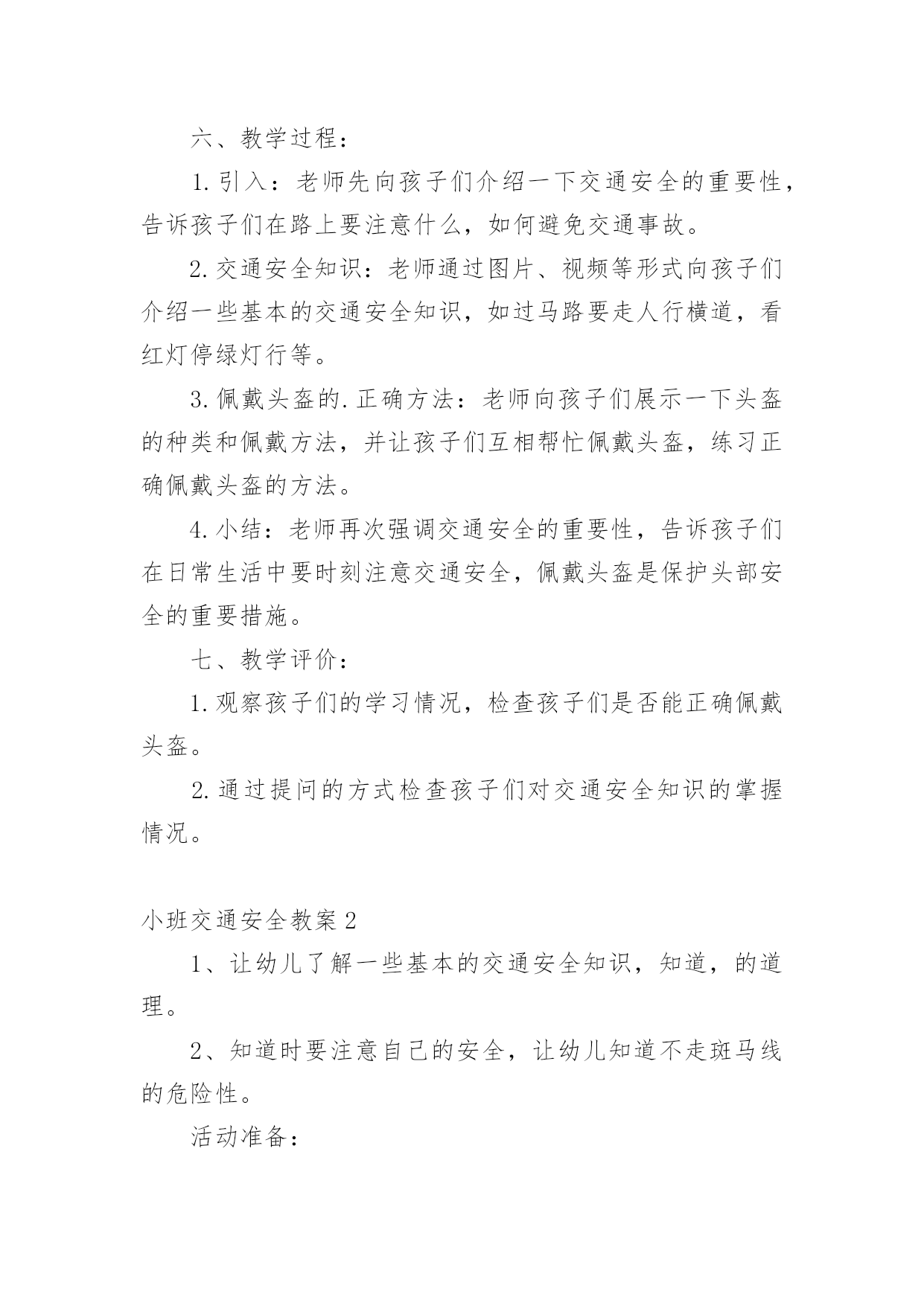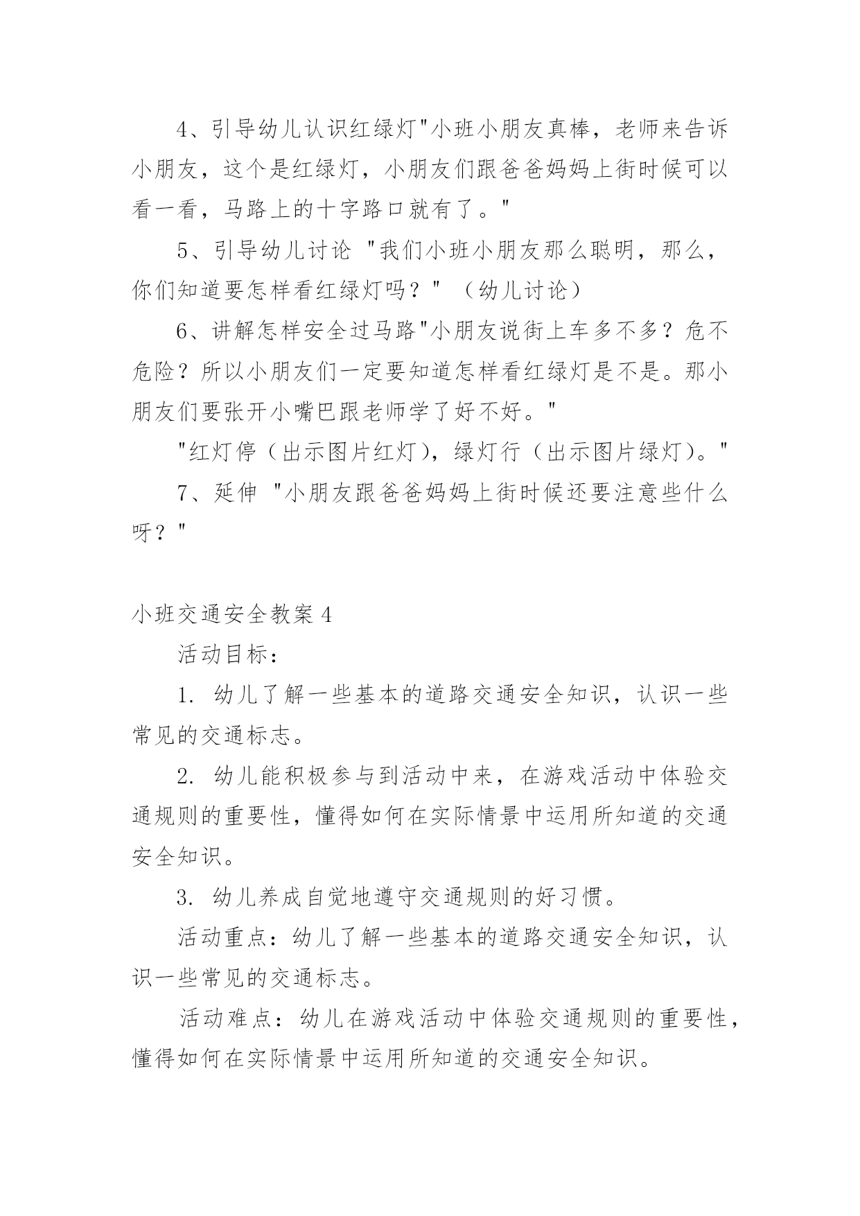 小班交通安全教案作为一无名无私奉献的教育工作者,编写教案是必不可少的,教案是实施教学的主要依据,有着至关重要的作用。教案应该怎么写呢?以下是小编为大家收集的小班交通安全教案,希望能够帮助到大家。小班交通安全教案1一、教学目标:1.了解交通安全意识,掌握交通安全知识。2.了解佩戴头盔的重要性,掌握佩戴头盔的正确方法。二、教学内容:1.交通安全知识2.佩戴头盔的正确方法三、教学方法:1.讲解法:通过图片、视频等形式向孩子们介绍交通安全知识和佩戴头盔的正确方法。2.互动法:让孩子们互相帮忙佩戴头盔,练习正确佩戴头盔的方法。四、教学材料:1.头盔2.图片、视频等教学辅助材料五、教学时间:40分钟六、教学过程:1.引入:老师先向孩子们介绍一下交通安全的重要性,告诉孩子们在路上要注意什么,如何避免交通事故。2.交通安全知识:老师通过图片、视频等形式向孩子们介绍一些基本的交通安全知识,如过马路要走人行横道,看红灯停绿灯行等。3.佩戴头盔的.正确方法:老师向孩子们展示一下头盔的种类和佩戴方法,并让孩子们互相帮忙佩戴头盔,练习正确佩戴头盔的方法。4.小结:老师再次强调交通安全的重要性,告诉孩子们在日常生活中要时刻注意交通安全,佩戴头盔是保护头部安全的重要措施。七、教学评价:1.观察孩子们的学习情况,检查孩子们是否能正确佩戴头盔。2.通过提问的方式检查孩子们对交通安全知识的掌握情况。小班交通安全教案21、让幼儿了解一些基本的交通安全知识,知道,的道理。2、知道时要注意自己的安全,让幼儿知道不走斑马线的危险性。活动准备:1、图片、斑马线2、儿歌《交通灯》活动过程:1、手指游戏,稳定幼儿情绪。"小朋友们伸出小手,跟叔叔一起玩个手指游戏好不好?"2、谈话,引入主题。"小朋友们知道怎样吗?时应该注意些什么?"(幼儿讨论)3、出示图片,提高幼儿兴趣。"我们小班小朋友太乖了,叔叔让你们看以些图片好不好?想不想看?小朋友们把小眼睛闭上,叔叔把小图片请,3,2,1,好了,睁开小眼睛。""呀?()小朋友们见过吗?小朋友们跟上街的.时候有没有见过?"(幼儿讨论)4、引导幼儿认识"小班小朋友真棒,叔叔来告诉小朋友,这个是,小朋友们跟上街时候可以看一看,马路上的十字路口就有了。"5、引导幼儿讨论"我们小班小朋友那么聪明,那么,你们知道要怎样看吗?"(幼儿讨论)6、讲解怎样"小朋友说街上车多不多?危不危险?所以小朋友们一定要知道怎样看是不是。那小朋友们要张开小嘴巴跟叔叔学了好不好。""(出示图片红灯),(出示图片绿灯)。"(反复教幼儿三遍)7、引导幼儿认识斑马线"小朋友们看,这又是什么呀?你们有没有见过"(同上,介绍时一样)"小朋友们张开小嘴巴跟叔叔念,要走斑马线"8、引导幼儿学习儿歌"今天中三班小朋友表现太棒了,叔叔来你们一首儿歌好不好?每个小朋友都要张开小嘴巴跟叔叔读了,叔叔来一下,看哪个小朋友的声音最好听,等一下我们就送给它。"9、带幼儿读儿歌(引导幼儿读第一遍,鼓励幼儿读第二遍,表扬幼儿读得棒,提到幼儿兴趣,读第三遍。)10、延伸"小朋友跟上街时候还要注意些什么呀?"(做公车时先下后上,上街时要拉好的手,不能攀爬街上的护栏等等)11、请小朋友跟图片说再见,活动结束。儿歌交通灯,会说话黄灯说,请注意红灯说,快停下绿灯说,请走吧牢记他们说的话按照红黄绿行动做个文明好娃娃。手指游戏一个手指一个手指,变成大山两个手指两个手指,变成剪刀三个手指三个手指,变成水母四个手指四个手指,变成胡须五个手指五个手指,变成海鸥,飞走了。活动目标:小班交通安全教案3活动目标:1、让幼儿了解一些基本的交通安全知识,知道红灯停,绿灯行的.道理。2、知道过马路时要注意自己的安全,让幼儿知道不走斑马线的危险性。3、让幼儿学会念儿歌,进一步培养幼儿的幼儿的语言表达能力。活动准备:1、图片红绿灯、斑马线2、儿歌《交通灯》活动过程:1、手指游戏,稳定幼儿情绪。"小朋友们伸出小手,跟老师一起玩个手指游戏好不好?"2、谈话,引入主题。"小朋友们知道怎样过马路吗?过马路时应该注意些什么?"(幼儿讨论)3、出示图片,提高幼儿兴趣。"我们小班小朋友太乖了,老师让你们看以些图片好不好?想不想看?小朋友们把小眼睛闭上,老师把小图片请出来,3,2,1,好了,睁开小眼睛。"4、引导幼儿认识红绿灯"小班小朋友真棒,老师来告诉小朋友,这个是红绿灯,小朋友们跟爸爸妈妈上街时候可以看一看,马路上的十字路口就有了。"5、引导幼儿讨论"我们小班小朋友那么聪明,那么,你们知道要怎样看红绿灯吗?"(幼儿讨论)6、讲解怎样安全过马路"小朋友说街上车多不多?危不危险?所以小朋友们一定要知道怎样看红绿灯是不是。那小朋友们要张开小嘴巴跟老师学了好不好。""红灯停(出示图片红灯),绿灯行(出示图片绿灯)。"7、延伸"小朋友跟爸爸妈妈上街时候还