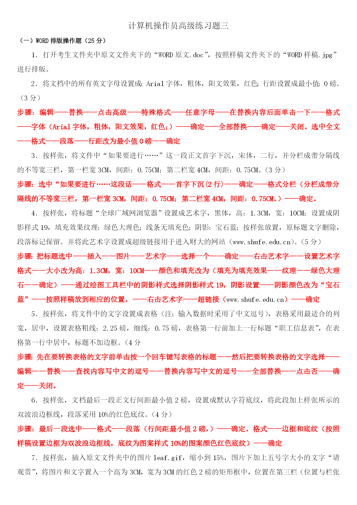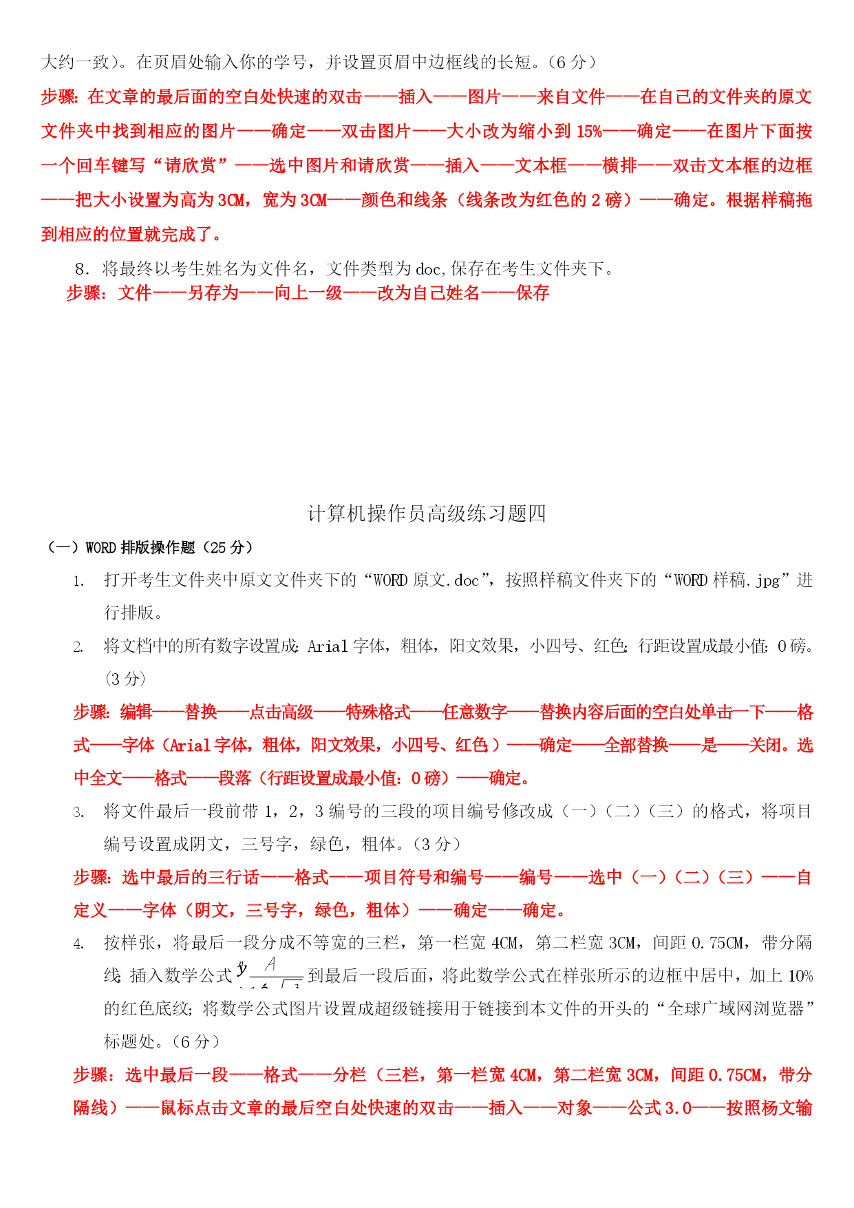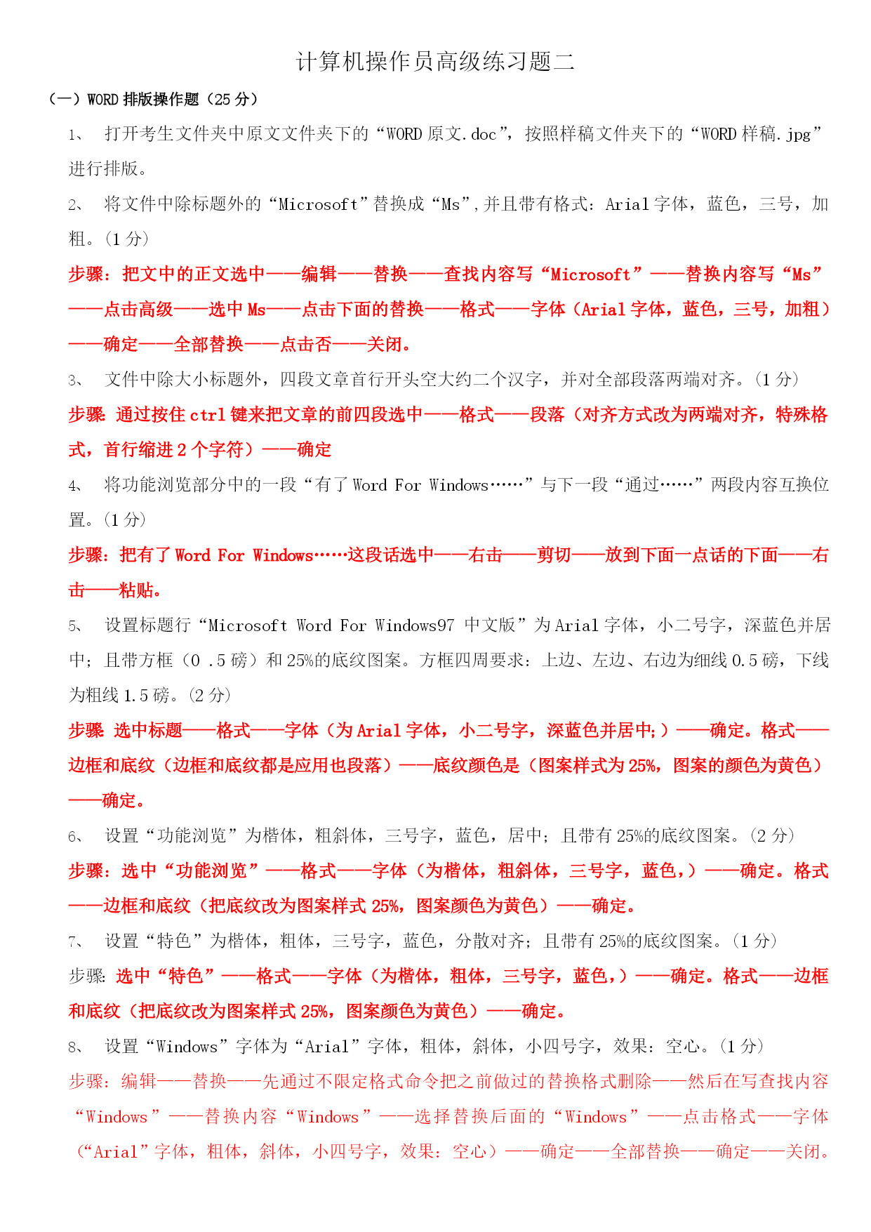 计算机操作员高级练习题一(一)WORD排版操作题(25分)打开考生文件夹中原文文件夹下的“WORD原文.doc”,按照样稿文件夹下的“WORD样稿.jpg”进行排版。给文章加上标题“立命之学”。其排版格式为:小一号隶书体,红色,居中,字符间距加宽6磅,黄色底纹,图案样式为10%,图案颜色自动,1.5磅蓝色单波浪线边框(2分)。步骤:先在文章顶端单击一下按回车键写“立命之学”,然后选择“立命之学”——格式——字体(小一号隶书体,红色,居中,字符间距加宽6磅)——确定。格式——边框和底纹(黄色底纹,图案样式为10%,图案颜色自动,1.5磅蓝色单波浪线边框)——边框和底纹都是应用文字——确定。给上述标题加尾注。尾注文字为“作者:明朝袁了凡。”(2分)。步骤:选中标题——插入——引用——脚注和尾注——点尾注——把编码的格式改一下——插入——写“作者:明朝袁了凡。”——就完成了。全文每段首行缩进2个字符。第1段段前、段后间距各10磅,行间距20磅,小四号行楷,粉红色双波浪下划线。第2段1.5倍行间距,小四号绿色仿宋体,字间距紧缩0.5磅,“亦真亦幻”文字效果(2+2分)。步骤:选中全文——格式——段落——特殊格式——首行缩进(2个字符)——确定。然后选中第一段——格式——段落(段前、段后间距各10磅,行间距20磅,)——确定——格式——字体(小四号行楷,粉红色双波浪下划线)——确定;在选中第二段——格式——段落(1.5倍行间距)——确定。格式——字体(小四号绿色仿宋体,字间距紧缩0.5磅,“亦真亦幻”文字效果)——确定。第3段1.5倍行间距,分成三栏,栏间距0.5厘米,加栏线。在该段的第二栏中插入“计算器”窗口(标准型)的图片。图片大小为4.5×4.5厘米,图片位置、格式如样稿(2+2分)。步骤:选中第三段——格式——段落(1.5倍行间距)——确定。格式——分栏——分成三栏,栏间距0.5厘米,加栏线。最后通过开设——所有程序——附件把“计算机”打开(按alt+printscreen)截屏键把计算机截下来——放到第二栏中右击——粘贴——双击图片——大小设置为(4.5×4.5厘米)——确定。最后单击图片——在图片的前面和后面都按一个回车键——单击图片——格式——边框和底纹——(边框,线条颜色改为橙色,宽度改为2.5磅)——应用于段落——确定。就成功了。将第4段和第5段交换位置。交换后的第4段设置首字下沉2行。首字用魏碑体。第4段文本用小四号楷体,缩放130%(1+2分)。步骤:把第四段选中——右击——剪切——放到第五段后面单击一下按回车——右击粘贴——选中换过位置的第四段——格式——首字下沉(首字下沉2行)——确定,格式——字体(小四号楷体,缩放130%)——确定。将文中所有的“余”字替换成红色的“YU”(2分)。步骤:编辑——替换(查找内容写“余”;替换内容写“YU”)——点高级——然后必须选中“YU”——点替换下面的格式——字体(红色)——确定——全部替换——确定——关闭。添加页眉“计算机Word排版”,页脚“本人班级、学号、姓名”。页眉、页脚文字均为仿宋体。页脚中的“班级”居左,“学号”居中,“姓名”居右(2分)。步骤:视图——页眉和页脚——分别写好字——视图——页面和页脚为第1段中的文字“吾姓孔,云南人也。”创建书签1。为第3段中的“孔先生”创建超链接,将其链接到书签1(2分)。步骤:选中第一段中的“吾姓孔,云南人也。”——插入——书签(书签1)——添加。——再选中第三段的“孔先生”——右击——超链接——本文档中的位置——书签1——确定将第5段文字放入一个竖排文本框。文本框格式、位置如样稿,要求和样稿一致(2分)。步骤:选中第五段——插入——文本框——竖排——根据样稿调整大小后拖到相应的位置——把鼠标放到文本框的边上变成四向箭头时——快速双击——颜色和线条——填充为浅绿——线条颜色(带图案的线条,选中倒数第二个的球体)——确定——把线条的宽度改为6磅——确定在文档最后插入艺术字“了凡四训”,按照样稿排版(2分)。步骤:在文章的最后按回车键——单击空白处——插入——图片——艺术字——随便选中一个——写“了凡四训”(加粗,隶书)——确定。然后右击艺术字——设置艺术字格式——颜色和线条(填充色改为蓝色,线条颜色改为红色——确定)——单击艺术字——在艺术字的工具栏中看到艺术字形状的命令(选中最下面一排的第三个是正梯形)——通过视图——工具栏——绘图工具栏中的阴影命令设置一下(阴影样式4,阴影设置(阴影颜色为海绿))——最后通过鼠标调整一下艺术字的大小。就完成了。将最终以考生姓名为文件名,文件类型为doc,保存在考生文件夹下。步骤:文件——另存为——向上一级——改为自己姓名——保存计算机