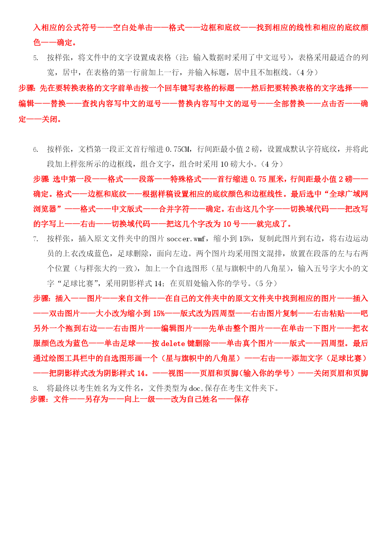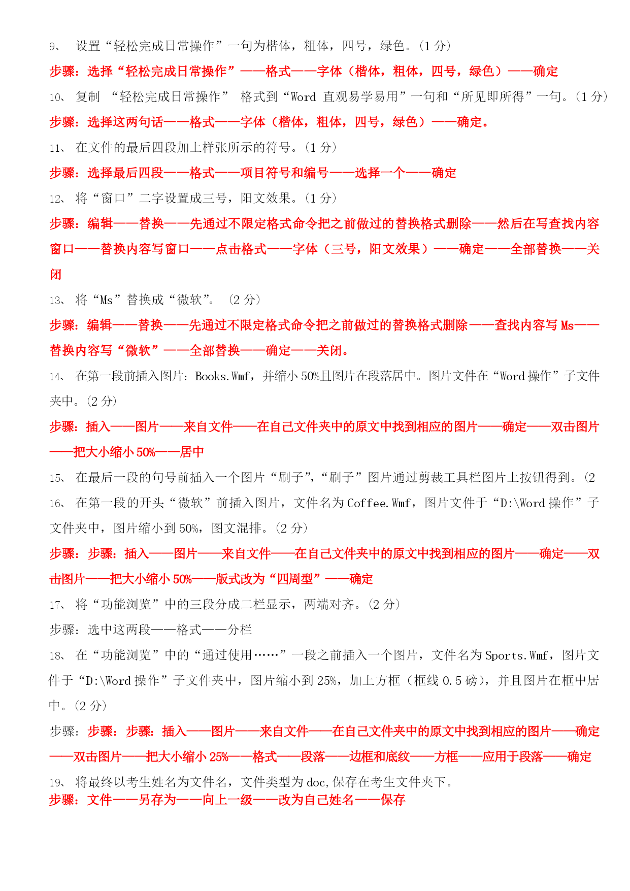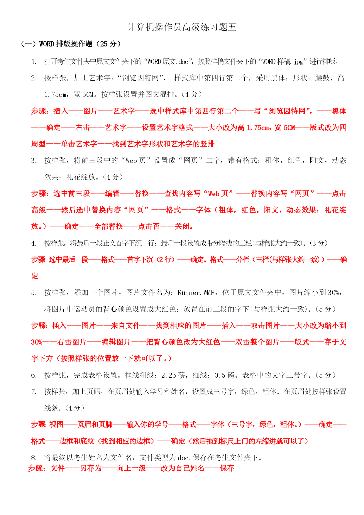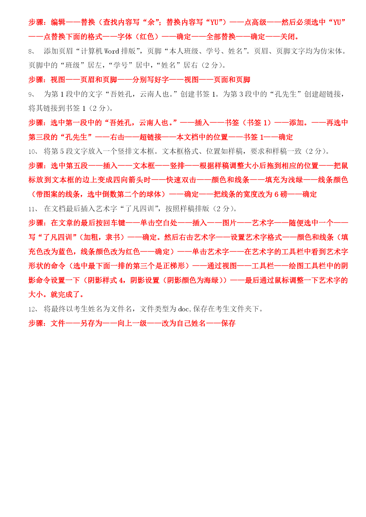 计算机操作员高级练习题一(一)WORD排版操作题(25分)打开考生文件夹中原文文件夹下的“WORD原文.doc”,按照样稿文件夹下的“WORD样稿.jpg”进行排版。给文章加上标题“立命之学”。其排版格式为:小一号隶书体,红色,居中,字符间距加宽6磅,黄色底纹,图案样式为10%,图案颜色自动,1.5磅蓝色单波浪线边框(2分)。步骤:先在文章顶端单击一下按回车键写“立命之学”,然后选择“立命之学”——格式——字体(小一号隶书体,红色,居中,字符间距加宽6磅)——确定。格式——边框和底纹(黄色底纹,图案样式为10%,图案颜色自动,1.5磅蓝色单波浪线边框)——边框和底纹都是应用文字——确定。给上述标题加尾注。尾注文字为“作者:明朝袁了凡。”(2分)。步骤:选中标题——插入——引用——脚注和尾注——点尾注——把编码的格式改一下——插入——写“作者:明朝袁了凡。”——就完成了。全文每段首行缩进2个字符。第1段段前、段后间距各10磅,行间距20磅,小四号行楷,粉红色双波浪下划线。第2段1.5倍行间距,小四号绿色仿宋体,字间距紧缩0.5磅,“亦真亦幻”文字效果(2+2分)。步骤:选中全文——格式——段落——特殊格式——首行缩进(2个字符)——确定。然后选中第一段——格式——段落(段前、段后间距各10磅,行间距20磅,)——确定——格式——字体(小四号行楷,粉红色双波浪下划线)——确定;在选中第二段——格式——段落(1.5倍行间距)——确定。格式——字体(小四号绿色仿宋体,字间距紧缩0.5磅,“亦真亦幻”文字效果)——确定。第3段1.5倍行间距,分成三栏,栏间距0.5厘米,加栏线。在该段的第二栏中插入“计算器”窗口(标准型)的图片。图片大小为4.5×4.5厘米,图片位置、格式如样稿(2+2分)。步骤:选中第三段——格式——段落(1.5倍行间距)——确定。格式——分栏——分成三栏,栏间距0.5厘米,加栏线。最后通过开设——所有程序——附件把“计算机”打开(按alt+printscreen)截屏键把计算机截下来——放到第二栏中右击——粘贴——双击图片——大小设置为(4.5×4.5厘米)——确定。最后单击图片——在图片的前面和后面都按一个回车键——单击图片——格式——边框和底纹——(边框,线条颜色改为橙色,宽度改为2.5磅)——应用于段落——确定。就成功了。将第4段和第5段交换位置。交换后的第4段设置首字下沉2行。首字用魏碑体。第4段文本用小四号楷体,缩放130%(1+2分)。步骤:把第四段选中——右击——剪切——放到第五段后面单击一下按回车——右击粘贴——选中换过位置的第四段——格式——首字下沉(首字下沉2行)——确定,格式——字体(小四号楷体,缩放130%)——确定。将文中所有的“余”字替换成红色的“YU”(2分)。步骤:编辑——替换(查找内容写“余”;替换内容写“YU”)——点高级——然后必须选中“YU”——点替换下面的格式——字体(红色)——确定——全部替换——确定——关闭。添加页眉“计算机Word排版”,页脚“本人班级、学号、姓名”。页眉、页脚文字均为仿宋体。页脚中的“班级”居左,“学号”居中,“姓名”居右(2分)。步骤:视图——页眉和页脚——分别写好字——视图——页面和页脚为第1段中的文字“吾姓孔,云南人也。”创建书签1。为第3段中的“孔先生”创建超链接,将其链接到书签1(2分)。步骤:选中第一段中的“吾姓孔,云南人也。”——插入——书签(书签1)——添加。——再选中第三段的“孔先生”——右击——超链接——本文档中的位置——书签1——确定将第5段文字放入一个竖排文本框。文本框格式、位置如样稿,要求和样稿一致(2分)。步骤:选中第五段——插入——文本框——竖排——根据样稿调整大小后拖到相应的位置——把鼠标放到文本框的边上变成四向箭头时——快速双击——颜色和线条——填充为浅绿——线条颜色(带图案的线条,选中倒数第二个的球体)——确定——把线条的宽度改为6磅——确定在文档最后插入艺术字“了凡四训”,按照样稿排版(2分)。步骤:在文章的最后按回车键——单击空白处——插入——图片——艺术字——随便选中一个——写“了凡四训”(加粗,隶书)——确定。然后右击艺术字——设置艺术字格式——颜色和线条(填充色改为蓝色,线条颜色改为红色——确定)——单击艺术字——在艺术字的工具栏中看到艺术字形状的命令(选中最下面一排的第三个是正梯形)——通过视图——工具栏——绘图工具栏中的阴影命令设置一下(阴影样式4,阴影设置(阴影颜色为海绿))——最后通过鼠标调整一下艺术字的大小。就完成了。将最终以考生姓名为文件名,文件类型为doc,保存在考生文件夹下。步骤:文件——另存为——向上一级——改为自己姓名——保存计算机