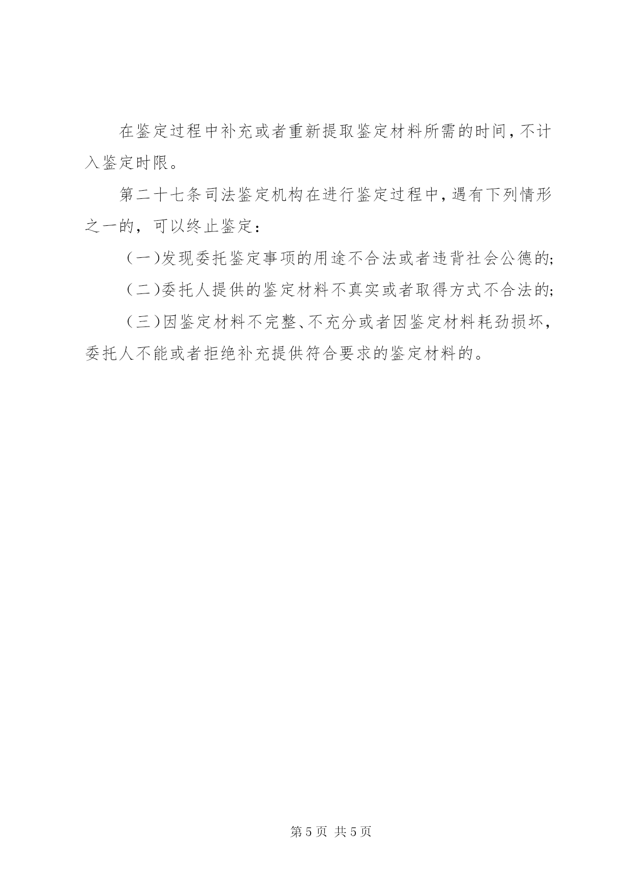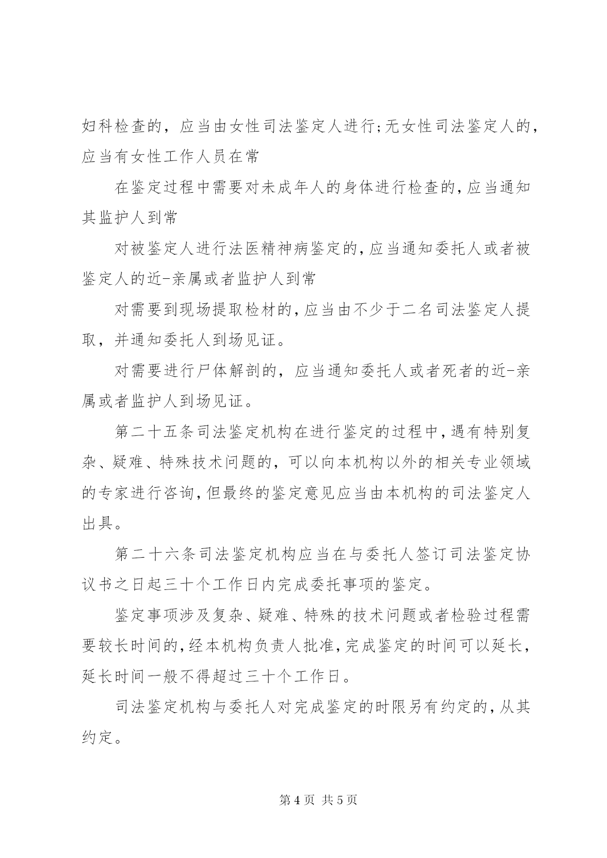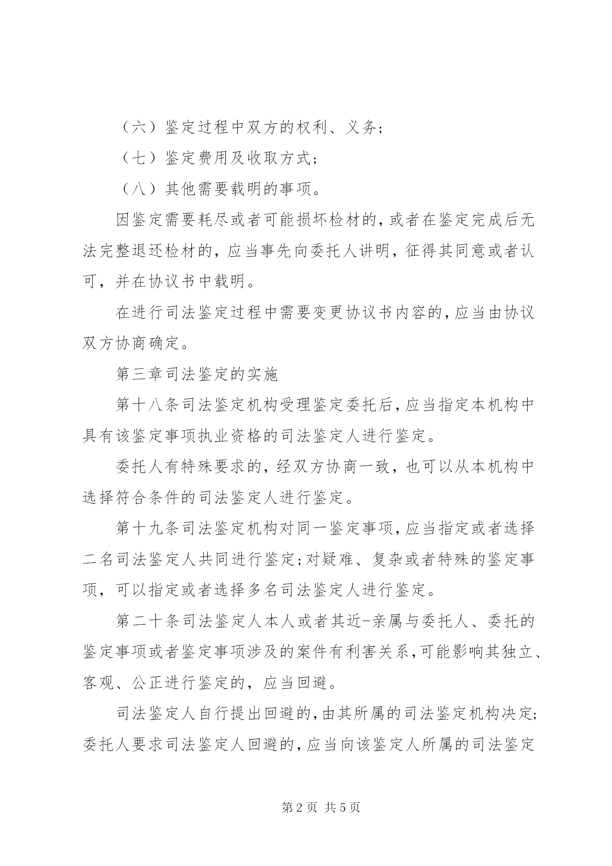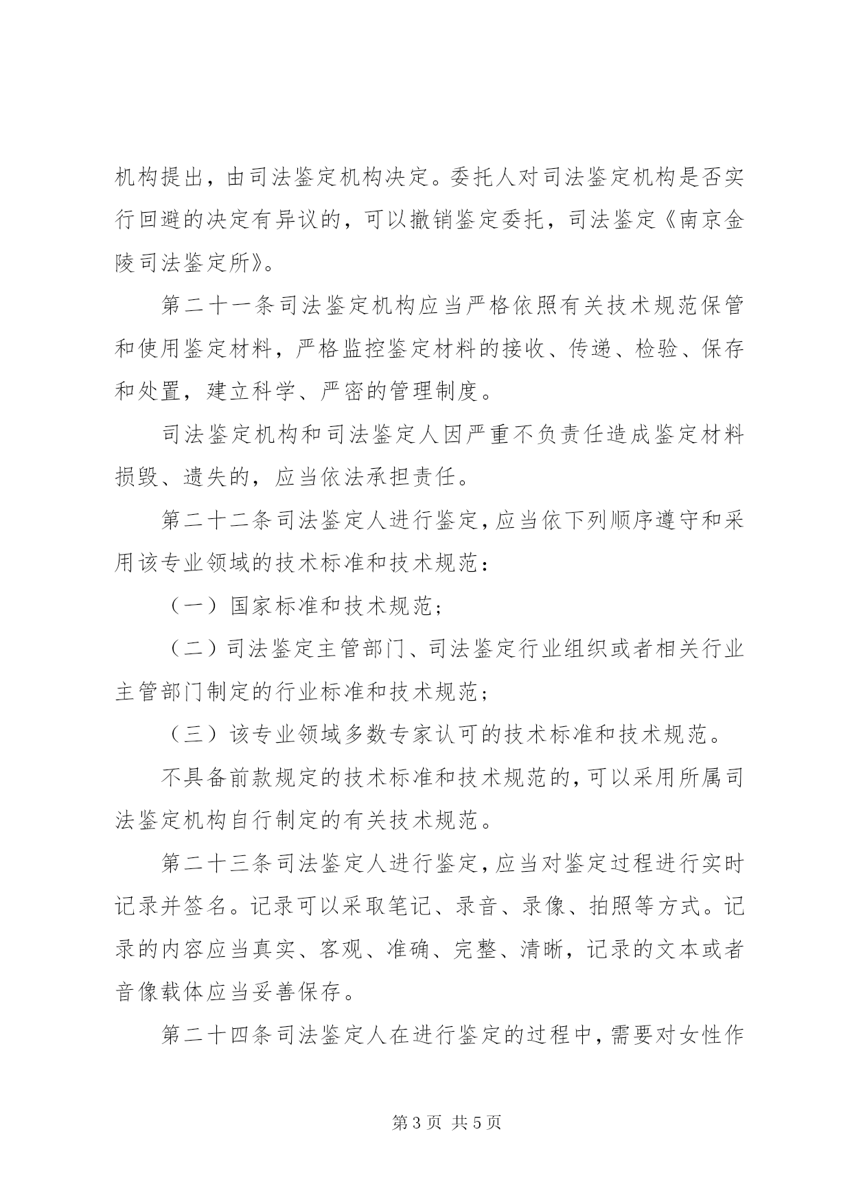 第PAGE\*Arabic\*MERGEFORMAT5页共NUMPAGES\*MERGEFORMAT5页南京金陵司法鉴定所(一)委托事项超出本机构司法鉴定业务范围的;(二)鉴定材料不真实、不完整、不充分或者取得方式不合法的;(三)鉴定事项的用途不合法或者违背社会公德的;(四)鉴定要求不符合司法鉴定执业规则或者相关鉴定技术规范的;(五)鉴定要求超出本机构技术条件和鉴定能力的;(六)不符合本通则第二十九条规定的;(七)其他不符合法律、法规、规章规定情形的,南京金陵司法鉴定所。对不予受理的,应当向委托人说明理由,退还其提供的鉴定材料。第十七条司法鉴定机构决定受理鉴定委托的,应当与委托人在协商一致的基础上签订司法鉴定协议书。司法鉴定协议书应当载明下列事项:(一)委托人和司法鉴定机构的基本情况;(二)委托鉴定的事项及用途;(三)委托鉴定的要求;(四)委托鉴定事项涉及的案件的简要情况;(五)委托人提供的鉴定材料的目录和数量;(六)鉴定过程中双方的权利、义务;(七)鉴定费用及收取方式;(八)其他需要载明的事项。因鉴定需要耗尽或者可能损坏检材的,或者在鉴定完成后无法完整退还检材的,应当事先向委托人讲明,征得其同意或者认可,并在协议书中载明。在进行司法鉴定过程中需要变更协议书内容的,应当由协议双方协商确定。第三章司法鉴定的实施第十八条司法鉴定机构受理鉴定委托后,应当指定本机构中具有该鉴定事项执业资格的司法鉴定人进行鉴定。委托人有特殊要求的,经双方协商一致,也可以从本机构中选择符合条件的司法鉴定人进行鉴定。第十九条司法鉴定机构对同一鉴定事项,应当指定或者选择二名司法鉴定人共同进行鉴定;对疑难、复杂或者特殊的鉴定事项,可以指定或者选择多名司法鉴定人进行鉴定。第二十条司法鉴定人本人或者其近-亲属与委托人、委托的鉴定事项或者鉴定事项涉及的案件有利害关系,可能影响其独立、客观、公正进行鉴定的,应当回避。司法鉴定人自行提出回避的,由其所属的司法鉴定机构决定;委托人要求司法鉴定人回避的,应当向该鉴定人所属的司法鉴定机构提出,由司法鉴定机构决定。委托人对司法鉴定机构是否实行回避的决定有异议的,可以撤销鉴定委托,司法鉴定《南京金陵司法鉴定所》。第二十一条司法鉴定机构应当严格依照有关技术规范保管和使用鉴定材料,严格监控鉴定材料的接收、传递、检验、保存和处置,建立科学、严密的管理制度。司法鉴定机构和司法鉴定人因严重不负责任造成鉴定材料损毁、遗失的,应当依法承担责任。第二十二条司法鉴定人进行鉴定,应当依下列顺序遵守和采用该专业领域的技术标准和技术规范:(一)国家标准和技术规范;(二)司法鉴定主管部门、司法鉴定行业组织或者相关行业主管部门制定的行业标准和技术规范;(三)该专业领域多数专家认可的技术标准和技术规范。不具备前款规定的技术标准和技术规范的,可以采用所属司法鉴定机构自行制定的有关技术规范。第二十三条司法鉴定人进行鉴定,应当对鉴定过程进行实时记录并签名。记录可以采取笔记、录音、录像、拍照等方式。记录的内容应当真实、客观、准确、完整、清晰,记录的文本或者音像载体应当妥善保存。第二十四条司法鉴定人在进行鉴定的过程中,需要对女性作妇科检查的,应当由女性司法鉴定人进行;无女性司法鉴定人的,应当有女性工作人员在常在鉴定过程中需要对未成年人的身体进行检查的,应当通知其监护人到常对被鉴定人进行法医精神病鉴定的,应当通知委托人或者被鉴定人的近-亲属或者监护人到常对需要到现场提取检材的,应当由不少于二名司法鉴定人提取,并通知委托人到场见证。对需要进行尸体解剖的,应当通知委托人或者死者的近-亲属或者监护人到场见证。第二十五条司法鉴定机构在进行鉴定的过程中,遇有特别复杂、疑难、特殊技术问题的,可以向本机构以外的相关专业领域的专家进行咨询,但最终的鉴定意见应当由本机构的司法鉴定人出具。第二十六条司法鉴定机构应当在与委托人签订司法鉴定协议书之日起三十个工作日内完成委托事项的鉴定。鉴定事项涉及复杂、疑难、特殊的技术问题或者检验过程需要较长时间的,经本机构负责人批准,完成鉴定的时间可以延长,延长时间一般不得超过三十个工作日。司法鉴定机构与委托人对完成鉴定的时限另有约定的,从其约定。在鉴定过程中补充或者重新提取鉴定材料所需的时间,不计入鉴定时限。第二十七条司法鉴定机构在进行鉴定过程中,遇有下列情形之一的,可以终止鉴定:(一)发现委托鉴定事项的用途不合法或者违背社会公德的;(二)委托人提供的鉴定材料不真实或者取得方式不合法的;(三)因鉴定材料不完整、不充分或者因鉴定材料耗劲损坏,委托人不能或者拒绝补充提供符合要求的鉴定材料的。