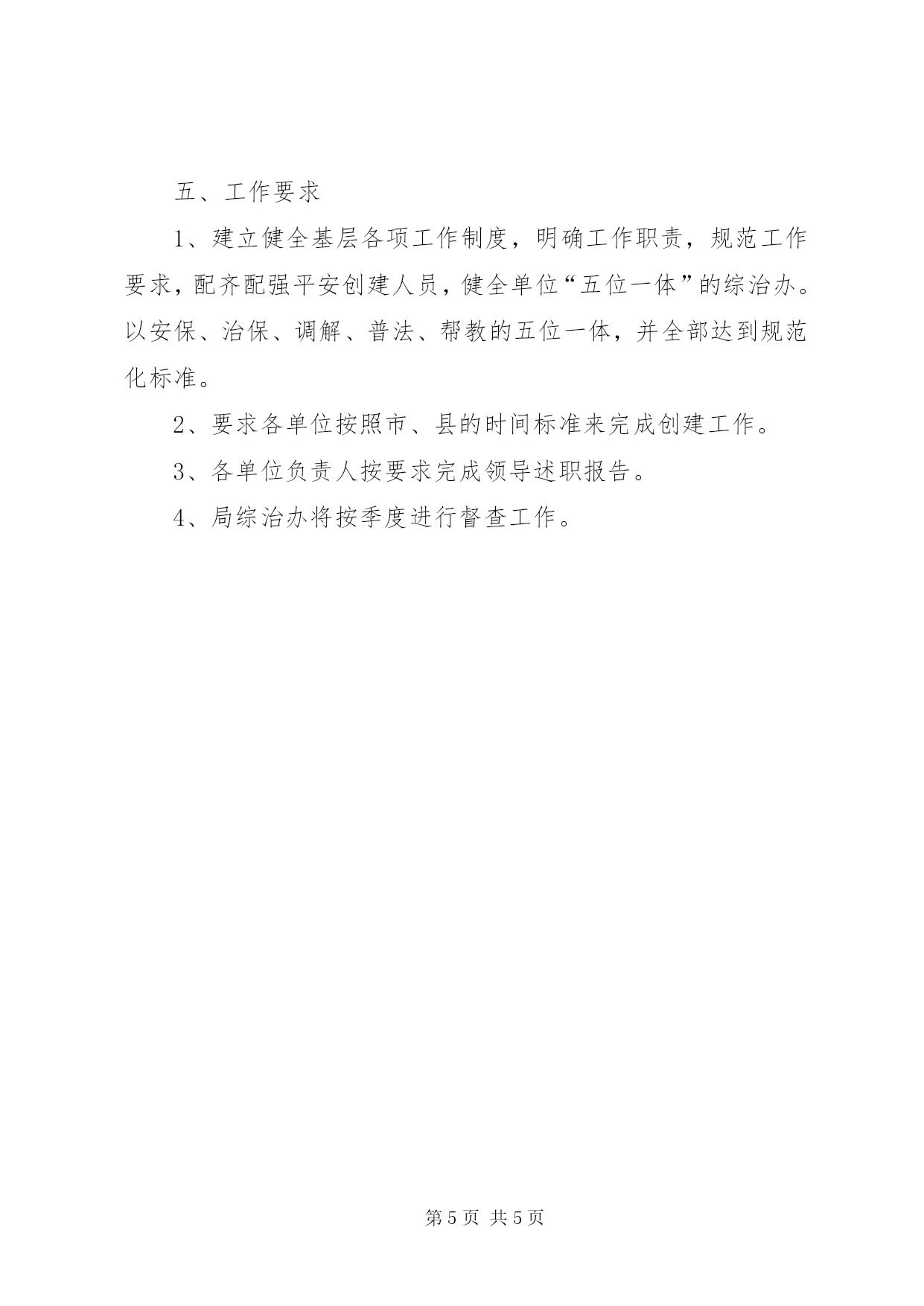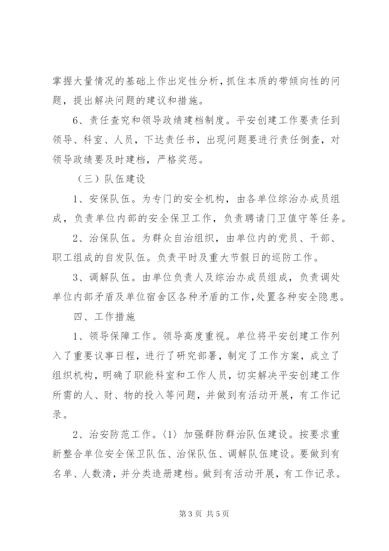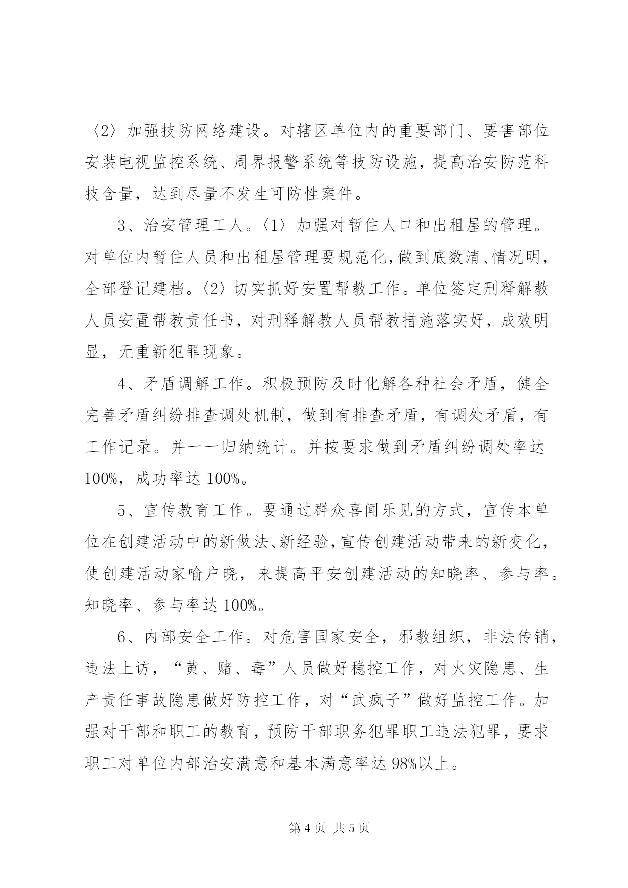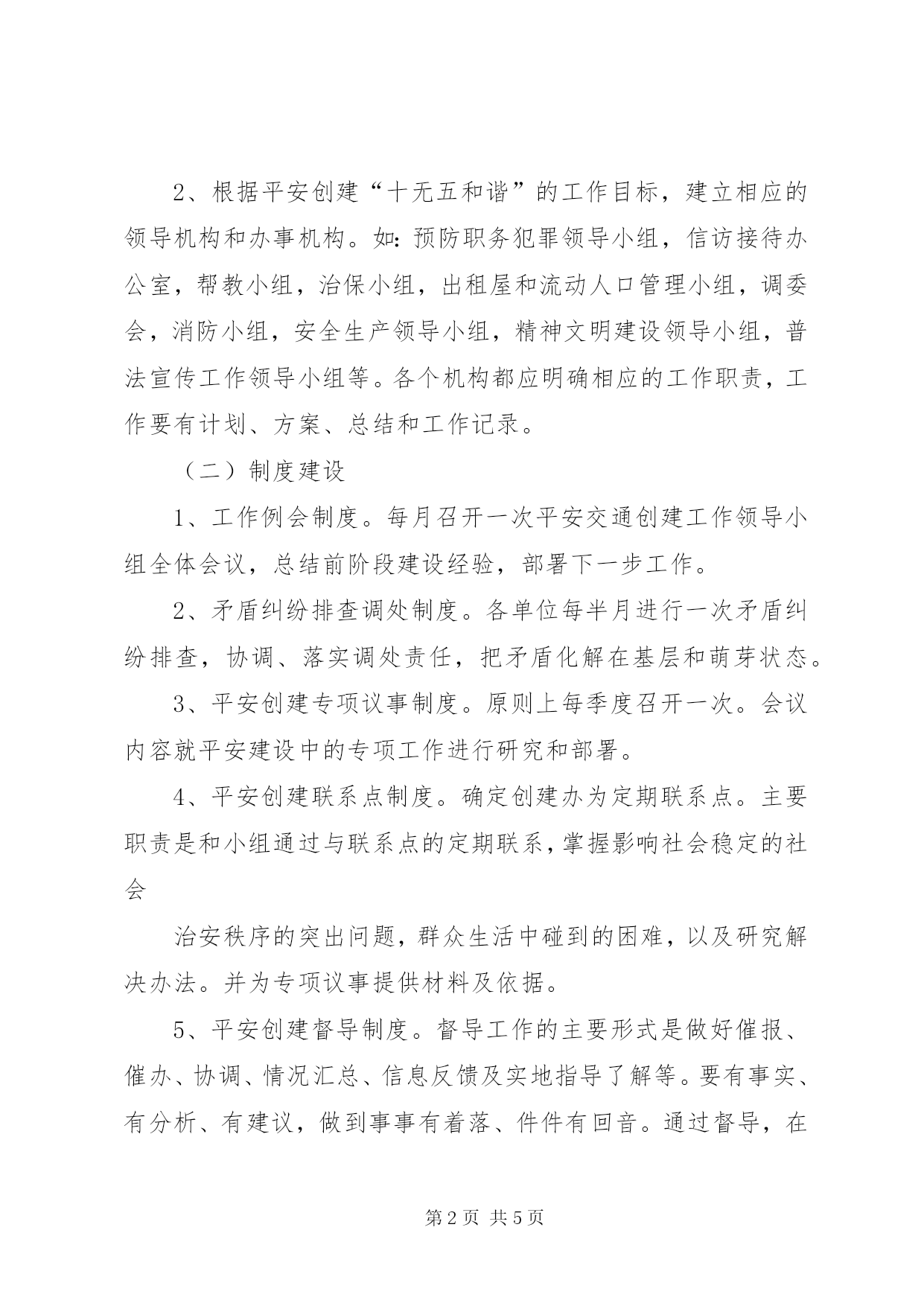 第PAGE\*Arabic\*MERGEFORMAT5页共NUMPAGES\*MERGEFORMAT5页交通局平安创建指导方案一、指导思想以“三个代表”重要思想为指导,贯彻落实科学发展观,抓稳定、保平安,确保交通行业安全稳定态势,为构建社会主义和谐社会创造稳定的社会环境。二、工作目标平安交通创建应达到“十无五和谐”的目标。即。1、无职务犯罪;2、无群体性上访;3、无邪教组织人员活动;4、无治安案件发生;5、无可防性刑事案件发生;6、无两劳人员重新犯罪;7、无火灾、消防事故发生;8、无安全责任事故发生;9、无“民转刑”案件;10、无“黄赌毒”现象。“五和谐”为。领导和谐、干群和谐、职工和谐、家庭和谐、邻里和谐。三、工作内容(一)组织建设1、成立平安建设领导小组。2、根据平安创建“十无五和谐”的工作目标,建立相应的领导机构和办事机构。如:预防职务犯罪领导小组,信访接待办公室,帮教小组,治保小组,出租屋和流动人口管理小组,调委会,消防小组,安全生产领导小组,精神文明建设领导小组,普法宣传工作领导小组等。各个机构都应明确相应的工作职责,工作要有计划、方案、总结和工作记录。(二)制度建设1、工作例会制度。每月召开一次平安交通创建工作领导小组全体会议,总结前阶段建设经验,部署下一步工作。2、矛盾纠纷排查调处制度。各单位每半月进行一次矛盾纠纷排查,协调、落实调处责任,把矛盾化解在基层和萌芽状态。3、平安创建专项议事制度。原则上每季度召开一次。会议内容就平安建设中的专项工作进行研究和部署。4、平安创建联系点制度。确定创建办为定期联系点。主要职责是和小组通过与联系点的定期联系,掌握影响社会稳定的社会治安秩序的突出问题,群众生活中碰到的困难,以及研究解决办法。并为专项议事提供材料及依据。5、平安创建督导制度。督导工作的主要形式是做好催报、催办、协调、情况汇总、信息反馈及实地指导了解等。要有事实、有分析、有建议,做到事事有着落、件件有回音。通过督导,在掌握大量情况的基础上作出定性分析,抓住本质的带倾向性的问题,提出解决问题的建议和措施。6、责任查究和领导政绩建档制度。平安创建工作要责任到领导、科室、人员,下达责任书,出现问题要进行责任倒查,对领导政绩要及时建档,严格奖惩。(三)队伍建设1、安保队伍。为专门的安全机构,由各单位综治办成员组成,负责单位内部的安全保卫工作,负责聘请门卫值守等任务。2、治保队伍。为群众自治组织,由单位内的党员、干部、职工组成的自发队伍。负责平时及重大节假日的巡防工作。3、调解队伍。由单位负责人及综治办成员组成,负责调处单位内部矛盾及单位宿舍区各种矛盾的工作,处置各种安全隐患。四、工作措施1、领导保障工作。领导高度重视。单位将平安创建工作列入了重要议事日程,进行了研究部署,制定了工作方案,成立了组织机构,明确了职能科室和工作人员,切实解决平安创建工作所需的人、财、物的投入等问题,并做到有活动开展,有工作记录。2、治安防范工作。〈1〉加强群防群治队伍建设。按要求重新整合单位安全保卫队伍、治保队伍、调解队伍建设。要做到有名单、人数清,并分类造册建档。做到有活动开展,有工作记录。〈2〉加强技防网络建设。对辖区单位内的重要部门、要害部位安装电视监控系统、周界报警系统等技防设施,提高治安防范科技含量,达到尽量不发生可防性案件。3、治安管理工人。〈1〉加强对暂住人口和出租屋的管理。对单位内暂住人员和出租屋管理要规范化,做到底数清、情况明,全部登记建档。〈2〉切实抓好安置帮教工作。单位签定刑释解教人员安置帮教责任书,对刑释解教人员帮教措施落实好,成效明显,无重新犯罪现象。4、矛盾调解工作。积极预防及时化解各种社会矛盾,健全完善矛盾纠纷排查调处机制,做到有排查矛盾,有调处矛盾,有工作记录。并一一归纳统计。并按要求做到矛盾纠纷调处率达100%,成功率达100%。5、宣传教育工作。要通过群众喜闻乐见的方式,宣传本单位在创建活动中的新做法、新经验,宣传创建活动带来的新变化,使创建活动家喻户晓,来提高平安创建活动的知晓率、参与率。知晓率、参与率达100%。6、内部安全工作。对危害国家安全,邪教组织,非法传销,违法上访,“黄、赌、毒”人员做好稳控工作,对火灾隐患、生产责任事故隐患做好防控工作,对“武疯子”做好监控工作。加强对干部和职工的教育,预防干部职务犯罪职工违法犯罪,要求职工对单位内部治安满意和基本满意率达98%以上。五、工作要求1、建立健全基层各项工作制度,明确工作职责,规范工作要求,配齐配强平安创建人员,健全单位“五位一体”的综治办。以安保、治保、调解、普法、帮教的五位一体,并全部达到规范化标准。2、要求各单位按照市、县的时间标准来完成创建工作。3、各单位负责人按要求完成领导述职报告。4、局综治办将按季度进行督查工作