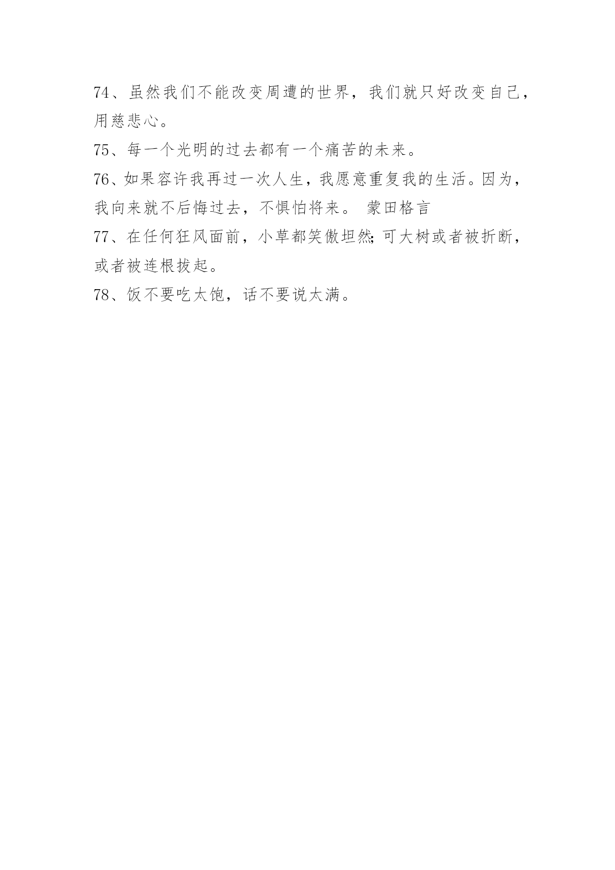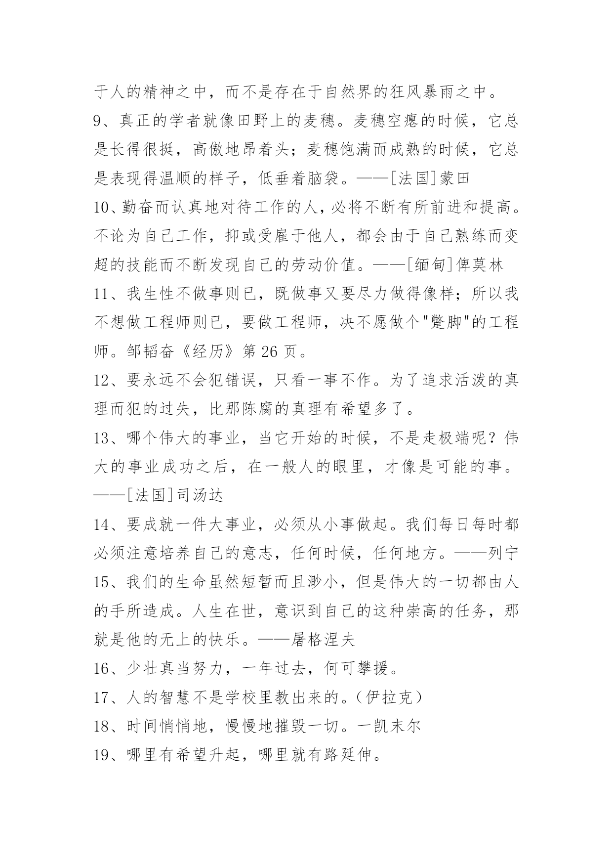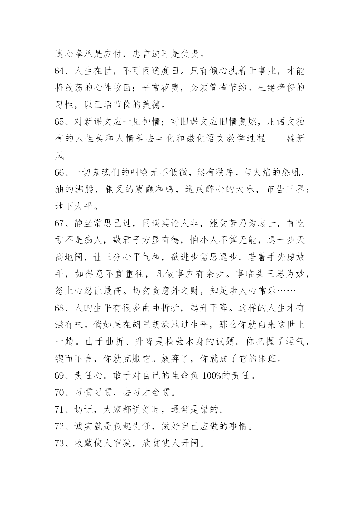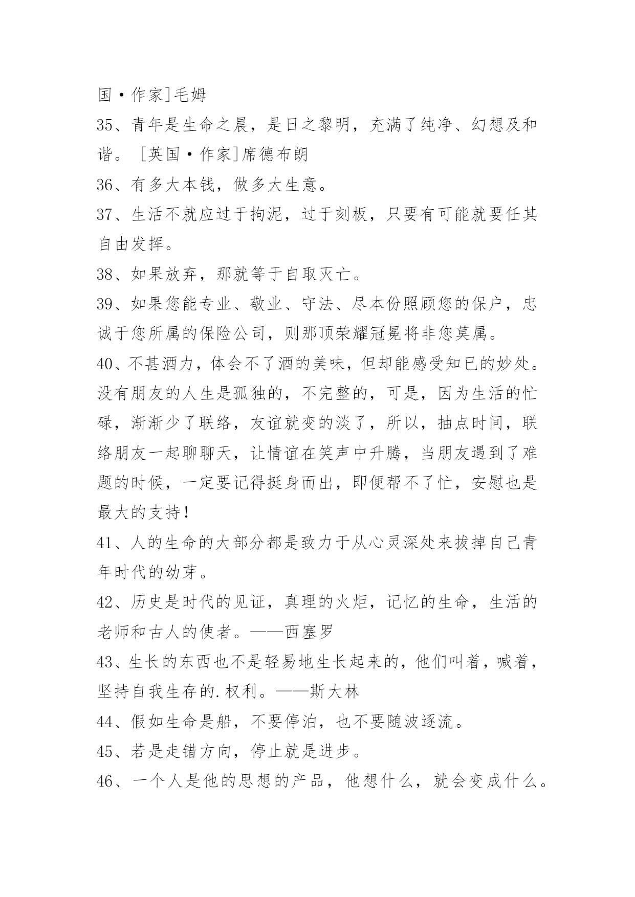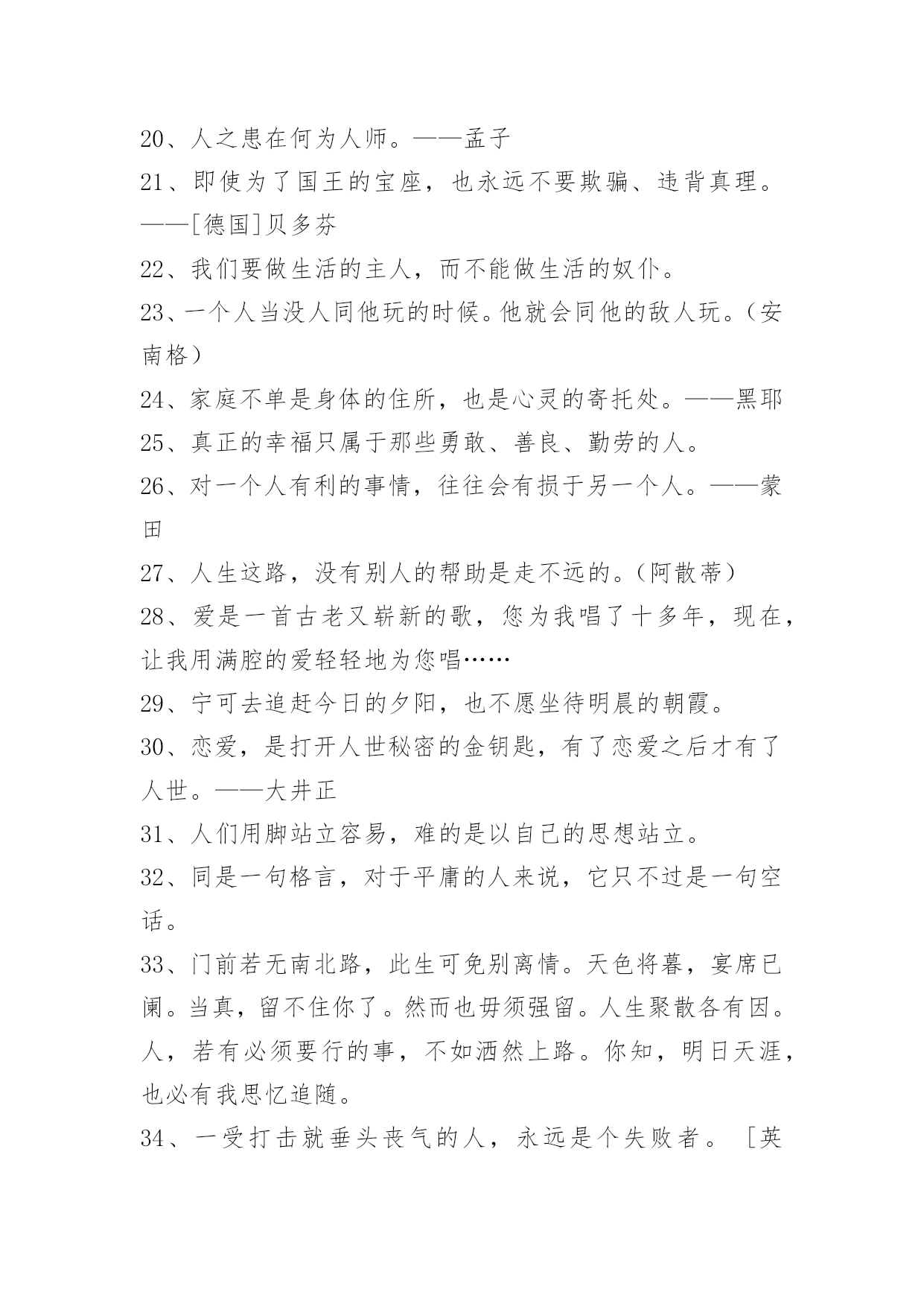 人生感悟格言78条人生感悟格言集锦78条见其诚心而金石为之开。——韩耍以下是小编为大家收集的人生感悟格言78条,欢迎阅读与收藏。1、不要刻意把有可能是伙伴的人变成对手。2、慎重地进行每一次选择,选择之后坚定地走好每一步!3、不要让苦难扼住你的喉咙,我们要把握住命运的命脉,不能屈服。4、大部分开拓新领域的科学发现,都具有难以预见的本性,因而,作出这样一种发现的几乎是唯一的道路,就依赖于无意中偶然发现的某些线索。——[澳大利亚]贝弗里奇5、人生是痛苦的,人生是恐怖的。因此,人是不幸的。然而,人现在却珍惜着人生,这是因为他受着痛苦和恐怖。——[俄国]陀思妥耶夫斯基在人生的海洋上,最痛快的事是独断独航,但最悲惨的却是回头无岸。——[意大利]哥伦布6、我生活的全部乐趣都来自工作,只有那些从来都不安于创造的人才认为工作是枯燥的。——[法国]卢梭7、塑造一个完全的自我!不要盲目崇尚伟人,勿须一味模仿名人。主宰属于自己的思想王国,一旦认准道路,就毫不犹豫地走下去。8、人越是能够将心比心,他就越是真正的人。这个真理不仅是主观价值,而且表现在我们生活的每个方面。崇高存在于人的精神之中,而不是存在于自然界的狂风暴雨之中。9、真正的学者就像田野上的麦穗。麦穗空瘪的时候,它总是长得很挺,高傲地昂着头;麦穗饱满而成熟的时候,它总是表现得温顺的样子,低垂着脑袋。——[法国]蒙田10、勤奋而认真地对待工作的人,必将不断有所前进和提高。不论为自己工作,抑或受雇于他人,都会由于自己熟练而变超的技能而不断发现自己的劳动价值。——[缅甸]俾莫林11、我生性不做事则已,既做事又要尽力做得像样;所以我不想做工程师则已,要做工程师,决不愿做个"蹩脚"的工程师。邹韬奋《经历》。12、要永远不会犯错误,只看一事不作。为了追求活泼的真理而犯的过失,比那陈腐的真理有希望多了。13、哪个伟大的事业,当它开始的时候,不是走极端呢?伟大的事业成功之后,在一般人的眼里,才像是可能的事。——[法国]司汤达14、要成就一件大事业,必须从小事做起。我们每日每时都必须注意培养自己的意志,任何时候,任何地方。——列宁15、我们的生命虽然短暂而且渺小,但是伟大的一切都由人的手所造成。人生在世,意识到自己的这种崇高的任务,那就是他的无上的快乐。——屠格涅夫16、少壮真当努力,一年过去,何可攀援。17、人的智慧不是学校里教出来的。(伊拉克)18、时间悄悄地,慢慢地摧毁一切。一凯末尔19、哪里有希望升起,哪里就有路延伸。20、人之患在何为人师。——孟子21、即使为了国王的宝座,也永远不要欺骗、违背真理。——[德国]贝多芬22、我们要做生活的主人,而不能做生活的奴仆。23、一个人当没人同他玩的时候。他就会同他的敌人玩。(安南格)24、家庭不单是身体的住所,也是心灵的寄托处。——黑耶25、真正的幸福只属于那些勇敢、善良、勤劳的人。26、对一个人有利的事情,往往会有损于另一个人。——蒙田27、人生这路,没有别人的帮助是走不远的。(阿散蒂)28、爱是一首古老又崭新的歌,您为我唱了十多年,现在,让我用满腔的爱轻轻地为您唱……29、宁可去追赶今日的夕阳,也不愿坐待明晨的朝霞。30、恋爱,是打开人世秘密的金钥匙,有了恋爱之后才有了人世。——大井正31、人们用脚站立容易,难的是以自己的思想站立。32、同是一句格言,对于平庸的人来说,它只不过是一句空话。33、门前若无南北路,此生可免别离情。天色将暮,宴席已阑。当真,留不住你了。然而也毋须强留。人生聚散各有因。人,若有必须要行的事,不如洒然上路。你知,明日天涯,也必有我思忆追随。34、一受打击就垂头丧气的人,永远是个失败者。[英国·作家]毛姆35、青年是生命之晨,是日之黎明,充满了纯净、幻想及和谐。[英国·作家]席德布朗36、有多大本钱,做多大生意。37、生活不就应过于拘泥,过于刻板,只要有可能就要任其自由发挥。38、如果放弃,那就等于自取灭亡。39、如果您能专业、敬业、守法、尽本份照顾您的保户,忠诚于您所属的保险公司,则那顶荣耀冠冕将非您莫属。40、不甚酒力,体会不了酒的美味,但却能感受知已的妙处。没有朋友的人生是孤独的,不完整的,可是,因为生活的忙碌,渐渐少了联络,友谊就变的淡了,所以,抽点时间,联络朋友一起聊聊天,让情谊在笑声中升腾,当朋友遇到了难题的时候,一定要记得挺身而出,即便帮不了忙,安慰也是最大的支持!41、人的生命的大部分都是致力于从心灵深处来拔掉自己青年时代的幼芽。42、历史是时代的见证,真理的火炬,记忆的生命,生活的老师和古人的使者。——西塞罗43、生长的东西也不是轻易地生长起来的,他们叫着,喊着,坚持自我生存的.权利。——斯大林44、假如生命是船,不要停泊,也不要随波逐流。45、若是走错方向,停止就是进步。46、一个人是他的思想的产品,他想什么,就