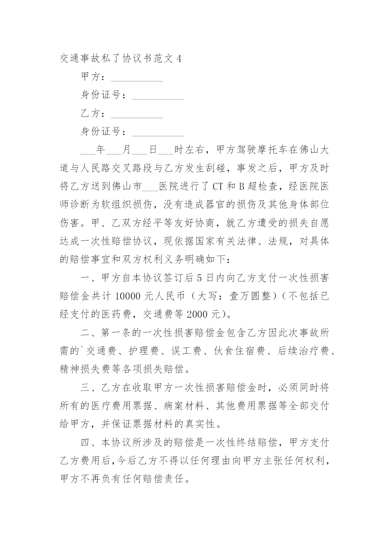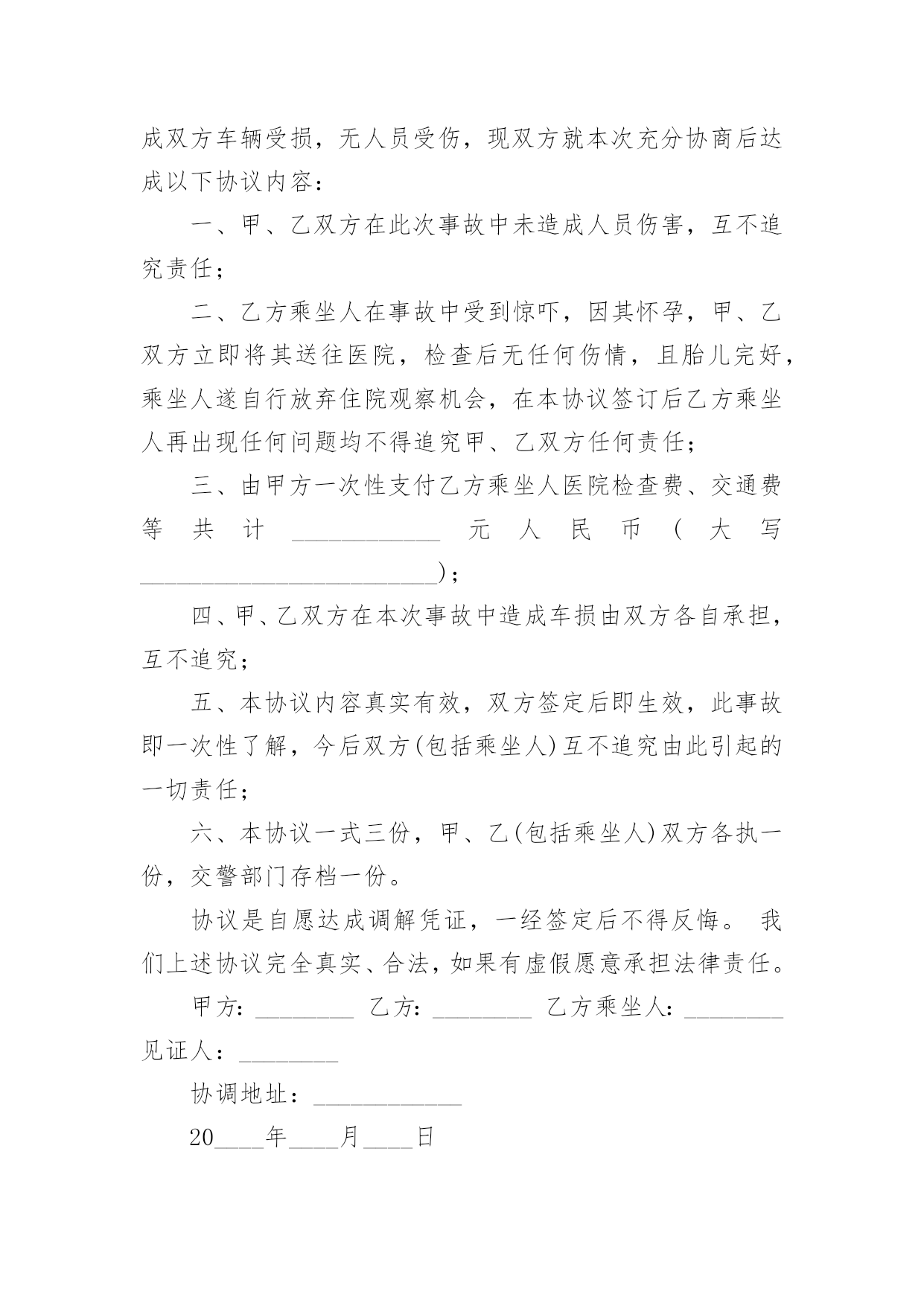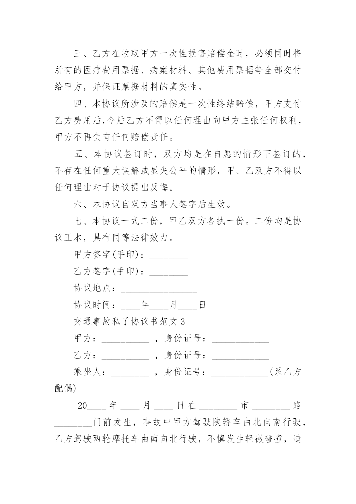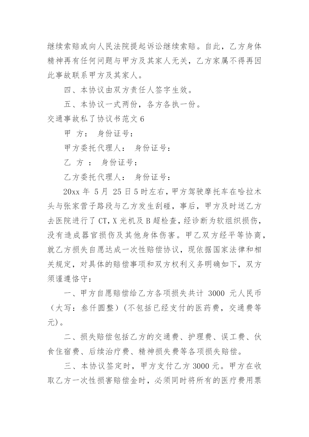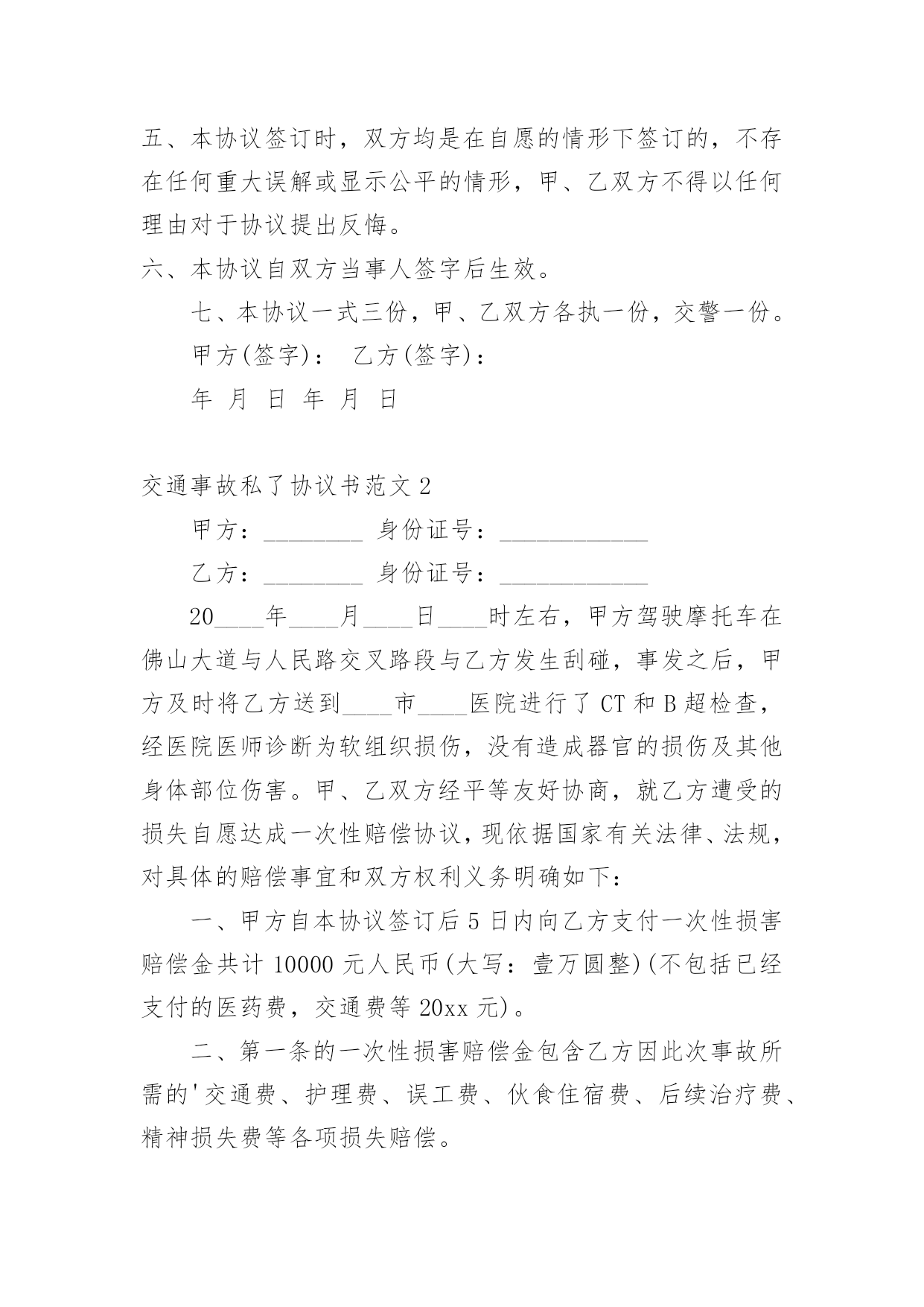 交通事故私了协议书交通事故私了协议书范文在不断进步的社会中,很多场合都离不了协议,签订签订协议可以使事务的结果更加完美化。一般协议是怎么起草的呢?下面是小编收集整理的交通事故私了协议书范文,希望对大家有所帮助。交通事故私了协议书范文1甲方:乙方:对于年月日发生的,经甲、乙双方充分协商一致达成如下协议:一、甲方赔偿给乙方各项损失共计元人民币(包括已经支付的元)。二、剩余元是由医疗补助金和甲方的赔偿金组成,在医疗补助金的基础上由甲方补足。三、损失赔偿包括乙方的交通费、护理费、误工费、伙食住宿费、后续治疗费、精神损失费、残疾赔偿金等各项损失赔偿。四、本协议所涉及的'赔偿是一次性终结赔偿,甲方支付乙方费用后,今后乙方不得以任何理由向甲方主张任何权利,甲方不再负有任何赔偿责任。五、本协议签订时,双方均是在自愿的情形下签订的,不存在任何重大误解或显示公平的情形,甲、乙双方不得以任何理由对于协议提出反悔。六、本协议自双方当事人签字后生效。七、本协议一式三份,甲、乙双方各执一份,交警一份。甲方(签字):乙方(签字):年月日年月日交通事故私了协议书范文2甲方:________身份证号:____________乙方:________身份证号:____________20____年____月____日____时左右,甲方驾驶摩托车在佛山大道与人民路交叉路段与乙方发生刮碰,事发之后,甲方及时将乙方送到____市____医院进行了CT和B超检查,经医院医师诊断为软组织损伤,没有造成器官的损伤及其他身体部位伤害。甲、乙双方经平等友好协商,就乙方遭受的损失自愿达成一次性赔偿协议,现依据国家有关法律、法规,对具体的赔偿事宜和双方权利义务明确如下:一、甲方自本协议签订后5日内向乙方支付一次性损害赔偿金共计10000元人民币(大写:壹万圆整)(不包括已经支付的医药费,交通费等20xx元)。二、第一条的一次性损害赔偿金包含乙方因此次事故所需的'交通费、护理费、误工费、伙食住宿费、后续治疗费、精神损失费等各项损失赔偿。三、乙方在收取甲方一次性损害赔偿金时,必须同时将所有的医疗费用票据、病案材料、其他费用票据等全部交付给甲方,并保证票据材料的真实性。四、本协议所涉及的赔偿是一次性终结赔偿,甲方支付乙方费用后,今后乙方不得以任何理由向甲方主张任何权利,甲方不再负有任何赔偿责任。五、本协议签订时,双方均是在自愿的情形下签订的,不存在任何重大误解或显失公平的情形,甲、乙双方不得以任何理由对于协议提出反悔。六、本协议自双方当事人签字后生效。七、本协议一式二份,甲乙双方各执一份。二份均是协议正本,具有同等法律效力。甲方签字(手印):________乙方签字(手印):________协议地点:________________协议时间:____年____月____日交通事故私了协议书范文3甲方:__________,身份证号:____________乙方:__________,身份证号:____________乘坐人:________,身份证号:____________(系乙方配偶)20____年____月____日在________市________路________门前发生,事故中甲方驾驶陕轿车由北向南行驶,乙方驾驶两轮摩托车由南向北行驶,不慎发生轻微碰撞,造成双方车辆受损,无人员受伤,现双方就本次充分协商后达成以下协议内容:一、甲、乙双方在此次事故中未造成人员伤害,互不追究责任;二、乙方乘坐人在事故中受到惊吓,因其怀孕,甲、乙双方立即将其送往医院,检查后无任何伤情,且胎儿完好,乘坐人遂自行放弃住院观察机会,在本协议签订后乙方乘坐人再出现任何问题均不得追究甲、乙双方任何责任;三、由甲方一次性支付乙方乘坐人医院检查费、交通费等共计____________元人民币(大写________________________);四、甲、乙双方在本次事故中造成车损由双方各自承担,互不追究;五、本协议内容真实有效,双方签定后即生效,此事故即一次性了解,今后双方(包括乘坐人)互不追究由此引起的一切责任;六、本协议一式三份,甲、乙(包括乘坐人)双方各执一份,交警部门存档一份。协议是自愿达成调解凭证,一经签定后不得反悔。我们上述协议完全真实、合法,如果有虚假愿意承担法律责任。甲方:________乙方:________乙方乘坐人:________见证人:________协调地址:____________20____年____月____日交通事故私了协议书范文4甲方:__________身份证号:__________乙方:__________身份证号:_____________年___月___日___时左右,甲方驾驶摩托车在佛山大道与人民路交叉路段与乙方发生刮碰,事发之后,甲方及时将乙方送到佛山市