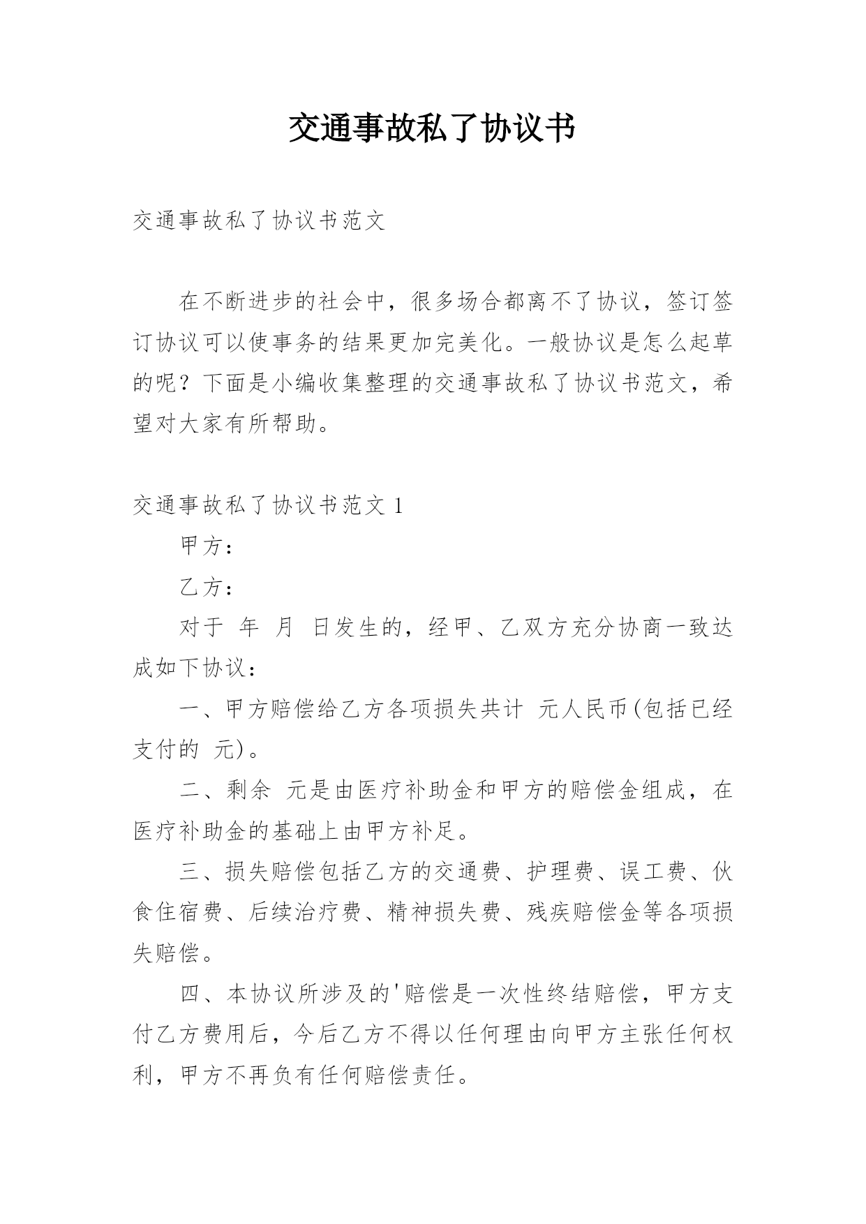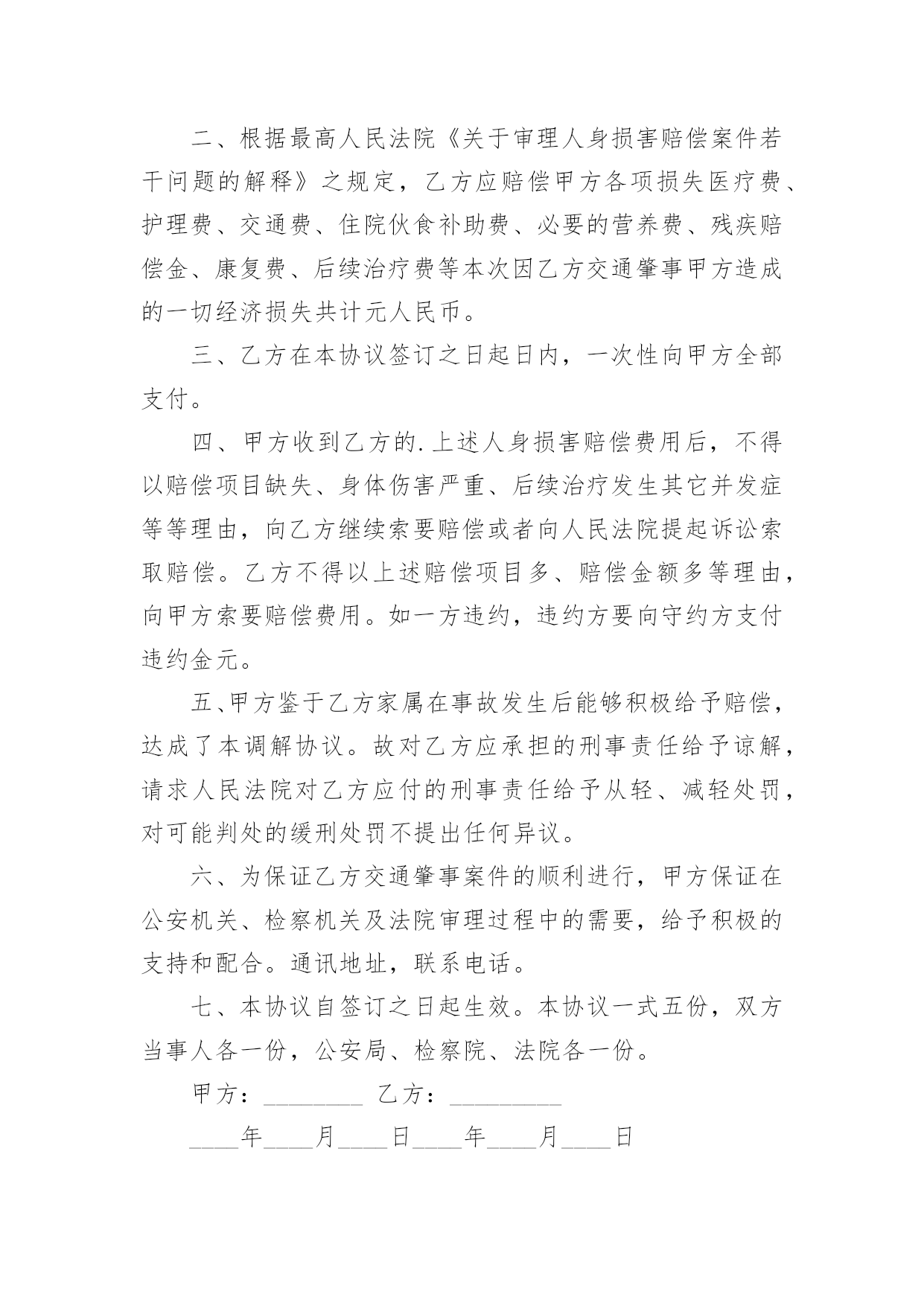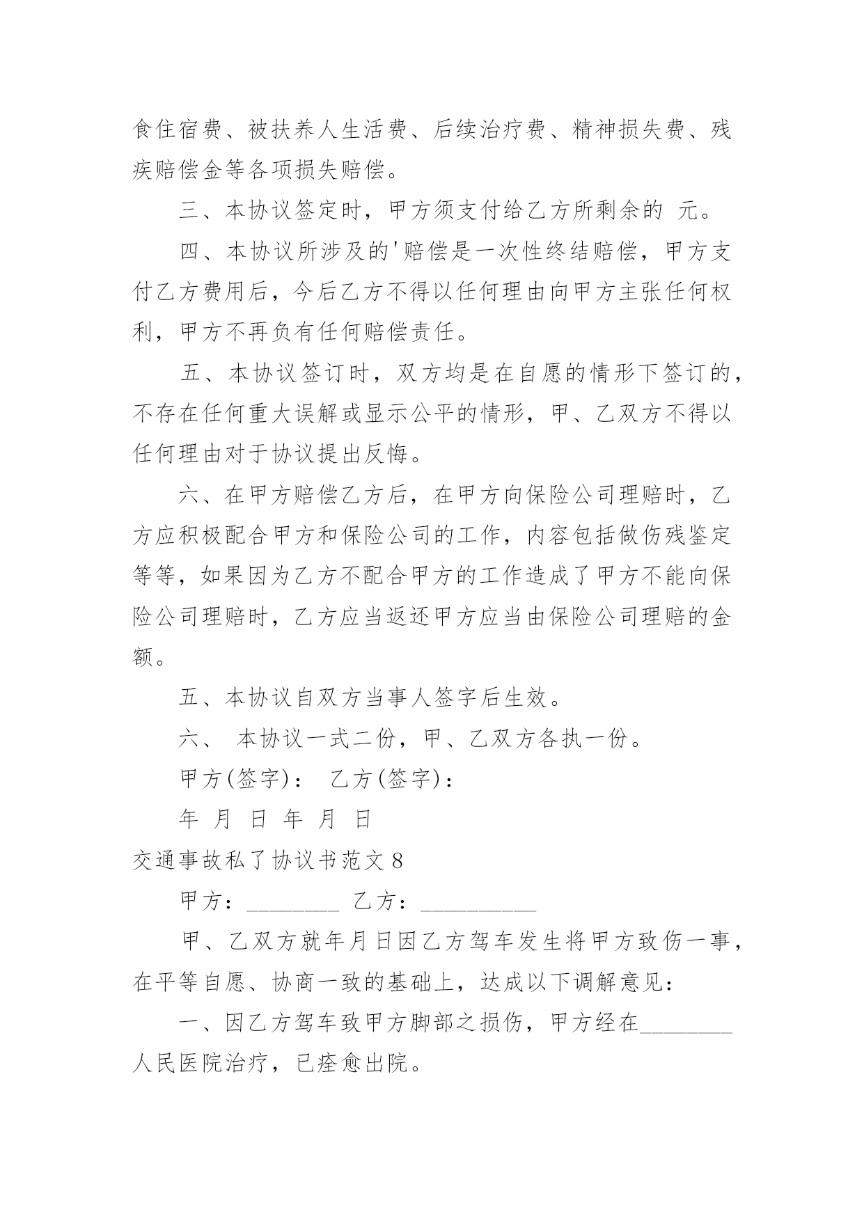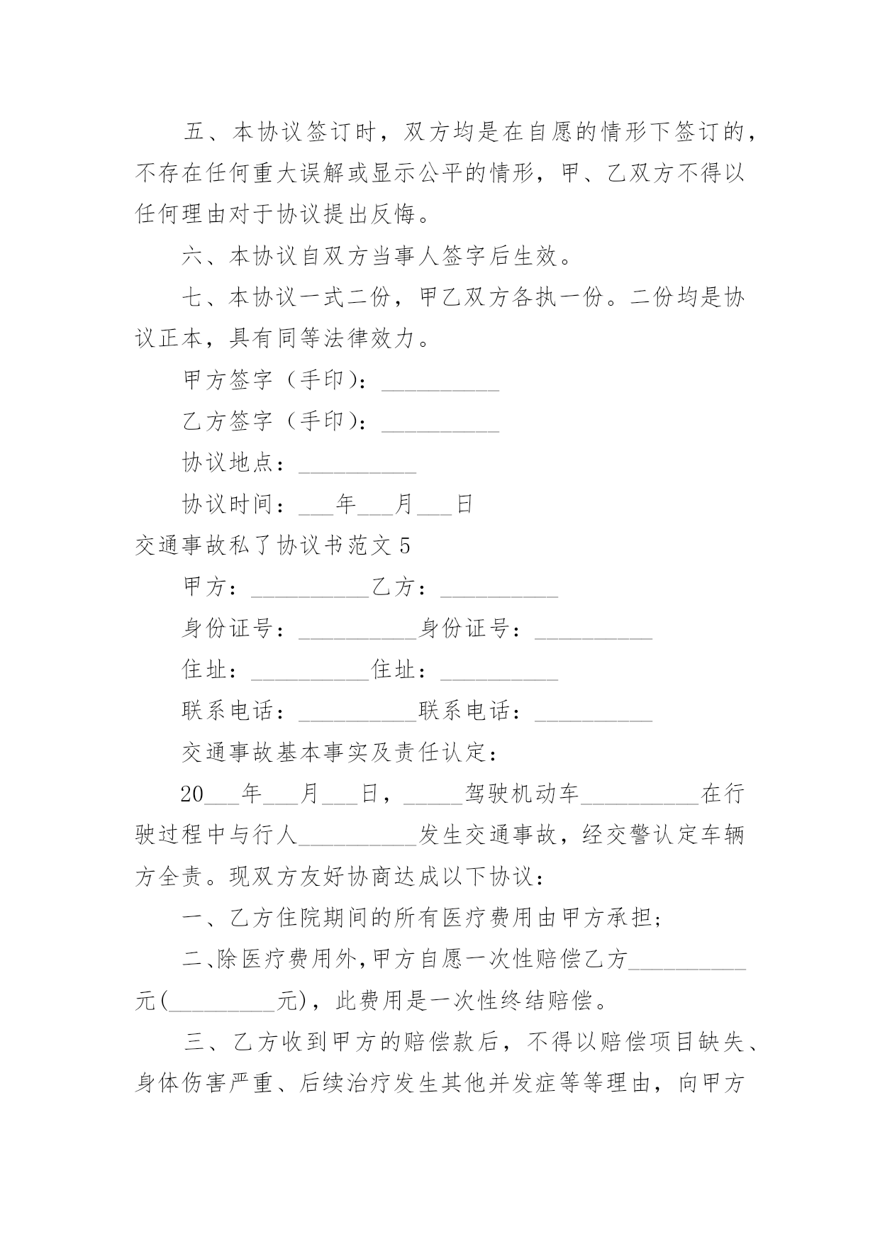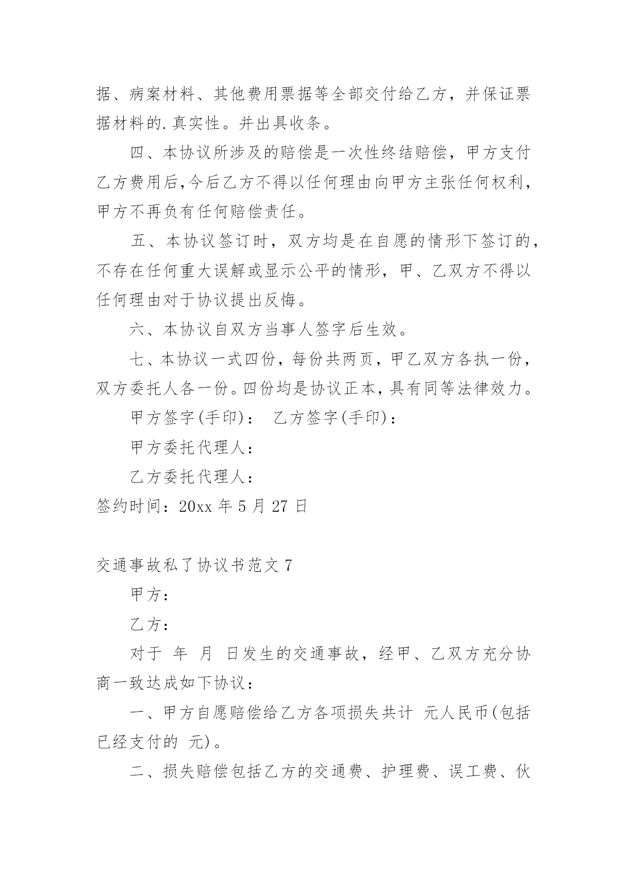 交通事故私了协议书交通事故私了协议书范文在不断进步的社会中,很多场合都离不了协议,签订签订协议可以使事务的结果更加完美化。一般协议是怎么起草的呢?下面是小编收集整理的交通事故私了协议书范文,希望对大家有所帮助。交通事故私了协议书范文1甲方:乙方:对于年月日发生的,经甲、乙双方充分协商一致达成如下协议:一、甲方赔偿给乙方各项损失共计元人民币(包括已经支付的元)。二、剩余元是由医疗补助金和甲方的赔偿金组成,在医疗补助金的基础上由甲方补足。三、损失赔偿包括乙方的交通费、护理费、误工费、伙食住宿费、后续治疗费、精神损失费、残疾赔偿金等各项损失赔偿。四、本协议所涉及的'赔偿是一次性终结赔偿,甲方支付乙方费用后,今后乙方不得以任何理由向甲方主张任何权利,甲方不再负有任何赔偿责任。五、本协议签订时,双方均是在自愿的情形下签订的,不存在任何重大误解或显示公平的情形,甲、乙双方不得以任何理由对于协议提出反悔。六、本协议自双方当事人签字后生效。七、本协议一式三份,甲、乙双方各执一份,交警一份。甲方(签字):乙方(签字):年月日年月日交通事故私了协议书范文2甲方:________身份证号:____________乙方:________身份证号:____________20____年____月____日____时左右,甲方驾驶摩托车在佛山大道与人民路交叉路段与乙方发生刮碰,事发之后,甲方及时将乙方送到____市____医院进行了CT和B超检查,经医院医师诊断为软组织损伤,没有造成器官的损伤及其他身体部位伤害。甲、乙双方经平等友好协商,就乙方遭受的损失自愿达成一次性赔偿协议,现依据国家有关法律、法规,对具体的赔偿事宜和双方权利义务明确如下:一、甲方自本协议签订后5日内向乙方支付一次性损害赔偿金共计10000元人民币(大写:壹万圆整)(不包括已经支付的医药费,交通费等20xx元)。二、第一条的一次性损害赔偿金包含乙方因此次事故所需的'交通费、护理费、误工费、伙食住宿费、后续治疗费、精神损失费等各项损失赔偿。三、乙方在收取甲方一次性损害赔偿金时,必须同时将所有的医疗费用票据、病案材料、其他费用票据等全部交付给甲方,并保证票据材料的真实性。四、本协议所涉及的赔偿是一次性终结赔偿,甲方支付乙方费用后,今后乙方不得以任何理由向甲方主张任何权利,甲方不再负有任何赔偿责任。五、本协议签订时,双方均是在自愿的情形下签订的,不存在任何重大误解或显失公平的情形,甲、乙双方不得以任何理由对于协议提出反悔。六、本协议自双方当事人签字后生效。七、本协议一式二份,甲乙双方各执一份。二份均是协议正本,具有同等法律效力。甲方签字(手印):________乙方签字(手印):________协议地点:________________协议时间:____年____月____日交通事故私了协议书范文3甲方:__________,身份证号:____________乙方:__________,身份证号:____________乘坐人:________,身份证号:____________(系乙方配偶)20____年____月____日在________市________路________门前发生,事故中甲方驾驶陕轿车由北向南行驶,乙方驾驶两轮摩托车由南向北行驶,不慎发生轻微碰撞,造成双方车辆受损,无人员受伤,现双方就本次充分协商后达成以下协议内容:一、甲、乙双方在此次事故中未造成人员伤害,互不追究责任;二、乙方乘坐人在事故中受到惊吓,因其怀孕,甲、乙双方立即将其送往医院,检查后无任何伤情,且胎儿完好,乘坐人遂自行放弃住院观察机会,在本协议签订后乙方乘坐人再出现任何问题均不得追究甲、乙双方任何责任;三、由甲方一次性支付乙方乘坐人医院检查费、交通费等共计____________元人民币(大写________________________);四、甲、乙双方在本次事故中造成车损由双方各自承担,互不追究;五、本协议内容真实有效,双方签定后即生效,此事故即一次性了解,今后双方(包括乘坐人)互不追究由此引起的一切责任;六、本协议一式三份,甲、乙(包括乘坐人)双方各执一份,交警部门存档一份。协议是自愿达成调解凭证,一经签定后不得反悔。我们上述协议完全真实、合法,如果有虚假愿意承担法律责任。甲方:________乙方:________乙方乘坐人:________见证人:________协调地址:____________20____年____月____日交通事故私了协议书范文4甲方:__________身份证号:__________乙方:__________身份证号:_____________年___月___日___时左右,甲方驾驶摩托车在佛山大道与人民路交叉路段与乙方发生刮碰,事发之后,甲方及时将乙方送到佛山市