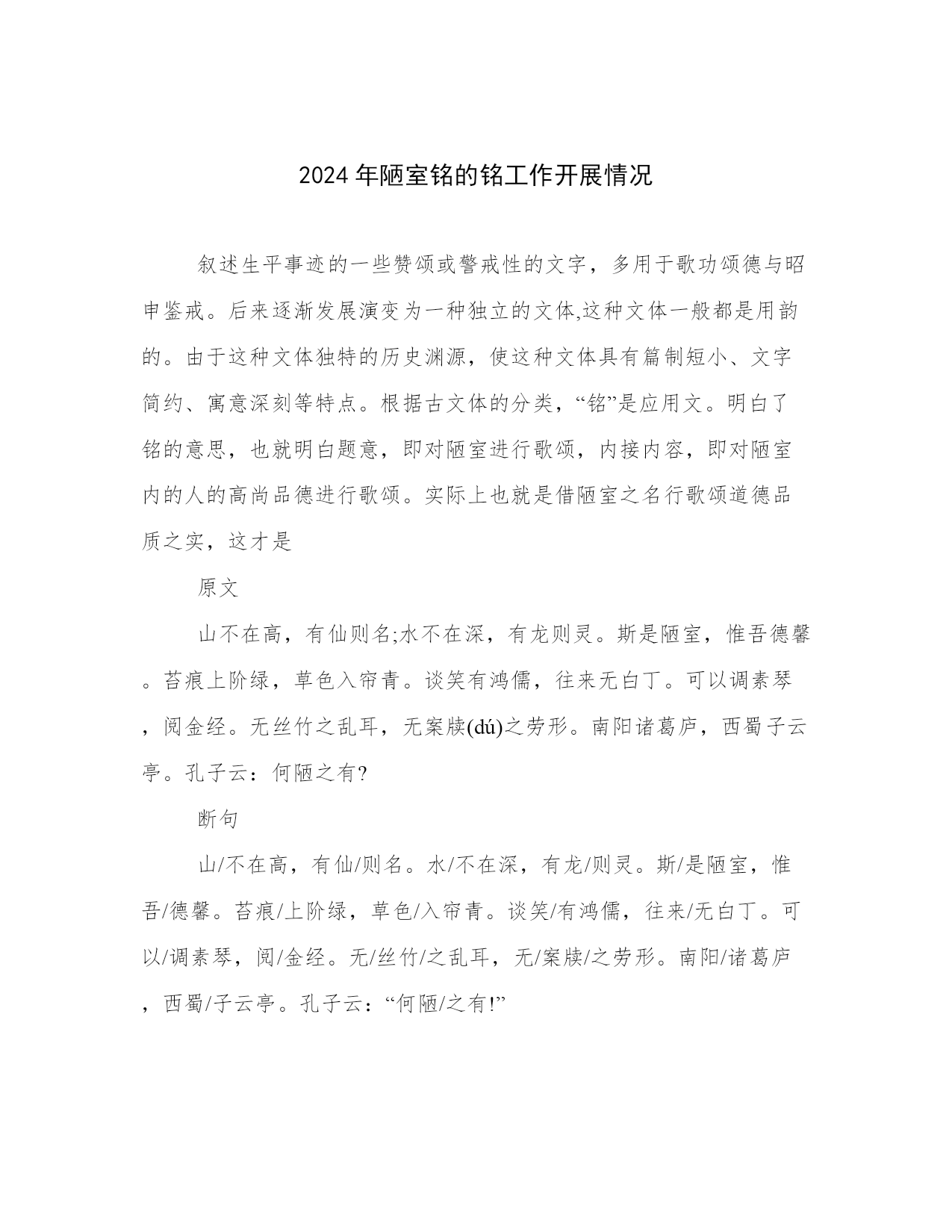2024年陋室铭的铭工作开展情况叙述生平事迹的一些赞颂或警戒性的文字,多用于歌功颂德与昭申鉴戒。后来逐渐发展演变为一种独立的文体,这种文体一般都是用韵的。由于这种文体独特的历史渊源,使这种文体具有篇制短小、文字简约、寓意深刻等特点。根据古文体的分类,“铭”是应用文。明白了铭的意思,也就明白题意,即对陋室进行歌颂,内接内容,即对陋室内的人的高尚品德进行歌颂。实际上也就是借陋室之名行歌颂道德品质之实,这才是原文山不在高,有仙则名;水不在深,有龙则灵。斯是陋室,惟吾德馨。苔痕上阶绿,草色入帘青。谈笑有鸿儒,往来无白丁。可以调素琴,阅金经。无丝竹之乱耳,无案牍(dú)之劳形。南阳诸葛庐,西蜀子云亭。孔子云:何陋之有?断句山/不在高,有仙/则名。水/不在深,有龙/则灵。斯/是陋室,惟吾/德馨。苔痕/上阶绿,草色/入帘青。谈笑/有鸿儒,往来/无白丁。可以/调素琴,阅/金经。无/丝竹/之乱耳,无/案牍/之劳形。南阳/诸葛庐,西蜀/子云亭。孔子云:“何陋/之有!”